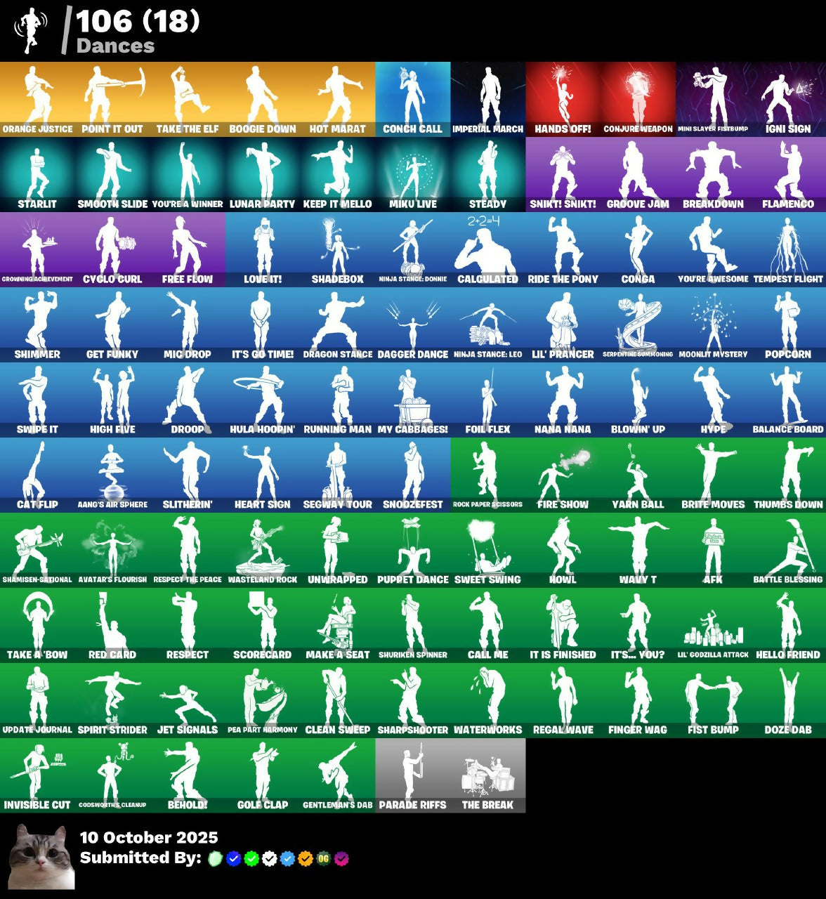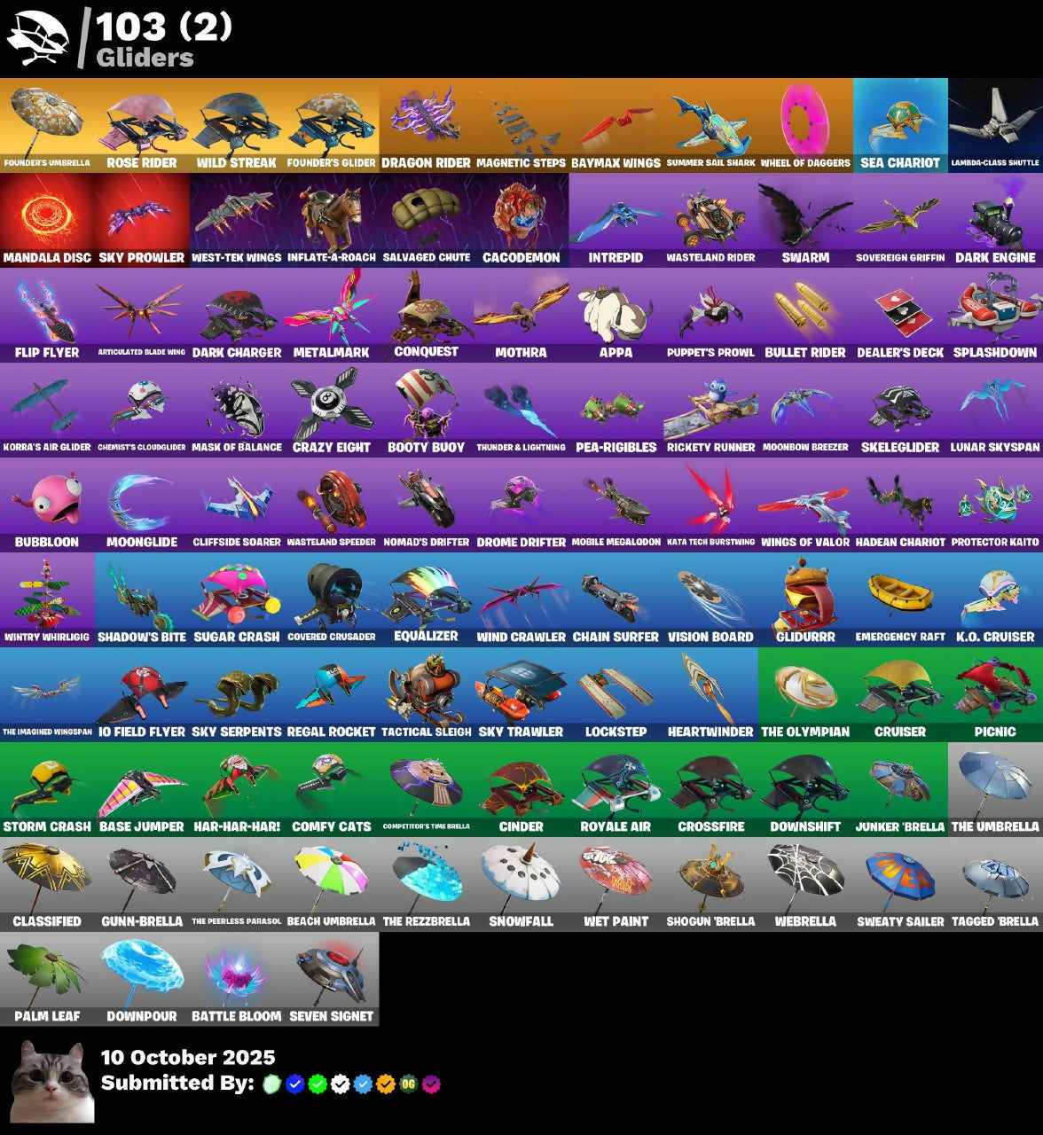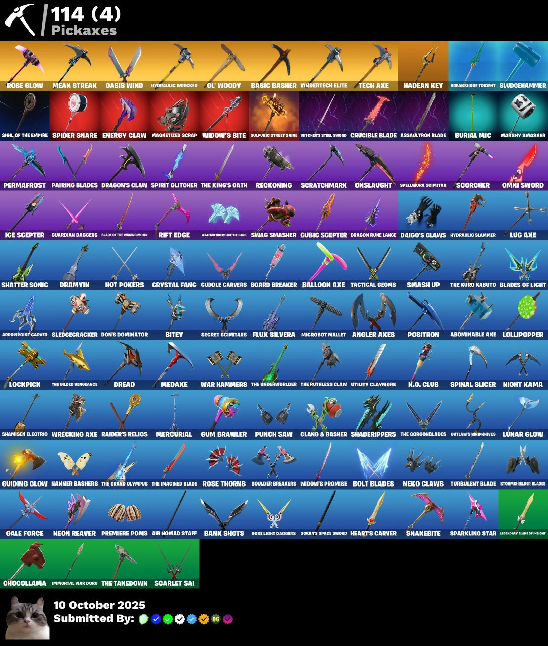 8-Ball Vs Scratch, A.I.M., Aang, Aang's Air Sphere, Abominable Axe, Adira, Adira (Battle Mask), Afk, Air Nomad Staff, Akatsuki, Angler Axes, Aphrodite, Appa, Archetype, Arctic Adeline, Ares, Arrowpoint Carver, Artemis, Articulated Blade Wing, Assaultron Blade, Astro Jack, Avatar State Aang, Avatar's Flourish, Balance Board, Balanced, Balloon Axe, Banana Bag, Bank Shots, Base Jumper, Basic Basher, Batman, Battle Ball, Battle Blessing, Battle Bloom, Battlehawk, Baymax Wings, Beach Umbrella, Behold!, Bitey, Black Werewolf, Blackheart, Blackheart (Stage 8), Blade of the Waning Moon, Blades of Light, Blazing Fire Cerberus, Blowin' Up, Board Breaker, Bolt Blades, Boogie Down, Booty Buoy, Boulder Breakers, Breakdown, Breakshore Trident, Brite Moves, Brite Raider, Bubbloon, Bullet Rider, Burial Mic, Cacodemon, Calamity, Calamity Stage 5, Calculated, Call Me, Cameo Vs Chic, Carbide, Carbide Armor Stage 5, Cat Flip, Cerberus, Chain Surfer, Chapter 3 Island Theme, Chapter 4 Island Theme, Chapter 5 Island Theme, Chemist's Cloudglider, Chocollama, Cinder, Clang & Basher, Classified, Clawz Retro, Clean Sweep, Cliffside Soarer, Codsworth's Cleanup, Collision Course, Comfy Cats, Competitor's Time Brella, Conch Call, Conga, Conjure Weapon, Conquest, Constructor, Contract Giller, Covered Crusader, Crazy Eight, Crossfire, Crowning Achievement, Crucible Blade, Cruiser, Crystal, Crystal Fang, Cubic Scepter, Cuddle Carvers, Cuddle Hearts, Cupcake, Cyclo Curl, DJ Yonder, Dagger Dance, Daigo, Daigo's Claws, Dark Charger, Dark Engine, Darth Vader, Dealer's Deck, Demon Hunter Hope, Dire, Doctor Strange, Don's Dominator, Doom Slayer, Double Draw, Downpour, Downshift, Doze Dab, Dragon Rider, Dragon Rune Lance, Dragon Stance, Dragon's Claw, Dramyin, Dread, Drift, Drift Stage 5, Drippy Drift, Drome Drifter, Droop, Dual Kama, Dusk, Elysian Artemis, Ember, Emergency Raft, Energized Godzilla, Energy Claw, Enforcer, Equalizer, Erisa, Everybody Dance!, Evie, Exploding Axis, Fable, Finger Wag, Fire Show, Fist Bump, Flamenco, Flip Flyer, Flux Silvera, Foil Flex, Fortnite, Founder's Glider, Founder's Umbrella, Free Flow, Fryangles, Gale Force, Gentleman's Dab, Geralt of Rivia, Get Funky, Giddy-Up, Glidurr, Godzilla Evolved, Golf Clap, Green Roots Billie, Groove Jam, Guardian Daggers, Guardian Jade, Guiding Glow, Gum Brawler, Gunn-'Brella, Gunnar, Hadean Chariot, Hadean Kev, Hades, Hands Off!, Har-Har-Har!, Heart Sign, Heart's Carver, Heartwinder, Hello Friend, Hero Baymax, High Five, Hop And A Wink, Hot Marat, Hot Pokers, Howl, Hula Hoopin', Huntress, Hybrid, Hybrid (Stage 4), Hydraulic Slammer, Hydraulic Wrecker, Hype, I Am Fearless, Ice King (Gold), Ice Scepter, Igni Sign, Immortal Form, Immortal Oasis, Immortal War Doru, Immortal Zeus, Imperial March, Indiana Jones, Indiana Jones (Temple Explorer), Inflate-A-Roach, Intrepid, Invisible Cut, Io Field Flyer, Iso, It Is Finished, It's Go Time!, It's... You?, Jade, Jet Signals, Journey Vs Hazard, Junker 'Brella, K.O. Club, K.O. Cruiser, Kata Tech Burstwing, Keep It Mello, Kendo, Kiara K.O., Kiara K.O. (Captain's Bomber), King And Champion, King Eh 30, Kintsugi Daigo, Korra, Korra's Air Glider, Kuno, Lambda-Class Shuttle, Legendary Blade of Insight, Lego Fortnite Theme, Lil' Godzilla Attack, Lil' Prancer, Lobby Classic, Lockpick, Lockstep, Lollipopper, Love It!, Lucky Nyanja, Lug Axe, Lunar Glow, Lunar Party, Lunar Skyspan, Lynx, Lynx (Stage 4 - No Ponytail), Magmatic Poseidon, Magnetic Steps, Magnetized Scrap, Make A Seat, Malik, Malik (Solitary Defender), Mandala Disc, Marino, Marshy Smasher, Mask Of Balance, Massai, Master Key, Mean Streak, Medaxe, Medusa, Megalo Don, Mercurial, Metalmark, Mic Drop, Microbot Mallet, Miku Live, Min-Joon, Mina Park, Mini Slayer Fistbump, Mobile Megalodon, Moonbow Breezer, Moonglide, Moonlit Mystery, Mothra, My Cabbages!, Nana Nana, Nanner Bashers, Neko Claws, Neon Reaver, Neon Tendrils, Neon Wings, Night Hunter Scarr, Night Kama, Nightshade, Ninja Stance: Donnie, Ninja Stance: Leo, Nitro Fusion Megalo Don, Nog Ops, Nomad's Drifter, Number One, Nyanja, Oasis Wind, Ol' Woody, Omega, Omni Sword, Onesie, Onesie (Winter), Onslaught, Orange Justice, Outlander, Outlaw's Whipknives, Oxide Rust, Pairing Blades, Palm Leaf, Parade Riffs, Paradigm, Pea Part Harmony, Pea-Rigibles, Peabody, Peely, Per Aspera Ad Astra, Permafrost, Picnic, Point It Out, Popcorn, Poseidon, Positron, Powder, Powder (White), Premiere Poms, Protector Kaito, Prowler, Punch Saw, Puppet Dance, Puppet's Prowl, Pursuit, Racer Kendo, Ragnarok, Ragnarok (No Shoulder Pad), Raider's Relics, Reckoning, Red Card, Redline, Regal Rocket, Regal Wave, Remedy Vs Toxin, Respect, Respect The Peace, Restored Night Rose, Rickety Runner, Ride The Pony, Rift Edge, Ringmaster Scarr, Rippley Vs Sludge, Rock Paper Scissors, Rocket League, Rocket Racing Theme, Rook, Rose Glow, Rose Light Daggers, Rose Rider, Rose Team Leader, Rose Thorns, Royale Air, Ruin, Running Man, Rust, Sabina, Sabina (Ponytail), Salvaged Chute, Samurai Baymax, Scarlet Sai, Scorcher, Scorecard, Scratchmark, Sea Chariot, Secret Scimitars, Segway Tour, Selene, Serpentine Summoning, Seven Signet, Sgt. Winter, Sgt. Winter Headgear, Shadebox, Shaderippers, Shadow Blade Hope, Shadow's Bite, Shamisen Electric, Shamisen-Sational, Sharpshooter, Shatter Sonic, Shimmer, Shogun 'Brella, Shuriken Spinner, Sidewinder, Sigil of the Empire, Skeleglider, Skirmish, Skull, Sky Prowler, Sky Serpents, Sky Trawler, Sled Ready Guff, Sledgecracker, Sledgehammer, Slitherin', Sludgehammer, Slurp Peabody, Smash Up, Smooth Slide, Snakebite, Snap, Snap (Kalamadness), Snikt! Snikt!, Snoozefest, Snowfall, Sokka's Space Sword, Soldier, Sovereign Griffin, Sparkling Star, Spellwork Scimitar, Spider Snare, Spinal Slicer, Spirit Glitcher, Spirit Hunter Saeko, Spirit Strider, Splashdown, Squad Leader, Stage 4, Starlit, Steady, Steel Wool, Stone Sorceress Medusa, Storm Crash, Stormfarer, Stormfarer (Storm Brawler), Stormshielder Blades, Sugar Crash, Sulfuric Street Shine