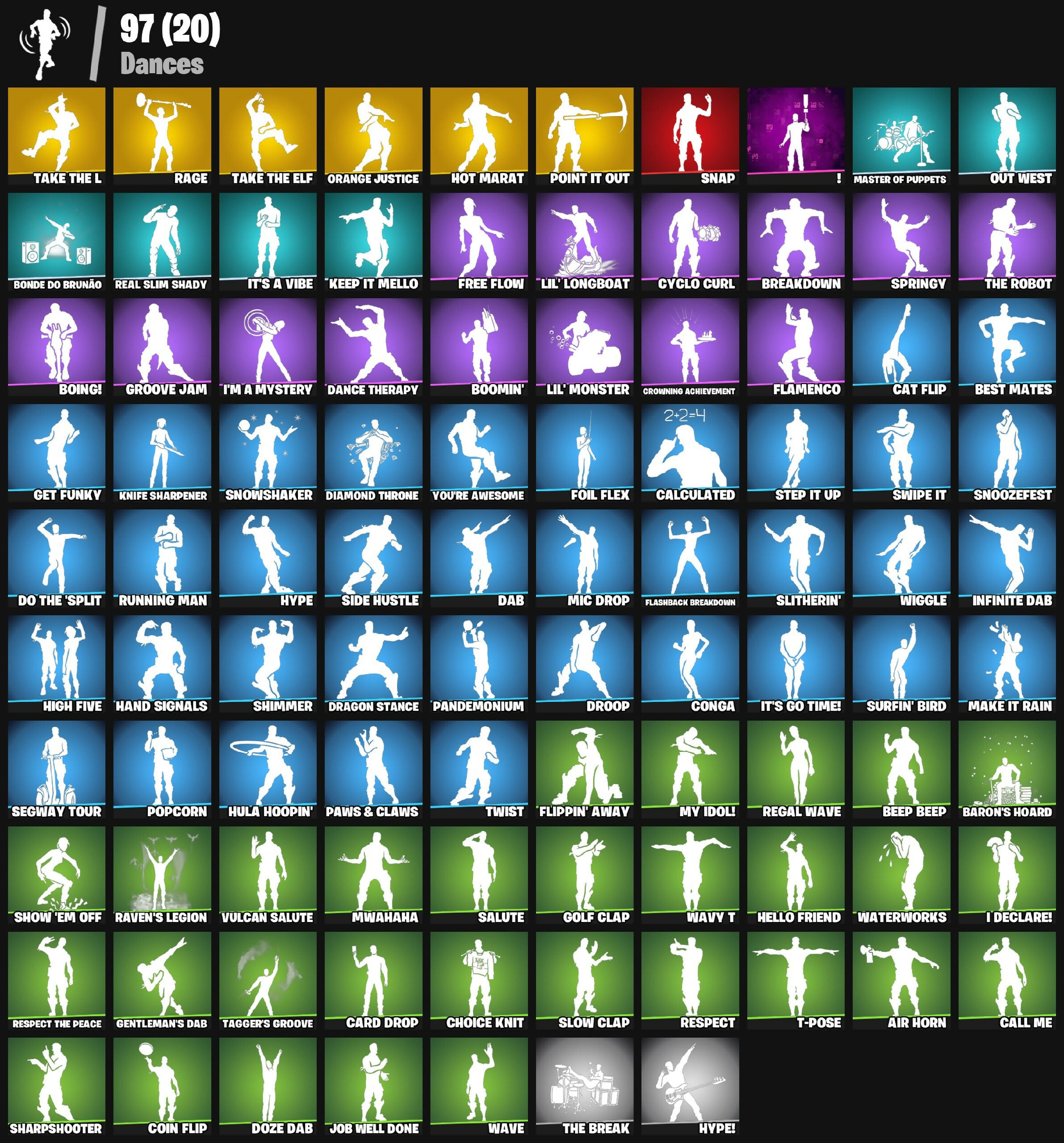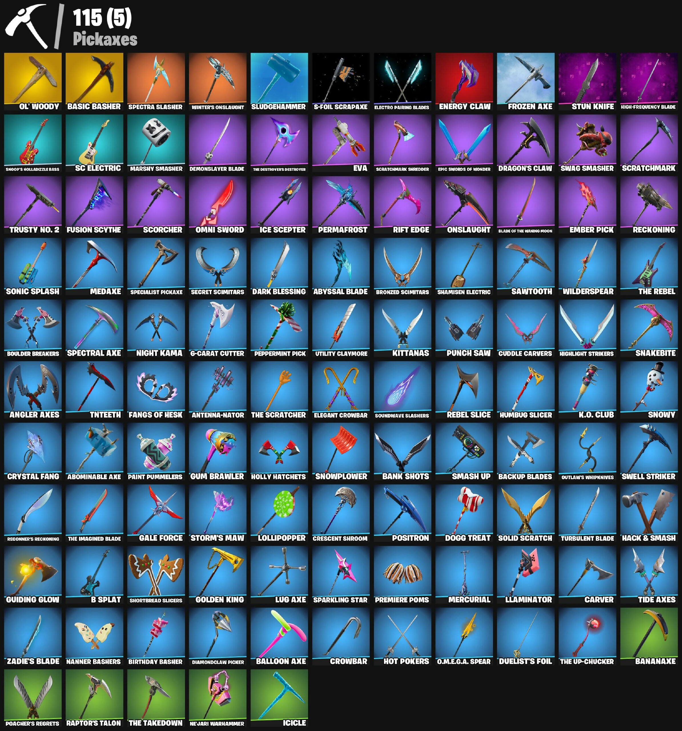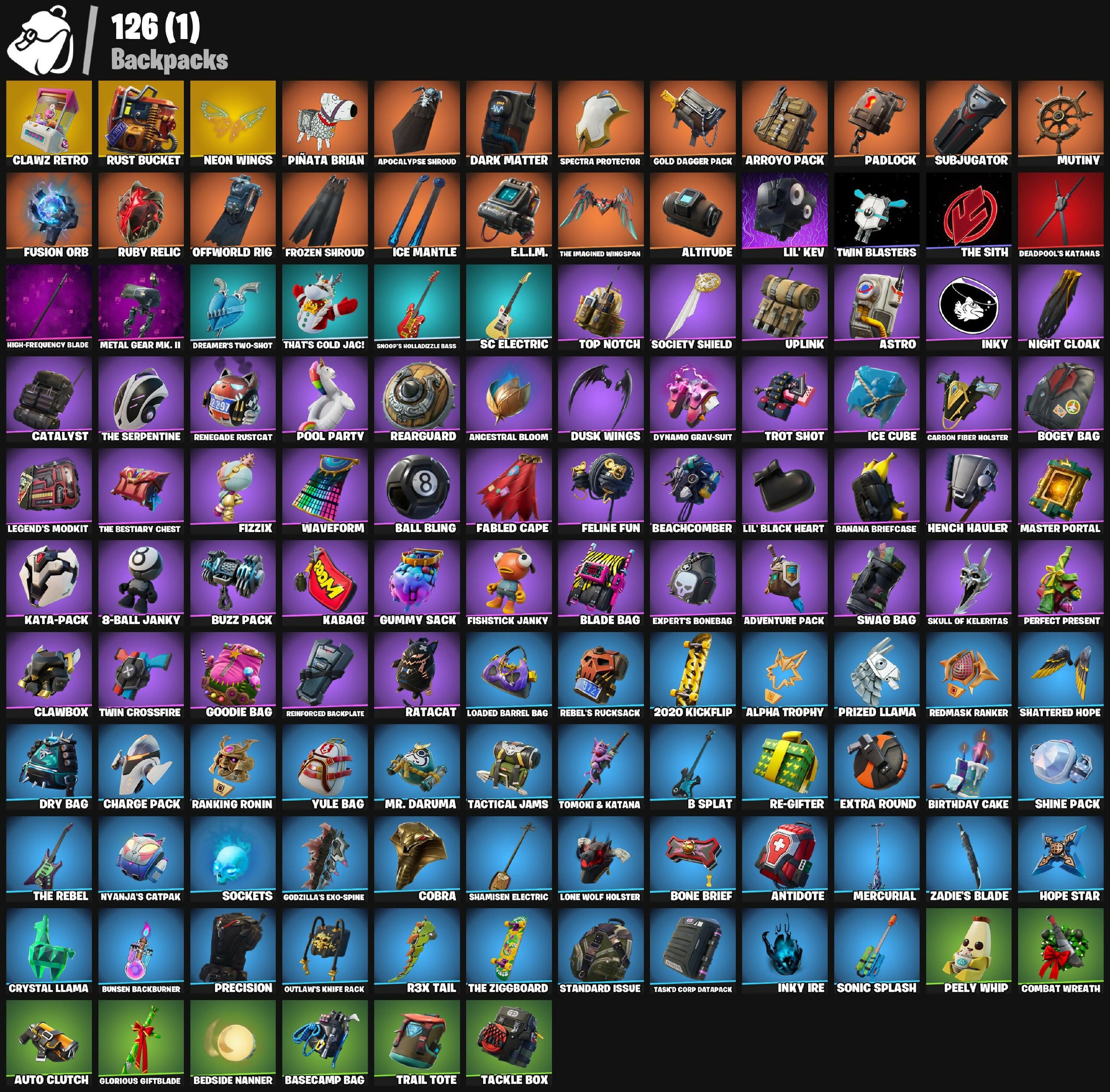 2020 Kickflip, 6-Carat Cutter, 8 Splat, 8-Ball Janky, 8-Ball Vs Scratch, A.I.M., Abominable Axe, Absenz, Abyssal Blade, Adventure Pack, Agent Peely, Air Horn, Alpha Trophy, Altitude, Ancestral Bloom, Angler Axes, Antenna-Nator, Antidote, Apocalypse Shroud, Arroyo Pack, Astro, Astro Antidote, Astro Jack, Astroworld Cyclone, Auto Clutch, B Splat, Backup Blades, Ball Bling, Balloon Axe, Banana Briefcase, Bananaxe, Bank Shots, Baron's Hoard, Basecamp Bag, Basic Basher, Batman, Battlehawk, Beachcomber, Bedside Nanner, Beep Beep, Best Mates, Birthday Basher, Birthday Cake, Blackheart, Blade Bag, Blade of the Waning Moon, Bogey Bag, Boing!, Bonde Do Brunão, Bone Brief, Boomin', Boulder Breakers, Breakdown, Bronzed Scimitars, Brutus, Bunsen Backburner, Buzz Pack, Calamity, Calculated, Call Me, Cameo Vs Chic, Carbide, Carbon Fiber Holster, Card Drop, Carver, Cat Flip, Catalyst, Chapter 3 Island Theme, Chapter 4 Island Theme, Chapter 5 Island Theme, Charge Pack, Charlotte, Choice Knit, Circuit Breaker, Clawbox, Clawz Retro, Cobalt, Cobra, Coin Flip, Combat Wreath, Conga, Crescent Shroom, Crowbar, Crowning Achievement, Crystal Fang, Crystal Llama, Cuddle Carvers, Cuddle Hearts, Cyclo Curl, D'Ark, Dab, Dance Therapy, Dark Blessing, Dark Doggo, Dark Matter, Dark Voyager, Deadpool, Deadpool's Katanas, Demonslayer Blade, Diamond Diva, Diamond Throne, Diamondclaw Picker, Dizzie, Dj Vonder, Do The 'Split, Dogg Treat, Doze Dab, Dragon Stance, Dragon's Claw, Dreamer's Two-Shot, Drift, Droop, Dry Bag, Duelist's Foil, Dusk, Dusk Knight, Dusk Wings, Dynamo Grav-Suit, E.L.I.M., Electro Pairing Blades, Elegant Crowbar, Elite Agent, Ember Pick, Energy Claw, Enforcer, Epic Swords of Wonder, Eva, Expert's Bonebag, Extra Round, Fable, Fabled Cape, Fade, Fangs of Hesk, Feline Fun, Fishstick Janky, Fizzix, Flamenco, Flashback Breakdown, Flippin' Away, Foil Flex, Free Flow, Frozen Axe, Frozen Shroud, Fry Angles, Fusion, Fusion Orb, Fusion Scythe, Gale Force, Gear Specialist Maya, Gentleman's Dab, Get Funky, Giddy-Up, Glorious Giftblade, Godzilla's Exo-Spine, Gold Dagger Pack, Golden King, Golf Clap, Goodie Bag, Groove Jam, Guiding Glow, Gum Brawler, Gumbo, Gummy Sack, Gunnar, Hack & Smash, Hana, Hand Signals, Haven, Hello Friend, Hench Hauler, High Five, High-Frequency Blade, Highlight Strikers, Holiday Boxy, Holly Hatchets, Hope, Hope Star, Hot Marat, Hot Pokers, Hula Hoopin', Humbug Slicer, Huntress, Hybrid, Hype, Hype!, I Declare!, I'm A Mystery, Ice Cube, Ice Mantle, Ice Scepter, Icicle, Infinite Dab, Inky, Inky Ire, It's A Vibe, It's Go Time!, Job Well Done, Journey Vs Hazard, K.O. Club, Kabag!, Kata-Pack, Keep It Mello, Kittanas, Knife Sharpener, Krisabelle, Legend's Modkit, Lego Fortnite Theme, Lil Split, Lil' Black Heart, Lil' Kev, Lil' Longboat, Lil' Monster, Llaminator, Loaded Barrel Bag, Lobby Classic, Lollipopper, Lone Wolf Holster, Lt. Evergreen, Lug Axe, Lynx, Make It Rain, Mandalorian, Marshy Smasher, Master Of Puppets, Master Portal, Medaxe, Meowscles, Mercurial, Metal Gear Mk. II, Mic Drop, Midas, Mission Specialist, Montague, Moonwalker, Mr. Daruma, Mutiny, Mwahaha, My Idol!, Nanner Bashers, Ne'Jari Warhammer, Neon Wings, Night Cloak, Night Kama, Nightshade, Nisha, Nyanja's Catpak, O.M.E.G.A. Spear, Ocean, Offworld Rig, Ol' Woody, Omega, Omegarok, Omni Sword, Onesie, Onslaught, Orange Justice, Oscar, Out West, Outlaw's Knife Rack, Outlaw's Whipknives, Padlock, Paint Pummelers, Pandemonium, Paws & Claws, Peely, Peely Whip, Peppermint Pick, Perfect Present, Permafrost, Peter Griffin, Piñata Brian, Poacher's Regrets, Point It Out, Polar Peely, Pool Party, Popcorn, Positron, Powder, Precision, Premiere Poms, Prized Llama, Prowler, Punch Saw, R3X Tail, Rage, Ragnarok, Raiden, Ranking Ronin, Raptor's Talon, Ratacat, Raven's Legion, Re-Gifter, Real Slim Shady, Rearguard, Rebel Slice, Rebel's Rucksack, Reckoning, Recon Raptor, Reconner's Reckoning, Redline, Redmask Ranker, Reese, Regal Wave, Reinforced Backplate, Remedy Vs Toxin, Renegade Lynx, Renegade Rustcat, Respect, Respect The Peace, Rift Edge, Rippley Vs Sludge, Rocket Racing Theme, Rogue Agent, Ronin, Rook, Ruby Relic, Running Man, Runway Racer, Rust Bucket, Rust Lord, S-Foil Scrapaxe, SC Electric, Salute, Santa Dogg, Sawtooth, Scorcher, Scratchmark, Scratchmark Shredder, Secret Scimitars, Segway Tour, Sgt. Winter, Shamisen Electric, Shanta, Sharpshooter, Shattered Hope, Shimmer, Shine Pack, Shortbread Slicers, Show 'Em Off, Sid Obsidian, Side Hustle, Sidewinder, Silas Hesk, Skeletara, Skull Ranger, Skull Scout, Skull of Keleritas, Skye, Sledgehammer, Slitherin', Slow Clap, Sludgehammer, Smash Up, Snakebite, Snap, Snoop's Holladazzle Bass, Snoop's Holladzle Bass, Snoozefest, Snowflake, Snowplower, Snowshaker, Snowy, Society Shield, Sockets, Solid Scratch, Solid Snake, Sonic Splash, Soundwave Slashers, Sparkling Star, Specialist Pickaxe, Spectra Knight, Spectra Protector, Spectra Slasher, Spectral Axe, Springy, Squad Leader, Standard Issue, Step It Up, Storm's Maw, Stun Knife, Subjugator, Summit Striker, Sun Strider, Surfin' Bird, Swag Bag, Swag Smasher, Sweat-Free, Swell Striker, Swipe It, T-Pose, TNTeeth, Tackle Box, Tactical Jams, Tagger's Groove, Take The Elf, Take The L, Task'd Corp Datapack, Teknique, That's Cold Jac!, The Ace, The Bestiary Chest, The Break, The Destroyer's Destroyer, The Ice King, The Imagined, The Imagined Blade, The Imagined Wingspan, The Prisoner, The Re-Og, The Reaper, The Rebel, The Robot, The Scratcher, The Serpentine, The Sith, The Takedown, The Up-Chucker, The Visitor, The Ziggboard, Tide Axes, Tntina, Toji Fushiguro, Tomoki & Katana, Toona Fish, Top Notch, Trail Tote, Trog, Trot Shot, Trusty No. 2, Tsuki 2.0, Turbulent Blade, Turk Vs Riptide, Twin Blasters, Twin Crossfire, Twist, Uplink, Utility Claymore, Valeria, Valor, Vanguard Zadie, Vengeance Jones, Vulcan Salute, Waterworks, Wave, Wavebreaker, Waveform, Wavy T, Whiplash, Wiggle, Wilderspear, Wingman, Winter Soldier (Pen & Ink), Winter's Onslaught, Winterfest Bus