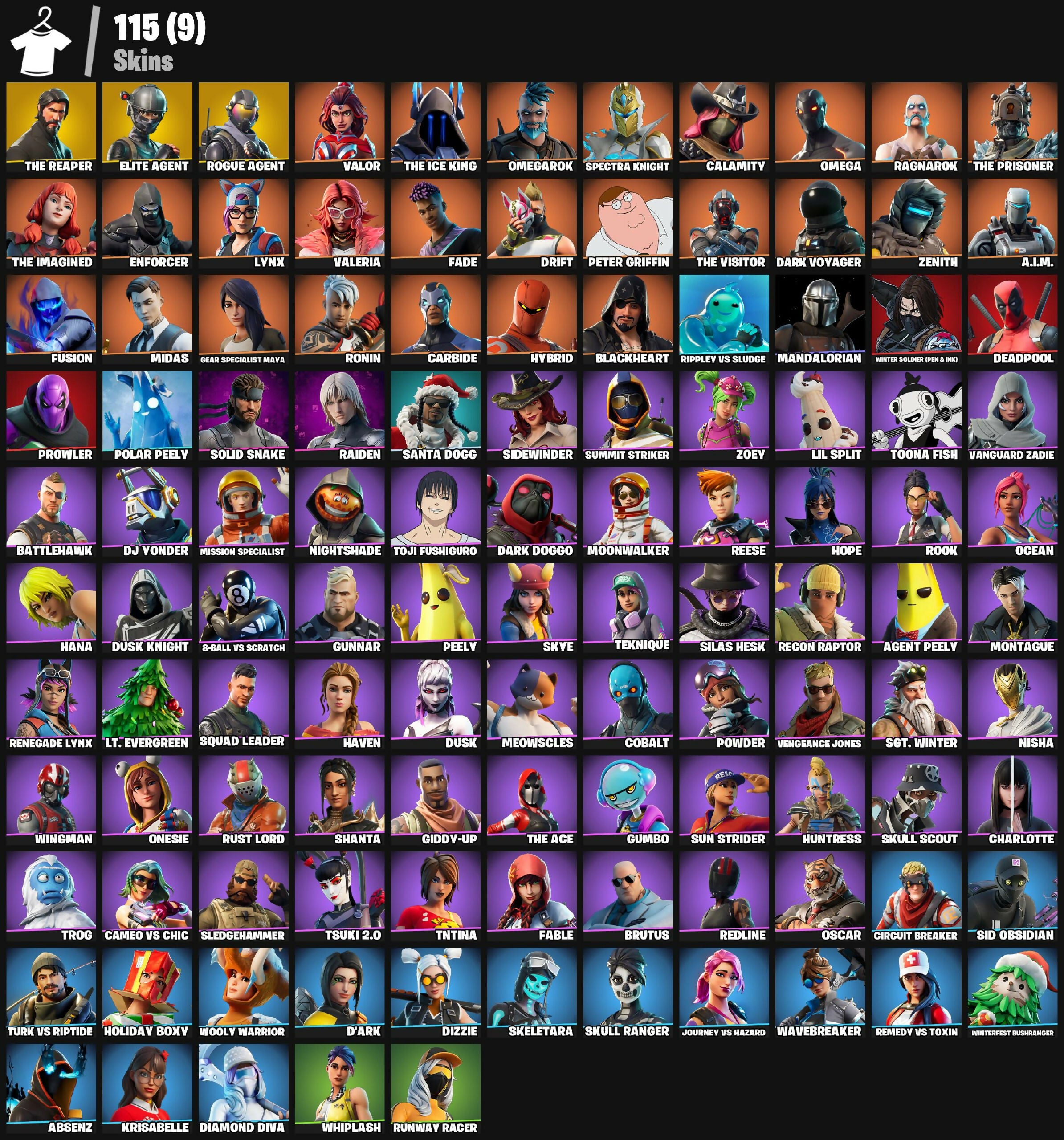 115 skins | The Reaper | Elite Agent | Rogue Agent | Valor | The Ice King | Omegarok | Spectra Knight | Calamity | 200 VB - [PC/PSN/XBOX]