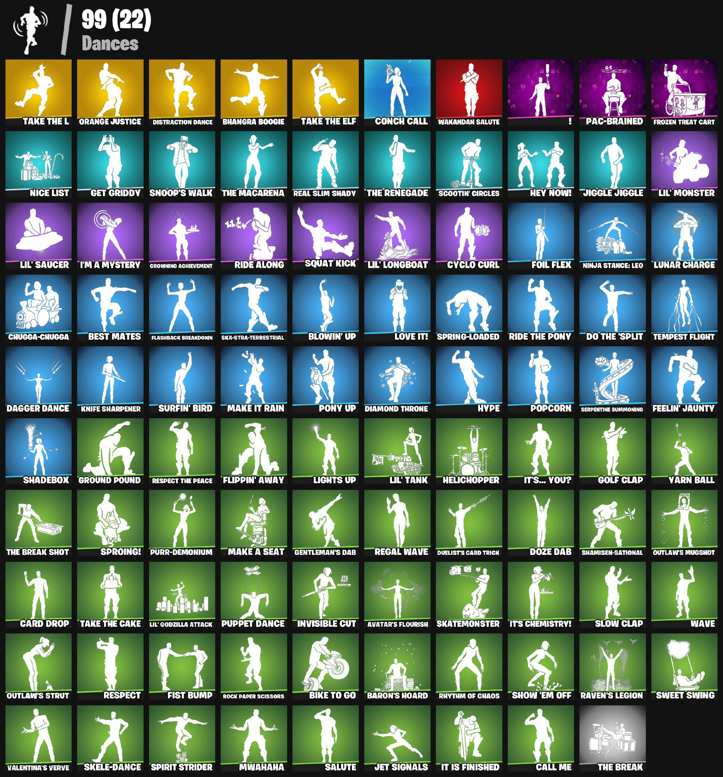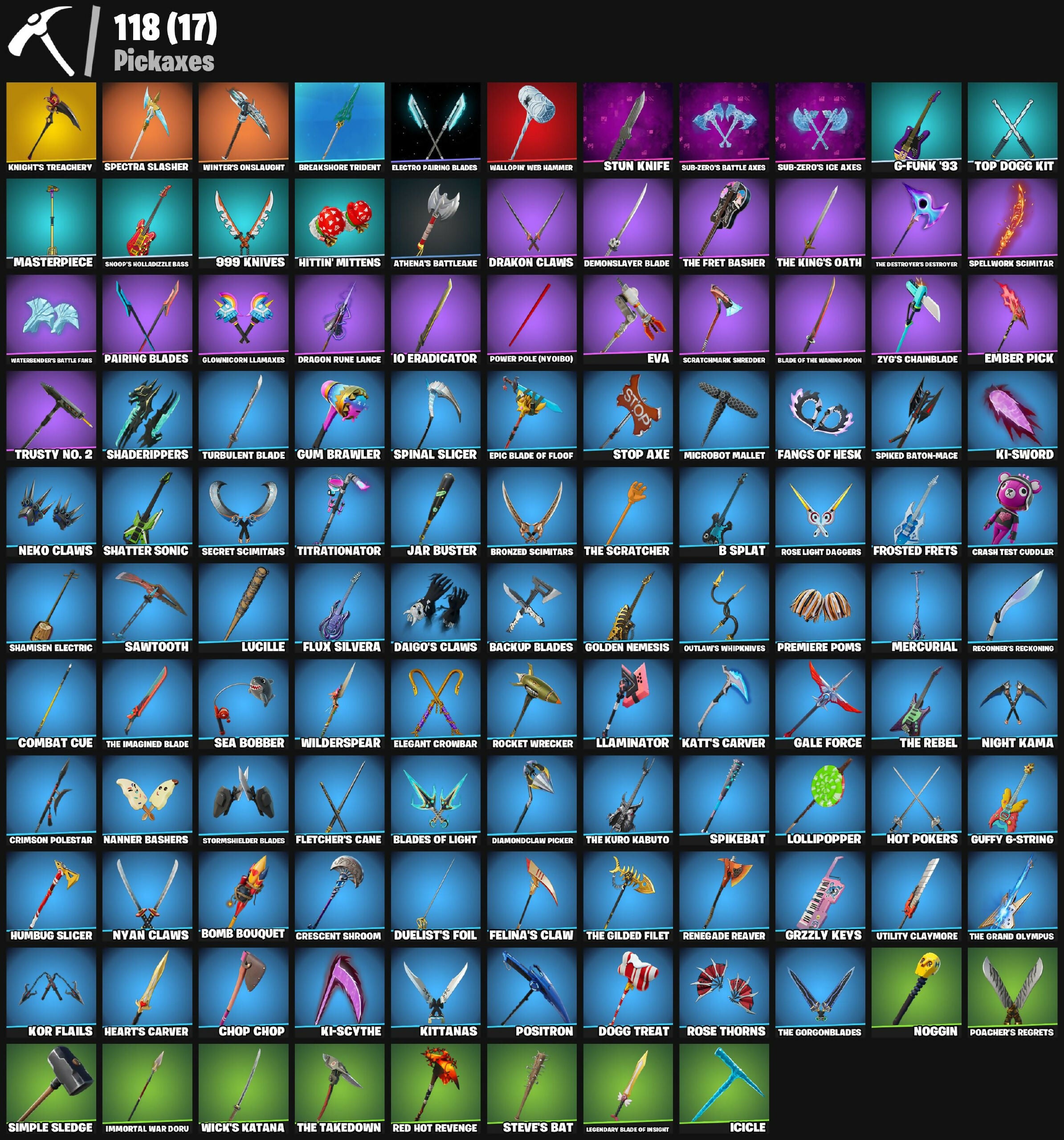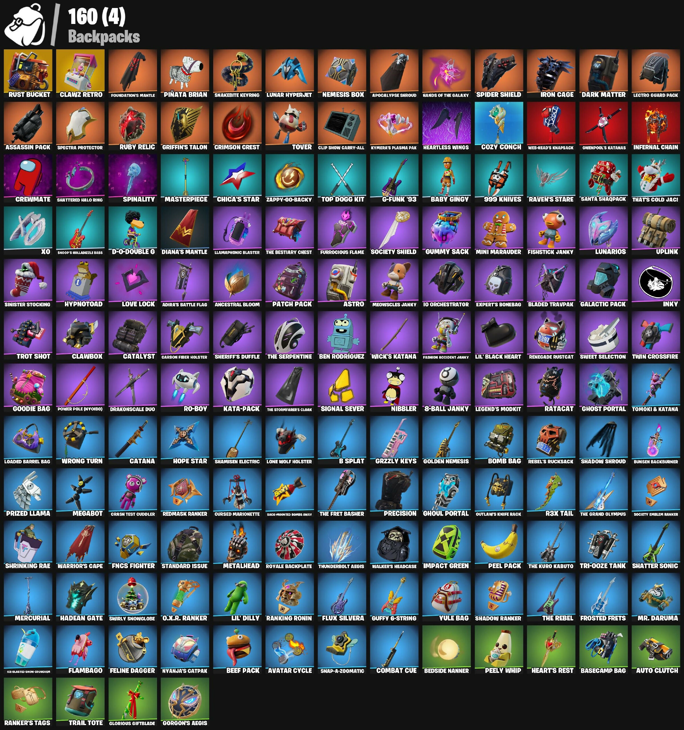 !, 1-Ball, 10 Orchestrator, 8-Ball Janky, 999 Knives, Adira, Adira's Battle Flag, Aerial Assault Bomber, Ancestral Bloom, Aphrodite, Apocalypse Shroud, Ares, Assassin, Assassin Pack, Astro, Astroworld Cyclone, Athena's Battleaxe, Auto Clutch, Avatar Cycle, Avatar's Flourish, Azuki, B Splat, Baby Gingy, Back-Mounted Bombs Away, Backlash, Backup Blades, Baron's Hoard, Basecamp Bag, Battlehawk, Bedside Nanner, Beef Pack, Ben Rodriguez, Bender Bending Rodriguez, Best Mates, Bhangra Boogie, Big Dill, Bike To Go, Blade of the Waning Moon, Bladed Travpak, Blades of Light, Blinky, Blowin' Up, Bomb Bag, Bomb Bouquet, Breakshore Trident, Bronzed Scimitars, Bunsen Backburner, Burning Dragon, Call Me, Carbide, Carbon Fiber Holster, Card Drop, Cassidy Quinn, Catalyst, Catana, Cerberus, Chaos Director, Chapter 3 Island Theme, Chapter 4 Island Theme, Chapter 5 Island Theme, Charlotte, Chica, Chica's Star, Chop Chop, Chugga-Chugga, Clawbox, Clawz Retro, Clip Show Carry-All, Combat Cue, Conch Call, Cozy Conch, Crash Test Cuddler, Crescent Shroom, Crewmate, Crimson Crest, Crimson Polestar, Crowning Achievement, Crystal, Cursed Marionette, Cyclo Curl, D-O-Double G, Dagger Dance, Daigo, Daigo's Claws, Dark Matter, Dark Voyager, Darkheart, Demonslayer Blade, Diamond Throne, Diamondclaw Picker, Diana's Mantle, Distraction Dance, Do The 'Split, Doctor Slone, Dogg Treat, Doze Dab, Dragon Rune Lance, Drakon Claws, Drakon Steel Hybrid, Drakonscale Duo, Duelist's Card Trick, Duelist's Foil, Dummy, Dynamo Tntina, Electro Pairing Blades, Elegant Crowbar, Ember Pick, Epic Blade of Floof, Eva, Evie, Expert's Bonebag, FNCS Fighter, Fangs of Hesk, Fashion Accident Janky, Feelin' Jaunty, Felina, Felina's Claw, Feline Dagger, Fishstick Janky, Fist Bump, Flambago, Flashback Breakdown, Fletcher Kane, Fletcher's Cane, Flip Reset, Flippin' Away, Flux Silvera, Foil Flex, Forsaken Eye, Foundation's Mantle, Frosted Frets, Frozen Treat Cart, Fryangles, Furrocious Flame, G-Funk '93, Galactic Pack, Galaxy Grappler, Gale Force, Gentleman's Dab, Get Griddy, Ghost Portal, Ghost Rider, Ghoul Portal, Glitch, Glorious Giftblade, Glownicorn Llamaxes, Goku Black, Golden Nemesis, Golf Clap, Goodie Bag, Gorgon's Aegis, Griffin's Talon, Grizzly Keys, Ground Pound, Grzzly Keys, Guffy 6-String, Guffy G-String, Guggimon, Gum Brawler, Gumbo, Gummy Sack, Gwenpool's Katanas, Hadean Gate, Hands Of The Galaxy, Harlowe, Haven, Hayseed, Heart's Carver, Heart's Rest, Heartless Wings, Helichopper, Hero Baymax, Hey Now!, Hittin' Mittens, Holiday Boxy, Hope, Hope Star, Hot Pokers, Humbug Slicer, Hype, Hypnotoad, I'm A Mystery, IO Eradicator, Ice-Blasted Snow Cruncher, Icicle, Immortal War Doru, Impact Green, Infernal Chain, Inferno Skeleton Balvin, Inky, Invisible Cut, Iron Cage, It Is Finished, It's Chemistry!, It's... You?, Jade, Jar Buster, Jet Signals, Jiggle Jiggle, Joey, John Wick, Joss, Jumpshot, Kata-Pack, Katt, Katt's Carver, Keisha Cross, Kendo, Ki-Scythe, Ki-Sword, Kittanas, Knife Sharpener, Knight's Treachery, Knights Treachery, Kor Flails, Korra, Kymera, Kymera's Plasma Pak, Kyra, LBC '93 Dogg, Lana Llane, Lazarbeam, Lectro Guard Pack, Legend's Modkit, Legendary Blade of Insight, Lego Fortnite Theme, Lights Up, Lil Split, Lil' Black Heart, Lil' Dilly, Lil' Godzilla Attack, Lil' Longboat, Lil' Monster, Lil' Saucer, Lil' Tank, Llamaphonic Blaster, Llaminator, Loaded Barrel Bag, Lobby Classic, Lollipopper, Lone Wolf Holster, Love It!, Love Lock, Lt. John Llama, Lucille, Lunar Charge, Lunar Hyperjet, Lunarios, Make A Seat, Make It Rain, Malik, Marshall Nevermore, Masterpiece, Medusa, Megabot, Meowdas, Meowscles Janky, Mercurial, Merry Marauder, Metalhead, Microbot Mallet, Mini Marauder, Mission Specialist, Monks, Montague, Moonwalker, Mr. Daruma, Mwahaha, Nanner Bashers, Negan, Neko Claws, Nemesis Box, Nibbler, Nice List, Night Kama, Nightmare, Ninja Stance: Leo, Nisha, Noggin, Nyan Claws, Nyanja, Nyanja's Catpak, O.X.R. Ranker, Omegarok, Orange Justice, Oscar, Outlaw Midas, Outlaw's Knife Rack, Outlaw's Mugshot, Outlaw's Strut, Outlaw's Whipknives, PJ Patroller, Pac-Brained, Pairing Blades, Patch Pack, Peel Pack, Peely Whip, Peter Griffin, Phantom Meowscles, Philip J. Fry, Piñata Brian, Poacher's Regrets, Poised Playmaker, Pony Up, Popcorn, Poseidon, Positron, Power Pole (NV01BO), Power Pole (Nyoibo), Precision, Premiere Poms, Prized Llama, Puppet Dance, Purr-Demonium, R3X Tail, Ranker's Tags, Ranking Ronin, Ratacat, Raven, Raven's Legion, Raven's Stare, Real Slim Shady, Rebel's Rucksack, Reconner's Reckoning, Red Hot Revenge, Red Jade, Redmask Ranker, Regal Wave, Relaxed Fit Jonesy, Renegade Lynx, Renegade Reaver, Renegade Rebel, Renegade Rustcat, Respect, Respect The Peace, Rhythm Of Chaos, Rick Grimes, Ride Along, Ride The Pony, Ro-Boy, Rock Paper Scissors, Rocket Racing Theme, Rocket Wrecker, Rogue Agent, Ronin, Rose Light Daggers, Rose Thorns, Royale Backplate, Ruby Relic, Runway Racer, Rust Bucket, Rust Lord, Salute, Santa Dogg, Santa Shaq, Santa Shaqpack, Satoru Gojo, Sawtooth, Scootin' Circles, Scratchmark Shredder, Sea Bobber, Secret Scimitars, Serpentine Summoning, Shadebox, Shaderippers, Shadow Blade Hope, Shadow Ranker, Shadow Shroud, Shamisen Electric, Shamisen-Sational, Shamsien Electric, Shanta, Shatter Sonic, Shattered Halo Ring, Sheriff's Duffle, Show 'Em Off, Shrinking Rae, Signal Sever, Silas Hesk, Simple Sledge, Sinister Stocking, Ska-Stra-Terrestrial, Skatemonster, Skele-Dance, Skerran, Skull Commander, Skull Scout, Skull Trooper, Slayer Juice Wrld, Slow Clap, Snakebite Keyring, Snap, Snap-A-Zoomatic, Snoop's Holladizzle Bass, Snoop's Molladezzle Bass, Snoop's Walk, Snowflake, Society Emblem Ranker, Society Shield, Solid Snake, Son Goku, Spectra Knight, Spectra Protector, Spectra Slasher, Spellwork Scimitar, Spider Knight, Spider Shield, Spider-Man, Spikebat, Spiked Baton-mace, Spinal Slicer, Spinality, Spirit Strider, Spring-Loaded, Sproing!, Squat Kick, Standard Issue, Steve's Bat, Stop Axe, Stormfarer, Stormshielder Blade