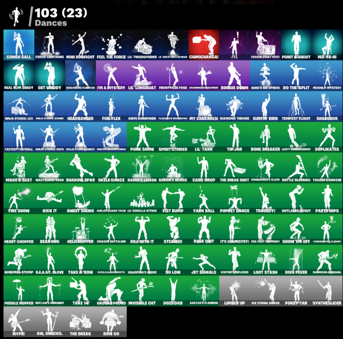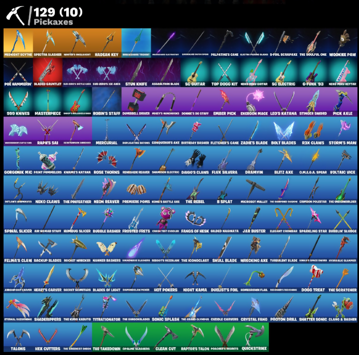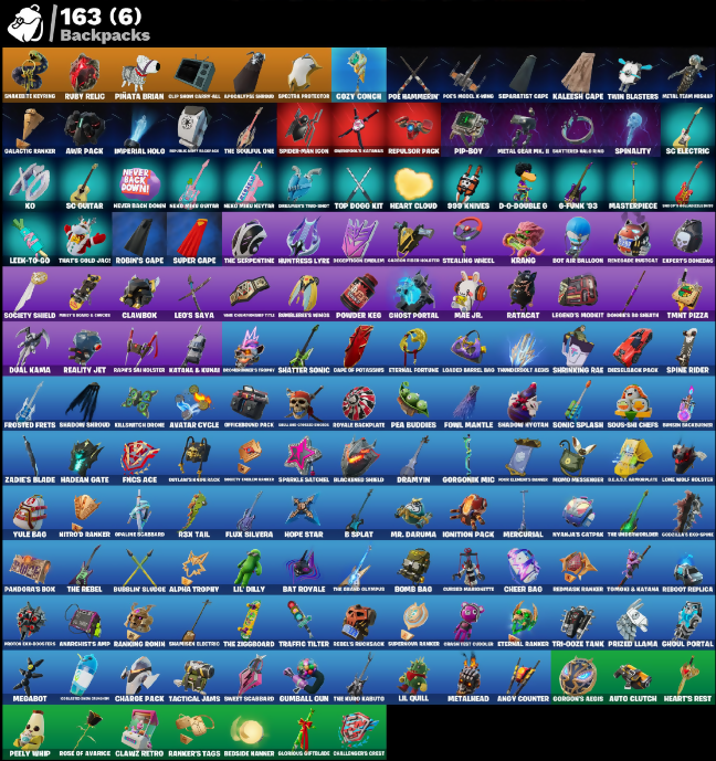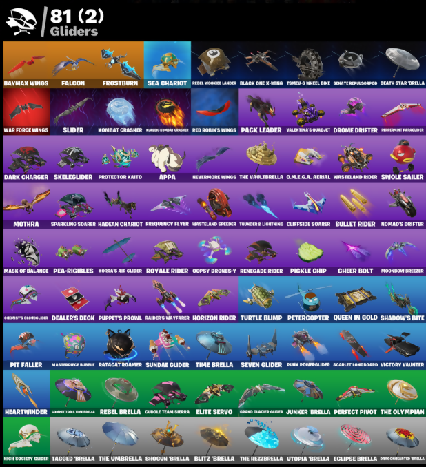 0-Funk '83, 501st Trooper, 999 Knives, AKH-44 Assault Bomber, AWR Pack, AWR Trooper, Aang, Aang's Air Sphere, Ahsoka Clone Trooper, Air Nomad Staff, Alpha Trophy, Anarchist's Amp, Ancv Counter, Aphrodite, Apocalypse Shadow, Appa, Apprentice Five, Arrow Point Carver, Artemis, Assaulteron Blade, Auto Clutch, Avatar Cycle, Avatar State Aang, Avatar's Flourish, Aw, Shucks., Ayla Winn, B Splat, B.E.A.S.T. Glove, B.R.U.T.E Gunner, Back On Cosmic Mission, Backup Blades, Banshee Backburner, Baron's Hoard, Bat Royale, Battle Blessing, Battlebus, Baymax Wings, Bear Hug, Beast Asmolator, Bedside Manner, Big Dill, Birdracing Flourish, Birthday Basher, Black One X-Wing, Blackened Shield, Bladed Gauntlet, Blades of Light, Blitz 'Brella, Blitz Axe, Bolt Blades, Bomb Bag, Bone Breaker, Bones, Boogie Down, Boomer's Big Basket, Boonmaster's Thorn, Bot Air Balloon, Bow Go, Breakshore Trident, Bubble Basher, Bubblin Sludge, Bubblin' Sludge, Bullet Rider, Bumblebee, Bungleridge's Wings, Camo Horn Headset, Cape of Potatoes, Captain Phasma, Card Drop, Carmine Rosso, Cassidy Quinn, Cerberus, Challenger's Crest, Charge Pack, Cheer Bao, Cheer Bolt, Chemist's Cloudglider, Chimichanga!, Chrome Powerdriver, Clang & Basher, Clawbox, Clawz Retro, Clean Cut, Cliffside Soarer, Clip Show Crash-XL, Clone Trooper, Color Splash Jelly, Competitor's Time Brella, Conch Call, Conqueror's Axe, Conqueror's Claim, Cooseworthy Cleanup, Coruscant Guard, Cozy Conch, Crash Test Coupler, Crash Test Cuddler, Crimson Polestar, Crystal Fang, Cuddle Carvers, Cuddle Team Sierra, Cursed Marionette, D-Double G, Daigo, Daigo's Claws, Dark Charger, Dealer's Deck, Death Star 'Brella, Deception Emblem, Diamond Throne, Diamondclaw Picker, Dieselback Pack, Dilli With It, Diva Fever, Do The Split, Dogg Treat, Donatello, Donnie's Bo Staff, Doughberman, Doze Dab, Dragonhearted 'Brella, Dramvin, Dramyin, Dreamer's Trio-Dart, Drome Drifter, Dual Kama, Duelist's Foil, Duelists Card Trick, Dumbbell Driver, Duplicating Batons, Duplikates, Durr Taisho, Dusk Knight, Eclipse Brella, Electro Flaying Blades, Elegant Crowbar, Elite Servo, Ember Pick, Emperor Palpatine, Energon Mace, Eternal Fortune, Eternal Ranker, Eternal Razorwing, Expert's Bonebag, FNCS Ace, Falcon, Fangs of Hesk, Fastest Fastball, Feel The Force, Felina's Claw, Fire Show, Fist Bump, Flashback Breakdown, Fletcher Kane, Fletcher's Cane, Flux Silvera, Foil Flex, Force Lightning, Four Elements Sensor, Fowl Mantle, Frequency Flyer, Front Page Pose, Frostburn, Frosted Frets, Frozen Threat Cart, G-Funk '93, Galactic Ranker, General Grievous, Get Griddy, Ghost Portal, Ghoul Portal, Gilded Naginata, Glorious Giftblade, Godzilla Evolved, Godzilla's Exo-Spine, Gorgon's Aegis, Gorgonik Mic, Grand Glacier Glider, Ground Pound, Guild, Gumball Gun, Hadean Chariot, Hadean Gate, Hadean Key, Hades, Haylee Skye, Headbanger, Heart Chopper, Heart Cloud, Heart's Carver, Heart's Rest, Heartwinder, Helichopper, Hero Baymax, Hex Cutters, High Society Glider, Holiday Boxy, Homegrown Flail, Hope, Hope Star, Horizon Rider, Hot Pokers, Humbug Slicer, Huntress Lyre, Hydraulic Slammer, Hype!, I'm A Mystery, Ignition Pack, Immortal Stormtrooper, Imperial Holo, Invisible Cut, Iridia Vayne, Iron Man, Iron Man Zero, It's Chemistry!, Jade, Jake The Dog, Jar Buster, Jet Signals, John Cena, Joss, Junker 'Brella, Kaleesh Cape, Katana & Kunai, Keisha Cross, Kendo, Kenji, Khame's Katana, Kick It, Klassic Kombat Grasher, Knife Sharpener, Kombat Crasher, Kong, Kong's Battle Axe, Korra, Korra's Air Glider, Krang, Kuno, Kwame, LBG '93 Dogg, Lady Of Cranes, Leafy Longboardin', Ledx-To-Go, Legend's Modkit, Legendary SBG, Leo's Katana, Leo's Saya, Leonardo, Lil Quill, Lil Split, Lil' Dilly, Lil' Godzilla Attack, Lil' Longboat, Lil' Resistance Bomber, Lil' Tank, Lil' Treadspeeder, Limber Up, Loaded Barrel Bag, Lone Wolf Holster, Loot Stash, Ma-Va-Hi, Mackinock Electroscythe, Mae Jr., Make A Seat, Manic, Manner Bashers, Marshmello, Mask of Balance, Masterpiece, Masterpiece Bubble, Mecha R3X, Mechagodzilla, Medusa, Megabot, Megatron, Mercurial, Metal Gear MK. II, Metal Team Masked, Metalhead, Michelangelo, Microbot Mallet, Midnight Scythe, Mikey's Nunchucks, Mini Dogfight, Mono Messenger, Montague, Moonbow Breezer, Moonlit Mystery, Mothra, Mr. Daruma, My Cabbages!, Naruto Of The Masks, Neko Claws, Neko Faslune Miku, Neko Miku Guitar, Neko Miku Keytar, Neon Mew Reytar, Neon Reaver, Never Back Down, Never Back Down!, Nevermore Wings, Nick Eh 30, Night Conqueror, Night Kama, Ninja Stance: Donnie, Ninja Stance: Leo, Ninja Stance: Mikey, Ninja Stance: Raph, Nisha, Nitro'd Ranker, Nomad's Drifter, Nyakjas Catpak, Nyangelica, Nyanja, O.M.E.G.A. Aerial, O.M.E.G.A. Spear, Officeboard Pack, Omega Diagnostic, Omega Rok, Oopsy Drones-Y, Oozie Team Specialist, Opaline Seaboard, Opaline Slashers, Origami Battalion, Oscar, Outlaw Midas, Outlaw's Lucky Block, Outlaw's Mugshot, Outlaw's Wrenches, Outlaws Strut, Pack Leader, Paint Pummelers, Palpatine's Cane, Pandora's Box, Party Hips, Patina Brian, Pea Buddies, Pea Part Harmony, Pea-Rigibles, Peabody, Peely Whip, Peppermint Paraglider, Perfect Pivot, Peter Griffin, Petercopter, Pick Axle, Pickle Chip, Pip-Boy, Pit Faller, Poacher's Regrets, Poe Dameron, Poe Hammerin', Poe's Mook-Kiang, Point & Shoot, Pokey-Tar, Poseidon, Potassius Peels, Powder KEG, Power Punk, Premiere Poms, Prized Llama, Protector Kaito, Proton Drill, Proton Exo-Dogtags, Puddle Hopper, Punk Powerglider, Punk Show, Puppet Dance, Puppet's Prowl, Q.M.E.G.A. Suit Alpha, Queen in Gold, Quicksilver Baton Spar, Quickstrike, R3X Claws, R3X Tail, Rage Quit, Raider's Wayfarer, Ranker's Tags, Ranking Ronin, Raphael, Rappy's Sad Molster, Raptor's Talon, Ratcat, Ratcat Roamer, Raven Team Syd, Raven's Legion, Real Slim Shady, Reality Jet, Rebel Brella, Rebel Oro, Rebel Wookiee Lander, Rebel's Redshack, Reboot Man, Reboot Replica, Reboot's Rezblade, Recon Raptor, Red Robin's Wings, Redmask Ranker, Renegade Lynx, Renegade Nutcat, Renegade Reaver, Renegade