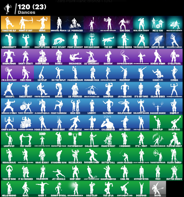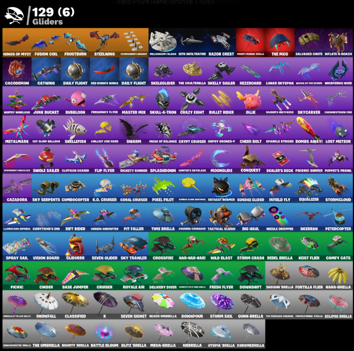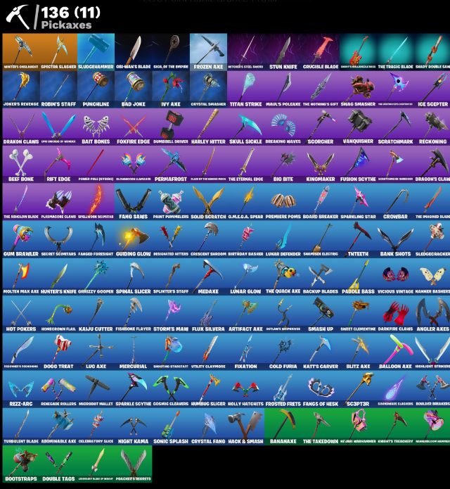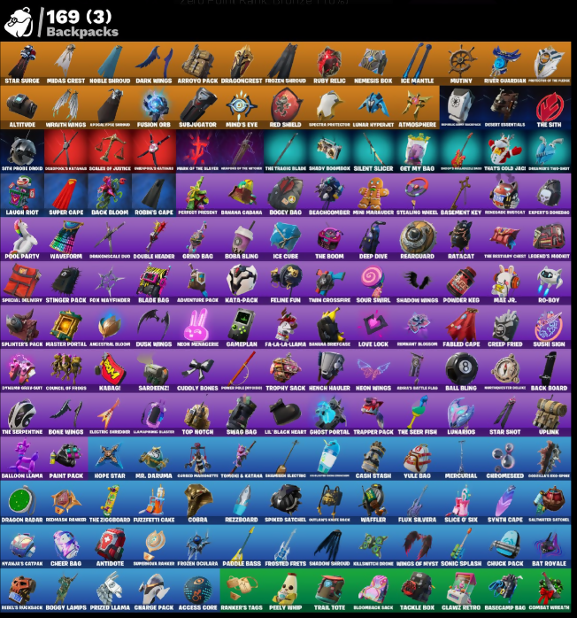 Abominable Axe, Access Core, Adventure Pack, Agent Peely, Altitude, Ancestral Bloom, Angler Axes, Antidote, Arcane Research, Arctic Adeline, Ardent's Battle Flag, Arroyo Pack, Artifact Axe, Atmosphere, B-Ball vs Scratch, Back Bloom, Back Board, Backup Blades, Bad Joke, Bait Bones, Balance Board, Ball Bling, Balloon Axe, Balloon Llama, Banana Briefcase, Banana Cabana, Bananaxe, Bank Shots, Base Jumper, Basecamp Bag, Basement Key, Bat Royale, Battle Bloom, Battle Call, Beach Umbrella, Beachcomber, Bee Bone, Beep Beep, Beerus, Big Bite, Big Haul, Big Mouth, Bim Bam Boom, Birddrag Flourish, Birthday Basher, Blackheart, Blade Bag, Blade of the Under Moon, Blitz Axe, Blitz Brella, Bloomback Sack, Blowing Bubbles, Board Breaker, Boba Bling, Boba Snack, Bogey Bag, Boggy Lamps, Bogstick, Boing!, Bombs Away!, Bone Boss, Bone Ravage, Bone Wings, Boogie Down, Boomin', Bootstraps, Boulder Breakers, Bounty Brella, Breakdown, Breaking Waves, Breakneck, Brutus, Bubbaloon, Bullet Rider, Butter Buddy, Bytes, Cacodemon, Calamity, Calculated, Call Me, Called Shot, Cameo vs Chic, Cash Stash, Catalyst, Catflip, Catwing, Cazadora, Celebratory Slice, Charge Pack, Cheer Bag, Cheer Bolt, Chef's Special, Chillest Vibe Rider, ChromeBrella, Chromeseed, Chromestruck Fire, Chuck Pack, Chugga-Chugga, Cinder, Classified, Clawz Retro, Clean Sweep, Cliffside Soarer, Cloaked Shadow, Clone Trooper, Cobra, Coin Flip, Cold Furia, Combat Wreath, Combocopter, Comfy Cats, Commander’s Deceit, Competitor’s Wide Brim, Conga, Conquest, Coral Cruiser, Cosmic Cleavers, Council Of Frogs, Count It!, Covered Crusader, Crazy Eight, Creep Fried, Crescent Shroom, Crossfire, Crowbar, Crucible Blade, Cruiser, Crypt Cruiser, Crystal Fang, Crystal Smasher, Cuddly Bones, Cursed Misonette, Cyclo Curl, DJ Yonder, Dab, Dabstand, Dagger Dance, Daily Flight, Dark Wings, Darkfire Claws, Darth Maul, Deadpool, Deadpool's Katana, Dealer’s Deck, Deep Dive, Delivery Diver, Desert Essentials, Designated Hitters, Do The Split, Doge Treat, Doom Slayer, Double Header, Double Tags, Downpour, Downshift, Doze Dab, Dracoscaly Duo, Dragon Radar, Dragon Stance, Dragon's Claw, Dragon-Hearted Brella, Dragoncrest, Drakon Claws, Drakon-Steel Hybrid, Drift, Droop!, Dumbbell Driver, Dusk, Dusk Knight, Dusk Wings, Dusty, Dynamic Drum-Suit, Eclipse Brella, Edgegrip's Decaying, Electric Sledge, Enforcer, Equalizer, Eren Jaeger, Eternal Voyager, Everything’s End, Expert's Bonebag, Expressionism, Fa-La-La-Llama, Fable, Fabled Cape, Fang Saws, Fanged Foresight, Fangs of Hesh, Featherweight, Feline Fun, Fiesty Marvel Umbrella, Fishbone Flayer, Fishskull, Fishstick, Fishy Flourish, Fist Bump, Fixation, Flashrock Breakdown, Flip Flyer, Flippin' Away, Flux Silvera, Focus, Fortilla Flier, Foundational Brella, Fox Wayfinder, Foxfire Edge, Free Flow, Frequency Flyer, Fresh Flyer, Frostburn, Frosted Frets, Frozen Axe, Frozen Oculla, Frozen Shroud, Fusion, Fusion Coil, Fusion Orbs, Fusion Scythe, Fuzzetti Cake, Gameplan, Gentleman's Dab, Geralt of Rivia, Get Funky, Get My Bag, Ghost Portal, Giddy-Up, Glidurr, Glowbomb Blade, Gods Will Be Played, Godzilla's Edo-Armor, Golf Clap, Grind Bag, Grizz, Grizzly Gooper, Guiding Glow, Gum Brawler, Gunn-Brella, Hack & Smash, Har-Har-Har!, Harley Hitter, Harley Quinn, Have A Seat, Haylee Skye, Heart Of A King, Heist Flier, Hello Friend, Helsie, Hench Hauler, High Five, Highlight Shatter, Highwire, Holly Hotchets, Homegrown Flail, Hope, Hope Star, Hot Pokers, Hot Slurp Balloon, Howl, Hula Hookin', Humbug Slicer, Hunter's Knife, Hunter’s Skyblade, Huntress, Hybrid, Hype!, Hypnoteyes, I Declare!, I Need Your Concentrate, I'm A Mystery, Ice Cube, Ice Mantle, Ice Scepter, Igni Sign, Imani, Imperial March, Impression Dance, Infield Fly, Inflate-A-Roach, Island Vibes, It Is Finished, It's Go Time!, It's... You?, Ivy Axe, Jaywalking, Jet Signals, Joker's Revenge, Journey vs Wamp, Junk Bucket, K.O. Cruiser, Kabagi, Kaiju Cutter, Kata-Pack, Katt, Katt's Carver, Killswitch, Killswitch Drone, Kings Of The Storm, Kinomaker, Knight's Treachery, Lana Llane, Laser Focused, Laugh Riot, Leafy Longboardin', Legend's Rodkit, Lightrider, Lights Up, Lil Sput, Lil' Black Heart, Lil' Longboat, Lil' Podracer, Lil' Prancer, Llamaphonic Blaster, Lllamacorn Express, Loading Bay Law of Supply, Lost Meteor, Love It!, Love Lock, Lug Axe, Lunar Defender, Lunar Glow, Lunar Hyperjet, Lunar Party, Lunar Skyspan, Lunarios, Lynx, Major Mancake, Majr Jr., Make A Seat, Mandalorian, Mannerslough Hammer, Mask Of Balance, Massai, Master Mix, Master Of Puppets, Master Portal, Maul's Poleaxe, Me & You, Medaxe, Mega-Brella, Memphis Glow Ponytail, Mentor's Onslaught, Meowscles, Meowskulls, Mercurial, Merry Marauder, Metalmark, Mid Drop, Midas Crest, Midas Rex, Millennium Falcon, Mind's Eye, Mini Marauder, Mini Slave Fight Club, Mirdroot Mallet, Mizuki, Molten Max Axe, Moonglide, Morgan Myst, Mr. Daruma, Mutiny, Mystica, Nana-Brella, Nanner Bashers, Needle Dropper, Nemesis Box, Neon Menagerie, Neon Wings, Never Gonna, Neyvar Harbinger, Nezumi, Night Nama, Ninja Stance: Leo, Nite Nite, Noble Shroud, Northwestern Clubber, Nyanlas's Catpak, O.M.E.G.A. Spear, Obi-Wan Kenobi, Obi-Wan's Blade, Ollie, OmegaRok, Onesie, Oopsy Drones-Y, Oscar, Outlaw's Knife Rack, Outlaw's Warprines, Paddle Bass, Paint Pack, Paint Pummellers, Pandemonium, Paws & Claws, Peely Whip, Peppermint Paraglider, Perfect Present, Permafrost, Petercopter, Picnic, Pit Faller, Pixel Pilot, Plasmagore Claws, Poacher's Shorts, Point & Shoot, Point It Out, Poison Ivy, Pom Of The Slayer, Pool Party, Powder, Powder Keg, Power Pole (Kyron), Power Poll (Hybrid), Premiere Poms, Prized Llama, Protector Of The Flock, Psionic Surfer, Punchline, Puppet’s Prowl, Ragnarok, Raiders Wayfarer, Ranker's Tags, Rap Boy, Ratcat, Ratcat Roamer, Ravage, Razor Crest, Ready vs Toxin, Real Slim Shady, Rearguard, Rebel Brella, Rebel's Rucksack, Reckoning, Red Knight, Red Robin’s Wings, Red Shield, Redline, Redmash Ranger, Reese, Regal Wave, Remn