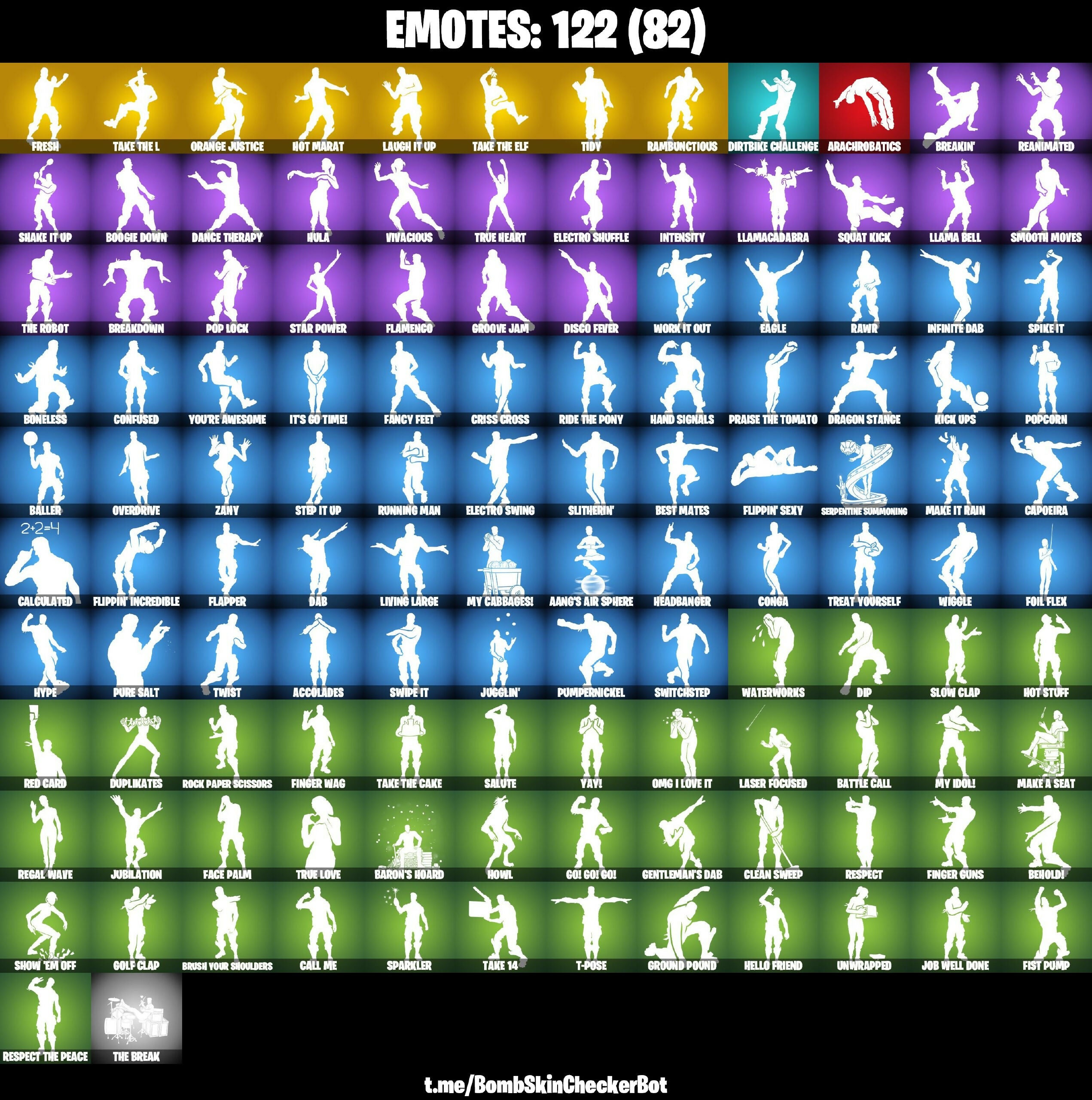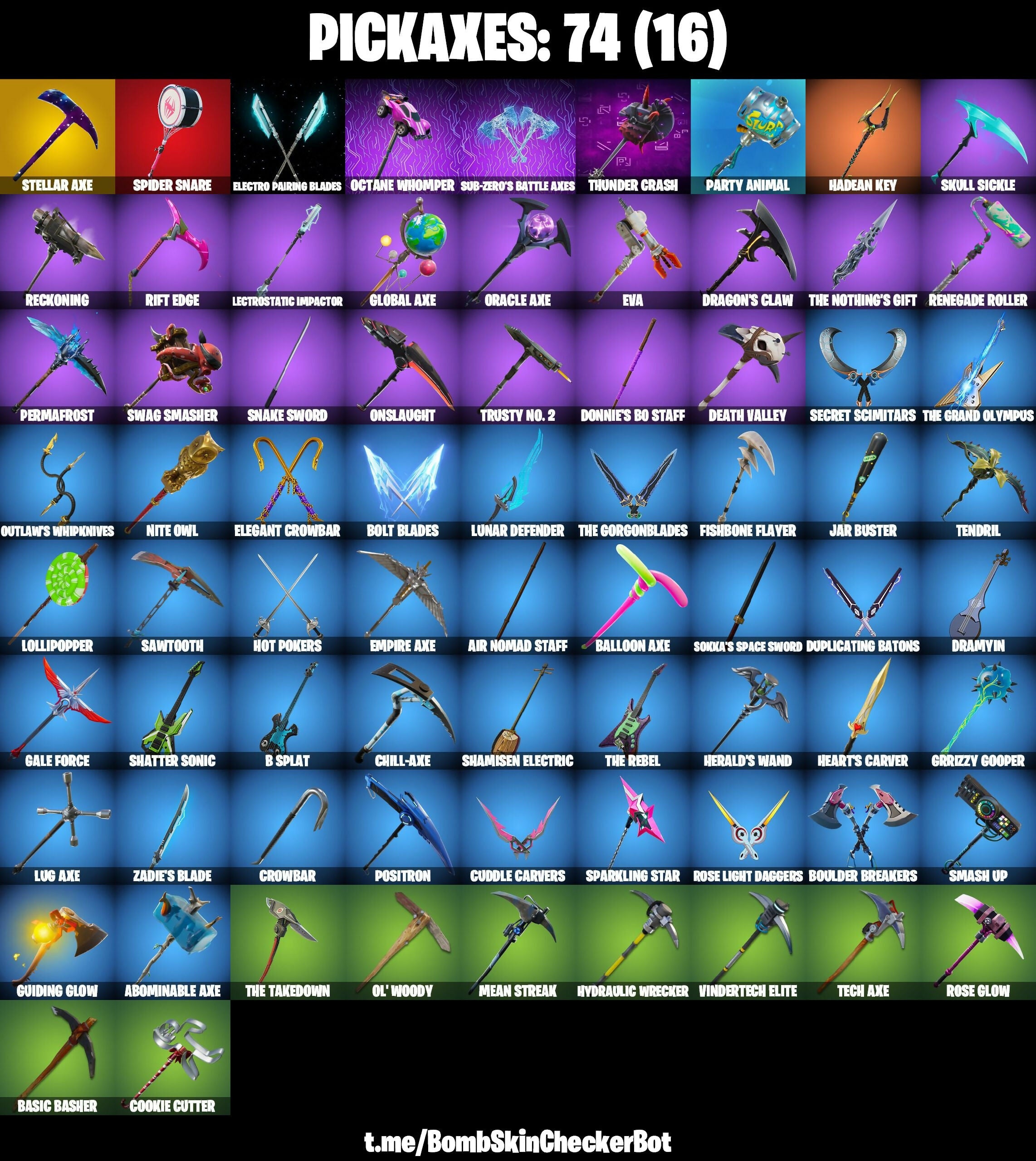 A.I.M., Aang, Aang's Air Sphere, Abominable Axe, Abstrakt, Accolades, Air Nomad Staff, Arachne, Arachnobatics, Archetype, Aurelian, Avatar State Aang, B Splat, Baller, Balloon Axe, Bandolier, Baron's Hoard, Basic Basher, Battle Call, Battle Hound, Battlehawk, Behold!, Best Mates, Blackheart, Bolt Blades, Boneless, Boogie Down, Boulder Breakers, Brainiac, Breakdown, Breakin', Brush Your Shoulders, Bunny Brawler, Bunnymoon, Bytes, Calamity, Calculated, Call Me, Capoeira, Carbide (Stage 5), Castor, Chill-Axe, Chopper, Chrome Punk, Clean Sweep, Cloaked Star, Confused, Conga, Cookie Cutter, Criss Cross, Crowbar, Cuddle Carvers, Cuddle Team Leader, DJ Yonder, Dab, Dance Therapy, Dark Bomber, Dark Voyager, Deadfire, Death Valley, Dip, Dire, Dirtbike Challenge, Disco Fever, Donatello, Donnie's Bo Staff, Dragon Stance, Dragon's Claw, Dramyin, Dreamflower, Drift (Stage 5), Dupli-Kate, Duplicates, Duplicating Batons, Dusk, EVA, Eagle, Electro Pairing Blades, Electro Shuffle, Electro Swing, Elegant Crowbar, Elite Agent, Empire Axe, Enforcer, Fable, Face Palm, Fancy Feet, Far Out Man, Fate, Finger Guns, Finger Wag, Fireworks Team Leader, Fishbone Flayer, Fist Pump, Flamenco, Flapjackie, Flapper, Flippin' Incredible, Flippin' Sexy, Flytrap, Foil Flex, Fresh, Frostbite, Frozen Love Ranger, Frozen Raven, Frozen Red Knight, Funk Ops, Galaxy, Gale Force, Gentleman's Dab, Giddy-Up, Global Axe, Go! Go! Go!, Golf Clap, Grimbles, Grizz, Grizzy Gooper, Groove Jam, Ground Pound, Growler, Guiding Glow, Hacivat, Hadean Key, Hand Signals, Hay Man, Headbanger, Heart's Carver, Heidi, Hello Friend, Herald's Wand, Hime, Hollowhead, Hot Marat, Hot Pokers, Hot Stuff, Howl, Hula, Huntress, Hybrid, Hydraulic Wrecker, Hype, Infinite Dab, Intensity, It's Go Time!, Jack Gourdon, Jar Buster, Job Well Done, Jubilation, Jugglin', Kick Ups, Laser Focused, Laugh It Up, Lectrostatic Impactor, Lennox Rose, Leviathan, Living Large, Llama Bell, Llamacadabra, Lollipopper, Love Ranger, Lug Axe, Lunar Defender, Magnus, Make A Seat, Make It Rain, Mayhem, Mean Streak, Meow Skulls, Mission Specialist, Mogul Master (CAN), Moonwalker, Musha, My Cabbages!, My Idol!, Nightshade, Nite Owl, NiteLite, Octane Whomper, Ol' Woody, Omega (Stage 5), Omen, Omg I Love It, Onslaught, Oracle Axe, Orange Justice, Outlaw's Whipknives, Overdrive, Overtaker, P.A.N.D.A Team Leader, Paradigm (Reality-659), Party Animal, Patch Patroller, Peekaboo, Permafrost, Plague, Pop Lock, Popcorn, Positron, Praise The Tomato, Pumpernickel, Pure Salt, Rabbit Raider, Ragnarok (Stage 6), Rambunctious, Rapscallion, Ravage, Raven, Rawr, Reanimated, Reckoning, Red Card, Red Knight, Red-Nosed Ranger, Redline, Regal Wave, Renegade, Renegade Roller, Respect, Respect The Peace, Rex, Ride The Pony, Rift Edge, Rock Paper Scissors, Rogue Agent, Rook, Rosa, Rose Glow, Rose Light Daggers, Rose Team Leader, Running Man, Rust Lord, Salute, Sanctum, Sasuke Uchiha, Sawtooth, Scarlet Defender, Scoundrel, Scourge, Secret Scimitars, Serpentine Summoning, Sgt. Green Clover, Shake It Up, Shamisen Electric, Shatter Sonic, Show 'Em Off, Sidewinder, Skull Ranger, Skull Sickle, Skull Trooper, Sky Stalker, Sledgehammer, Sleuth, Slitherin', Slow Clap, Smash Up, Smooth Moves, Snake Sword, Snorkel Ops, Sokka's Space Sword, Sparkler, Sparkling Star, Spider Gwen, Spider Knight, Spider Snare, Spike It, Spooky Team Leader, Squad Leader, Squat Kick, Stage Slayer, Star Power, Stellar Axe, Step It Up, Sub-Zero's Battle Axes, Summit Striker, Sun Strider, Survival Specialist, Swag Smasher, Swipe It, Switchstep, Synth Star, T-Pose, Take 14, Take The Cake, Take The Elf, Take The L, Tech Axe, Teknique, Tendril, The Ace, The Break, The Gorgonblades, The Grand Olympus, The Nothing's Gift, The Reaper, The Rebel, The Robot, The Takedown, The Visitor, Thunder Crash, Tidy, Tomatohead, Toxic Trooper, Treat Yourself, Tricera Ops, True Heart, True Love, Trusty No. 2, Twist, Twyn, Unwrapped, Valkyrie, Valor, Ventura, Venturion, Vertex, Vindertech Elite, Vivacious, Warpaint, Waterworks, Whistle Warrior, Whiteout, Wiggle, Wild Card, Wingman, Work It Out, Wukong, Yay!, You're Awesome, Zadie's Blade, Zany, Zoey