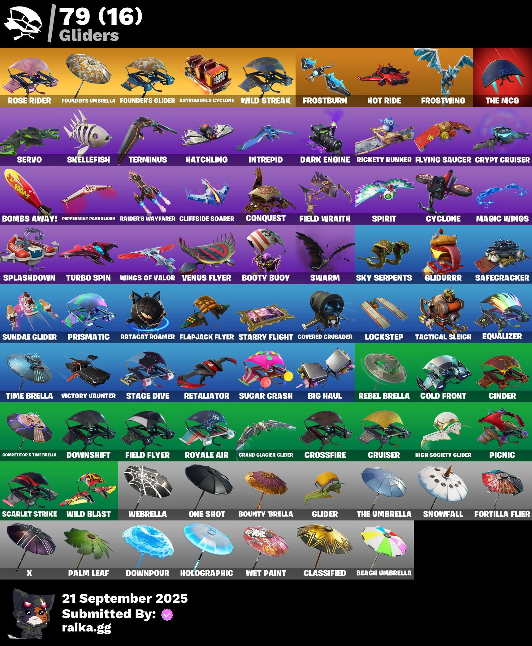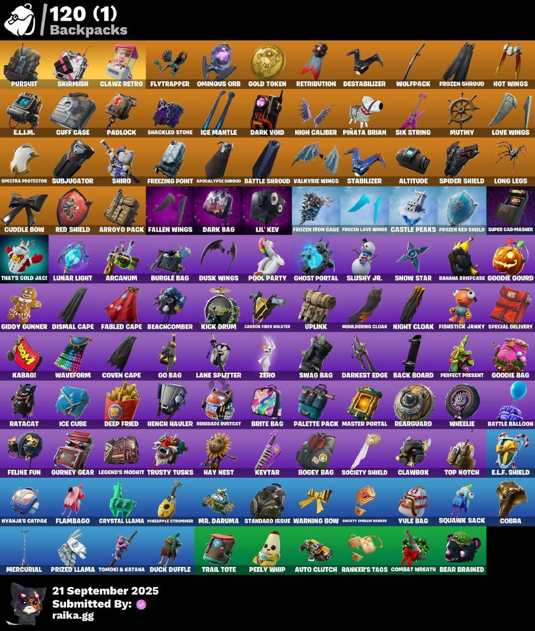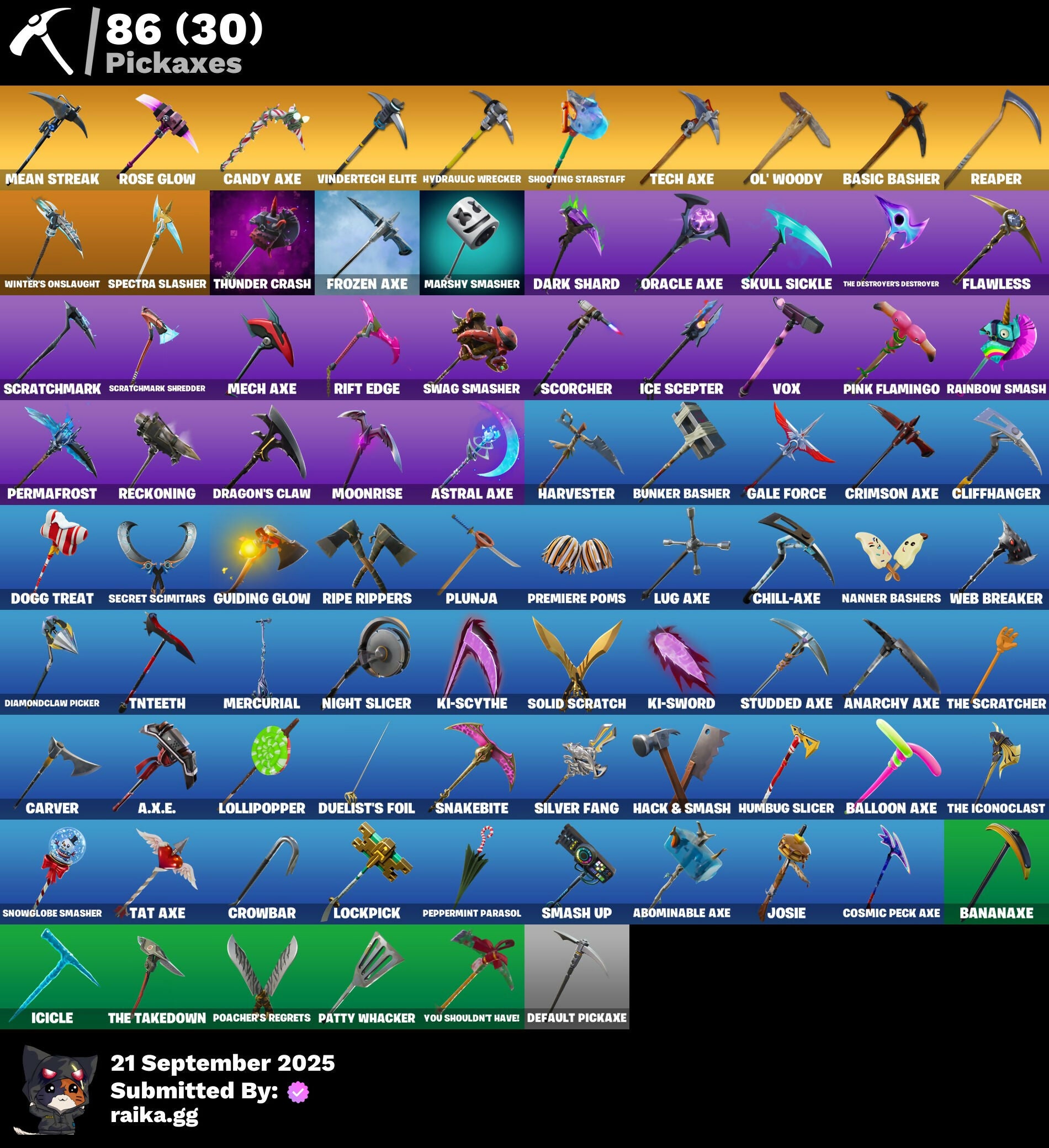 A.I.M., A.X.E., Abominable Axe, Agent Peely, Altitude, Anarchy Axe, Apocalypse Shroud, Arachne, Arcanum, Arroyo Pack, Assault Trooper, Astral Axe, Astroworld Cyclone, Aura, Auto Clutch, Back Board, Baller, Balloon Axe, Banana Briefcase, Bananaxe, Basic Basher, Battle Balloon, Battle Call, Battle Shroud, Battlehawk, Beach Umbrella, Beachcomber, Bear Brained, Beef Boss, Behold!, Big Haul, Billy Bounce, Blackheart, Blitz, Bogey Bag, Bombs Away!, Boogie Down, Booty Buoy, Bounty 'Brella, Brainiac, Breakdown, Bring It, Brite Bag, Brite Bomber, Brite Gunner, Brutus, Budge, Bulletproof, Bunker Basher, Bunker Jonesy, Bunny Hop, Bunnymoon, Burgle Bag, Burnout, Busy, Calamity, Calculated, Call Me, Candy Axe, Carbide, Carbon Fiber Holster, Carver, Castle Peaks, Cat Flip, Chill-Axe, Chun-Li, Cinder, Classified, Clawbox, Clawz Retro, Clean Groove, Cliffhanger, Cliffside Soarer, Cloaked Star, Cluck Strut, Cobra, Codename E.L.F., Cold Front, Combat Wreath, Competitor's Time Brella, Conga, Conquest, Cosmic Peck Axe, Coven Cape, Covered Crusader, Crackdown, Crimson Axe, Criss Cross, Criterion, Crossfire, Crowbar, Cruiser, Crypt Cruiser, Crystal Llama, Cuddle Bow, Cuddle Team Leader, Cuff Case, Cyclone, DJ Yonder, Dab, Dance Moves, Dance Therapy, Dark Bag, Dark Bomber, Dark Engine, Dark Shard, Dark Vanguard, Dark Void, Darkest Edge, Deadfire, Deep Fried, Default, Default Pickaxe, Demi, Destabilizer, Diamond Throne, Diamondclaw Picker, Dip, Dire, Disco Fever, Dismal Cape, Do The 'Split, Dogg Treat, Downpour, Downshift, Doze Dab, Dragon Stance, Dragon's Claw, Drift, Drop The Bass, Duck Duffle, Duelist's Foil, Dusk, Dusk Wings, E.L.F. Shield, E.L.I.M., Eagle, Electro Shuffle, Electro Swing, Ember, Enforcer, Equalizer, Evil Plan, Fable, Fabled Cape, Face Palm, Fallen Love Ranger, Fallen Wings, Fancy Feet, Fate, Feline Fun, Field Flyer, Field Surgeon, Field Wraith, Fierce, Finger Guns, Fishstick Janky, Fist Pump, Flambago, Flamenco, Flapjack Flyer, Flashback Breakdown, Flawless, Flippin' Away, Flippin' Incredible, Flippin' Sexy, Flying Saucer, Flytrap, Flytrapper, Foil Flex, Fortilla Flier, Founder's Glider, Founder's Umbrella, Free Flow, Freezing Point, Fresh, Frostbite, Frostburn, Frostwing, Frozen Axe, Frozen Fishstick, Frozen Iron Cage, Frozen Love Ranger, Frozen Love Wings, Frozen Nog Ops, Frozen Raven, Frozen Red Knight, Frozen Red Shield, Frozen Shroud, Gale Force, Gear Specialist Maya, Gentleman's Dab, Get Funky, Ghost Portal, Ghoul Trooper, Giddy Gunner, Giddy-Up, Ginger Gunner, Glider, Glidurr, Go Bag, Goku Black, Gold Token, Golf Clap, Goodie Bag, Goodie Gourd, Grand Glacier Glider, Groove Jam, Ground Pound, Guiding Glow, Gurney Gear, Hack & Smash, Hand Signals, Harvester, Hatchling, Hay Man, Hay Nest, Headbanger, Hello Friend, Hench Hauler, High Caliber, High Society Glider, Hime, Hitchhiker, Hollowhead, Holographic, Hoop Master, Hope, Hot Marat, Hot Ride, Hot Stuff, Hot Wings, Howl, Humbug Slicer, Huntress, Hybrid, Hydraulic Wrecker, Hype, I'm A Mystery, Ice Cube, Ice Mantle, Ice Scepter, Icicle, Infinite Dab, Intensity, Intrepid, It's Go Time!, Jack Gourdon, Jack Skellington, Jazz Hands, Job Well Done, Josie, Jubilation, Jugglin', Jump Jets, Jungle Scout, Kabag!, Keep It Mello, Kevtar, Ki-Scythe, Ki-Sword, Kick Drum, Kick Ups, Kiss Kiss, Laguna, Laid Back Shuffle, Lane Splitter, Laugh It Up, Legend's Modkit, Lil Split, Lil' Kev, Lil' Longboat, Liteshow, Living Large, Llama Bell, Lock It Up, Lockpick, Lockstep, Lollipopper, Long Legs, Love Ranger, Love Wings, Lug Axe, Luminos, Lunar Light, Luxe, Lynx, Magic Wings, Make It Rain, Marshy Smasher, Master Key, Master Portal, Mean Streak, Mech Axe, Meowscles, Mercurial, Metal Team Leader, Mic Drop, Mime Time, Montague, Moonrise, Mouldering Cloak, Mr. Daruma, Mutiny, My Idol!, Nana Nana, Nanner Bashers, Night Cloak, Night Slicer, Nightshade, Nisha, Nitelite, Nog Ops, Nyanja's Catpak, Oblivion, Ol' Woody, Omega, Omegarok, Omen, Ominous Orb, One Shot, Onesie, Oracle Axe, Orange Justice, Oscar, Overdrive, Overtaker, Padlock, Palette Pack, Palm Leaf, Pandemonium, Patch Patroller, Patty Whacker, Paws & Claws, Peace Out, Peekaboo, Peely, Peely Whip, Peppermint Paraglider, Peppermint Parasol, Perfect Present, Permafrost, Phone It In, Picnic, Pineapple Strummer, Pink Flamingo, Piñata Brian, Plague, Plunja, Poacher's Regrets, Point It Out, Poki, Pool Party, Pop Lock, Popcorn, Popular Vibe, Powder, Power Chord, Praise The Tomato, Premiere Poms, Prismatic, Prized Llama, Pumpernickel, Pursuit, Ragnarok, Raider's Wayfarer, Rainbow Smash, Raining Doubloons, Ranker's Tags, Rapscallion, Ratacat, Ratacat Roamer, Reaper, Rearguard, Rebel Brella, Reckoning, Red Knight, Red Shield, Redline, Regal Wave, Renegade Lynx, Renegade Raider, Renegade Rustcat, Respect, Respect The Peace, Retaliator, Retribution, Rickety Runner, Ride The Pony, Rift Edge, Ripe Rippers, Rock Out, Rock Paper Scissors, Rook, Rose Glow, Rose Rider, Rose Team Leader, Rox, Royale Air, Running Man, Runway Racer, Sad Trombone, Safecracker, Sanctum, Santa Dogg, Savor The W, Scarlet Strike, Scorcher, Scorecard, Scourge, Scratchmark, Scratchmark Shredder, Secret Scimitars, Sentinel, Servo, Sgt. Drake, Sgt. Winter, Shackled Stone, Shaolin Sit-Up, Shimmer, Shiro, Shooting Starstaff, Showstopper, Side Hustle, Sidewinder, Sign Spinner, Silver Fang, Six String, Skellefish, Skirmish, Skull Ranger, Skull Sickle, Skull Trooper, Sky Serpents, Sledgehammer, Slingshot, Slitherin', Slow Clap, Slushy Jr., Slushy Soldier, Smash Up, Smeeze, Smooth Moves, Snakebite, Snap, Snoozefest, Snorkel Ops, Snow Star, Snowfall, Snowfoot, Snowglobe Smasher, Society Emblem Banker, Society Shield, Solid Scratch, Something Stinks, Special Delivery, Spectra Knight, Spectra Protector, Spectra Slasher, Spider Knight, Spider Shield, Spike It, Spirit, Splashdown, Spooky Team Leader, Sprinkler, Squad Leader, Squat Kick, Squawk Sack, Stabilizer, Stage Dive, Stage Slayer, Standard Issue, Star Power, Starry Flight, Stratus, Studded Axe, Subjugator, Su