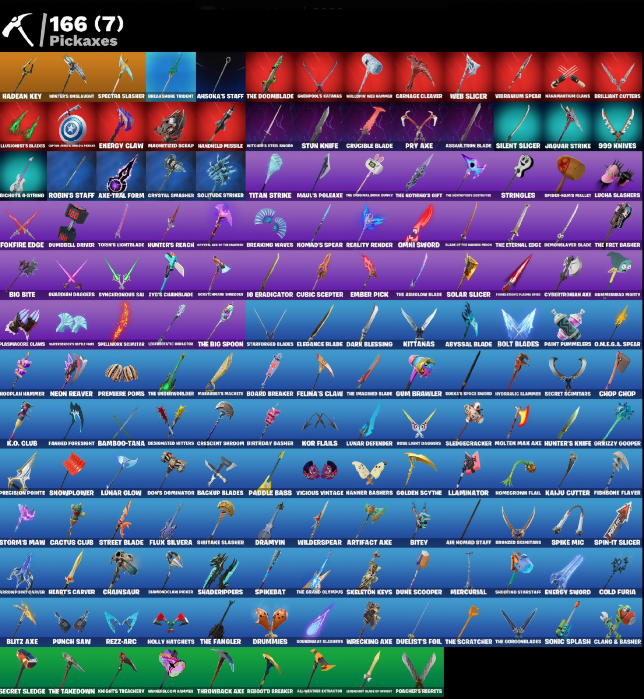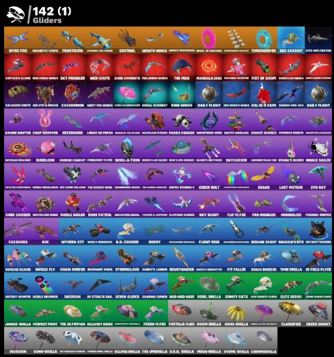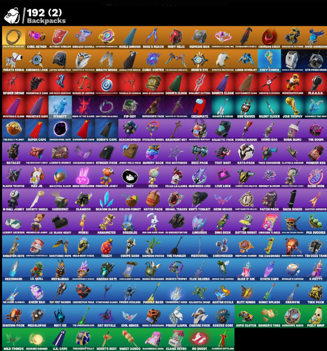 (SNIFF), 10 Field Flyer, 10 Stealth Sail, 4 Petty?, 8-Ball Janky, 909 Knives, 999 Knives, Aang, Aang's Air Sphere, Absenz, Abyssal Blade, Access Core, Adventurer Assault, Aegisora's Staff, Aerial Acrobat, Agent Jones, Agent Patch, Ahsoka Tano, Air Nomad Staff, Ancestral Bloom, Andromeda, Antonia, Aphrodite, Apocalypse Shadow, Arcane Research, Arctic Adeline, Artemis, Artifact Axe, Aurora Effect, Auto Clutch, Autobot Emblem, Avatar Cycle, Avatar State Aang, Avatar's Flourish, Axe-Tral Form, Azureth PTSO Stance, Back Board, Backup Blades, Balance Board, Bamboo Patch, Bamboo-Tana, Basement Key, Bat Royale, Beach Breezer, Beachcomber, Beacon Glass, Bean Bag, Beatzbunny, Bedside Manner, Bichette G-Strings, Big Bite, Big Fan, Bike To Go, Birdmano Flourish, Birthday Basher, Bitey, Bladed Trapvax, Blitz Axe, Blitz Wings, Bloodbath Assassins, Bloomback Sack, Board Breaker, Boba Bling, Boba Snack, Bolt Blades, Bone Patrol, Bones Dominator, Boogie Down, Book Of Calamity, Bootsein' Cats, Breaking Waves, Brilliant Cutters, Bristant Blossom, Brite Moves, Brite Raider, Bronze Scimitar, Bubbloon, Bugsy, Butter Robot, Buzz Pack, Bytes, Cacodemon, Cactus Club, Calico Donut, Call Me, Called Shot, Cambion Fire Helix, Captain Jones, Captain Lamerica, Captain’s Glider, Card Drop, Cardistry, Carnage, Carriage Cleaner, Cazadora, Celornus Battlefield, Cerberus, Chain Surfer, Chainsaur, Chainstick Pack, Charge Pack, Charlotte, Cheer Bag, Chef's Special, Chief Bolt, Choice Knit, Chop Chop, Chop Dropper, Chrome Punk, ChromeBrella, Chronoised, Chronos Lock, Clang & Basher, Clara, Clark Kent, Classified, Clawbrot, Clawz Retro, Clean Sweep, Cliffside Soarer, Clone Trooper, Cloudy Cloudcrusher, Cluck, Clutch & Dagger, Cold Furia, Comfy Cats, Commander’s Obedient, Conch Call, Conjure Weapon, Coruscant Guard, Cough Sash, Count It!, Cozy Conch, Crack It, Crash Express, Crazadar Wings, Crescent Shurian, Crewmate, Crewmate's Katana, Crimson Crest, Crosswalk Cleanup, Crowned Gesture, Crucible Blade, Crystal Smasher, Cube Aether, Cube Cruiser, Cubic Scepter, Cubic Vortex, Cybertronian Axe, Cyclo Curl, D'ark, Dagger Dance, Daily Flight, Dark Blessing, Dark Symbiote, Darth Maul, Deepfrost's Thug Coat, Delivery Diver, Demolisher Blade, Designated Hitters, Diamond Throne, Dice Roll, Dimensional Gate, Dino Deck, Disassemble, Distraction Dance, Do The Split, Doctor Slone, Doctor Strange, Doom, Doom Brella, Doom Slayer, Doom's Cloak, Doom's Domain, Double Counterpoint, Double Header, Doze Dab, Drafvin, Dramatic Flares, Dramvin, Drome Drifter, Drone-Strike Fire, Dropmoon's Timer, Drummies, Duelist's Foil, Dumbbell Driver, Dune Scooper, Dusk Knight, Dusty, Echo & String, Eclipse Brella, Eggar, Electro Gidroen, Elegance Blade, Elite Servo, Ember Pick, Emma Frost, Empress Fan Dance, Enchanted Uplifter, Endless Scroll, Energy Claw, Energy Sword, Era, Eren Jaeger, Erisa, Essasslain Torn Blade, Evasive Maneuvers, Evie, Explorer Emile, Expressionism, Fabio Sparklemane, Fang Dance, Fangbreaker, Fanned Forszent, Felina's Claw, Fezzi, Fire Show, Fireworks Salvo, Fish Thicc, Fishbone Flayer, Fishstick Janky, Fist of Doom, Fiz-a-la-llama, Flaky Feast, Flashback Breakdown, Flawless Frame Drone, Flight Risk, Flip Flyer, Flippin' Away, Fluk Silvera, Flux Silvera, Foil Flex, Forestfall Brella, Fortilla Flier, Foundation's Mantle, Four Hornets Darts, Fox Wayfinder, Foxfire Edge, Frequency Flyer, Fresh Flyer, Frostburn, Frosty, Frozen Corolla, Frozen Freeze's Funk Scythe, GGWP, Galactic Pack, Geralt of Rivia, Get Out Of My Room, Gilded Stinger Twitch, Godolphin Katana, Golden Scythe, Good Game Well Played, Good Guy, Gorgon's Aegis, Got Nyteroots Dye Pack, Grand Glider Glider, Greebles, Grind Bag, Grizzly Gooper, Grriz, Guardian Daggers, Guff Gringle, Guggimon, Gum Brawler, Gumbo, Gummy Sack, Gun-Brella, Gunnar, Gwen-Step, Hadean Chariot, Hadean Gate, Hadean Key, Hades, Hammerhead North, Hand-Forged, Handheld Missile, Hanner Bashers, Har-Har-Har!, Hard Lagoon Celebration, Harlowe, Harmotized Scrap, Hastyblade's Cloak, Haylee Skye, Heart's Rest, Heartburst, Hearts Carver, Heartwinder, Hellfire Dance, Helsie, Heroes of the Storm, Hex-Hug's Hornsack, Highwire, Holiday Boxy, Holly Hatchets, Homegrown Flail, Hope, Hot Slurp Balloon, Hunter's Knife, Hunter's Reach, Huntress Lyre, Hydraulic Slammer, Hype!, Hypnotic Eyes, I'm A Mystery, ID Eradicator, IQ Orchestrator, Idol Wings, Igni Sign, Ignition Pack, Imani, Infield Fly, Inflate-A-Broach, Inky, Inky Imp, Invasion, Iron Society Glider, It's... You?, J.B. Chimpanski, Jaguar Strike, Jedi-Boot Pack, Jigsaw Breacher, Joey, Joia Trophy, Jones' Field Pack, Junker Brella, K.O. Club, K.O. Cruiser, Kado Thorne, Kaiju Cutter, Kal-El’s Cape, Kata-Pack, Kiara K.O., Kick Back, Killswitch, Killswitch Drone, King Wings, Kittanas, Knife Sharpener, Kor Flails, Kori, Korra, Krisabelle, Kymera, Laminator, Lara Croft, Laser Focused, Leafy Longboardin', Lectro Guards Pack, Legend's Mookxit, Lennox Rose, Lightrider, Lil Quill, Lil Rover, Lil Split, Lil' Black Heart, Lil' Ghost, Lil' Longboat, Lil' Monster, Lil' Podracer, Lil' Prancer, Lil' Saucer, Lil' T-6 Shuttle, Llamawings Blades, Lorenzo, Lost Meteor, Love It!, Love Lock, Lt. John Llama, Lucha Slasher, Lunar Charge, Lunar Defender, Lunar Glow, Lunar Hyperjet, Lunar Party, Lunar Skyspan, Lunariog, Luxury Lockbox, M.O.A.B.B., Madmaddawn Picker, Mae, Mae Jr., Magnatonium Gavel, Magnetic Steps, Magnetos Cape, Make A Seat, Man of the Slayer, Mandala Disc, Margarret's Magnet, Mariposa, Marshmallow Patrol, Massai, Maul's Poleaxe, Medusa, Mega-Brella, Megalo Don, Megalopak, Meoomtooth Plush, Meow Skulls, Mercurial, Metalahad, Midnight Red Wakanda, Mimahana, Mind's Eye, Mini Slaver Flamebird, Mizuki, Mogell Megalodon, Molten Max Axe, Mono Messenger, Montague, Mooncloaks Janky, Moondrop Breezer, Moonglide, Moonlit Mystery, Morai, Mr. Dappermint, Mugati 2, My Cabbages!, Myanja's Catpak, Mysterio, Mysterious Cloak, Mystery's Magic Trick, Mystica, Nailed It, Nana-Brella, Nanameter,