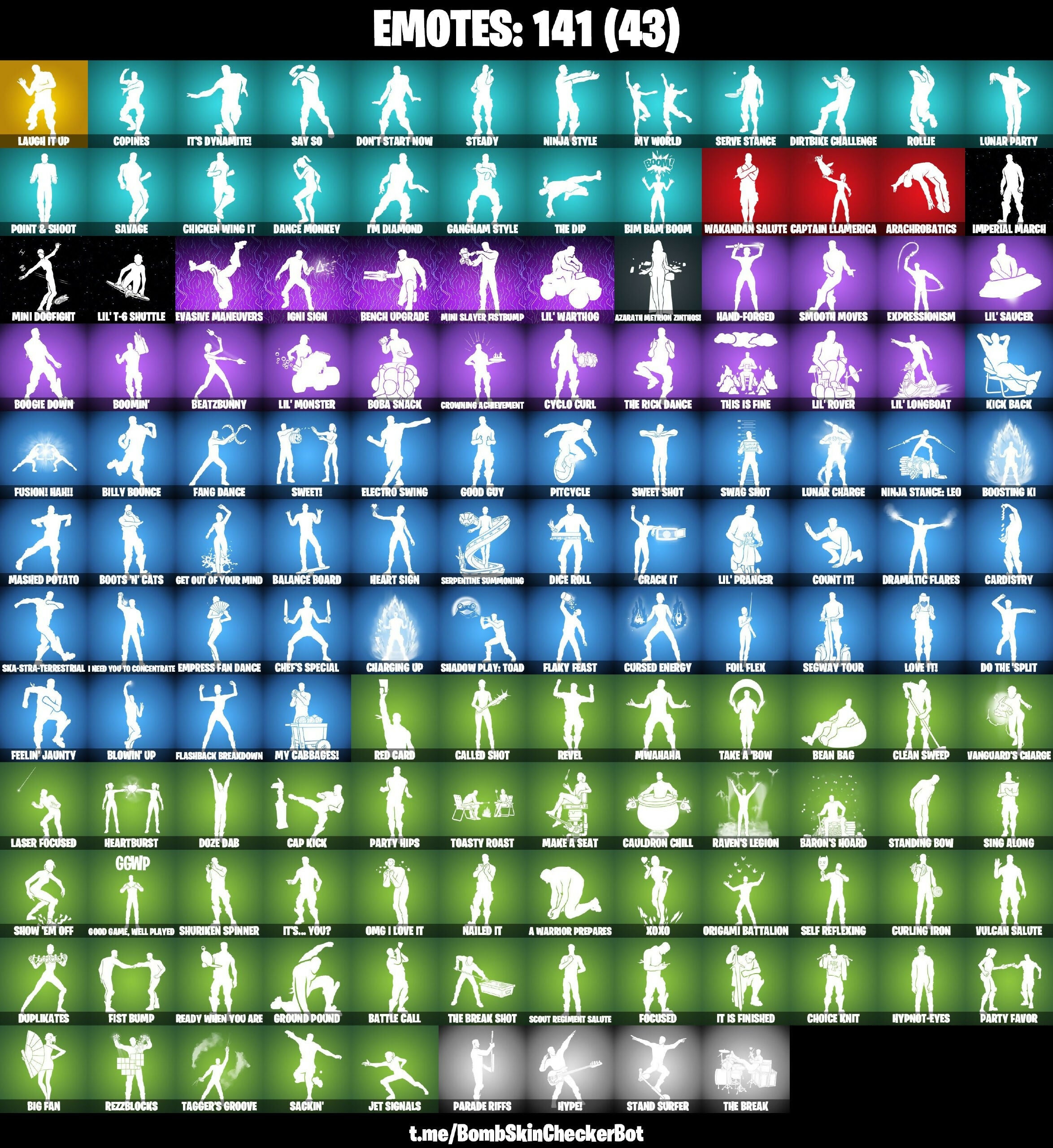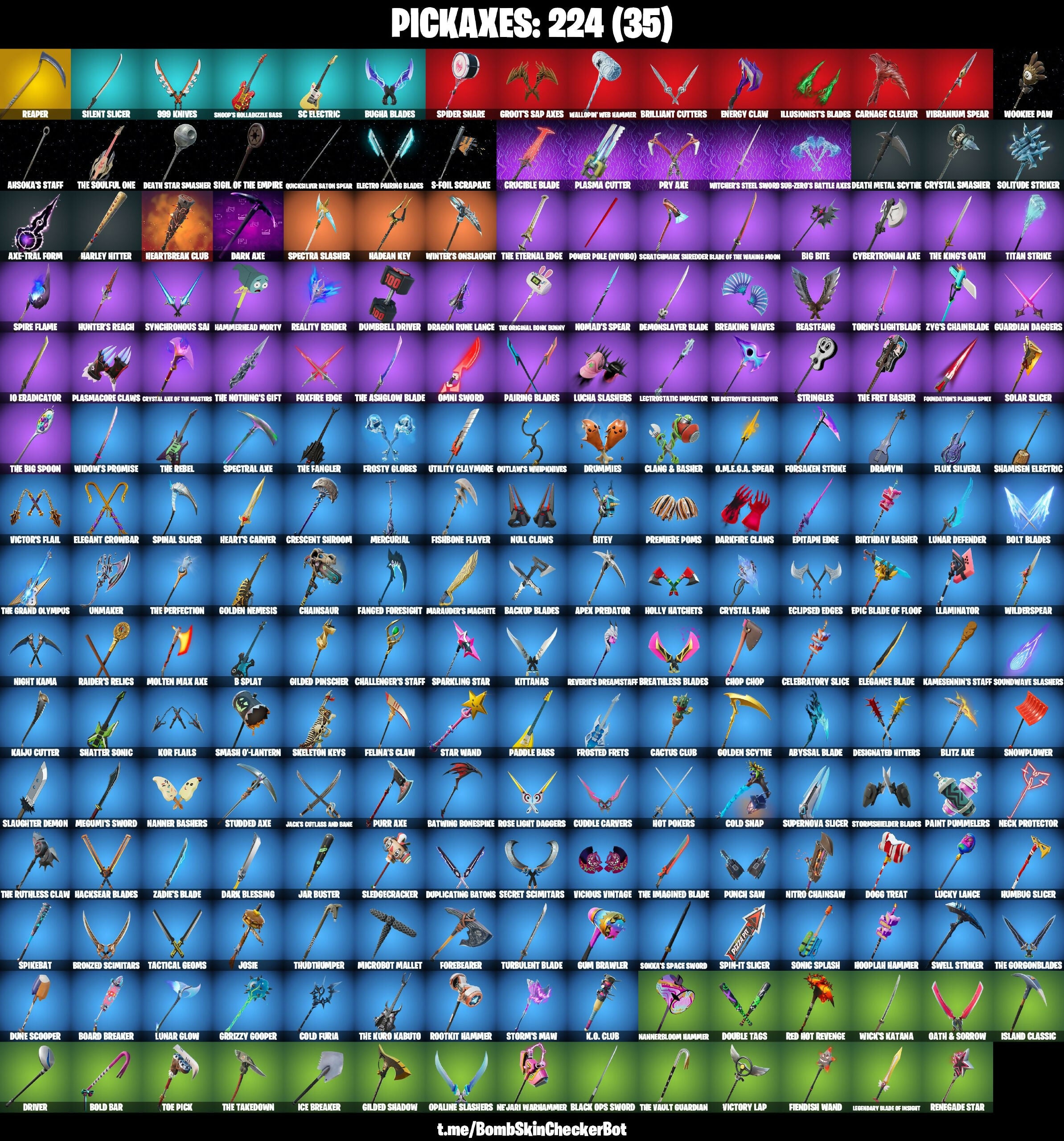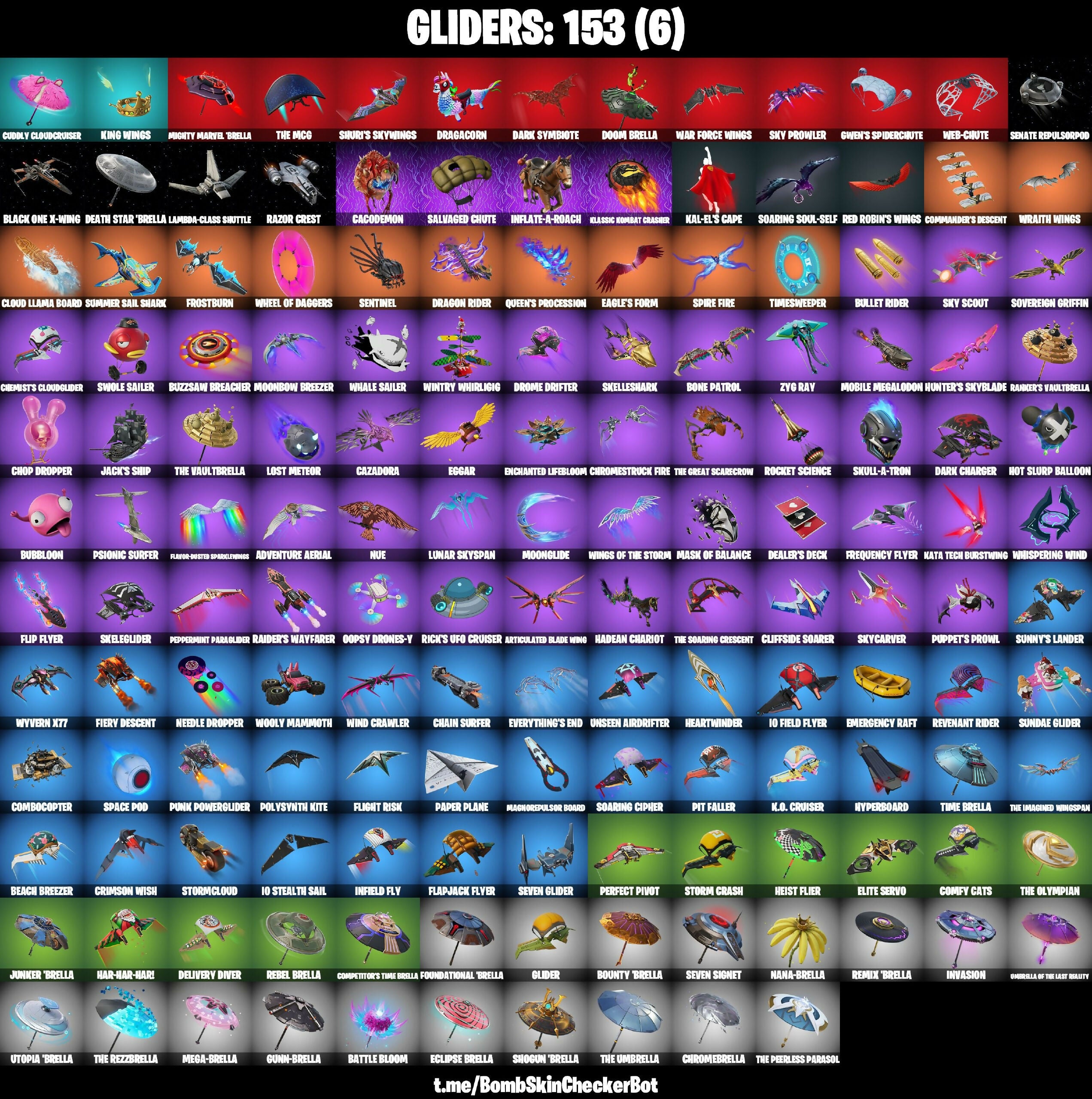 10 Field Flyer, 10 Stealth Sail, 999 Knives, A Warrior Prepares, Absenz, Abyssal Blade, Adira, Adventure Aerial, Agent Jones, Ahsoka's Staff, Antonia, Apex Predator, Arachrobatics, Arctic Adeline, Articulated Blade Wing, Aura, Axe-tral Form, Azarath Metrion Zinthos!, B Splat, Backup Blades, Balance Board, Baron's Hoard, Battle Bloom, Battle Call, Batwing Bonespike, Beach Breezer, Bean Bag, Beastfang, Beatzbunny, Beerus, Bench Upgrade, Big Bite, Big Fan, Billy Bounce, Bim Bam Boom, Birthday Basher, Bitey, Black One X-Wing, Black Ops Sword, Blaze, Blitz Axe, Blitz Knight, Blowin' Up, Board Breaker, Boba Snack, Bold Bar, Bolt Blades, Bone Patrol, Boogie Down, Boomin', Boosting Ki, Boots 'N' Cats, Bounty Brella, Boxy, Breaking Waves, Breathless Blades, Brilliant Cutters, Bronzed Scimitars, Bubbloon, Bugha Blades, Bullet Rider, Buzzsaw Breacher, Bytes, Cacodemon, Cactus Club, Called Shot, Cap Kick, Captain Llamerica, Cardistry, Carnage, Carnage Cleaver, Cauldron Chill, Cazadora, Celebratory Slice, Chain Surfer, Chainsaur, Challenger's Staff, Champion Siren, Champion Sparkplug, Charging Up, Charlotte, Chef's Special, Chemist's Cloudglider, Chicken Wing It, Choice Knit, Chop Chop, Chop Dropper, Chrome Punk, Chromebrella, Chromestruck Fire, Clang & Basher, Classic Kombat Crasher, Clean Sweep, Cliffside Soarer, Cloud Llama Board, Cluck, Cold Furia, Cold Snap, Color Crush, Combat Tech Jules, Combocopter, Comfy Cats, Commander's Descent, Competitor's Time Brella, Copines, Count It!, Crack It, Crescent Shroom, Crimson Wish, Crowning Achievement, Crucible Blade, Crystal Axe of the Masters, Crystal Fang, Crystal Smasher, Cuddle Carvers, Cuddly Cloudcruiser, Curling Iron, Cursed Energy, Cybertronian Axe, Cyclo Curl, D'ark, Dance Monkey, Dark Axe, Dark Blessing, Dark Charger, Dark Jonesy, Dark Red Knight, Dark Symbiote, Dark Wild Card, Darkfire Claws, Darth Vader, Dealer's Deck, Death Metal Scythe, Death Star 'Brella, Death Star Smasher, Delivery Diver, Demonslayer Blade, Desert Dominator, Designated Hitters, Dice Roll, Dirtbike Challenge, Do The 'Split, Doctor Slone, Dogs Treat, Don't Start Now, Doom Brella, Doom Slayer, Double Tags, Doze Dab, Dragacorn, Dragon Rider, Dragon Rune Lance, Dramatic Flares, Dramyin, Driver, Drome Drifter, Drummies, Dumbbell Driver, Dune Scooper, Dupli-Kate, Duplicates, Duplicating Batons, Dusty, Eagle's Form, Eclipse Brella, Eclipsed Edges, Eggar, Electro Pairing Blades, Electro Swing, Electrostatic Impactor, Elegance Blade, Elegant Crowbar, Elite Servo, Emergency Raft, Empress Fan Dance, Enchanted Lifebloom, Energy Claw, Epic Blade of Floof, Epitaph Edge, Era, Eren Jaeger, Evasive Maneuvers, Everything's End, Evie, Expressionism, Fabio Sparklemane, Fang Dance, Fanged Foresight, Feelin' Jaunty, Felina, Felina's Claw, Fiendish Wand, Fiery Descent, Fish Thicc, Fishbone Flayer, Fist Bump, Flaky Feast, Flapjack Flyer, Flashback Breakdown, Flavor-Dusted Sparkling, Flight Risk, Flip Flyer, Flux Silvera, Focus, Focused, Foil Flex, Forebearer, Forsaken Strike, Foundation's Plasma Spike, Foundational Brella, Foxfire Edge, Frequency Flyer, Frostburn, Frosted Frets, Frosty Globes, Frozen Love Ranger, Frozen Raven, Frozen Red Knight, Fusion! Hah!!, GGWP, Gangnam Style, Geralt Of Rivia, Get Out Of Your Mind, Ghoul Trooper, Gilded Pinscher, Gilded Shadow, Glider, Gold Blooded Ace, Golden Nemesis, Golden Scythe, Good Game, Well Played, Good Guy, Grizzly Gooper, Groot's Sap Axes, Ground Pound, Grriz, Guardian Daggers, Guggimon, Gum Brawler, Gumbo, Gunn-Brella, Gunnar, Gwen's Spiderchute, Hacksear Blades, Hadean Chariot, Hadean Key, Hammerhead Morty, Hand-Forged, Har-Har-Har!, Harley Hitter, Harlowe, Haven, Haxasaur, Heart Sign, Heart's Carver, Heartbreak Club, Heartbreak Ranger, Heartburst, Heartwinder, Heist Flier, Helsie, Highwire, Holiday Boxy, Holly Hatchets, Hombug Slicer, Hooplah Hammer, Hot Pokers, Hot Slurp Balloon, Hunter's Reach, Hunter's Skyblade, Hush, Hype!, Hyperboard, Hypnot-Eyes, I Need You To Concentrate, I'm Diamond, IO Eradicator, Ice Breaker, Igni Sign, Illusionist's Blades, Imani, Imperial March, Indiana Jones, Infield Fly, Inflate-A-Roach, Invasion, Iridia Vayne, Isaac Clarke, Island Classic, It Is Finished, It's Dynamite!, It's... You?, J.B. Chimpanski, Jack's Cutlass and Bane, Jack's Ship, Jar Buster, Jet Signals, Joey, Joltara, Josie, Junker 'Brella, K.O. Club, K.O. Cruiser, Kado Thorne, Kaiju Cutter, Kal-El's Cape, Kamesennin's Staff, Kata Tech Burstwing, Khaby Lame, Kiara K.O., Kick Back, King Wings, Kittanas, Kondor, Kor, Kor Flails, Krisabelle, Kymera, Lambda-Class Shuttle, Lara Croft, Laser Focused, Laugh It Up, Legendary Blade of Insight, Lennox Rose, Lexa, Lil Split, Lil' Longboat, Lil' Monster, Lil' Prancer, Lil' Rover, Lil' Saucer, Lil' T-6 Shuttle, Lil' Warthog, Llaminator, Lorenzo, Lost Meteor, Love It!, Lt. John Llama, Lucha Slashers, Lucky Lance, Lunar Charge, Lunar Defender, Lunar Glow, Lunar Party, Lunar Skyspan, Mae, Magma, MagnoRepulsor Board, Make A Seat, Malik, Malloph Web Wranger, Mancake, Mandalorian, Marauder's Machete, Mariposa, Mashed Potato, Mask of Balance, Massai, Mave, Mega-Brella, Megumi's Sword, Menace, Meow Skulls, Mercurial, Microbot Mallet, Midas' Shadow, Mighty Marvel Brella, Min-Joon, Mina Park, Mini Dogfight, Mini Slayer Astbound, Mizuki, Mobile Megalodon, Molten Max Axe, Moonbow Breezer, Moonglide, Mwahaha, My Cabbages!, My World, Mystica, Nailed It, Nana-Brella, Nanner Bashers, Nannerbloom Hammer, Naruto Uzumaki, Neck Protector, Needle Dropper, Nejari Warhammer, Nezumi, Night Kama, Ninja Stance: Leo, Ninja Style, Nitro Chainsaw, Nolan Chance, Nomad's Spear, Nue, Null Claws, O.M.E.G.A. Spear, OMG I Love It, Oath & Sorrow, Oblivion, Of the Waking Moon, Omegarok, Omni Sword, Oopsy Drones-Y, Opaline Slashers, Optimus Prime, Origami Battalion, Outlaw's WhipKnives, Paddle Bass, Paint Pummelers, Pairing Blades, Paper Plane, Parade Riffs, Paradigm (Reality-659), Party Favor, Party Hips, Peppermint Paraglider, Perfect Pivot, Perfect Sh