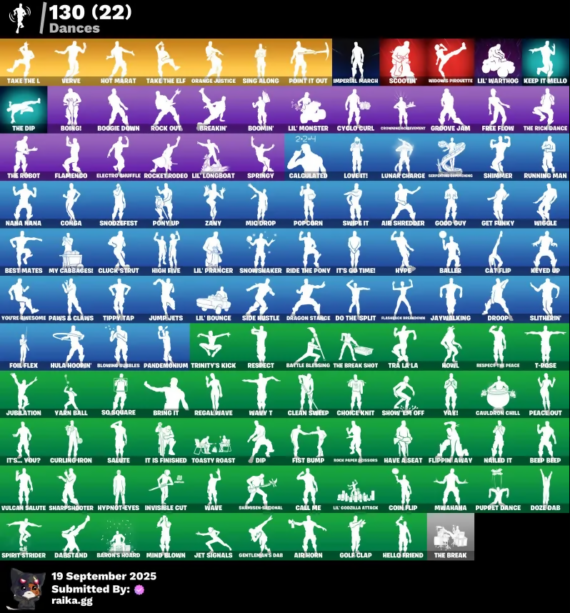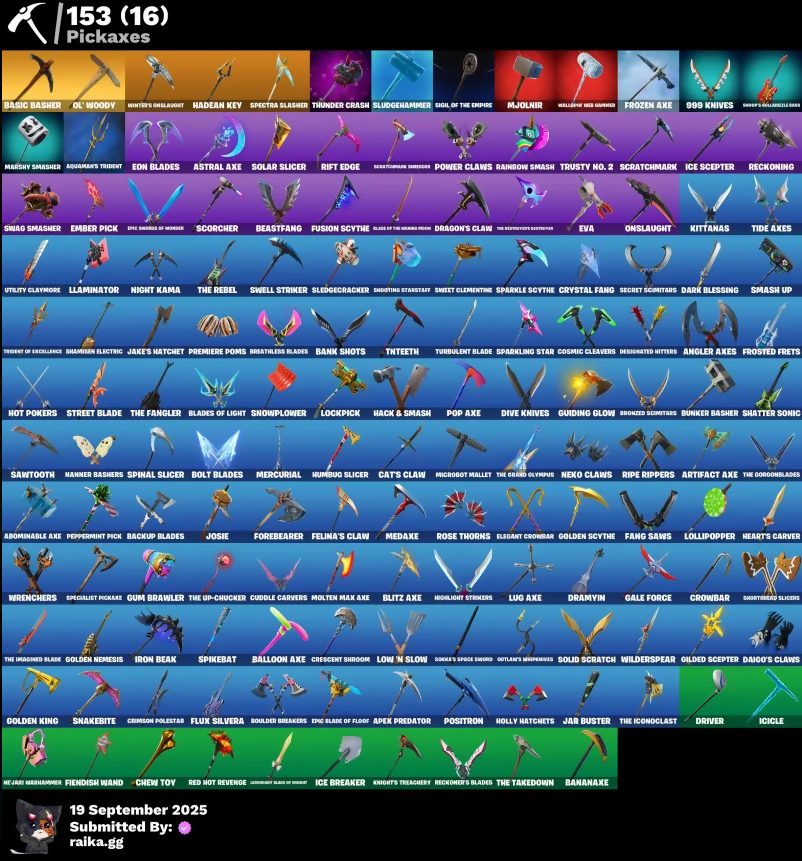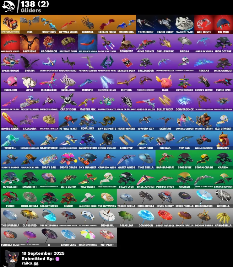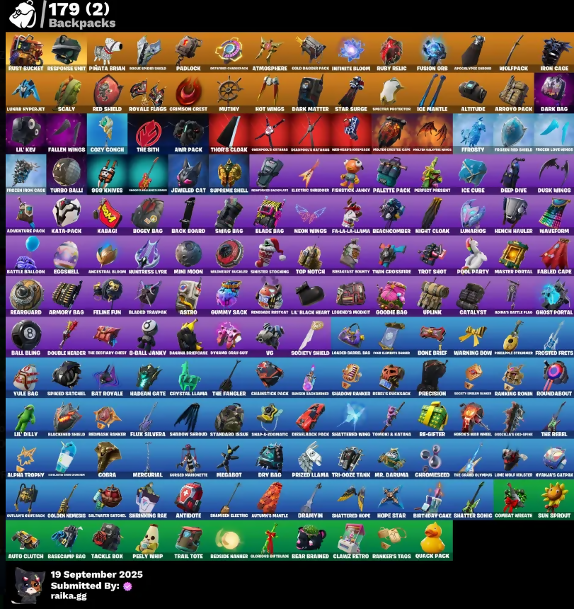 10 Field Flyer, 8-Ball Janky, 8-Ball vs Scratch, 999 Knives, AWR Pack, Abominable Axe, Adira's Battle Flag, Adventure Pack, Agent Peely, Air Horn, Air Shredder, Alpha Trophy, Altitude, Ancestral Bloom, Angler Axes, Anteater Bumbleshit, Antidote, Apex Predator, Apocalyptic Stormgo, Appa, Aquaman, Aquaman's Trident, Arcana, Armory Bag, Arroyo Pack, Artifact Axe, Astral Axe, Astro, Astroworld Cyclone, Atmosphere, Auto Clutch, Autumn's Mantle, Back Board, Backup Blades, Ball Bling, Baller, Balloon Axe, Banana Bomber, Banana Briefcase, Bananaxe, Bank Shots, Baron's Hoard, Base Jumper, Basecamp Bag, Basic Basher, Bat Royale, Battle Balloon, Battle Blessing, Battlehawk, Baymax Wings, Beach Umbrella, Beachcomber, Bear Brained, Beastfang, Beastmode, Bedside Manner, Beep Beep, Best Mates, Big Haul, Birthday Cake, Blackened Shield, Blackheart, Blade Bag, Blade Of The Wailing Dead, Bladed Travpak, Blades Of Light, Blitz Axe, Blowing Bubbles, Bogey Bag, Boing!, Bolt Blades, Bombs Away!, Bone Brief, Boogie Bomb Shield, Boogie Down, Boomin', Boulder Breakers, Bounty 'Brella, Breakfast Bounty, Breakin', Breathless Blades, Brella, Bring It, Brite Bomber, Bronzed Scimitars, Brutus, Bubloon, Bullet Rider, Bunker Basher, Bunker Jonesy, Bunny Brawler, Cacodemon, Cactus's Cloudglider, Calamity, Calculated, Call Me, Cameo vs Chic, Carbide, Carbon, Cat Flip, Cat's Claw, Catalyst, Cauldron Chill, Cazadora, Chainstick Pack, Chew Toy, Choice Knit, Chromeseed, Cinder, Circuit Breaker, Classified, Clawz Retro, Clean Sweep, Cliffside Soarer, Cluck Strut, Clutch, Cobalt, Cobra, Coin Flip, Combat Wreath, Competitor's Time Breaker, Conga, Conquest, Convergence, Cosmic Cleavers, Covered Crusader, Cozy Conch, Crazy Eight, Crescent Shroom, Crimson Crest, Crimson Polestar, Crimson Wish, Crossfire, Crowbar, Crowning Achievement, Cruiser, Crystal Fang, Crystal Llama, Cuddle Carvers, Curling Iron, Cursed Marionette, Cyclo Curl, D'ark, DJ Yonder, Dabstand, Daigo, Daigo's Claws, Dark Bag, Dark Blessing, Dark Bomber, Dark Charger, Dark Doggo, Dark Matter, Dark Voyager, Daybreak Wristblade, Deadpool, Deadpool's Katanas, Dealer's Deck, Deep Dive, Designated Hitters, Dieselpack Pack, Dip, Dire, Dive Knives, Do The Split, Doom Dancer, Double Header, Downpour, Downshift, Doze Dab, Dragon Stance, Dragon's Claw, Dramyin, Dream, Drift, Driver, Droop, Dry Bag, Dusk, Dusk Wings, Dynamo Grawl Suit, Eagle's Form, Ecoshell, Electric Shredder, Electro Shuffle, Elegant Crowbar, Elite Agent, Elite Servo, Ember, Ember Pick, Enchanted Lifebloom, Eon Blades, Epic Blade Of Floof, Epic Swords Of Wonder, Equalizer, Eva, Fa-La-La-Llama, Fable, Fabled Cape, Fade, Fallen Love Ranger, Fallen Wings, Fang Saws, Felina, Felina's Claw, Feline Fun, Ffrosty, Field Flyer, Fiendish Wand, Fishstick (World Cup), Fishy Flier, Fissstick Janky, Fist Bump, Flamenco, Flapjack Flyer, Flashback Breakdown, Flippin' Away, Flux Silvera, Foil-Flex, Forebearer, Fortilla Flier, Foundational Brella, Four Elements Banner, Free Flow, Frostburn, Frosted Frets, Frozen Axe, Frozen Iron Cage, Frozen Love Ranger, Frozen Love Wings, Frozen Raven, Frozen Red Knight, Frozen Red Shield, Fusion, Fusion Coil, Fusion Orb, Fusion Scythe, Gale Force, Gear Specialist Maya, Gentleman's Dab, Get Funky, Ghost Portal, Ghoul Trooper, Giddy-Up, Gilded Scepter, Glidurrr, Glorious Giftblade, Godzilla Evolved, Godzilla's Exo-Spine, Gold Dagger Pack, Gold Midas, Golden King, Golden Nemesis, Golden Outlaw Banner, Golden Scythe, Golf Clap, Good Guy, Goodie Bag, Grand Glacier Glider, Grind, Groove Jam, Guiding Glow, Gum Brawler, Gumbo, Gummy Sack, Gunn-Brella, Hack & Smash, Hadean Chariot, Hadean Gate, Hadean Key, Hailstorm Rider, Har-Har-Har!, Harlowe, Have A Seat, Haven, Hearts Carver, Heartwinder, Hello Friend, Helmslayer Buckler, Hench Hauler, Hero Baymax, High Five, High Octane, High Society Glider, Holiday Boxy, Holly Hatchets, Holographic, Hope Star, Hordes War Wheel, Hot Marat, Hot Pokers, Hot Wings, Howl, Hula-Hoopin', Humbug Slicer, Hunter's Skyblade, Huntress, Huntress Lyre, Hybrid, Hype, Hypnot’ Eyes, Ice Breaker, Ice Cube, Ice Mantle, Ice Scepter, Icicle, Imperial March, Infinite Bloom, Intrepid, Invisible Cut, Iris, Iron Beak, Iron Cage, It Is Finished, It's Go Time!, It's... You?, Jade, Jake's Hatchet, Jar Buster, Jaywalking, Jet Signals, Jeweled Cat, Josie, Journey vs Hazard, Jubilation, Jules, Jump Jets, Junk Bucket, K.O. Cruiser, Kabagi, Kata-Pack, Keep It Mello, Kendo, Keyed Up, Kit, Kittanas, Knight's Treachery, Krisabelle, Laguna, Lavawing, Legend's Modkit, Lil Split, Lil' Black Heart, Lil' Bounce, Lil' Dilly, Lil' Godzilla Attack, Lil' Kev, Lil' Longboat, Lil' Monster, Lil' Prancer, Lil' Warthog, Liteshow, Llamacorn Express, Llaminator, Loaded Barrel Bag, Lockpick, Lockstep, Lollipopper, Lone Mole Holster, Love It!, Low 'N Slow, Lt. Evergreen, Lt. John Llama, Lug Axe, Lunar Charge, Lunar Hyperjet, Lunar Skyspan, Lunarios, Lynx, Mandalorian, Mangake, Marshy Smasher, Mask Of Balance, Master Mix, Master Portal, Mave, Medaxe, Megabot, Meowscles, Mercurial, Metal Team Leader, Metalamark, Mic Drop, Microbot Mallet, Millennium Falcon, Mind Blown, Mini Moon, Mission Specialist, Mjolnir, Molten Battle Hound, Molten Crestted Cape, Molten Max Axe, Molten Valkyrie, Molten Valkyries Wings, Moondown Breezer, Moonlight Strikers, Moonwalker, Mothra, Mr. Daruma, Mutiny, Mwahaha, My Cabbages!, Nailed It, Nana Nana, Nana-Brella, Nanner Bashers, Ne'jari Warhammer, Neko Claws, Neon Wings, Night Cloak, Night Rama, Nightshade, Nog Ops, Nomad's Drifter, Nvanja, Nyanja's Catpak, Ocean, Ohm, Ol' Woody, Ollie, Omega, Omegarok, Onesie, Onespoof's Katanas, Onslaught, Orange Justice, Outlaw's Knife Rack, Outlaw's Markpines, Padlock, Palette Pack, Palm Leaf, Pandemonium, Paper Parasol, Paws & Claws, Peace Out, Peekaboo, Peely, Peely Whip, Peppermint Pick, Perfect Pivot, Perfect Present, Picnic, Pinata Brian, Pineapple Strummer, Point It Out, Poised Playmaker, Polar Peely, Pony Up, Pool Party, Pop Axe, Popcorn, Posi