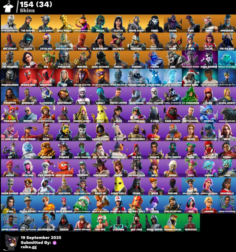 154 skins | Rogue Spider Knight | The Reaper | Elite Agent | Gold Midas | Fishstick (World Cup) | Reflex | Clutch | Rogue Agent | Grind | Raven | 380 VB