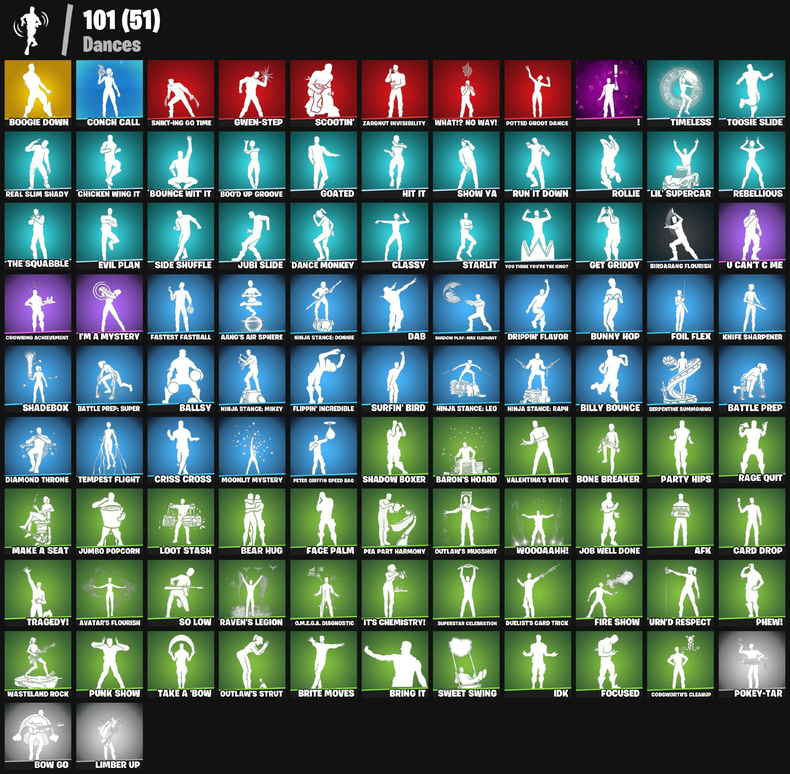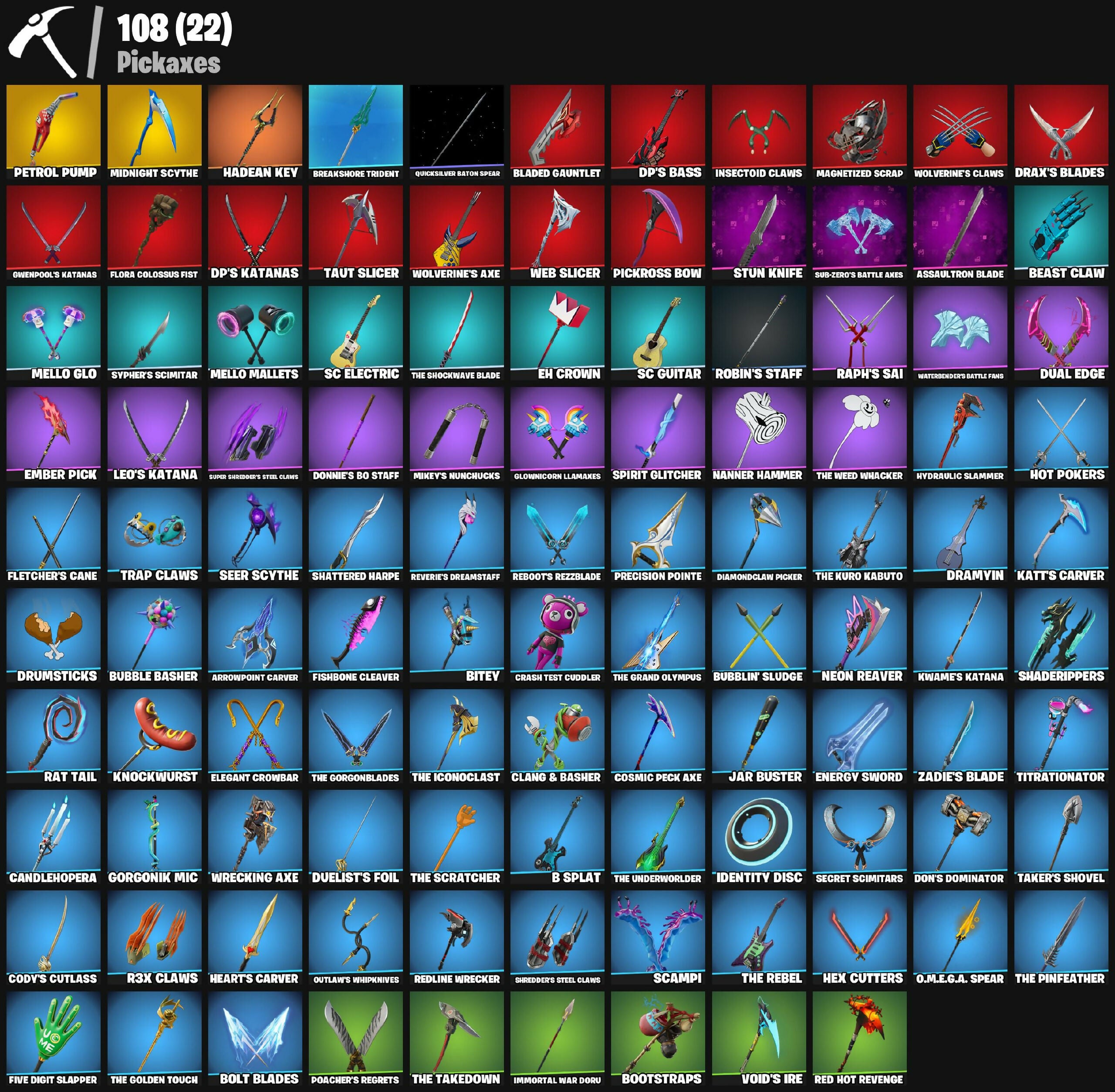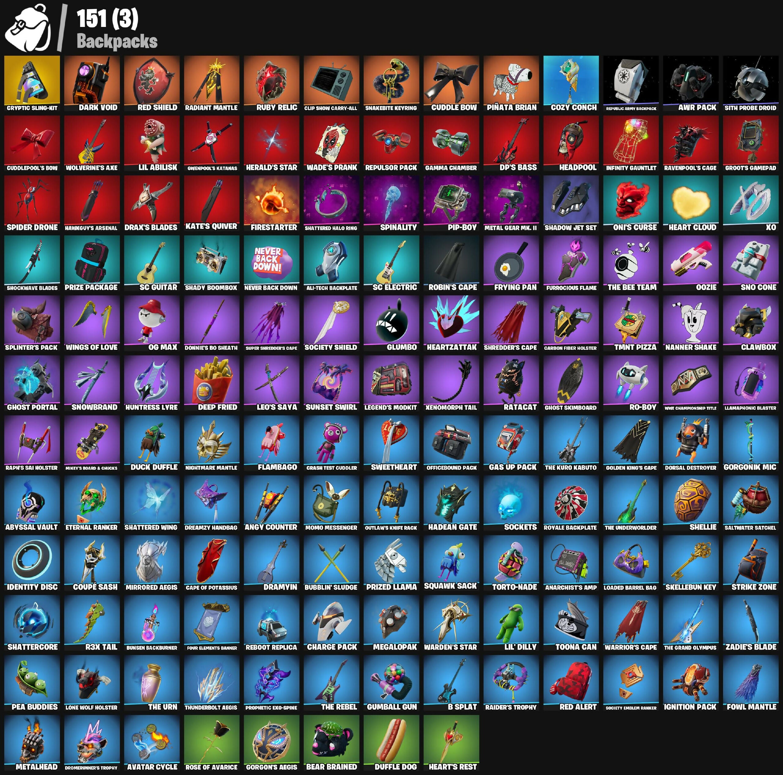 212th Battalion Trooper, 501st Trooper, AWR Pack, Aang, Aang's Air Sphere, Abyssal Vault, Afk, Ahsoka's Clone Trooper, Airphorian, Ali-A, Ali-Tech Backplate, Alias, Anarchist's Amp, Angy Counter, Aphrodite, Apprentice Evie, Ares, Arrowpoint Carver, Artemis, Ascendant Midas, Assaultron Blade, Augury, Avatar Cycle, Avatar's Flourish, Ayla Winn, B Splat, B.R.U.T.E. Navigator, Ballsy, Baron's Hoard, Battle Prep, Battle Prep: Super, Bear Brained, Bear Hug, Beast Claw, Beef Boss, Bernie, Big Dill, Billy Bounce, Birdarang Flourish, Bitey, Bladed Gauntlet, Blaze, Bolt Blades, Bone Breaker, Boo'd Up Groove, Boogie Down, Bootstraps, Bounce Wit It, Bow Go, Breakshore Trident, Bring It, Brite Moves, Brite Raider, Bubble Basher, Bubblin' Sludge, Budge, Bunny Hop, Bunsen Backburner, Camille, Candlehopera, Cape of Potassius, Captain Phasma, Carbon Fiber Holster, Card Drop, Carmine Rosso, Cassidy Quinn, Cerberus, Champion Stash'd, Charge Pack, Chicken Wing It, Clang & Basher, Clara, Classy, Clawbox, Clint Barton, Clip Show Carry-All, Clone Trooper, Codsworth's Cleanup, Cody Rhodes, Cody's Cutlass, Commando, Conch Call, Contract Giller, Coruscant Guard, Cosmic Peck Axe, Coupé Sash, Cozy Conch, Crash Test Cuddler, Criss Cross, Crowning Achievement, Cryptic Sling-Kit, Cuddle Bow, Cuddle Team Leader, Cuddlepool, Cuddlepool's Bow, Dab, Dance Monkey, Danica, Dark Vanguard, Dark Void, Darth Maul, Deadpool (Pen & Ink), Deep Fried, Diamond Throne, Diamondclaw Picker, Die With A Smile Bruno, Don's Dominator, Donatello, Donnie's Bo Sheath, Donnie's Bo Staff, Dorsal Destroyer, Dp's Bass, Dp's Katanas, Dramyin, Drax, Drax's Blades, Dream, Dreamzy Handbag, Drippin' Flavor, Dromerunner's Trophy, Drumsticks, Dual Edge, Duck Duffle, Duelist's Card Trick, Duelist's Foil, Duffle Dog, Dutch, Eh Crown, Elegant Crowbar, Ember Pick, Energy Sword, Eternal Ranker, Evil Plan, Face Palm, Fastest Fastball, Fire Show, Firestarter, Fishbone Cleaver, Fishstick, Five Digit Slapper, Flambago, Fletcher Kane, Fletcher's Cane, Flippin' Incredible, Flora Colossus Fist, Focused, Foil Flex, Four Elements Banner, Fowl Mantle, Frying Pan, Furrocious Flame, Gamma Chamber, Gas Up Pack, Get Griddy, Ghost Portal, Ghost Skimboard, Ghoul Trooper, Glownicorn Llamaxes, Glumbo, Goated, Golden King's Cape, Gorgon's Aegis, Gorgonik Mic, Green Roots Billie, Grimey, Groot's Gamepad, Guild, Gumball Gun, Gwen-step, Gwenpool, Gwenpool's Katanas, Hadean Gate, Hadean Key, Hades, Hawkguy's Arsenal, Headpool, Heart Cloud, Heart's Carver, Heart's Rest, Heartbreaker, Heartzattack, Herald's Star, Hex Cutters, Hit It, Hope, Hot Pokers, Hulk, Huntress Lyre, Hydraulic Slammer, I'm A Mystery, Identity Disc, Idk, Ignition Pack, Immortal War Doru, Infinity Gauntlet, Insectoid Claws, Iron Man Zero, It's Chemistry!, Jar Buster, Jellie, Job Well Done, John Cena, Joss, Jubi Slide, Jumbo Popcorn, Kate Bishop, Kate's Quiver, Katt, Katt's Carver, Keisha Cross, Knife Sharpener, Knockwurst, Korra, Kwame, Kwame's Katana, Lana Llane, Legend's Modkit, Leo's Katana, Leo's Sava, Leonardo, Lil Abilisk, Lil Whip, Lil' Dilly, Lil' Supercar, Limber Up, Lina Scorch, Llamaphonic Blaster, Loaded Barrel Bag, Lone Wolf Holster, Loot Stash, Magnetized Scrap, Make A Seat, Mantis, Marshinobi, Marshmello, Mecha R3X, Mecha Team Shadow, Medusa, Megalo Don, Megalopak, Mello Glo, Mello Mallets, Metal Gear Mk. II, Metalhead, Michelangelo, Midnight Scythe, Midsummer Midas, Mikey's Board & Chucks, Mikey's Nunchucks, Mirrored Aegis, Momo Messenger, Montague, Moonlit Mystery, MrBeast6000, Mystery Zone, Nanner Hammer, Nanner Shake, Neon Reaver, Never Back Down, Nick Eh 30, Nightmare Mantle, Ninja Stance Mikey, Ninja Stance: Donnie, Ninja Stance: Leo, Ninja Stance: Raph, Nisha, Nyangelica, O.M.E.G.A. Diagnostic, O.M.E.G.A. Spear, O.M.E.G.A. Suit Alpha, OG Max, Officebound Pack, Oni's Curse, Oozie, Oro, Oscar, Outlaw Midas, Outlaw's Knife Rack, Outlaw's Mugshot, Outlaw's Strut, Outlaw's Whipknives, Party Hips, Pea Buddies, Pea Part Harmony, Peabody, Perseus, Peter Griffin, Peter Griffin Speed Bag, Petrol Pump, Phantom Meowscles, Phew!, Pickross Bow, Pip-Boy, Piñata Brian, Poacher's Regrets, Pokey-tar, Poseidon, Potassius Peels, Potted Groot Dance, Power Punk, Precision Pointe, Prize Package, Prized Llama, Prophetic Exo-Spine, Proxy, Punk Show, Quicksilver Baton Spear, R3X Tail, R3x Claws, Radiant Mantle, Rage Quit, Raider's Trophy, Raph's Sai, Raph's Sai Holster, Raphael, Rat Tail, Ratacat, Raven's Legion, Ravenpool, Ravenpool's Cage, Real Slim Shady, Rebel Oro, Rebellious, Reboot Man, Reboot Replica, Reboots Rezzblade, Red Alert, Red Hot Revenge, Red Knight, Red Shield, Redline Racer, Redline Wrecker, Republic Army Backpack, Repulsor Pack, Reverie, Reverie's Dreamstaff, Rift Warden Stellan, Ringmaster Scarr, Ro-Boy, Robin, Robin's Cape, Robin's Staff, Rollie, Rose of Avarice, Royale Backplate, Ruby, Ruby Relic, Run It Down, Russel, Rust, Sabrina Carpenter, Saltwater Satchel, Sc Electric, Sc Guitar, Scampi, Scootin', Secret Scimitars, Seer Scythe, Serpentine Summoning, Sgt. Drake, Shadebox, Shaderippers, Shadow Boxer, Shadow Enforcer, Shadow Jet Set, Shadow Play: Max Elephant, Shady Boombox, Shattercore, Shattered Halo Ring, Shattered Harpe, Shattered Wing, Shellie, Shockwave Blades, Show Ya, Shredder, Shredder's Cape, Shredder's Steel Claws, Side Shuffle, Silver Surfer, Sir Raven, Sith Probe Droid, Skeletara, Skellebun Key, Skull Trooper, Slim Shady, Slugger, Snakebite Keyring, Snikt-ing Go Time, Sno Cone, Snowbrand, Snowstrike, So Low, Society Emblem Ranker, Society Shield, Sockets, Solid Snake, Sonia, Spider Drone, Spider-Man Zero, Spinality, Spirit Glitcher, Spirit Hunter Saeko, Splinter, Splinter's Pack, Squawk Sack, Starlit, Stoneheart, Strike Zone, Stun Knife, Sub-Zero (MK3), Sub-Zero's Battle Axes, Subzero Cryptic, Summer Drift, Sunset Alto, Sunset Swirl, Super Shredder, Super Shredder's Cape, Super Shredder's Steel Claws, Superstar Celebration, Surfin' Bird, Svpherpk, Sweet Swing, Sweetheart, Sypher