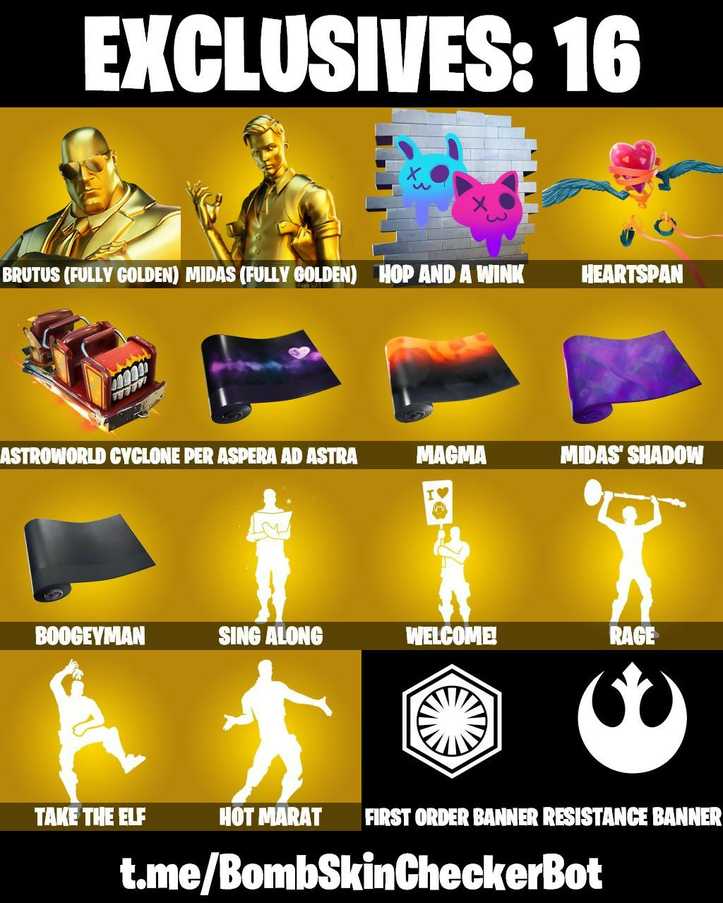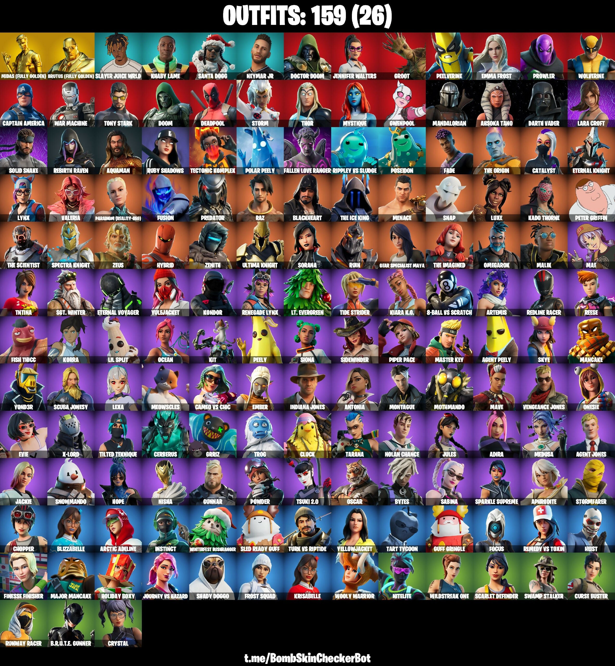 159 skins | Gold Midas | Gold Brutus | Curse Buster | Shady Doggo | Tart Tycoon | Spectra Knight | Zeus | Hybrid | Kado Thorne | Luxe | 50 VB