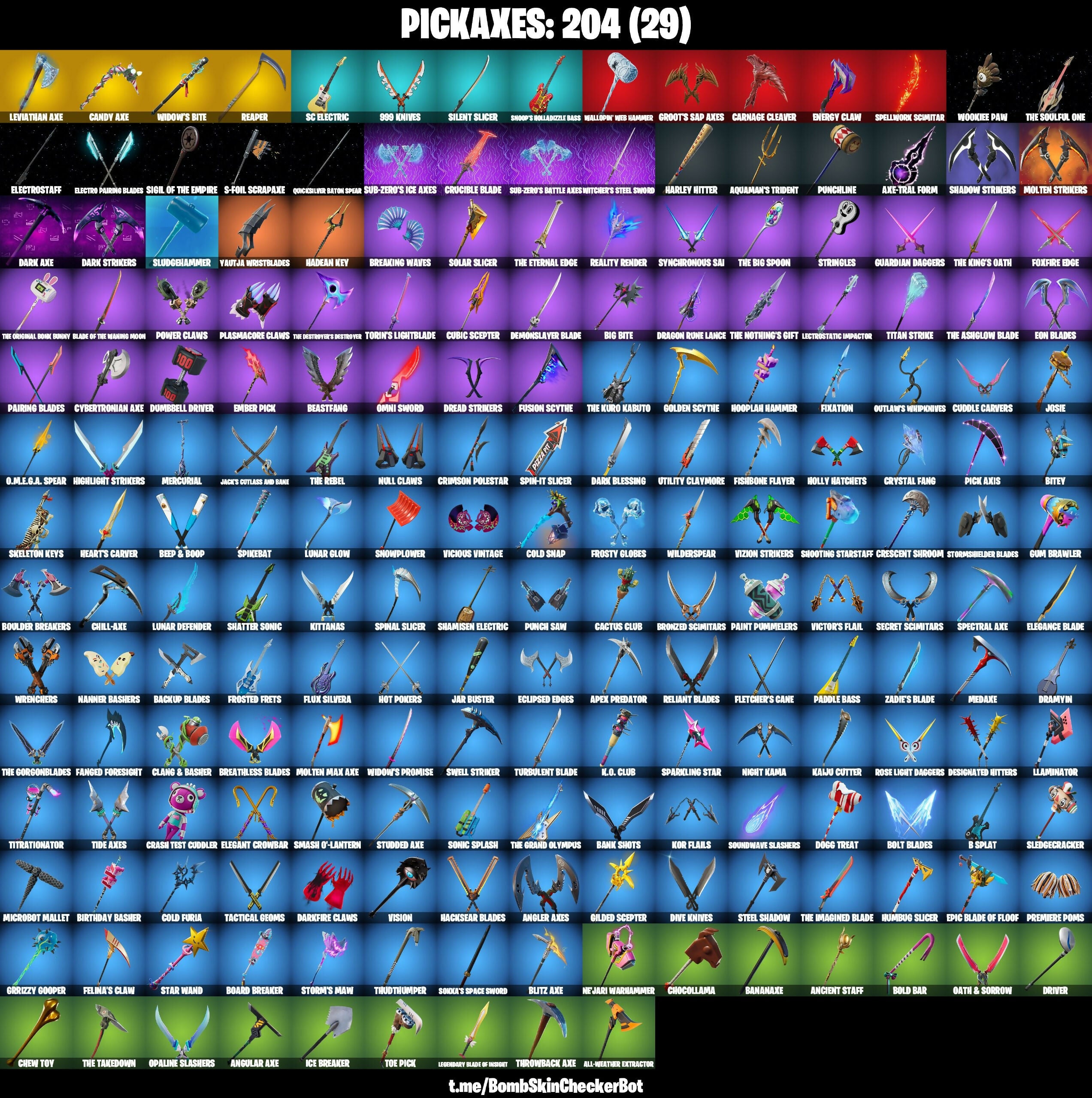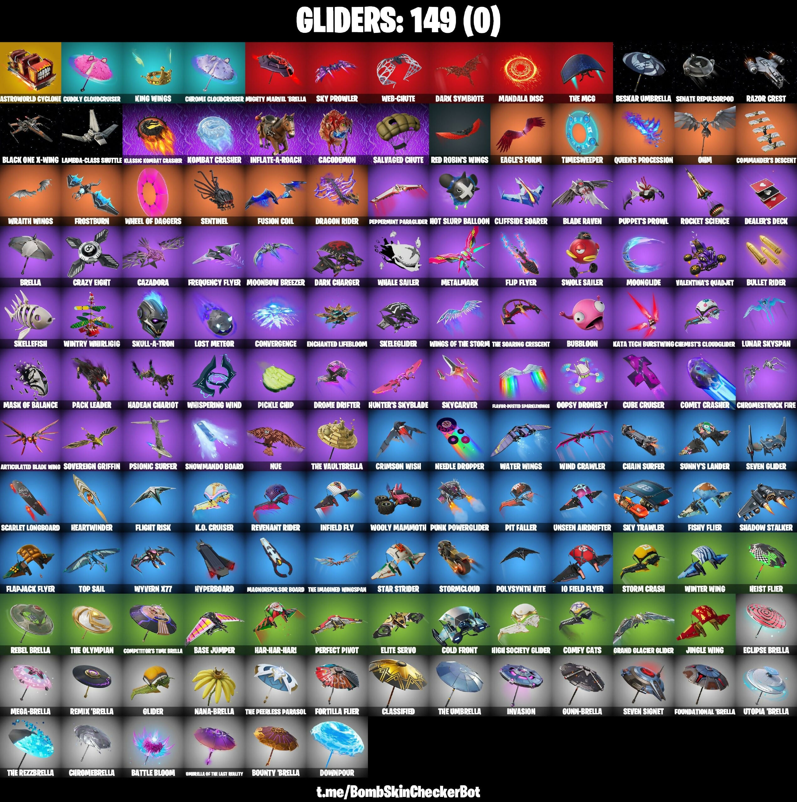 10 Field Flyer, 8-Ball Vs Scratch, 999 Knives, A Warrior Prepares, Adeline, Adira, Air Shredder, All-Weather Extractor, Ancient Staff, Angler Axes, Angular Axe, Antonia, Apex Predator, Aquaman's Trident, Arctic Adeline, Articulated Blade Wing, Ask Me, Astroworld Cyclone, Aura, Axe-Tral Form, B Splat, Backup Blades, Balance Board, Bananaxe, Bank Shots, Banner Trooper, Baron's Hoard, Base Jumper, Battle Bloom, Bear Hug, Beastfang, Beatzbunny, Beep & Boop, Beep Beep, Beskar Umbrella, Big Bite, Big Dill, Big Fan, Birthday Basher, Bitey, Black One X-Wing, Blade Raven, Blade of the Waning Moon, Blitz Axe, Blitz Knight, Blowin' Up, Board Breaker, Boba Snack, Boing!, Bold Bar, Bolt Blades, Boogie Down, Boomin', Boulder Breakers, Bounty Brella, Breaking Waves, Breathless Blades, Brella, Bring It Around, Bronzed Scimitars, Bubloon, Bullet Rider, Bushranger, Bytes, Cacodemon, Cactus Club, Call Me, Called Shot, Cameo Vs Chic, Candy Axe, Cap Kick, Carnage, Carnage Cleaver, Cassidy Quinn, Cazadora, Chain Surfer, Charlotte, Chef's Special, Chemist's Cloudglider, Chew Toy, Chill-Axe, Chocollama, Choice Knit, Chrome Cloudcruiser, Chrome Punk, Chromebrella, Chromestruck Fire, Clang & Basher, Clash, Classified, Clean Sweep, Cliffside Soarer, Codename E.L.F., Cold Front, Cold Furia, Cold Snap, Color Crush, Combat Tech Jules, Comet Crasher, Comfy Cats, Commander's Descent, Competitor's Time Brella, Conjure Weapon, Convergence, Count It!, Crack It, Crash Test Cuddler, Crazy Eight, Crescent Shroom, Crimson Polestar, Crimson Wish, Crowning Achievement, Crucible Blade, Crystal, Crystal Fang, Cube Cruiser, Cubic Scepter, Cuddle Carvers, Cuddly Cloudcruiser, Cybertronian Axe, Cyclo Curl, D'Ark, Dagger Dance, Dark Axe, Dark Blessing, Dark Charger, Dark Jonesy, Dark Power Chord, Dark Red Knight, Dark Strikers, Dark Symbiote, Dark Wild Card, Darkfire Claws, Darth Vader, Dealer's Deck, Decaying Dribbler, Demonslayer Blade, Desert Dawn Lyric, Designated Hitters, Dice Roll, Dill With It, Dive Knives, Doctor Strange, Dogg Treat, Don't Start Now, Doom Slayer, Downpour, Doze Dab, Dragon Rider, Dragon Rune Lance, Dramyin, Dread Fate, Dread Strikers, Dream, Driver, Drome Drifter, Droop, Duellist's Card Trick, Dumbbell Driver, Dummy Supreme, Dusty, EON Blades, Eagle's Form, Echo, Eclipse Brella, Eclipsed Edges, Electro Pairing Blades, Electro Swing, Electrostaff, Elegance Blade, Elegant Crowbar, Elite Servo, Ember Pick, Empress Fan Dance, Enchanted Lifebloom, Energy Claw, Epic Blade of Floof, Eren Jaeger, Erisa, Eternal Knight, Ether, Evie, Expressionism, Extraterrestrial, Fabio Sparklemane, Fade, Fanged Foresight, Felina's Claw, Finger Guns, Fish Thicc, Fishbone Flayer, Fishstick, Fishy Flier, Fist Bump, Fixation, Flaky Feast, Flapjack Flyer, Flavor-Dusted Sparklerings, Fletcher Kane, Fletcher's Cane, Flight Risk, Flip Flyer, Flippin' Away, Flux Silvera, Focus, Foil Flex, Fortilla Flier, Foundational Brella, Foxfire Edge, Frequency Flyer, Frost Squad, Frostbite, Frostburn, Frosted Frets, Frosty Globes, Frozen Fishstick, Frozen Nog Ops, Frozen Treat Cart, Fusion, Fusion Coil, Fusion Scythe, Geralt Of Rivia, Gilded Scepter, Glider, Golden Scythe, Good Game, Well Played, Good Guy, Grand Glacier Glider, Grizzy Gooper, Groot's Sap Axes, Grriz, Guardian Daggers, Guff, Gum Brawler, Gumbo, Gunn-Brella, Gunnar, Hacksear Blades, Hadean Chariot, Hadean Key, Hand-Forged, Har-Har-Hari, Harley Hitter, Harley Quinn, Harlowe, Haven, Headhunter Prime, Heart Sign, Heart's Carver, Heartwinder, Heist Flier, Helsie, High Five, High Society Glider, Highlight Strikers, Highwire, Holiday Boxy, Holly Hatchets, Hooplah Hammer, Hot Pokers, Hot Slurp Balloon, Hula Hoopin', Humbug Slicer, Hunter's Skyblade, Hype!, Hyperboard, Hypnot-Eyes, I Declare!, I Need You To Concentrate, Ice Breaker, Igni Sign, Imani, Imperial March, Infield Fly, Inflate-A-Roach, Invasion, It Is Finished, It's Chemistry!, It's... You?, J.B. Chimpanski, Jack's Cutlass and Bane, Jar Buster, Jet Signals, Jingle Wing, Josie, Joss, Journey Vs Hazard, Jubilation, Jules, K.O. Club, K.O. Cruiser, Kado Thorne, Kaiju Cutter, Kata Tech Burstwing, Kate Bishop, Keisha Cross, Keri Commander, Keyed Up, Khaby Lame, Kiara K.O., King Wings, Kit, Kittanas, Klassic Kombat Crasher, Kombat Crasher, Kondor, Kor, Kor Flails, Krisabelle, Lambda-Class Shuttle, Laser Focused, Laugh It Up, Legendary Blade of Insight, Lennox Rose, Leviathan Axe, Levitostatic Impactor, Lexa, Lil' Monster, Lil' Prancer, Lil' Rover, Lil' T-6 Shuttle, Llaminator, Lost Meteor, Love It!, Lt. John Llama, Lunar Charge, Lunar Defender, Lunar Glow, Lunar Party, Lunar Skyspan, Mae, Magnorepulsor Board, Make A Seat, Malik, Mancake, Mandala Disc, Mandalorian, Mashed Potato, Mask of Balance, Massai, Mave, Medaxe, Mega-Brella, Menace, Meow Skulls, Mercurial, Metalmark, Microbot Mallet, Midas' Shadow, Mighty Marvel 'Brella, Min-Joon, Mini Dogfight, Mini Slayer Fistbump, Mizuki, Modena Icon, Mogul Master (USA), Molten Max Axe, Molten Omen, Molten Strikers, Moonbow Breezer, Moonglide, Mwahaha, My Cabbages!, Mystica, Nailed It, Nana-Brella, Nanner Bashers, Ne'Jari Warhammer, Needle Dropper, Nezumi, Night Kama, Ninja Stance: Donnie, Ninja Stance: Leo, Ninja Stance: Mikey, Nolan Chance, Nue, Null Claws, O.M.E.G.A. Spear, OMG I Love It, Oath & Sorrow, Ocean, Ohm, Omni Sword, Oopsy Drones-Y, Opaline Slashers, Origami Battalion, Outlaw Midas, Outlaw's Mugshot, Outlaw's Strut, Outlaw's Whipknives, Pack Leader, Paddle Bass, Paint Pummellers, Pairing Blades, Par Patroller, Paradigm (Reality-659), Peppermint Paraglider, Perfect Pivot, Pick Axis, Pickle Chip, Piper Pace, Pit Faller, Pitcycle, Planetary Vibe, Plasmacore Claws, Point & Shoot, Polar Peely, Polarity, Polysynth Kite, Power Claws, Predator, Premiere Poms, Prowler, Psionic Surfer, Punch Saw, Punchline, Punk Powerglider, Puppet's Prowl, Queen's Procession, Quicksilver Baton Spear, Rage, Raise The Roof, Raven, Raven's Legion, Razor Crest, Ready When You Are, Reality Render, Reaper, Rebel Brella, 