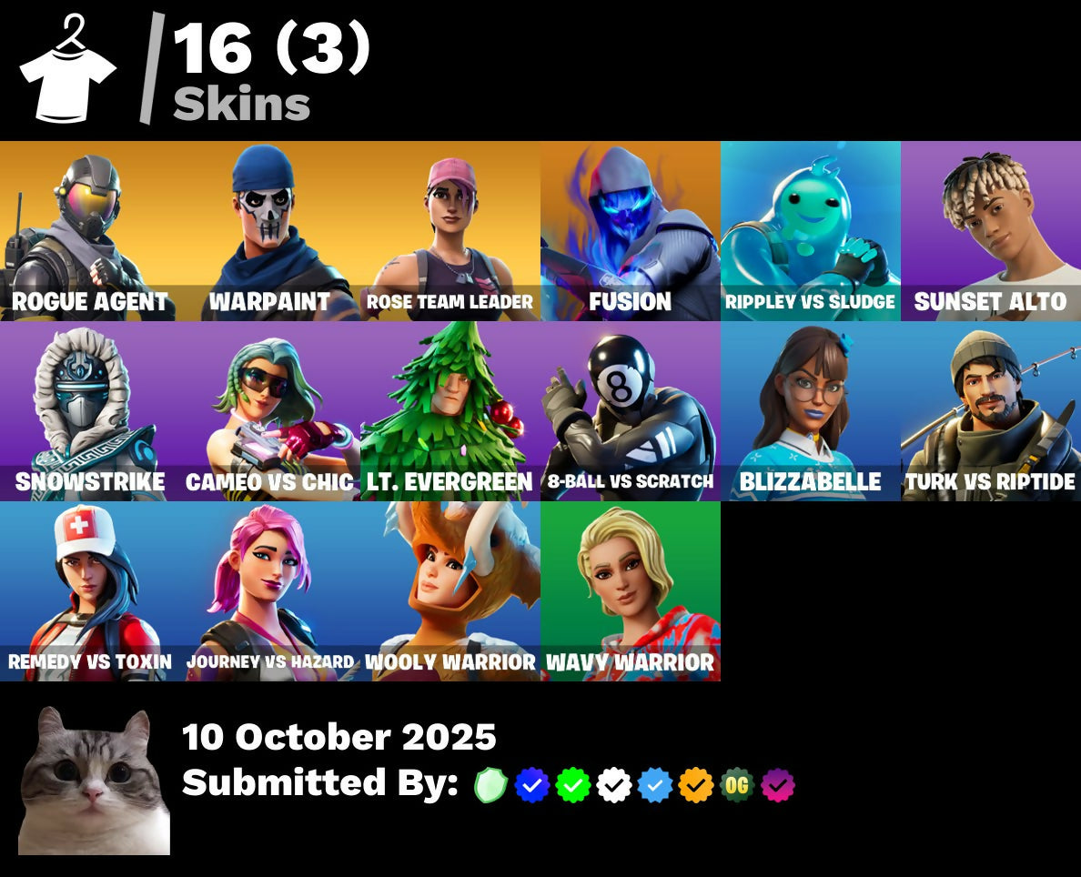 16 Skins ⭐️ OG STW - Sunset Alto - Wavy Warrior - Rogue Agent - Fusion - Rippley vs Sludge - Snowstrike - Cameo vs Chic - Lt. Evergreen - 8-Ball vs Scratch