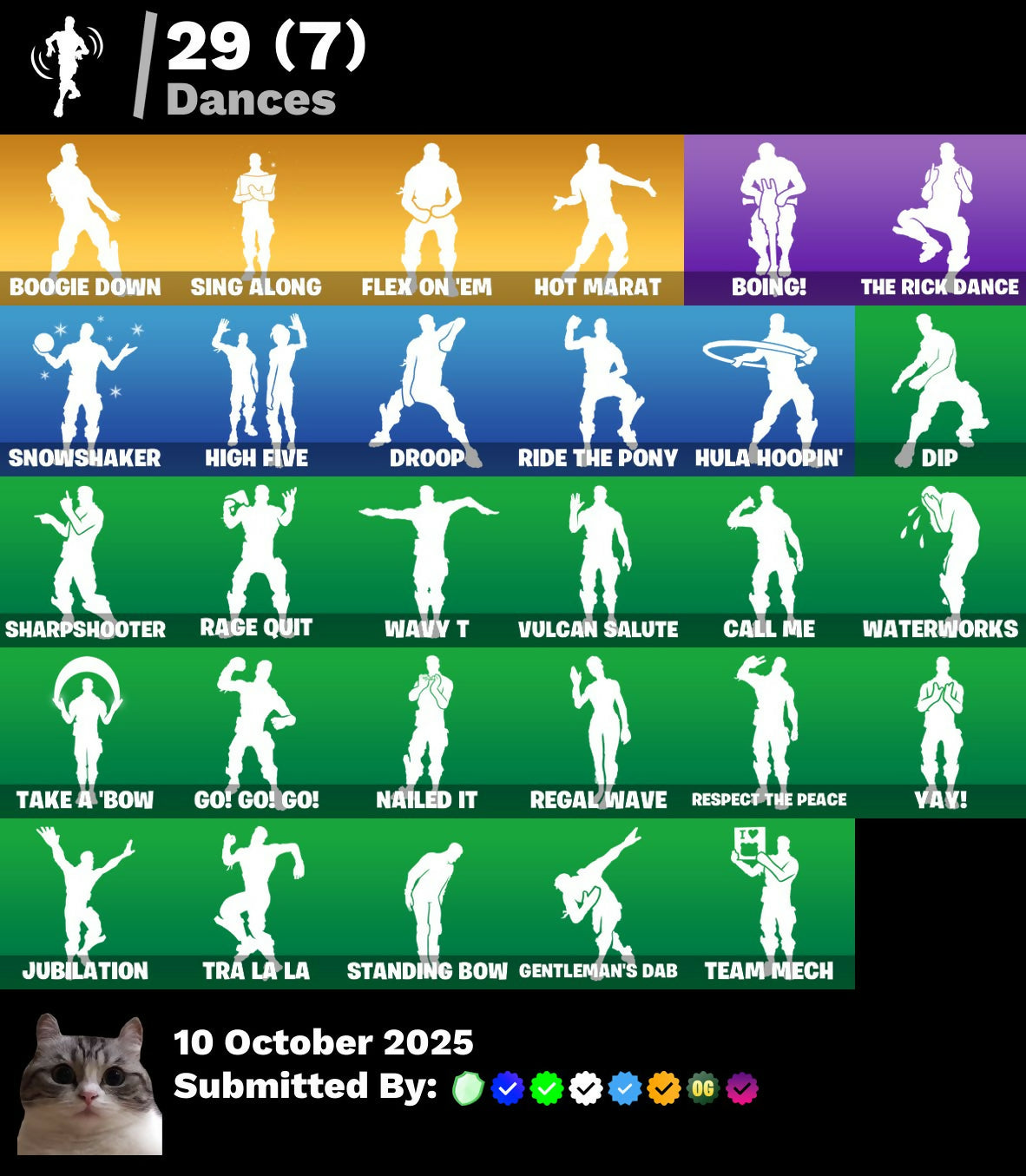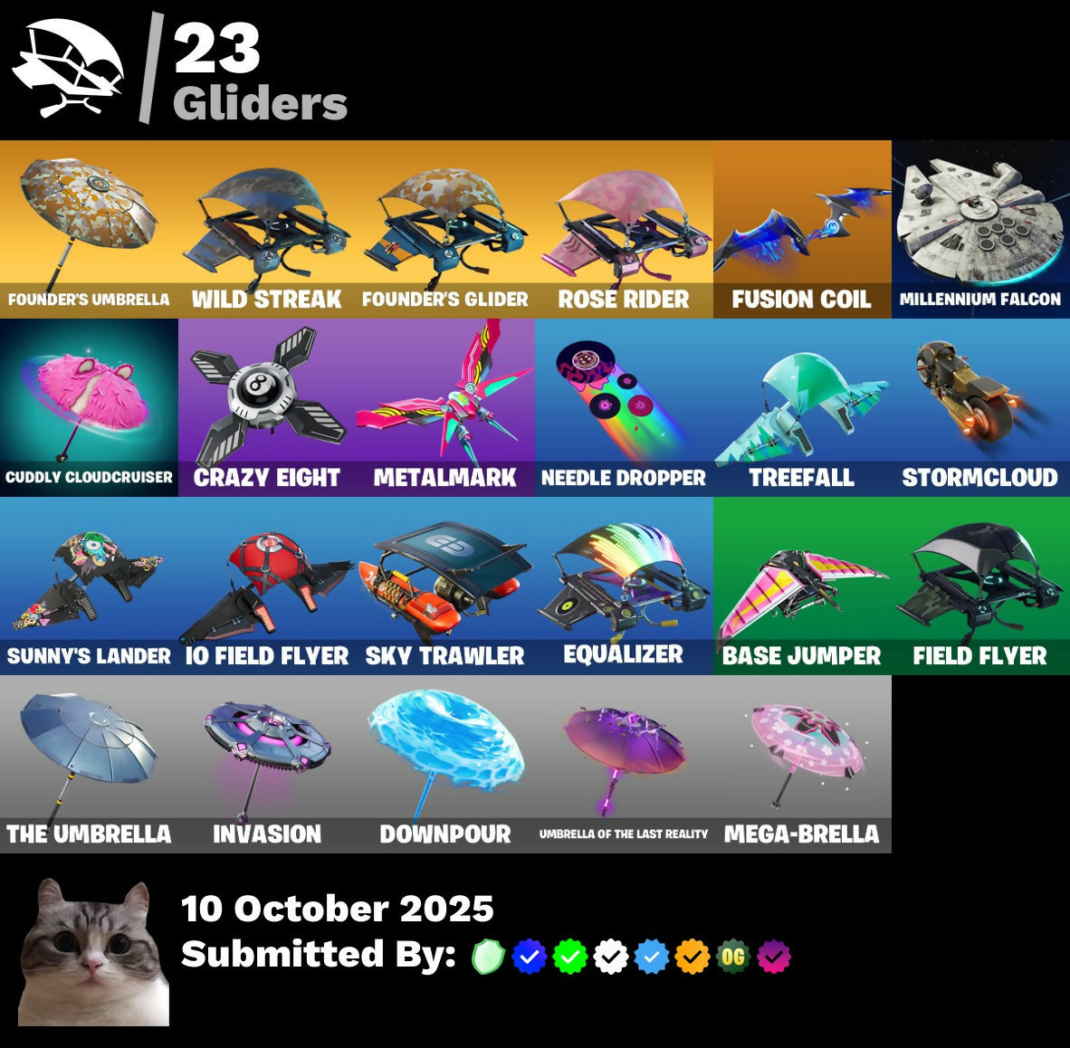 8-Ball Vs Scratch, Angler Axes, Bank Shots, Base Jumper, Basic Basher, Batman, Battle Ball, Blade of the Waning Moon, Blizzabelle, Boing!, Boogie Down, Boulder Breakers, Call Me, Cameo Vs Chic, Chapter 3 Island Theme, Chapter 4 Island Theme, Chapter 5 Island Theme, Clawz Retro, Constructor, Crazy Eight, Crescent Shroom, Cuddly Cloudcruiser, Dip, Downpour, Droop, Equalizer, Everybody Dance!, Far Out Vibes, Field Flyer, Flex On 'Em, Founder's Glider, Founder's Umbrella, Fryangles, Fusion, Fusion Coil, Fusion Scythe, Gentleman's Dab, Go! Go! Go!, High Five, Highlight Strikers, Holly Hatchets, Hot Marat, Hula Hoopin', IO Field Flyer, Invasion, Inverted Blade, Journey Vs Hazard, Jubilation, Kittanas, Lego Fortnite Theme, Lobby Classic, Lt. Evergreen, Mean Streak, Mecha Team Banner, Medaxe, Mega-Brella, Metalmark, Millennium Falcon, Monster Team Banner, Nailed It, Needle Dropper, Octane Whomper, Ol' Woody, Outlander, Peppermint Pick, Pursuit, RL GG, Rage Quit, Regal Wave, Remedy Vs Toxin, Resistance Banner, Respect The Peace, Ride The Pony, Rippley Vs Sludge, Rogue Agent, Rose Glow, Rose Rider, Rose Team Leader, Sharpshooter, Shortbread Slicers, Sing Along, Skirmish, Skull, Sky Trawler, Sludgehammer, Snowbrand, Snowshaker, Snowstrike, Solar Slicer, Soldier, Standing Bow, Steel Wool, Stormcloud, Sunny's Lander, Sunset Alto, Take A 'Bow, Team Mech, The Ashglow Blade, The Destroyer's Destroyer, The Rick Dance, The Umbrella, Tra La La, Treefall, Turbo Ball!, Turk Vs Riptide, Umbrella Of The Last Reality, Vulcan Salute, Warpaint, Waterworks, Wavy T, Wavy Warrior, Wild Streak, Wooly Warrior, Yay!, Zooming
