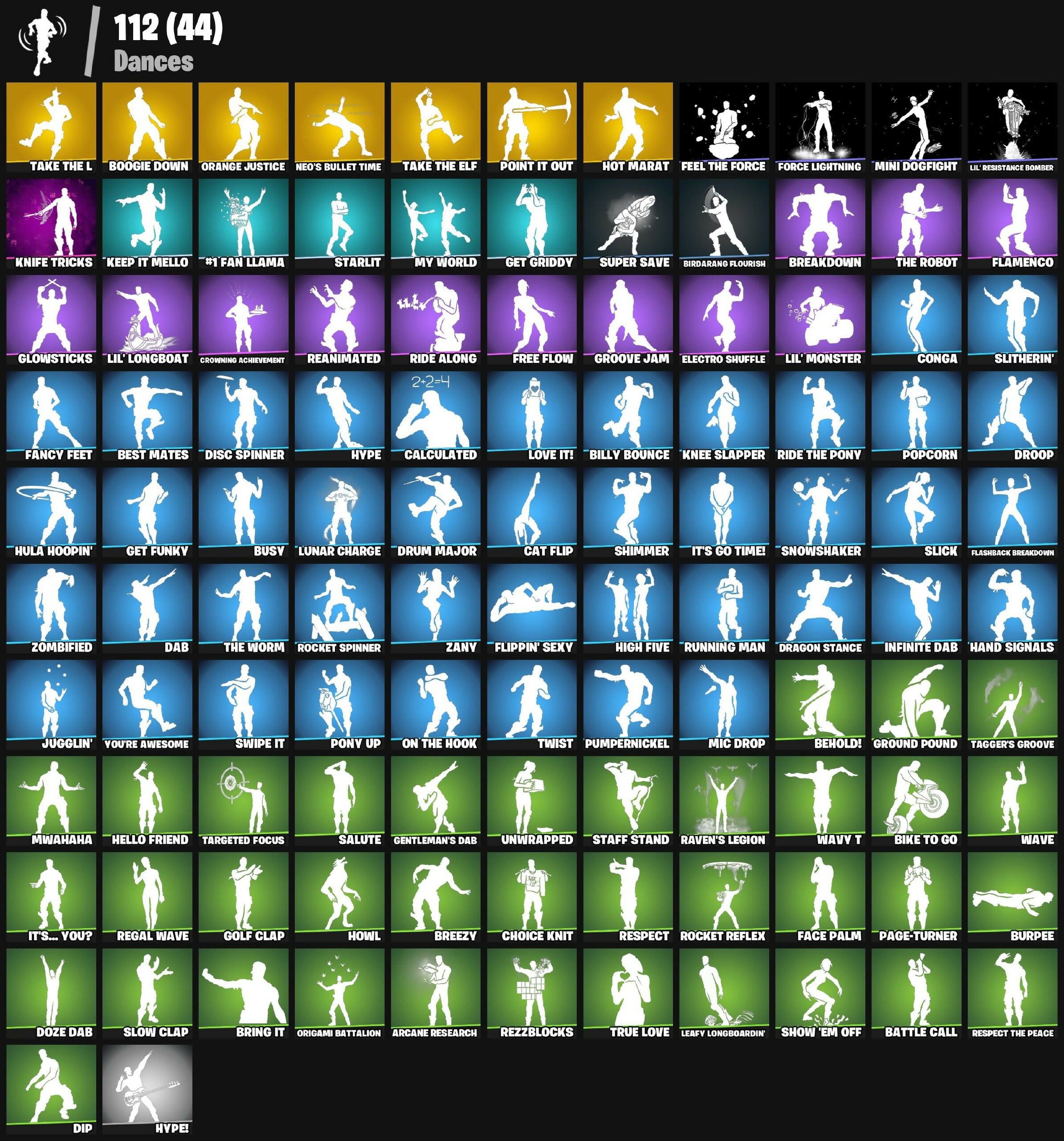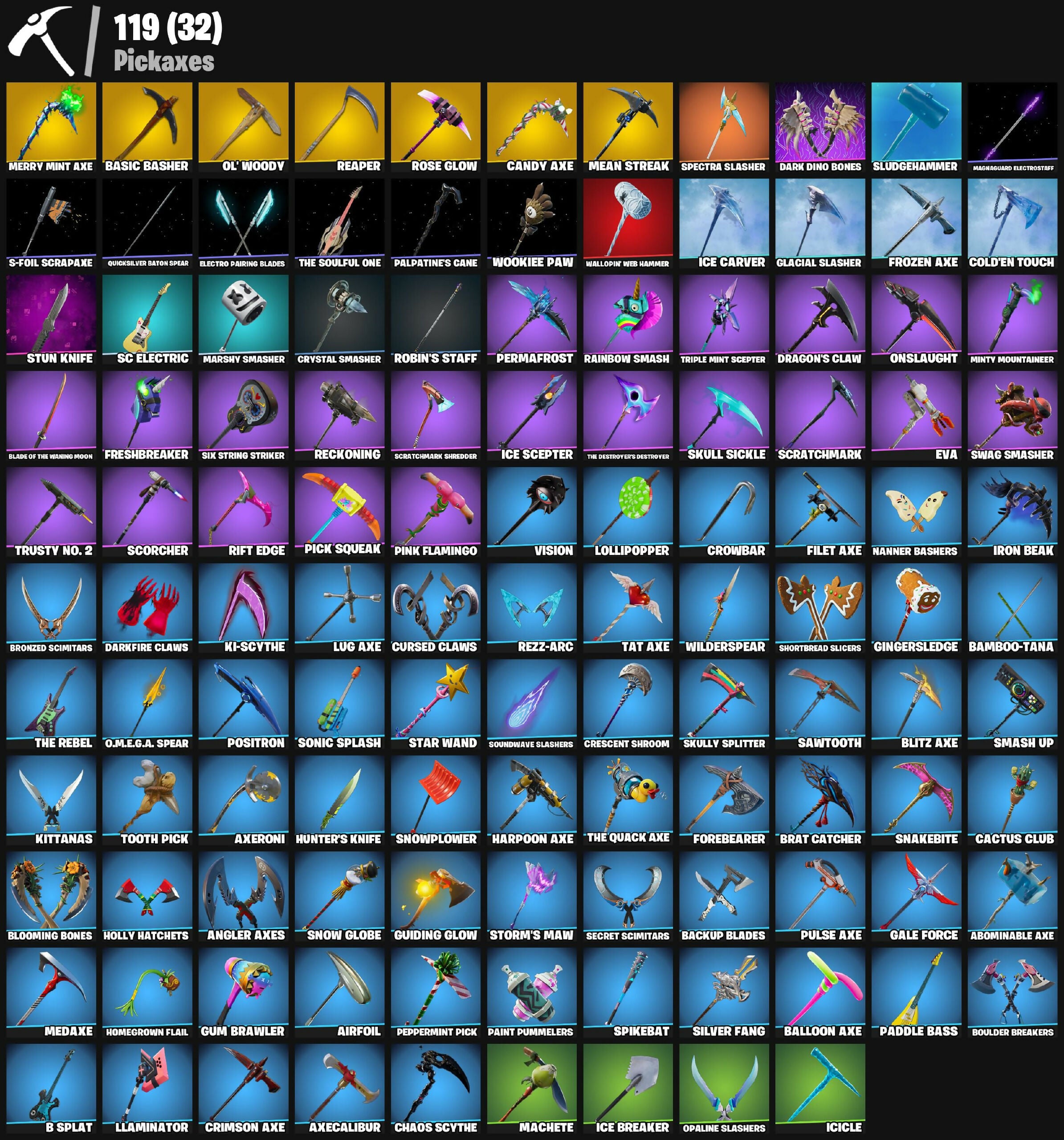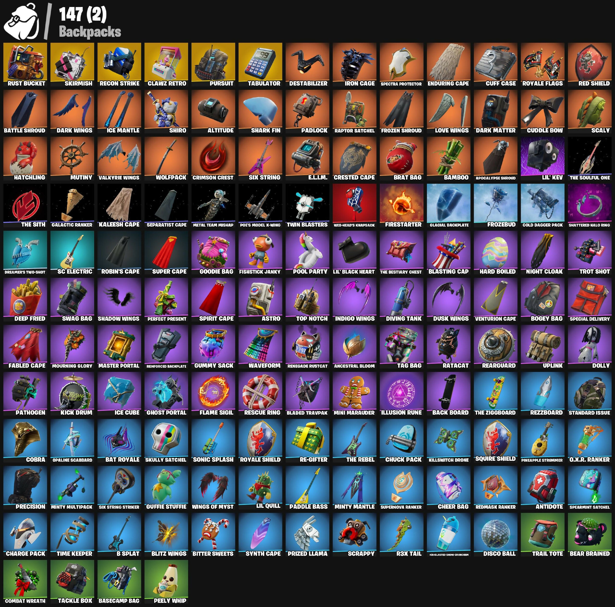 #1 Fan Llama, A.I.M., Abominable Axe, Abstrakt, Airfoil, Altitude, Ancestral Bloom, Angler Axes, Antidote, Apocalypse Shroud, Apprentice Evie, Arcane Research, Arctic Assassin, Assault Trooper, Astro, Axecalibur, Axeroni, B Splat, Back Board, Backup Blades, Balloon Axe, Bamboo, Bamboo-Tana, Bandolette, Basecamp Bag, Basic Basher, Bat Royale, Battle Call, Battle Hound, Battle Shroud, Battlehawk, Bear Brained, Beef Boss, Behold!, Best Mates, Bike To Go, Billy Bounce, Birdarang Flourish, Bitter Sweets, Blackheart, Blacklight, Blade of the Waning Moon, Bladed Travpak, Blasting Cap, Blaze, Blitz Axe, Blitz Wings, Blooming Bones, Blue Squire, Bogey Bag, Boogie Down, Boulder Breakers, Bracer, Brainiac, Brat Bag, Brat Catcher, Breakdown, Breezy, Bring It, Brite Bomber, Bronzed Scimitars, Bullseye, Bunnymoon, Burpee, Busy, Cactus Club, Calamity, Calculated, Candy Axe, Carbide, Cat Flip, Catrina, Chaos Scythe, Charge Pack, Cheer Bag, Choice Knit, Chomp Sr., Chuck Pack, Clawz Retro, Cloaked Shadow, Cobalt, Cobra, Cold Dagger Pack, Cold'en Touch, Color Crush, Combat Wreath, Commando, Conga, Crescent Shroom, Crested Cape, Crimson Axe, Crimson Crest, Crowbar, Crowning Achievement, Crystal Smasher, Cuddle Bow, Cuddle Team Leader, Cuff Case, Cursed Claws, DJ Vonder, Dab, Dante, Dark Dino Bones, Dark Matter, Dark Voyager, Dark Wings, Darkfire Claws, Deep Fried, Delirium, Destabilizer, Dip, Dire, Disc Spinner, Disco Ball, Disco Diva, Diving Tank, Dolly, Dominion, Doze Dab, Dragon Stance, Dragon's Claw, Dreamer's Two-Shot, Drift, Droop, Drum Major, Dusk, Dusk Knight, Dusk Wings, Dynamo, E.L.I.M., Electro Pairing Blades, Electro Shuffle, Elite Agent, Emperor Palpatine, Enduring Cape, Eva, Fable, Fabled Cape, Face Palm, Fancy Feet, Feel The Force, Filet Axe, Firestarter, Fireworks Team Leader, Fishstick Janky, Flame Sigil, Flamenco, Flashback Breakdown, Flippin' Sexy, Focus, Force Lightning, Forebearer, Free Flow, Fresh Aura, Freshbreaker, Frozebud, Frozen Axe, Frozen Shroud, Galactic Ranker, Gale Force, General Grievous, Gentleman's Dab, Get Funky, Get Griddy, Ghost Portal, Ghoul Trooper, Giddy-Up, Gingerbread Raider, Gingersledge, Glacial Backplate, Glacial Slasher, Glowsticks, Golf Clap, Goodie Bag, Groove Jam, Ground Pound, Guffie Stuffie, Guiding Glow, Guild, Gum Brawler, Gumbo, Gummy Sack, Hand Signals, Hard Boiled, Harlowe, Harpoon Axe, Hatchling, Haven, Haylee Skye, Hello Friend, High Five, Hime, Holly Hatchets, Homegrown Flail, Hope, Hot Marat, Howl, Hula Hoopin', Hunter's Knife, Huntress, Hybrid, Hype, Hype!, Ice Breaker, Ice Carver, Ice Crystal, Ice Cube, Ice Mantle, Ice Scepter, Ice-Blasted Snow Cruncher, Icebound Midas, Icicle, Illusion Rune, Indigo Wings, Infinite Dab, Iridia Vayne, Iron Beak, Iron Cage, It's Go Time!, It's... You?, Joltara, Journey Vs Hazard, Jugglin', Jumpshot, Jungle Scout, Kaleesh Cape, Kaws Skeleton, Keep It Mello, Ki-Scythe, Kick Drum, Killswitch, Killswitch Drone, Kittanas, Knee Slapper, Knife Tricks, Krampus, Krisabelle, Laguna, Leafy Longboardin', Lightrider, Lil Quill, Lil Split, Lil' Black Heart, Lil' Kev, Lil' Longboat, Lil' Monster, Lil' Resistance Bomber, Llaminator, Lollipopper, Love It!, Love Ranger, Love Wings, Lt. Evergreen, Lt. John Llama, Lug Axe, Lunar Charge, Lynx, Machete, Magnaguard Electrostaff, Magnus, Marshy Smasher, Master Portal, Mean Streak, Medaxe, Merry Marauder, Merry Mint Axe, Metal Team Mishap, Mic Drop, Mini Dogfight, Mini Marauder, Minty Bomber, Minty Mantle, Minty Mountaineer, Minty Multipack, Mission Specialist, Moonwalker, Morgan Myst, Mourning Glory, Mutiny, Mwahaha, My World, Nanner Bashers, Neo's Bullet Time, Night Cloak, Nightshade, Nog Ops, O.M.E.G.A. Spear, O.X.R. Ranker, Oblivion, Ol' Woody, Omega, Omegarok, Omen, On The Hook, Onesie, Onslaught, Opaline Scabbard, Opaline Slashers, Orange Justice, Origami Battalion, Paddle Bass, Padlock, Page-Turner, Paint Pummelers, Palpatine's Cane, Panda Team Leader, Pathogen, Peely Whip, Peppermint Pick, Perfect Present, Permafrost, Permafrost Raider, Pick Squeak, Pineapple Strummer, Pink Flamingo, Poe Dameron, Poe's Model X-Wing, Point It Out, Point Patroller, Poised Playmaker, Polar Peely, Pony Up, Pool Party, Popcorn, Positron, Powder, Power Chord, Precision, Prized Llama, Prodigy, Pulse Axe, Pumpernickel, Pursuit, Quicksilver Baton Spear, R3X Tail, Rabbit Raider, Ragnarok, Rainbow Smash, Raptor, Raptor Satchel, Ratacat, Ravage, Raven, Raven's Legion, Re-Gifter, Reanimated, Reaper, Rearguard, Reckoning, Recon Strike, Red Knight, Red Shield, Redline, Redmask Ranker, Regal Wave, Reinforced Backplate, Remedy Vs Toxin, Renegade Lynx, Renegade Rustcat, Rescue Ring, Respect, Respect The Peace, Rex, Rezz-Arc, Rezzblocks, Rezzboard, Ride Along, Ride The Pony, Rift Edge, Rippley Vs Sludge, Robin, Robin's Cape, Robin's Staff, Rocket Reflex, Rocket Spinner, Ronin, Rook, Rose Glow, Rose Team Leader, Royale Flags, Royale Knight, Royale Shield, Running Man, Rust Bucket, Rust Lord, S-Foil Scrapaxe, SC Electric, Salute, Sawtooth, Scaly, Scarlet Defender, Scorcher, Scrappy, Scratchmark, Scratchmark Shredder, Secret Scimitars, Separatist Cape, Sgt. Winter, Shadow Wings, Shanta, Shark Fin, Shattered Halo Ring, Shimmer, Shiro, Shortbread Slicers, Show 'Em Off, Sidewinder, Silver Fang, Six String, Six String Striker, Skellemint Oro, Skirmish, Skull Ranger, Skull Sickle, Skull Trooper, Skully, Skully Satchel, Skully Splitter, Sledgehammer, Slick, Slitherin', Slow Clap, Sludgehammer, Smash Up, Snakebite, Snow Globe, Snowplower, Snowshaker, Sonic Splash, Soundwave Slashers, Sparkplug, Spearmint Satchel, Special Delivery, Spectra Knight, Spectra Protector, Spectra Slasher, Spider-Man, Spikebat, Spirit Cape, Squad Leader, Squire Shield, Staff Stand, Stage Slayer, Standard Issue, Star Wand, Starlit, Storm's Maw, Stun Knife, Summit Striker, Sun Strider, Sun Tan Specialist, Super Cape, Super Save, Superman, Supernova Ranker, Swag Bag, Swag Smasher, Swipe It, Synth Cape, Synthwave, Tabulator, Tackle Box, Tag Bag, Tagger's