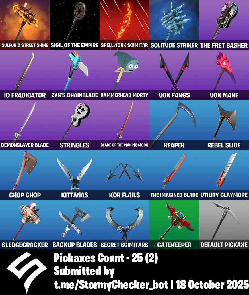 8-Ball Janky, Adira's Battle Flag, Ancestral Bloom, Arctic Adeline, Backup Blades, Battle Bloom, Big Mouth, Blade of the Waning Moon, Boogie Down, Butter Robot, Call Me, Charlotte, Chop Chop, Chop Dropper, Clawz Retro, Cliffside Soarer, Council Of Frogs, Crowning Achievement, Cyclo Curl, Dagger Dance, Dance Moves, Default Pickaxe, Demonslayer Blade, Dizzie, Doctor Slone, Dragon Radar, Elder Fox Crest, Extra Round, Fa-La-La-Llama, Fashion Accident Janky, Fishstick Janky, Flavor-Dusted Sparklwings, Galactic Pack, Gatekeeper, Glider, Glorious Giftblade, Godzilla's Exo-Spine, Guff Gringle, Guggimon, Gunn-Brella, Gwenpool's Katanas, Hammerhead Morty, Hand-Forged, Har-Har-Har!, Holiday Boxy, IO Field Flyer, IO Orchestrator, IO Stealth Sail, Imperial March, Inky, Invasion, Io Eradicator, It Is Finished, Joey, K.O. Cruiser, Kal-El's Cape, Kata-Pack, Kick Back, Kittanas, Kor, Kor Flails, Kor's Toolkit, Kymera, Kymera's Plasma Pak, Laguna, Lil' Black Heart, Lil' Prancer, Lil' Saucer, Love Lock, Lunar Hyperjet, Lunar Skyspan, Make A Seat, Mecha Morty, Meowscles Janky, Morty's Backpack, Nailed It, Nyanja's Catpak, Patch Pack, Pineapple Strummer, Pizza Party, Ready When You Are, Reaper, Rebel Brella, Rebel Slice, Redmask Ranker, Rick Sanchez, Rick's UFO Cruiser, Secret Scimitars, Sigil of the Empire, Ska-Stra-Terrestrial, Sled Ready Guff, Sledgecracker, Solitude Striker, Spellwork Scimitar, Storm Crash, Stringles, Sulfuric Street Shine, Sunny, Sunny's Lander, The Dip, The Fret Basher, The Imagined Blade, The Rezzbrella, The Rick Dance, The Umbrella, Toona Fish, Twin Crossfire, Umbrella of the Last Reality, Utility Claymore, Vox Fangs, Vox Hunter, Vox Mane, Vulcan Salute, Whale Sailer, Wintry Whirligig, Zyg, Zyg Ray, Zyg's Chainblade