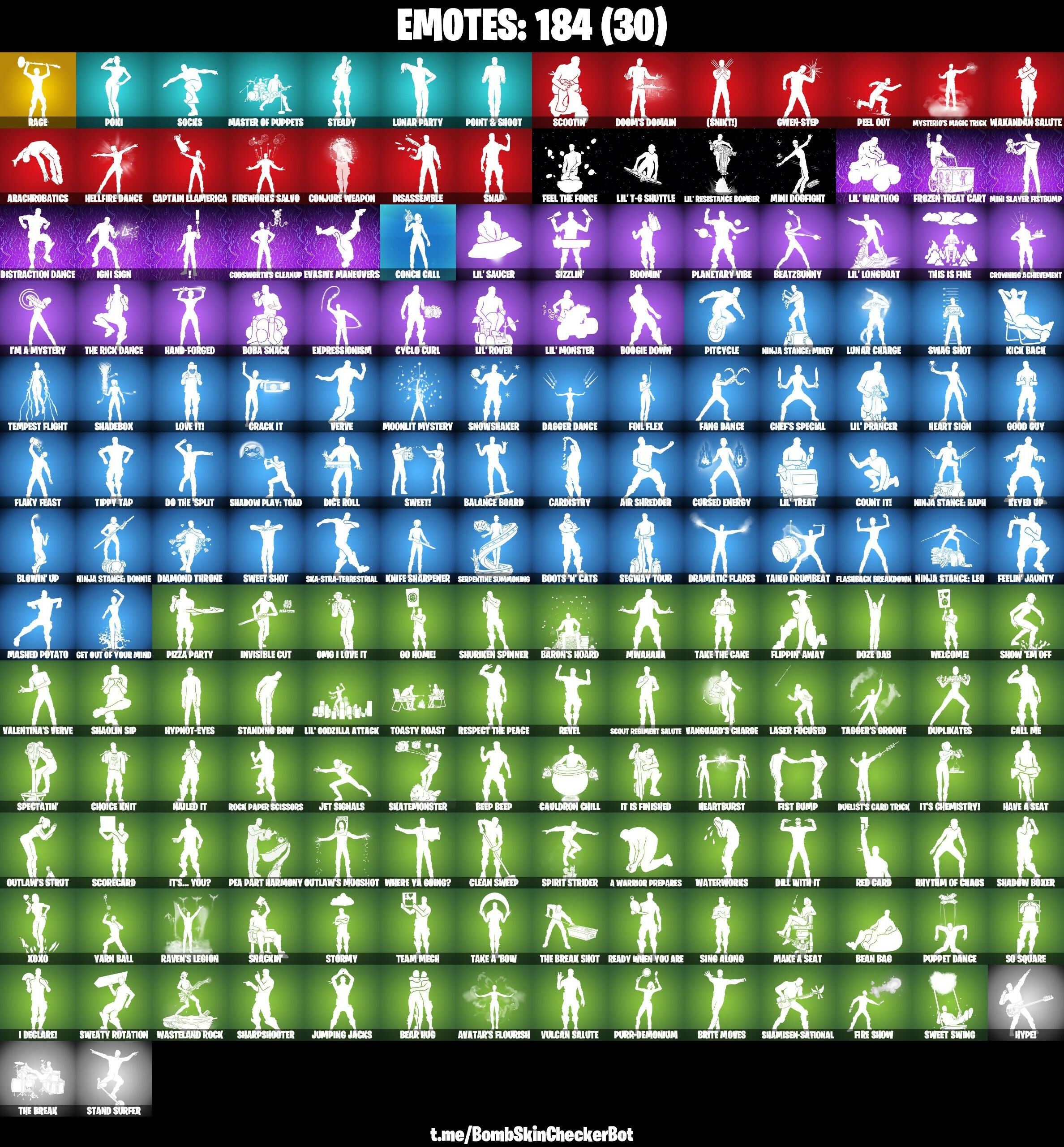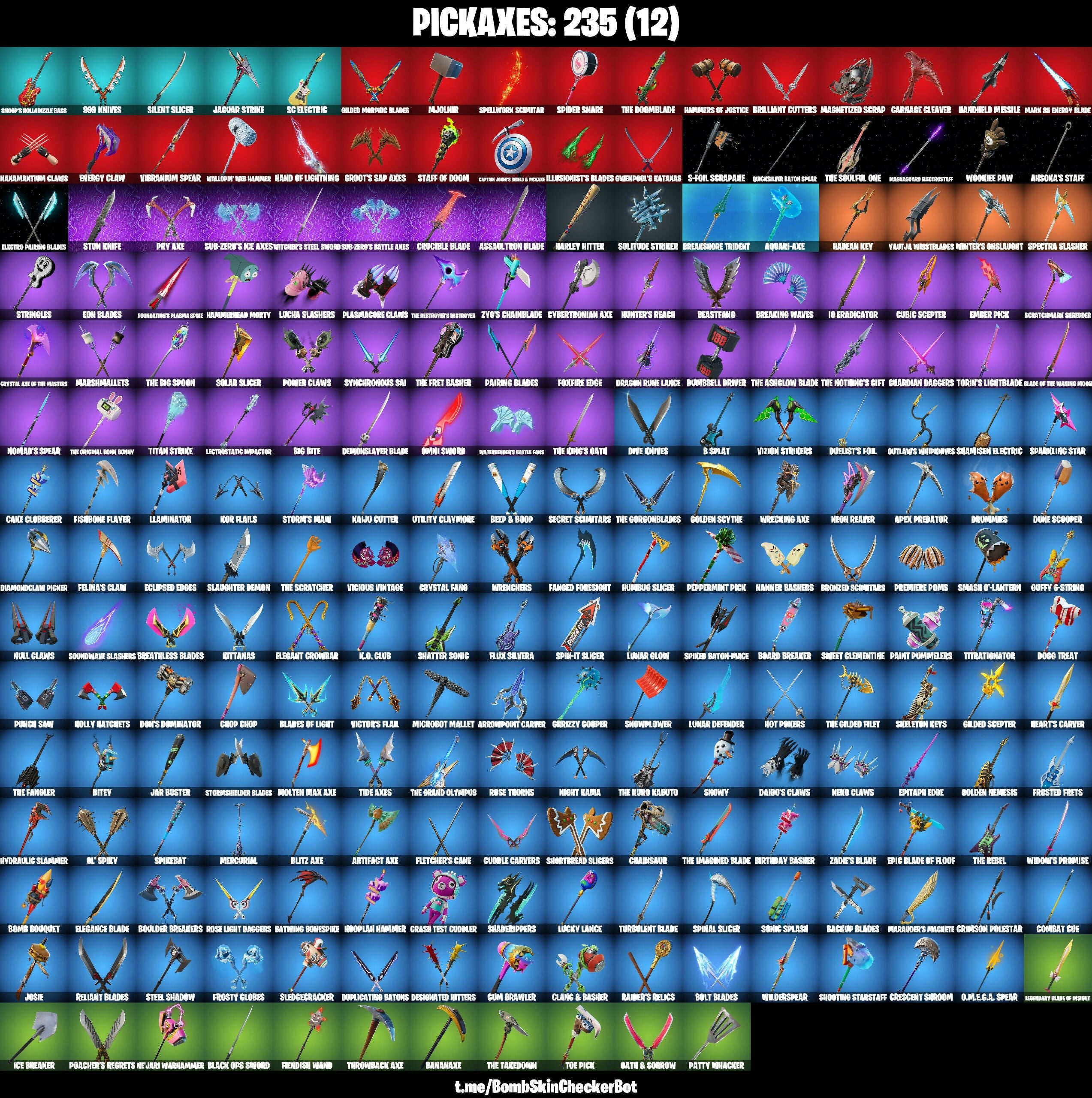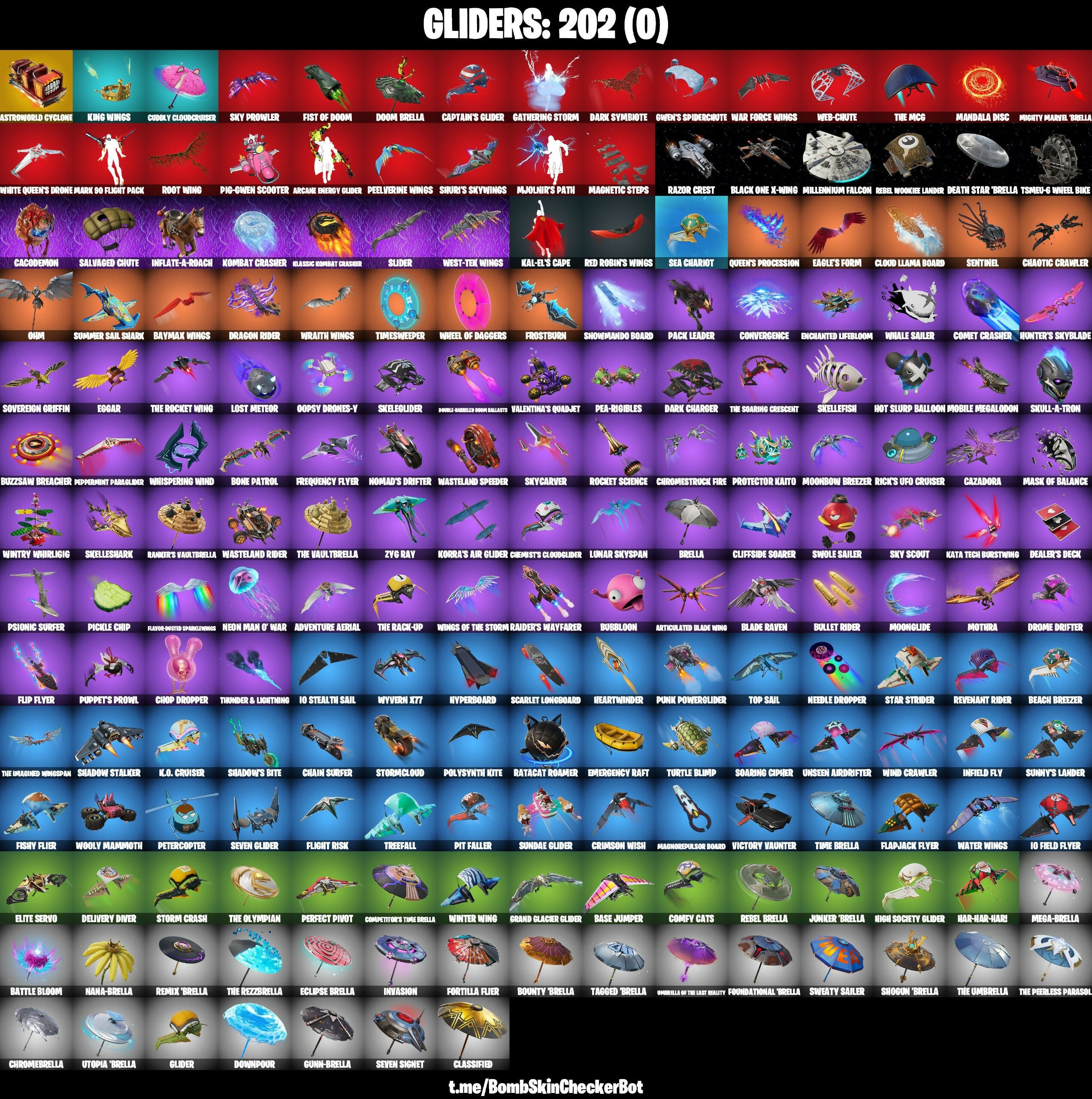 (Snikti), 1-Ball, 10 Field Flyer, 10 Stealth Sail, 999 Knives, A Warrior Prepares, Adira, Adventure Aerial, Agent Jones, Ahsoka Tano, Ahsoka's Staff, Air Shredder, Antonia, Apex Predator, Aphrodite, Apprentice Evie, Aquari-Axe, Arachrobatics, Arcane Energy Glider, Arctic Adeline, Arrowpoint Carver, Artemis, Articulated Blade Wing, Artifact Axe, Assaultron Blade, Astroworld Cyclone, Avatars Flourish, B Splay, Backup Blades, Balance Board, Bananaaxe, Baron's Hoard, Base Jumper, Battle Bloom, Batwing Bonespike, Baymax Wings, Beach Breezer, Beachshore Trident, Bean Bag, Bear Hug, Beastfang, Beatzbunny, Beep & Boop, Beep Beep, Big Bite, Big Dill, Birthday Basher, Bitey, Black One X-Wing, Black Ops Sword, Blade Of The Waning Moon, Blade Raven, Blades Of Light, Blitz Axe, Blitz Knight, Blowin' Up, Board Breaker, Boba Snack, Bolt Blades, Bomb Bouquet, Bone Patrol, Boogie Down, Boomin', Boots 'N' Cats, Boulder Breakers, Bounty 'Brella, Breaking Waves, Breathless Blades, Brella, Brilliant Cutters, Brite Moves, Brite Raider, Bronzed Scimitars, Bubloon, Bullet Rider, Buzzsaw Breacher, Bytes, Cacodemon, Cake Clobberer, Call Me, Captain America's Shield & Pegleg, Captain Flamerica, Captain Jones, Captain's Glider, Cardistry, Carnage, Carnage Cleaver, Cassidy Quinn, Cauldron Chill, Cazadora, Cerberus, Chain Surfer, Chainsaur, Chaos Director, Chaotic Crawler, Charlotte, Chef's Special, Chemist's Cloudglider, Choice Knit, Chop Chop, Chop Dropper, Chrome Punk, ChromeBrella, ChromeStruck Fire, Clang & Basher, Clark Kent, Classic Kombat Crasher, Classified, Clean Sweep, Cliffside Soarer, Cloud Llama Board, Cluck, Codsworth's Cleanup, Color Crush, Combat Cue, Comet Crasher, Comfy Cats, Competitor's Time Brella, Conch Call, Conjure Weapon, Convergence, Coruscant Guard, Count It!, Crack It, Crash Test Cuddler, Crescent Shroom, Crimson Polestar, Crimson Wish, Crowning Achievement, Crucible Blade, Crystal Axe Of the Masters, Crystal Fang, Cubic Scepter, Cuddle Carvers, Cuddly Cloudcruiser, Cursed Energy, Cybertronian Axe, Cyclo Curl, Dagger Dance, Daigo, Daigo’s Claws, Dark Charger, Dark Symbiote, Dealer's Deck, Death Star 'Brella, Delivery Diver, Demonslayer Blade, Designated Hitters, Diamond Throne, Diamondclaw Picker, Dice Roll, Dill With It, Disassemble, Distraction Dance, Dive Knives, Do The Split, Doctor Doom, Doctor Slone, Doctor Strange, Dogg Treat, Don's Dominator, Doom, Doom Brella, Doom Slayer, Doom's Domain, Double-Barreled Boom Ballista, Downpour, Doze Dab, Dragon Rider, Dragon Rune Lance, Dramatic Flares, Drome Drifter, Drummies, Duelist's Card Trick, Duelist's Foil, Dumbbell Driver, Dune Scooper, Duplicating Batons, Duplikates, Dusty, Dynamo Tntina, Eagle's Form, Eclipse Brella, Eclipsed Edges, Eggar, Electro Pairing Blades, Elegance Blade, Elegant Crowbar, Elite Servo, Ember Pick, Emergency Raft, Emma Frost, Enchanted Liefbloom, Energy Claw, Eon Blades, Epic Blade Of Floof, Epitaph Edge, Era, Eren Jaeger, Erisa, Eternal Knight, Evasive Maneuvers, Evie, Expressionism, Fabio Sparklemane, Fade, Fang Dance, Fanged Foresight, Feel The Force, Feelin' Jaunty, Felina, Felina's Claw, Fiendish Wand, Fire Show, Fireworks Salvo, Fish Thicc, Fishbone Flayer, Fishy Flier, Fist Bump, Fist of Doom, Flaky Feast, Flapjack Flyer, Flashback Breakdown, Flavor-Frosted Sparrowlings, Fletcher Kane, Fletcher's Cane, Flight Risk, Flip Flyer, Flippin' Away, Flux Silvera, Foil Flex, Fortilla Flier, Foundational 'Brella, Foundation’s Plasma Spike, Foxfire Edge, Frequency Flyer, Frostburn, Frosted Frets, Frosty Globes, Frozen Treat Cart, Gathering Storm, General Grievous, Geralt of Rivia, Get Out Of Your Mind, Gilded Morphic Blades, Gilded Scepter, Glider, Go Home!, Godzilla Evolved, Golden Nemesis, Golden Scythe, Good Guy, Grand Glacier Glider, Grizzly Gooper, Groot, Groot's Sap Axes, Grriz, Guardian Daggers, Guffy G-String, Guggimon, Gum Brawler, Gumbo, Gunn-Brella, Gunnar, Gwen's Spiderchute, Gwen-Step, Gwenpool, Gwenpool’s Katanas, Hadean Key, Hammerhead Morty, Hammers Of Justice, Hand Of Lightning, Hand-Forged, Handheld Missile, Har-Har-Hari, Harley Hitter, Harlowe, Have A Seat, Haven, Heart Sign, Heartburst, Heartwinder, Heart’s Carver, Hellfire Dance, Helsie, Hero Baymax, High Society Glider, Highwire, Holiday Boxy, Holly Hatchets, Hooplah Hammer, Hope, Hot Pokers, Hot Slurp Balloon, Humbug Slicer, Hunter's Skyblade, Hunter’s Reach, Hydraulic Slammer, Hyper, Hyperboard, Hypnot-Eyes, I Declare!, I'm A Mystery, Ice Breaker, Igni Sign, Illusionist's Blades, Imani, Indiana Jones, Infield Fly, Inflate-A-Roach, Invasion, Invisible Cut, Io EradicatOr, It Is Finished, It's Chemistry!, It's... You?, J.B. Chimpanski, Jade, Jaguar Strike, Jar Buster, Jellie, Jennifer Walters, Jet Signals, Joey, Josie, Joss, Jules, Jumping Jacks, Junker 'Brella, K.O. Club, K.O. Cruiser, Kado Thorne, Kaiju Cutter, Kal-El's Cape, Kata Tech Burstwing, Keisha Cross, Kendo, Keyed Up, Khaby Lame, Kiara K.O., Kick Back, King Wings, Kit, Kittanas, Knife Sharpener, Kombat Crasher, Kondor, Kor, Korra, Korra's Air Glider, Krisabelle, Kymera, Lara Croft, Laser Focused, Legendary Blade Of Insight, Legitristatic Impactor, Lennox Rose, Lexa, Lil Split, Lil' Godzilla Attack, Lil' Longboat, Lil' Monster, Lil' Prancer, Lil' Resistance Bomber, Lil' Rover, Lil' Saucer, Lil' T-6 Shuttle, Lil' Treat, Lil' Warthog, Llaminator, Lorenzo, Lost Meteor, Love It!, Lt. Evergreen, Lt. John Llama, Lucha Slashers, Lucky Lance, Lunar Charge, Lunar Defender, Lunar Glow, Lunar Party, Lunar Skyspan, Mae, Magmaquard Electrostaff, Magnetic Steps, Magnetized Scrap, Magnorepulse Board, Major Mancake, Make A Seat, Malik, Mancake, Mandala Disc, Mandalorian, Marauder’s Machete, Mariposa, Mark 85 Energy Blade, MarshmallEts, Mashed Potato, Mask of Balance, Massai, Master Of Puppets, Mave, Medusa, Mega-Brella, Megalo Don, Menace, Meow Skulls, Meowdas, Mercurial, Microbot Mallet, Mighty Marvel Brella, Millennium Falcon, Min Slayer Restump, Mini Dogfight, Mizuki, Mjolnir, Mjolnir's P