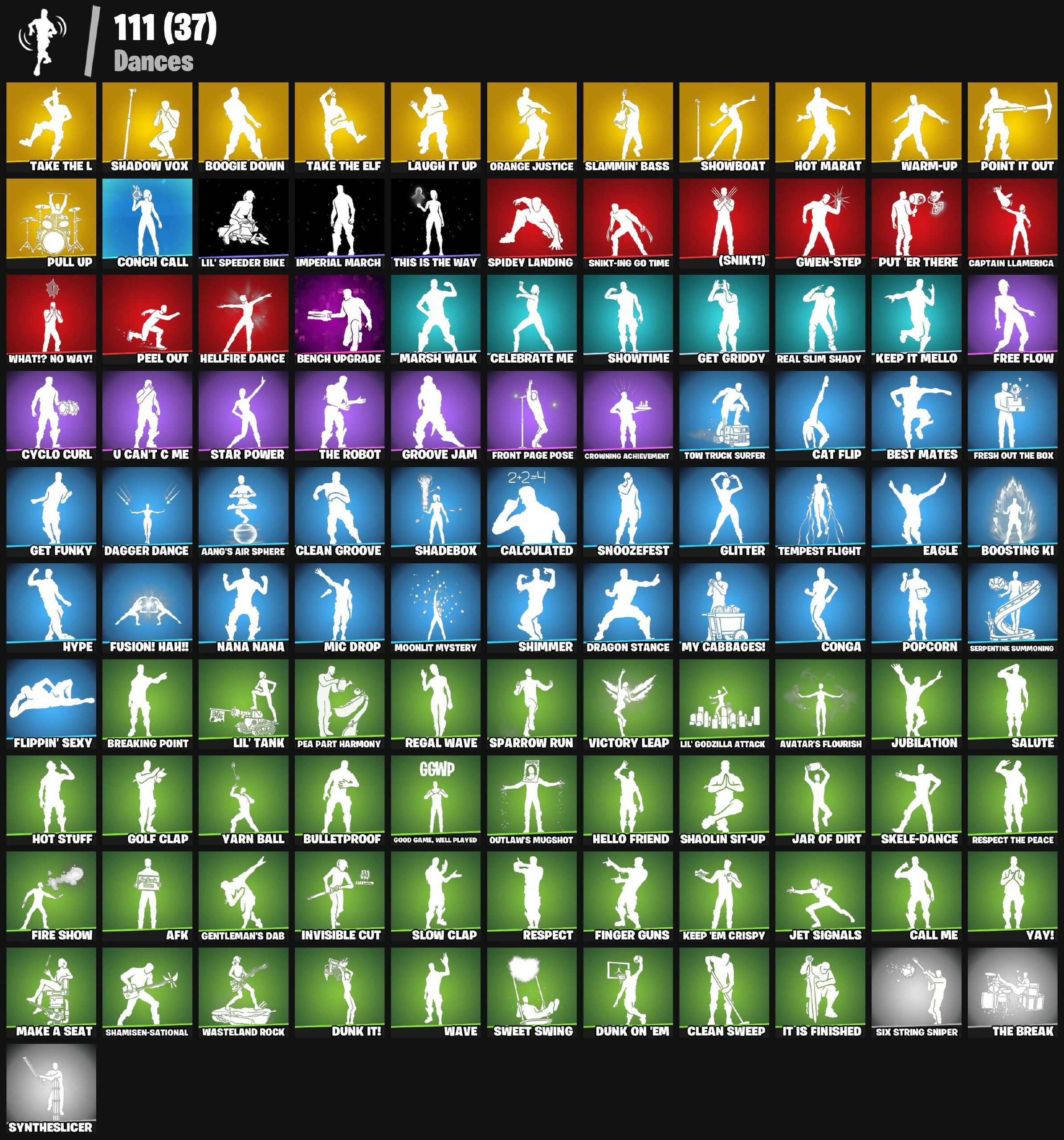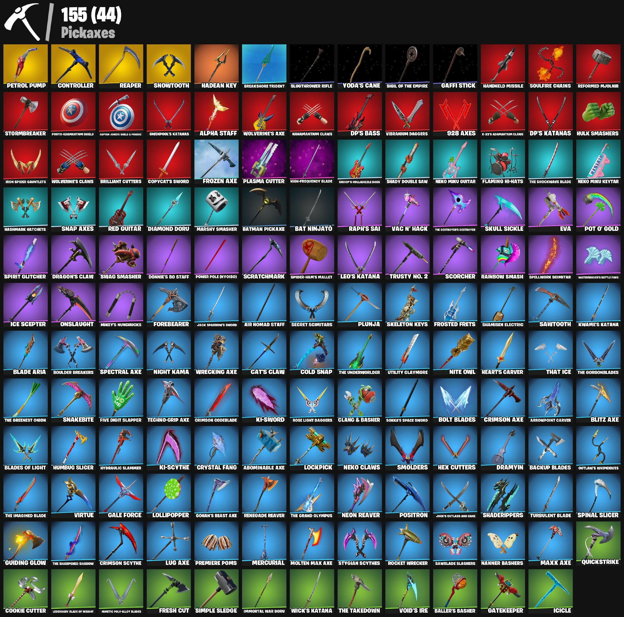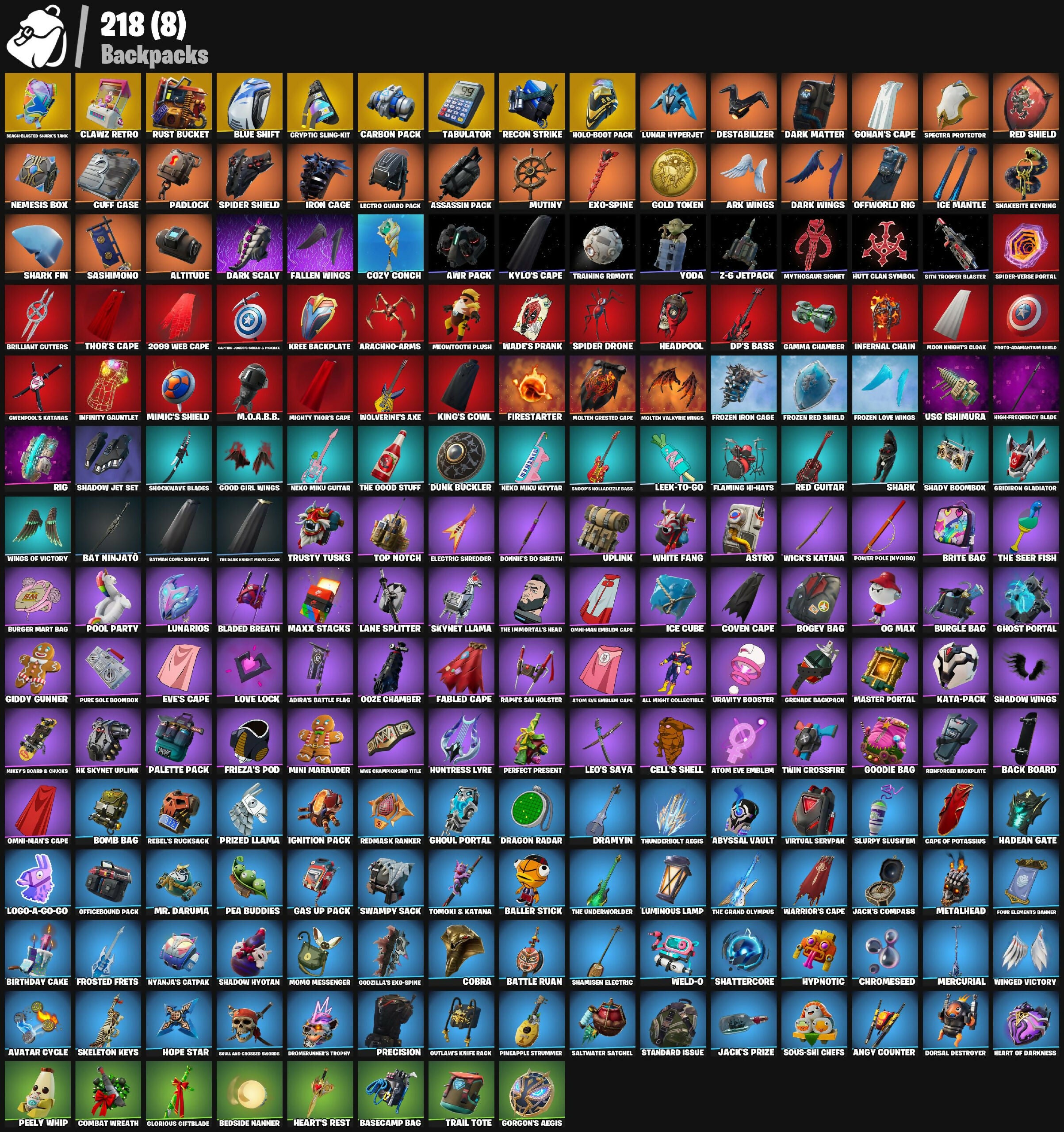 'Logo-A-Go-Go, (Snikt!), 2099 Web Cape, 212th Battalion Trooper, 501st Trooper, 928 Axes, AFK, AWR Trooper, Aang, Aang's Air Sphere, Abominable Axe, Abyssal Vault, Adira's Battle Flag, Aerial Assault Bomber, Air Nomad Staff, Airie, Airphorian, Alias, All Might Collectible, Alpha Staff, Altitude, Angy Counter, Ankara Print, Aphrodite, Apprentice Evie, Arachno-Arms, Ares, Ark, Ark Wings, Arrowpoint Carver, Artemis, Assassin, Assassin Pack, Astro, Atom Eve, Atom Eve Emblem, Atom Eve Emblem Cape, Avatar Cycle, Avatar State Aang, Avatar's Flourish, Awr Pack, Back Board, Backup Blades, Baller Stick, Baller's Basher, Banner Icon, Basecamp Bag, Bat Ninjato, Batman Comic Book Outfit, Batman Pickaxe, Battle Ruam, Battlehawk, Beach-Blasted Shark's Tail, Beach-Blasted Shark's Tank, Bedside Manner, Beerus, Bench Upgrade, Best Mates, Birthday Cake, Black Panther, Blackheart, Blade Aria, Bladed Breath, Blades of Light, Blaze, Blitz Axe, Blizzard Bomber, Blue Shift, Blue Streak, Blue Striker, Blue Team Leader, Boba Fett, Bogey Bag, Bolt Blades, Bomb Bag, Boogie Down, Boosting Ki, Boot It, Boulder Breakers, Breaking Point, Breakshore Trident, Brilliant Cutters, Brite Bag, Brite Gunner, Bulletproof, Bulma, Burger Mart Bag, Burgle Bag, Calculated, Call Me, Cape Of Potassius, Cape of Potassium, Caper, Captain America, Captain Jones, Captain Jones' Shield & Pistol, Captain Llamerica, Captain Marvel, Captain Phasma, Carbide, Carbon Commando, Carbon Pack, Cassidy Quinn, Cat Flip, Cat's Claw, Celebrate Me, Cell, Cell's Shell, Cerberus, Chaos Agent, Chapter 3 Island Theme, Chapter 4 Island Theme, Chapter 5 Island Theme, Chomp Sr., Chromeseed, Clang & Basher, Clawz Retro, Clean Groove, Clean Sweep, Cloaked Shadow, Clubs, Cobalt, Cobra, Cold Snap, Combat Wreath, Conch Call, Conga, Contract Giller, Controller, Cookie Cutter, Copycat's Sword, Coven Cape, Cozy Conch, Crimson Axe, Crimson Codeblade, Crimson Scythe, Crowning Achievement, Cryptic Coaster, Cryptic Sling-Kit, Crystal Fang, Cuddle Hearts, Cuff Case, Cursed Jack Sparrow, Cyclo Curl, DP's Bass, DP's Katanas, Dagger Dance, Dark Matter, Dark Rex, Dark Scaly, Dark Voyager, Dark Wings, Deadpool (Pen & Ink), Destabilizer, Diamond Doru, Diamonds, Donatello, Donnie's Bo Sheath, Donnie's Bo Staff, Dorsal Destroyer, Dragon Radar, Dragon Stance, Dragon's Claw, Dramyin, Dromerunner's Trophy, Dunk Buckler, Dunk It!, Dunk On 'Em, Durrr Taisho, Eagle, Eclipse, Electric Shredder, Elite Agent, Emma Frost, Eva, Eve's Cape, Exo-Spine, Fabled Cape, Fallen Love Ranger, Fallen Wings, Fennec Shand, Finesse Forward, Finger Guns, Fire Show, Firestarter, Fishstick, Five Digit Slapper, Flaming Hi-Hats, Flappy, Flippin' Sexy, Forebearer, Forsaken Eye, Four Elements Banner, Free Flow, Fresh Cut, Fresh Out The Box, Frieza, Frieza's Pod, Front Page Pose, Frosted Frets, Frozen Axe, Frozen Iron Cage, Frozen Love Ranger, Frozen Love Wings, Frozen Raven, Frozen Red Knight, Frozen Red Shield, Fryangles, Fusion! Hah!!, Gaffi Stick, Gale Force, Gamma Chamber, Gas Up Pack, Gatekeeper, Gentleman's Dab, Get Funky, Get Griddy, Ghost Portal, Ghost Rider, Ghoul Portal, Giannis Antetokounmpo, Giddy Gunner, Ginger Gunner, Glitter, Glorious Giftblade, Godzilla Evolved, Godzilla's Exo-Spine, Gohan's Beast Axe, Gohan's Cape, Goku Black, Gold Token, Golf Clap, Good Game, Well Played, Good Girl Wings, Goodie Bag, Gorgon's Aegis, Green Toy, Grenade Backpack, Grey Toy, Gridiron Gladiator, Grimbles, Groove Jam, Guiding Glow, Gwen-Step, Gwenpool, Gwenpool's Katanas, HK Skynet Uplink, Hadean Gate, Hadean Key, Hades, Hailstorm Rider, Handheld Missile, Haruka of the Masks, Hashmark Hatchets, Headpool, Heart of Darkness, Heart's Carver, Heart's Rest, Hearts, Hellfire Dance, Hello Friend, Hex Cutters, High-Frequency Blade, Holiday Boxy, Holo-Boot Pack, Hope Star, Hoplite Giannis, Hot Marat, Hot Stuff, Hulk, Hulk Smashers, Humbug Slicer, Huntress Lyre, Hutt Clan Symbol, Hybrid, Hydraulic Slammer, Hype, Hypnotic, Ice Cube, Ice Mantle, Ice Scepter, Icicle, Ignition Pack, Immortal War Doru, Imperial March, Infernal Chain, Inferno, Infinity Gauntlet, Invincible, Invisible Cut, Iron Cage, Iron Spider, Iron Spider Gauntlets, Isaac Clarke, It Is Finished, Izuku Midoriya, Jack Sparrow, Jack Sparrow's Sword, Jack's Compass, Jack's Cutlass and Bane, Jack's Prize, Jade, Jar Of Dirt, Jet Signals, Jing, John Cena, John Wick, Jubilation, Kata-Pack, Katsuki Bakugo, Keep 'Em Crispy, Keep It Mello, Kendo, Kernel Poppy, Ki-Scythe, Ki-Sword, King's Cowl, Korra, Kree Backplate, Krrsantan, Kwame, Kwame's Katana, Kylo Ren, Kylo's Cape, Laguna, Lane Splitter, Laugh It Up, Lectro Guard Pack, Leek-To-Go, Legendary Blade of Insight, Lego Fortnite Theme, Leo's Katana, Leo's Saya, Leonardo, Lil' Godzilla Attack, Lil' Speeder Bike, Lil' Tank, Lina Scorch, Lobby Classic, Lockpick, Logo-A-Go-Go, Lollipopper, Love Lock, Lug Axe, Luke Skywalker, Luminous Lamp, Lunar Hyperjet, Lunarios, Lynx, M.O.A.B.B., Mahomes Saucy Style, Make A Seat, Marsh Walk, Marshinobi, Marshmello, Marshy Smasher, Master Portal, Maxx Axe, Maxx Stacks, Maxxed Out Max, Mecha Team Shadow, Medusa, Meowtooth Plush, Mercurial, Merry Marauder, Metalhead, Mezmer, Mic Drop, Michelangelo, Mighty Thor, Mighty Thor's Cape, Mikey's Board & Chicks, Mikey's Nunchucks, Mimic's Shield, Mini Marauder, Mission Specialist, Molten Battle Hound, Molten Crested Cape, Molten Max Axe, Molten Valkyrie, Molten Valkyrie Wings, Momo Messenger, Moon Knight, Moon Knight's Cloak, Moon Knight’s Cloak, Moonlit Mystery, Moonwalker, Mr. Daruma, Musha, Mutiny, My Cabbages!, Mythosaur Signet, Nana Nana, Nanamatium Claws, Nanner Bashers, Nara, Neko Claws, Neko Hatsune Miku, Neko Miku Guitar, Neko Miku Keytar, Nemesis Box, Neon Reaver, Night Kama, Nimetic Poly-Alloy Blades, Ninja Knight Batman, Nite Owl, Nyangelica, Nyanja, Nyanja's Catpak, Oblivion, Ochaco Uraraka, Officebound Pack, Offworld Rig, Og Max, Omega, Omin-Han Emblem Cape, Omni-Man, Omni-Man's Cape, Onesie, Onslaught, Ooze Chamber, Oppressor, Orange Ju