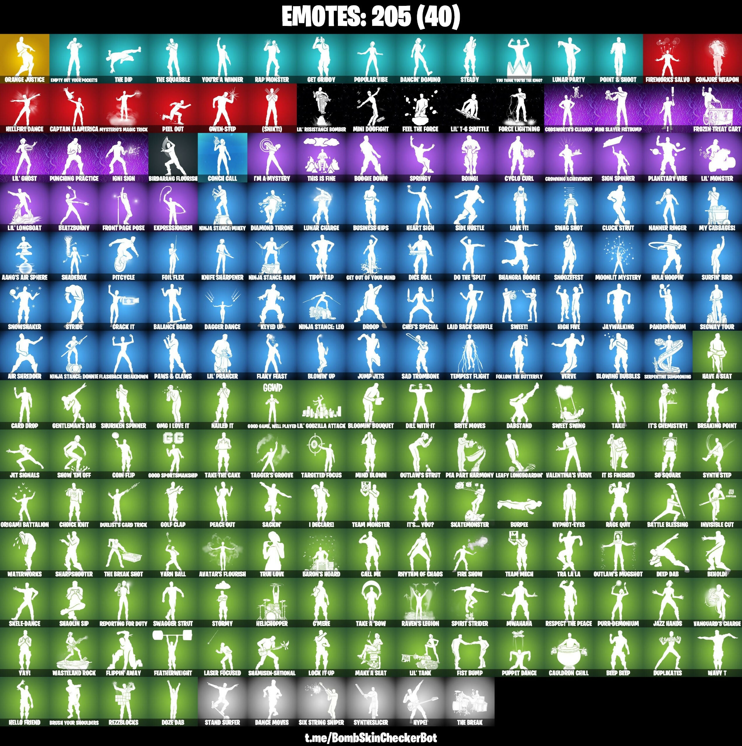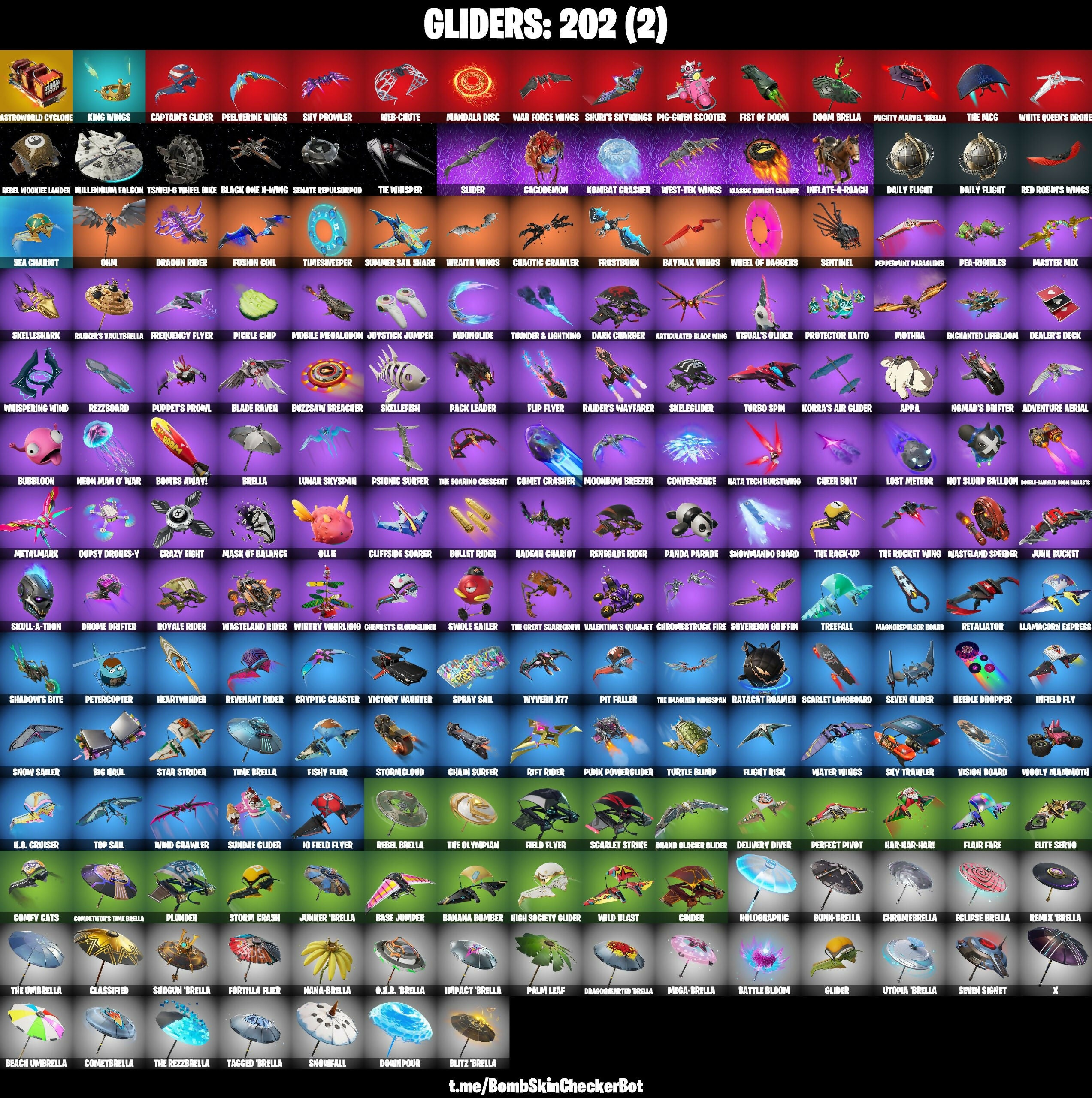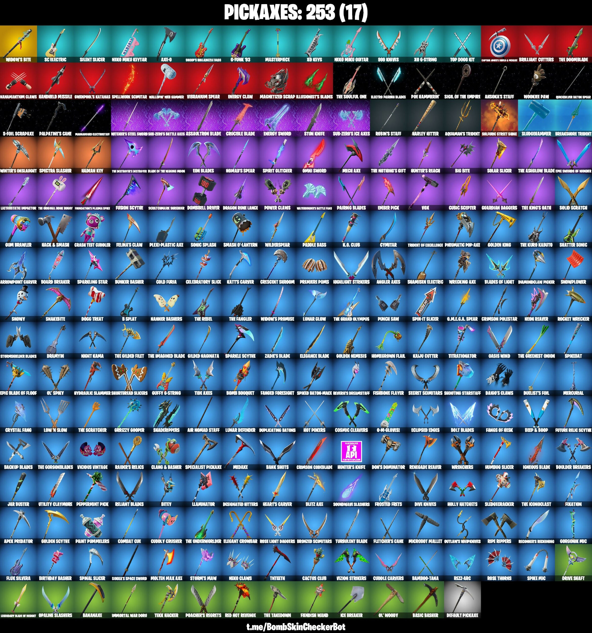 (Snikt!), 1-Ball, 10 Field Flyer, 999 Knives, Aang, Aang's Air Sphere, Adira, Adventure Aerial, Aerial Assault Bomber, Agent Patch, Agent Peely, Air Nomad Staff, Air Shredder, Angler Axes, Antonia, Apex Predator, Aphrodite, Appa, Apprentice Evie, Aquaman, Aquaman's Trident, Arctic Adeline, Ares, Arrowpoint Carver, Arsona's Staff, Artemis, Articulated Blade Wing, Assaultron Blade, Astroworld Cyclone, Aura, Avatar State Aang 8-Ball Vs Scratch, Avatar's Flourish, Axe-O, B Splat, Backup Blades, Balance Board, Bamboo-Tana, Banana Bomber, Bananaxe, Bank Shots, Banker's Vaultbrella, Baron's Hoard, Base Jumper, Basic Basher, Battle Blessing, Battle Bloom, Battle Gamer Mae, Baymax Wings, Beach Umbrella, Beatzbunny, Beep & Boop, Beep Beep, Behold!, Bhangra Boogie, Big Bite, Big Dill, Big Haul, Birdarang Flourish, Birthday Basher, Bitey, Black One X-Wing, Blade Of The Waning Moon, Blade Raven, Blades Of Light, Blitz 'Brella, Blitz Axe, Blitz Knight, Blizzabelle, Blizzard Bomber, Bloomin' Bouquet, Blowin' Up, Blowing Bubbles, Board Breaker, Boing!, Bolt Blades, Bomb Bouquet, Bombs Away!, Boogeyman, Boogie Down, Boulder Breakers, Breaking Point, Breakshore Trident, Brella, Brilliant Cutters, Brite Moves, Brite Raider, Bronzed Scimitars, Brush Your Shoulders, Brutus (Fully Golden), Bubloon, Bullet Rider, Bunker Basher, Bunker Jonesy, Burpee, Business Hips, Buzzsaw Breacher, Bytes, Cacodemon, Cactus Club, Call Me, Cameo Vs Chic, Captain Jones, Captain Llamerica, Captain's Glider, Card Drop, Cassidy Quinn, Catalyst, Cauldron Chill, Celebratory Slice, Cerberus, Chain Surfer, Chaos Director, Chaotic Crawler, Cheer Bolt, Chef's Special, Chemist's Cloudglider, Choice Knit, Chromebrella, Chromestruck Fire, Cinder, Clang & Basher, Classified, Cliffside Soarer, Cluck Strut, Codsworth's Cleanup, Coin Flip, Cold Furia, Combat Cue, Comet Crasher, Cometbrella, Comfy Cats, Competitor's Time Brella, Conch Call, Conjure Weapon, Convergence, Cosmic Cleavers, Crack It, Crash Test Cuddler, Crazy Eight, Crescent Shroom, Crimson Codeblade, Crimson Polestar, Crowning Achievement, Crucible Blade, Cryptic Coaster, Crystal Fang, Cubic Scepter, Cuddle Carvers, Cuddly Crusher, Cyclo Curl, Cymere, Cymitar, Cypherpk, Dabstand, Dagger Dance, Daigo, Daigo's Claws, Daily Flight, Dali, Dance Moves, Dancin' Domino, Dark Charger, Deadpool, Dealer's Deck, Deep Dab, Default, Default Pickaxe, Delivery Diver, Demi, Designated Hitters, Diamond Throne, Diamondclaw Picker, Dice Roll, Dill With It, Dive Knives, Do The 'Split, Doctor Strange, Dogg Treat, Don's Dominator, Doom, Doom Brella, Doom Slayer, Downpour, Doze Dab, Dragon Rider, Dragon Rune Lance, Dragonhearted 'Brella, Dramyin, Drive Shaft, Drome Drifter, Droop, Duelist's Card Trick, Duelist's Foil, Dumbbell Driver, Duplicating Batons, Duplihate, Duplikats, Durrr Taisho, Dusty, Dynamo Tntina, Eclipse Brella, Eclipsed Edges, Electro Pairing Blades, Electrostatic Impactor, Elegance Blade, Elegant Crowbar, Elite Servo, Ember Pick, Emma Frost, Emperor Palpatine, Empty Out Your Pockets, Enchanted Lifebloom, Energy Claw, Energy Sword, Eon Blades, Epic Blade Of Floof, Epic Swords Of Wonder, Era, Erisa, Eternal Knight, Evie, Expressionism, Fade, Fanged Foresight, Fangs Of Hesik, Featherweight, Feel The Force, Felina, Felina's Claw, Field Flyer, Fiendish Wand, Fire Show, Fireworks Salvo, Fish Thicc, Fishbone Flayer, Fishy Flier, Fist Bump, Fist of Doom, Fixation, Flair Fare, Flaky Feast, Flashback Breakdown, Fletcher Kane, Fletcher's Cane, Flight Risk, Flip Flyer, Flippin' Away, Flux Silvera, Focus, Foil Flex, Follow The Butterfly, Force Lightning, Fortilla Flier, Foundation's Aurora Spear, Frequency Flyer, Front Page Pose, Frostburn, Frosted Frets, Frozen Treat Cart, Fusion, Fusion Coil, Fusion Scythe, Future Relic Scythe, G-Funk '93, Gear Specialist Maya, General Grievous, Gentleman's Dab, Geralt of Rivia, Get Griddy, Get Out Of Your Mind, Gilded Naginata, Glider, Godzilla Evolved, Golden King, Golden Nemesis, Golden Scythe, Golf Clap, Good Game, Well Played, Good Sportsmanship, Gorgonik Mic, Grand Glacier Glider, Grizzly Gooper, Grriz, Guardian Daggers, Guffy G-String, Gum Brawler, Gumbo, Gunn-Brella, Gunnar, Gwen-Step, Gwenpool, Gwenpool's Katanas, Hack & Smash, Hadean Chariot, Hadean Key, Hades, Handheld Missile, Har-Har-Hare, Harley Hitter, Harlowe, Have A Seat, Haven, Haylee Skye, Heart Sign, Heart's Carver, Heartwinder, Helichopper, Hellfire Dance, Hello Friend, Helsie, Hero Baymax, High Five, High Society Glider, Highlight Strikers, Holiday Boxy, Holly Hatchets, Holographic, Homegrown Flail, Hope, Hot Pokers, Hot Slurp Balloon, Hula Hoopin', Humbug Slicer, Hunter's Knife, Hunter's Reach, Hydraulic Slammer, Hype!, Hypnot-Eyes, I Declare!, I'm A Mystery, I.K.O. Club, Ice Breaker, Igneous Blade, Igni Sign, Imani, Immortal War Doru, Impact 'Brella, Infield Fly, Inflate-A-Roach, Invisible Cut, Iridia Vayne, Iron Man Mk 45, It Is Finished, It's Chemistry!, It's... You?, Jade, Jar Buster, Jaywalking, Jazz Hands, Jet Signals, Joss, Journey Vs Hazard, Joystick Jumper, Jules, Jump Jets, Junk Bucket, Junker 'Brella, K.O. Cruiser, Kado Thorne, Kaiju Cutter, Kata Tech Burstwing, Katt, Katt's Carver, Keisha Cross, Kendo, Keyed Up, Khaby Lame, Kiara K.O., Killswitch, King Wings, Kit, Klassic Kombat Crasher, Knife Sharpener, Kombat Crasher, Korra, Korra's Air Glider, Krisabelle, Lady of Cranes, Laid Back Shuffle, Laser Focused, Lbc '93 Dogg, Leafy Longboardin', Lennox Rose, Lightrider, Lil Split, Lil T-6 Shuttle, Lil' Ghost, Lil' Godzilla Attack, Lil' Longboat, Lil' Monster, Lil' Prancer, Lil' Resistance Bomber, Lil' Tank, Lina Scorch, Llamacorn Express, Llaminator, Lock It Up, Lost Meteor, Love It!, Low 'N Slow, Lt. Evergreen, Lt. John Llama, Lunar Charge, Lunar Defender, Lunar Glow, Lunar Party, Lunar Skyspan, Madolgaard Electrostaff, Mae, Magnetized Scrap Illusionist's Blades, Magnopulsor Board, Make A Seat, Malik, Mandala Disc, Mask of Balance, Massai, Master Mix, Masterpiece, Mech Axe, Mecha-Pop, 