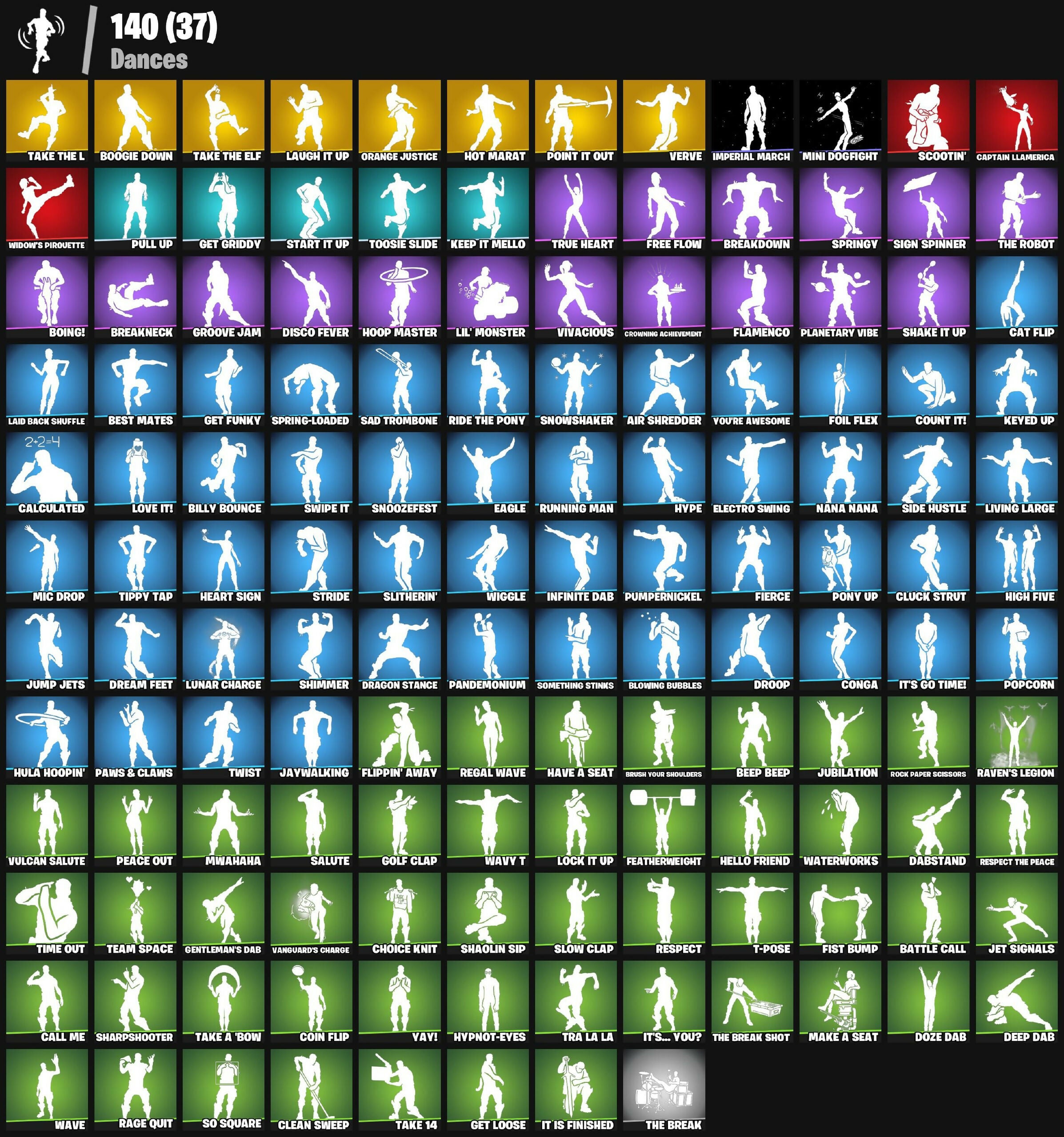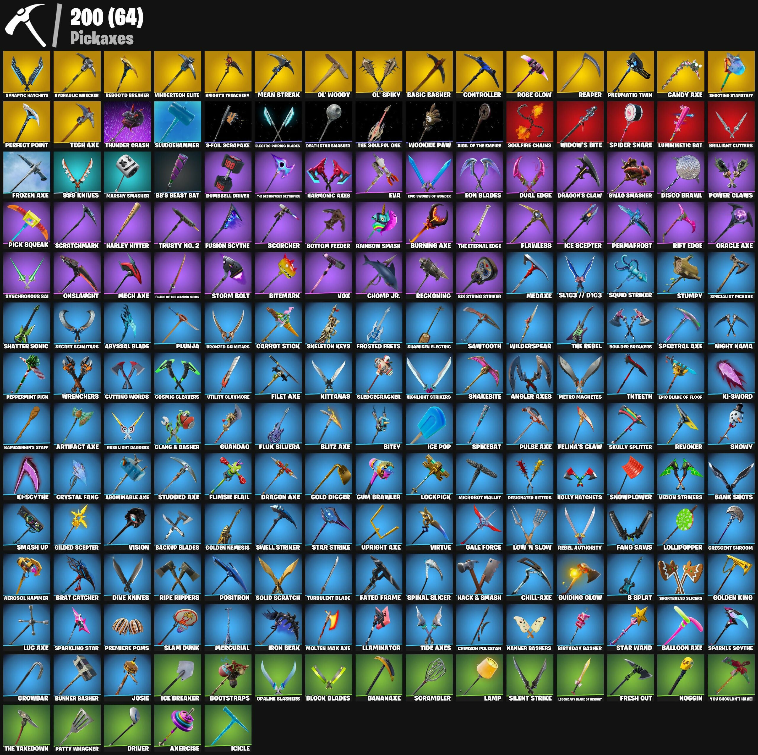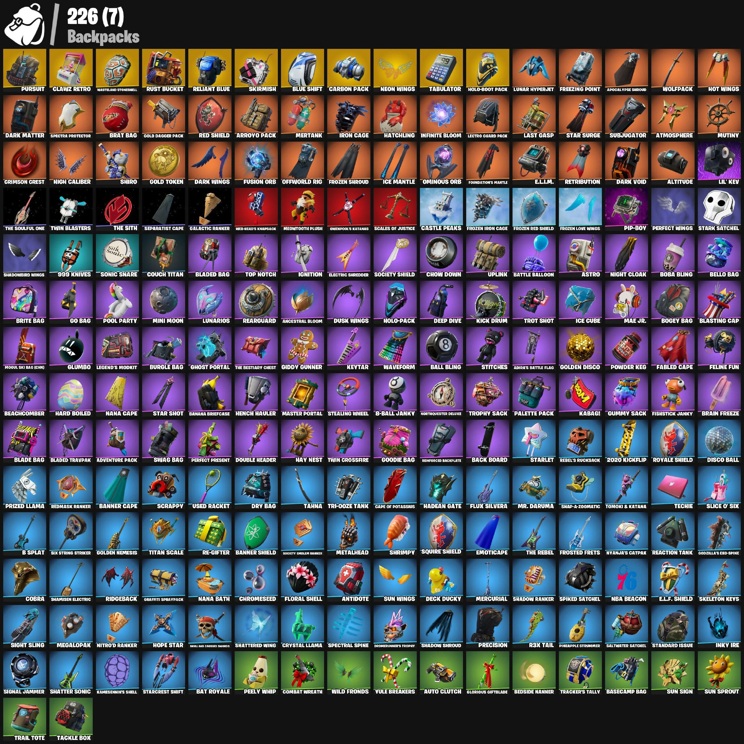 2020 Kickflip, 8-Ball Janky, 8-Ball Vs Scratch, 999 Knives, A.I.M., Abominable Axe, Absenz, Abyssal Blade, Adira's Battle Flag, Adventure Pack, Aerosol Hammer, Afterparty, Agent Peely, Air Shredder, Altitude, Ancestral Bloom, Anderson .Paak, Angler Axes, Antidote, Apocalypse Shroud, Arctic Assassin, Arroyo Pack, Artifact Axe, Assault Trooper, Astro, Atlantean Fishstick, Atmosphere, Aura, Auto Clutch, Axercise, B Splat, BB's Beast Bat, Back Board, Backup Blades, Ball Bling, Balloon Axe, Banana Briefcase, Bananaxe, Bank Shots, Banner Cape, Banner Shield, Basecamp Bag, Basic Basher, Bat Royale, Batman, Battle Balloon, Battle Bus, Battle Call, Battlehawk, Beachcomber, Beast Boy, Bedside Manner, Beep Beep, Bello Bag, Best Mates, Billy Bounce, Birdie, Birthday Basher, Bitemark, Bitey, Blackheart, Blade Bag, Blade of the Waning Moon, Bladed Bag, Bladed Trapvak, Blasting Cap, Blitz Axe, Block Blades, Blowing Bubbles, Blue Cyclo, Blue Shift, Blue Squire, Blue Streak, Blue Striker, Blue Team Leader, Boba Bling, Bogey Bag, Boing!, Bolt, Boogie Down, Bootstraps, Bottom Feeder, Boulder Breakers, Brain Freeze, Brainiac, Branded Brigadier, Brat Bag, Brat Catcher, Breakdown, Breakneck, Breakpoint, Brilliant Cutters, Brite Bag, Brite Bomber, Brite Gunner, Bronzed Scimitars, Brush Your Shoulders, Brutus, Bullseye, Bunker Basher, Bunker Jonesy, Bunnymoon, Burgle Bag, Burning Axe, Burning Dragon, Calamity, Calculated, Call Me, Cameo Vs Chic, Candy Axe, Cape Of Potassius, Captain Llamerica, Carbide, Carbon Commando, Carbon Pack, Carrot Stick, Castle Peaks, Cat Flip, Catalyst, Chapter 3 Island Theme, Chapter 4 Island Theme, Chapter 5 Island Theme, Chill-Axe, Choice Knit, Chomp Jr., Chow Down, Chromeseed, Clang & Basher, Clawz Retro, Clean Sweep, Cluck Strut, Clutch, Coaxial Blue, Cobalt, Cobalt Overdrive, Cobra, Codename E.L.F., Coin Flip, Combat Wreath, Commando, Conga, Constructor, Controller, Cosmic Cleavers, Couch Titan, Count It!, Crescent Shroom, Crimson Crest, Crimson Polestar, Crowbar, Crowning Achievement, Cryptic, Crystal Fang, Crystal Llama, Cuddle Hearts, Cutting Words, DJ Vonder, Dabstand, Dark Matter, Dark Vanguard, Dark Void, Dark Voyager, Dark Wings, Deadpool, Death Star Smasher, Deck Ducky, Deep Dab, Deep Dive, Demi, Designated Hitters, Dire, Disco Ball, Disco Baller, Disco Brawl, Disco Diva, Disco Fever, Dive Knives, Doggo, Double Header, Doublecross, Doze Dab, Dragon Axe, Dragon Stance, Dragon's Claw, Dream, Dream Feet, Drift, Driver, Dromedunner's Trophy, Droop, Dry Bag, Dual Edge, Dumbbell Driver, Dusk, Dusk Wings, Dynamo, E.L.F. Shield, E.L.I.M., Eagle, Electric Shredder, Electro Pairing Blades, Electro Swing, Elite Agent, Ember, Emoticape, Enforcer, Eon Blades, Epic Blade of Floof, Epic Swords of Wonder, Eva, Fable, Fabled Cape, Fade, Fang Saws, Fate, Fated Frame, Featherweight, Felina, Felina's Claw, Feline Fun, Fierce, Filet Axe, Fireworks Team Leader, Fishstick (World Cup), Fishstick Janky, Fist Bump, Fixer, Flamenco, Flappy, Flawless, Flimsie Flail, Flip Reset, Flippin' Away, Floral Shell, Flux Silvera, Foil Flex, Foundation's Mantle, Founder's Glider, Founder's Umbrella, Free Flow, Freezing Point, Fresh Cut, Frostbite, Frosted Frets, Frozen Axe, Frozen Fishstick, Frozen Iron Cage, Frozen Love Ranger, Frozen Love Wings, Frozen Nog Ops, Frozen Raven, Frozen Red Knight, Frozen Red Shield, Frozen Shroud, Fryangles, Funk Ops, Fusion, Fusion Orb, Fusion Scythe, Galactic Ranker, Gale Force, Gear Specialist Maya, Gentleman's Dab, Get Funky, Get Griddy, Get Loose, Ghost Portal, Giddy Gunner, Giddy-Up, Gilded Scepter, Ginger Gunner, Glorious Giftblade, Glumbo, Go Bag, Godzilla's Exo-Spine, Goku Black, Gold Dagger Pack, Gold Digger, Gold Token, Golden Disco, Golden King, Golden Nemesis, Golf Clap, Goodie Bag, Graffiti Spraypack, Grimey, Grind, Groove Jam, Guandao, Guiding Glow, Gum Brawler, Gumbo, Gummy Sack, Gwendolyn's Katanas, Hack & Smash, Hadean Gate, Hard Boiled, Harley Hitter, Harlowe, Harmonic Axes, Hatchling, Have A Seat, Haven, Hay Man, Hay Nest, Haze, Heart Sign, Heat, Hello Friend, Hench Hauler, High Caliber, High Five, Highlight Strikers, Hime, Holiday Boxy, Holly Hatchets, Holo-Boot Pack, Holo-Pack, Hoop Master, Hope Star, Hot Marat, Hot Wings, Hula Hoopin', Huntress, Hybrid, Hydraulic Wrecker, Hype, Hypnot-Eyes, Ice Breaker, Ice Cube, Ice Mantle, Ice Pop, Ice Scepter, Icicle, Ignition, Imperial March, Infinite Bloom, Infinite Dab, Inky Ire, Insight, Instinct, Interceptor, Iron Beak, Iron Cage, It Is Finished, It's Go Time!, It's... You?, Jaywalking, Jet Signals, Josie, Journey Vs Hazard, Jubilation, Jules, Jump Jets, Jumpshot, Jungle Scout, Kabagg, Kamesennin's Shell, Kamesennin's Staff, Keep It Mello, Keyed Up, Keytar, Ki-Scythe, Ki-Sword, Kick Drum, King Flamingo, Kit, Kittanas, Knight's Treachery, Krampus, Krisabelle, Lace, Laguna, Laid Back Shuffle, Lamp, Last Gasp, Laugh It Up, Lectro Guard Pack, Legend's Modkit, Legendary Blade of Delight, Lego Fortnite Theme, Lil' Kev, Lil' Monster, Living Large, Llaminator, Lobby Classic, Lock It Up, Lockpick, Lollipopper, Love It!, Low 'N Slow, Lt. Evergreen, Lt. John Llama, Lug Axe, Lumikinetic Bat, Lunar Charge, Lunar Hyperjet, Lunarios, Luxe, Lynx, Madcap, Mae Jr., Make A Seat, Maki Master, Mako, Manic, Marika, Marked Marauder, Marshy Smasher, Master Key, Master Portal, Maven, Mean Streak, Mech Axe, Mecha Team Banner, Medaxe, Megalopak, Meowscles, Meowtooth Plush, Mercurial, Mertank, Metalhead, Metro Machetes, Mic Drop, Microbot Mallet, Midas, Mini Dogfight, Mini Moon, Mission Specialist, Mogul Master (Ccm), Mogul Ski Bag (Cnh), Mogul Ski Bag (EGN), Moisty Merman, Molten Max Axe, Moonwalker, Mr. Daruma, Mutiny, Mwahaha, NBA Beacon, Nana Bath, Nana Cape, Nana Nana, Nanner Bashers, Neon Man O' War, Neon Tendrils, Neon Wings, Night Cloak, Night Kama, Nightshade, Nike Goddess, Nitelite, Nitro'd Ranker, Nog Ops, Noggin, Northquster Deluxe, Nyanja's Catpak, Ocean, Offworld Rig, Ol' Spiky, Ol' Woody, Omega, Ominous Orb, Onesie, Onslaught, 