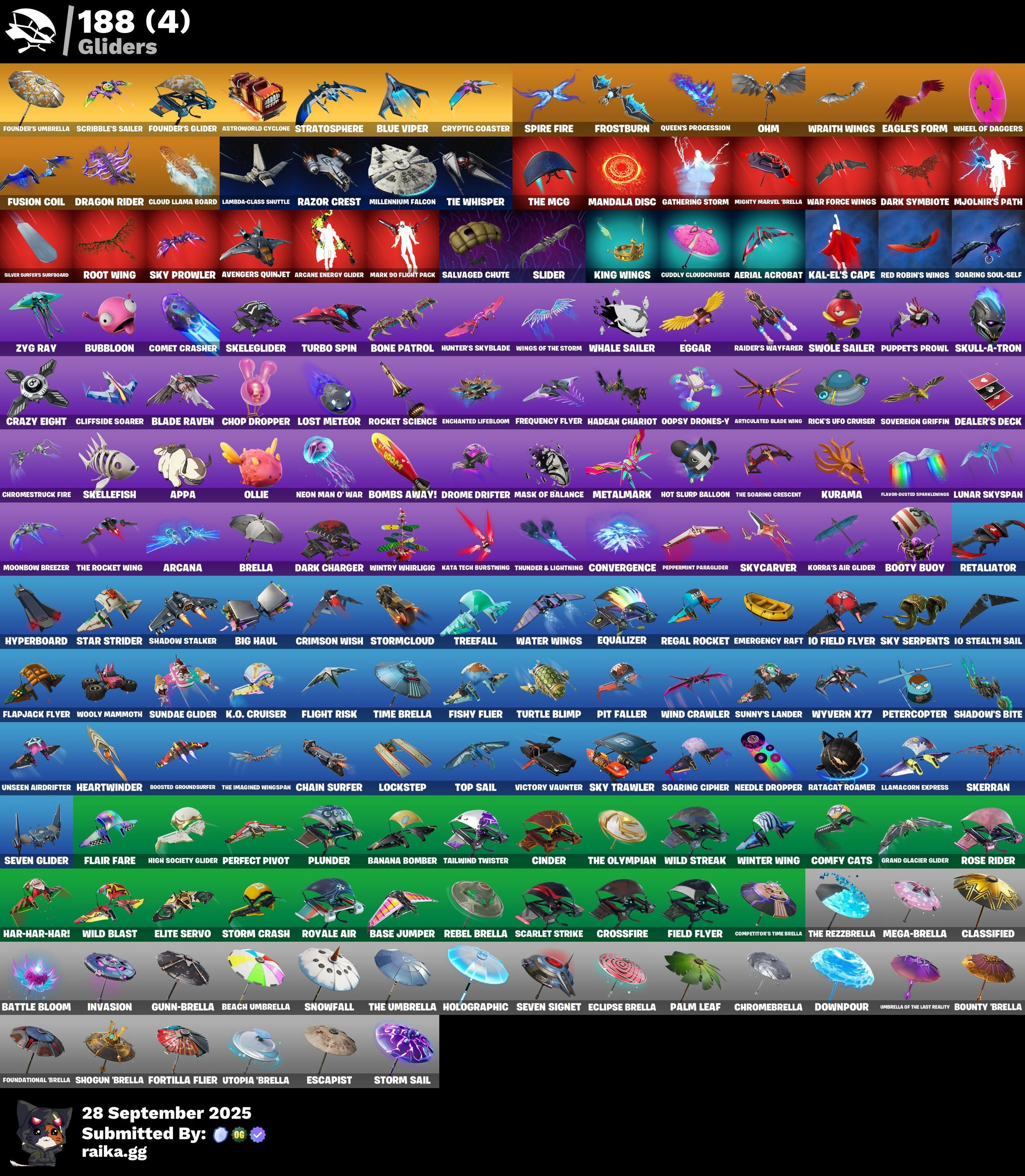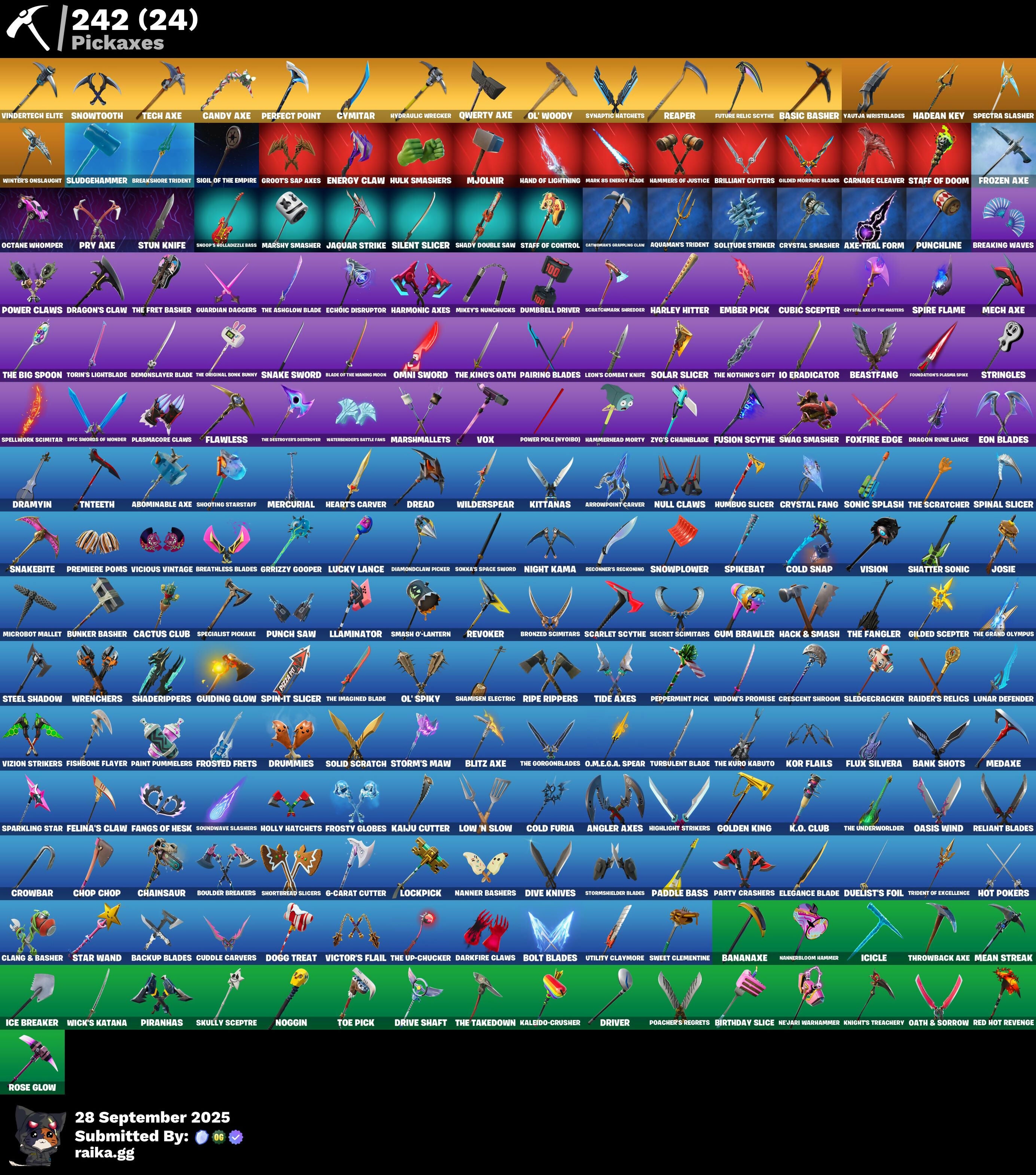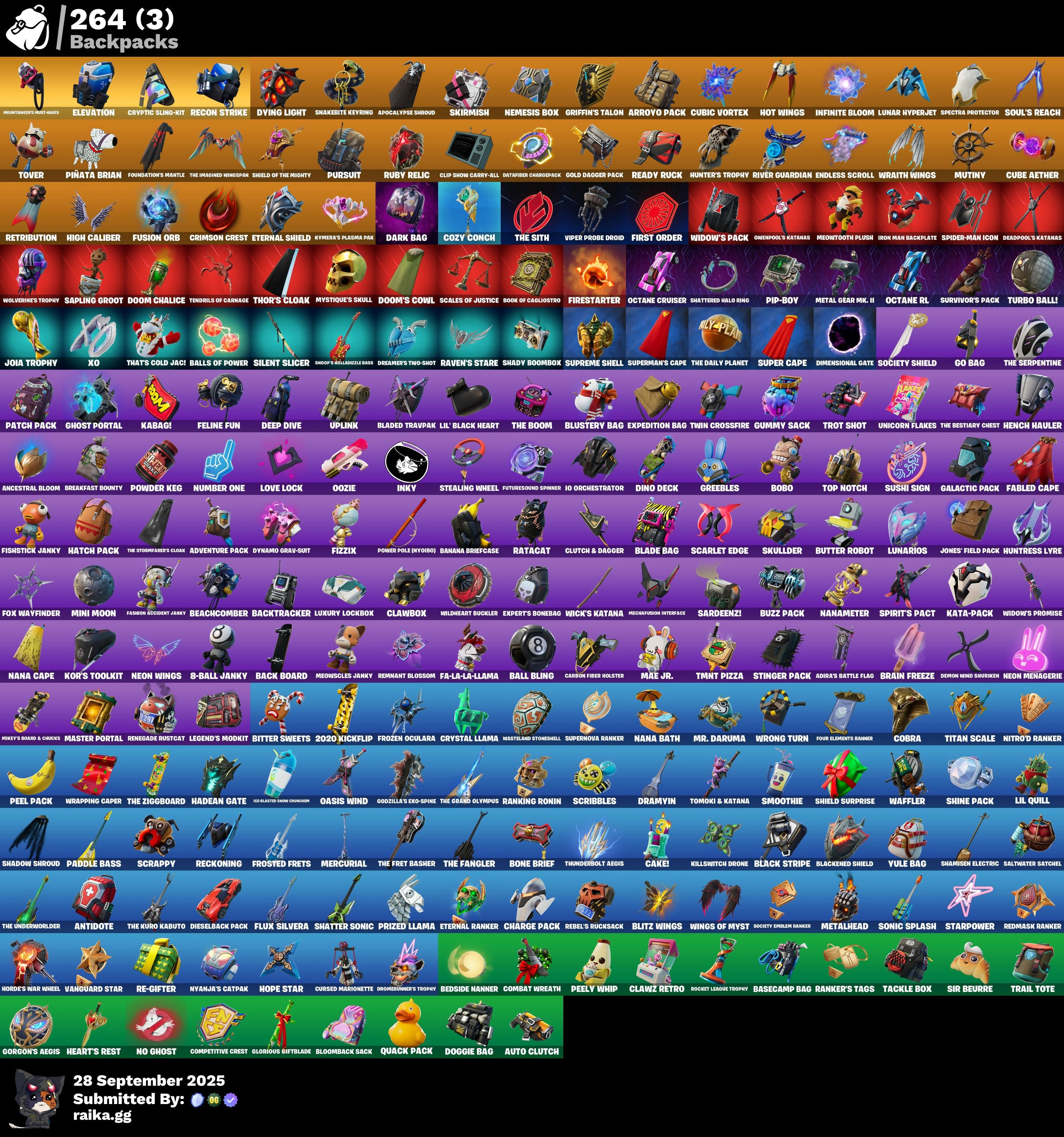 10 Field Flyer, 10 Stealth Sail, 2020 Kickflip, 6-Carat Cutter, 8-Ball Janky, A Warrior Prepares, Abominable Axe, Adira (Battle Mask), Adira's Battle Flag, Adventure Pack, Aerial Acrobat, Agent Jones (Jump 31), Agent Peely, Air Shredder, Ancestral Bloom, Angler Axes, Antidote, Antiforest Bushranger, Antonia, Aphrodite, Apocalypse Shroud, Appa, Aquaman's Trident, Arcana, Arcane Energy Glider, Arctic Adeline, Arrowpoint Carver, Arroyo Pack, Artemis, Arthur Curry, Articulated Blade Wing, Astroworld Cyclone, Atlantean Fishstick, Aura, Auto Clutch, Avatar's Flourish, Avengers Quinjet, Axe-Tral Form, Azarath Metrion Zinthos!, Back Board, Backtracker, Backup Blades, Balanced, Ball Bling, Baller, Balls of Power, Banana Bomber, Banana Briefcase, Bananaxe, Bank Shots, Base Jumper, Basecamp Bag, Basic Basher, Bat Signal, Battle Bloom, Beach Umbrella, Beachcomber, Bean Bag, Beastfang, Beatzbunny, Bedside Nanner, Beep Beep, Big Haul, Billy Bounce, Birthday Slice, Bitter Sweets, Black, Black Stripe, Black Widow Outfit, Blackened Shield, Blackheart (Stage 6), Blade Bag, Blade Raven, Blade of the Burning Moon, Bladed Travpak, Blaze, Blitz Axe, Blitz Wings, Blizzard Bomber, Bloomback Sack, Blowin' Up, Blue Viper, Blustery Bag, Bobo, Boing!, Bolt Blades, Bombs Away!, Bone Brief, Bone Patrol, Boobytrapped, Boogie Down, Book of Cagliostro, Boomin', Boosted Groundsurfer, Boots'N' Cats, Booty Buoy, Boulder Breakers, Bounty Brella, Brain Freeze, Breakfast Bounty, Breaking Point, Breaking Waves, Breakshore Trident, Breathless Blades, Brella, Brilliant Cutters, Bring It Around, Bronzed Scimitars, Bubbloon, Bullseye, Bunker Basher, Bunker Jonesy, Burning Ambition Valeria, Butter Robot, Buzz Pack, Bytes (Lone Traveler), Cactus Club, Cake!, Call Me, Cameo vs Chic, Candy Axe, Carbon Fiber Holster, Card Drop, Cardistry, Carnage (Maximum), Carnage Cleaver, Catwoman's Grappling Claw, Cerberus, Chain Surfer, Chainsaur, Charge Pack, Charlotte, Chef's Special, Chimichanga!, Choice Knit, Chop Chop, Chop Dropper, Chromebrella, Chromestruck Fire, Cinder, Clang & Basher, Clark Kent (Superman), Classified, Clawbox, Clawz Retro, Clean Sweep, Cliffside Soarer, Clinical Crosser, Clip Show Carry-All, Cloud Llama Board, Cloud Striker, Cluck (Slurpy), Cluck Strut, Clutch & Dagger, Cobra, Coin Flip, Cold Furia, Cold Snap, Combat Wreath, Comet Crasher, Comfy Cats, Competitive Crest, Competitor's Time Brella, Conch Call, Conga, Conjure Weapon, Controller Crew, Convergence, Cozy Conch, Crack It, Crazy Eight, Crescent Shroom, Crimson Crest, Crimson Wish, Criss Cross, Crossfire, Crowbar, Crowning Achievement, Cryptic Coaster, Cryptic Sling-Kit, Crystal, Crystal Axe of the Masters, Crystal Fang, Crystal Llama, Crystal Smasher, Cube Aether, Cubic Scepter, Cubic Vortex, Cuddle Carvers, Cuddly Cloudcruiser, Cursed Marionette, Cyclo Curl, Cymitar, Dagger Dance, Dark Bag, Dark Bomber, Dark Charger, Dark Doggo, Dark Symbiote, Darkfire Claws, Darth Vader, Datafiber Chargepack, Dawn Duelist Nisha, Deadpool Unmasked, Deadpool's Katanas, Dealer's Deck, Deep Dive, Deep End, Demi, Demon Wind Shuriken, Demonslayer Blade, Diamond Diva, Diamond Throne, Diamondclaw Picker, Dice Roll, Dieselback Pack, Dimensional Gate, Dino Deck, Dive Knives, Do The Split, Doctor Doom (God Emperor), Doctor Slone, Doctor Strange, Dogg Treat, Doggie Bag, Doom Chalice, Doom's Cowl, Double Up, Downpour, Doze Dab, Dragon Rider, Dragon Rune Lance, Dragon Stance, Dragon's Claw, Dramyin, Dread, Dreamer's Two-Shot, Drippin' Flavor, Drive Shaft, Driver, Drome Drifter, Dromerunner's Trophy, Droop, Drummies, Duelist's Foil, Dumbbell Driver, Dummy, Dusk Knight, Dying Light, Dynamo Grav-Suit, Eagle's Form, Echoic Disruptor, Eclipse Brella, Eggar, Elegance Blade, Elevation, Elite Servo, Ember (Night), Ember Pick, Emergency Raft, Empress Fan Dance, Enchanted Lifebloom, Endless Scroll, Energy Claw, Eon Blades, Epic Swords of Wonder, Equalizer, Erisa (Stealth Silver), Escapist, Eternal Ranker, Eternal Shield, Evasive Maneuvers, Evie (Summer Strider), Expedition Bag, Expert's Bonebag, Explorer Emilie, Expressionism, Fa-La-La-Llama, Fabio Sparklemane, Fabled Cape, Fade, Fancy Peter Griffin, Fangs of Hesk, Fashion Accident Janky, Felina's Claw, Feline Fun, Field Flyer, Fierce, Firestarter, First Order, Fish Thicc, Fishbone Flayer, Fishstick, Fishstick Janky, Fishy Flier, Fist Bump, Fixer, Fizzix, Flair Fare, Flaky Feast, Flapjack Flyer, Flashjack Breakdown, Flavor-Dusted Sparklings, Flawless, Flight Risk, Flippin' Away, Flux Silvera, Focused, Foil Flex, Fortilla Flier, Foundation's Mantle, Foundation's Polarge Spike, Foundational Brella, Founder's Glider, Founder's Umbrella, Four Elements Banner, Fox Wayfinder, Foxfire Edge, Frequency Flyer, Fright Funk, Frost Squad, Frostburn, Frosted Frets, Frosty Globes, Frozen Axe, Frozen Oculara, Fusion Coil, Fusion Orb, Fusion Scythe, Future Relic Scythe, Futuresound Spinner, Galactic Pack, Gathering Storm, Gear Specialist Maya, Gentleman's Dab, Get Griddy, Ghost Portal, Gilded Morphic Blades, Gilded Scepter, Gingerbread Raider, Glorious Giftblade, Go Bag, Godzilla's Exo-Spine, Gold Brutus, Gold Dagger Pack, Gold Meowscles, Gold Midas, Golden King, Golf Clap, Good Guy, Gorgon's Aegis, Grand Glacier Glider, Greebles, Griffin's Talon, Groot (Silver Foil), Groot's Sap Axes, Ground Pound, Grriz, Grrizzy Gooper, Guardian Daggers, Guggimon, Guiding Glow, Gum Brawler, Gumbo, Gummy Sack, Gunn-Brella, Gunnar, Gwenpool's Katanas, Hack & Smash, Hadean Chariot, Hadean Gate, Hadean Key, Hammerhead Morty, Hammers of Justice, Hand of Lightning, Hand-Forged, Hang Loose Celebration, Hanner Bashers, Happy, Har-Har-Har!, Harley Hitter, Harlowe, Harmonic Axes, Hatch Pack, Hauntinger Armor Omega Dark, Have A Seat, Haven, Hazard, Head Banger, Heart Sign, Heart's Carver, Heart's Rest, Heartwinder, Hello Friend, Hench Hauler, High Caliber, High Five, High Society Glider, Highlight Strikers, Highwire, Holiday Boxy, Holly Hatchets, Holographic, Hoop Master, Hope, Hope Star, Horde