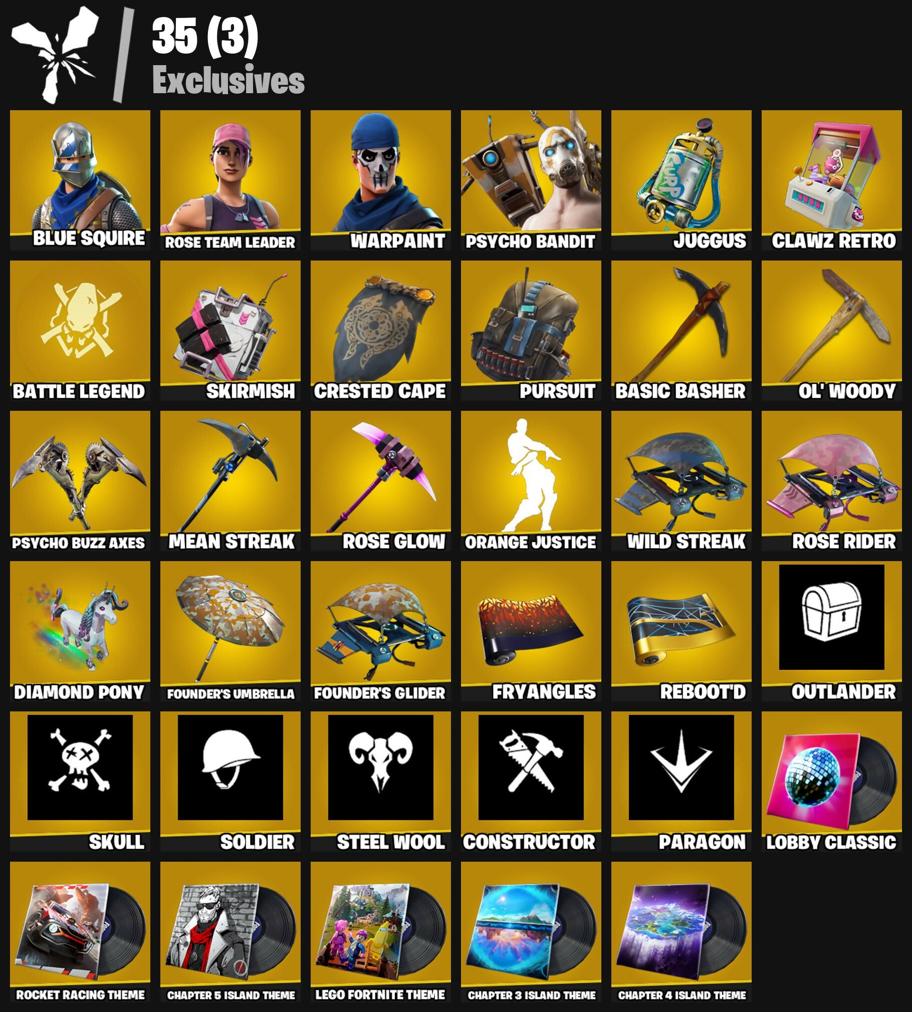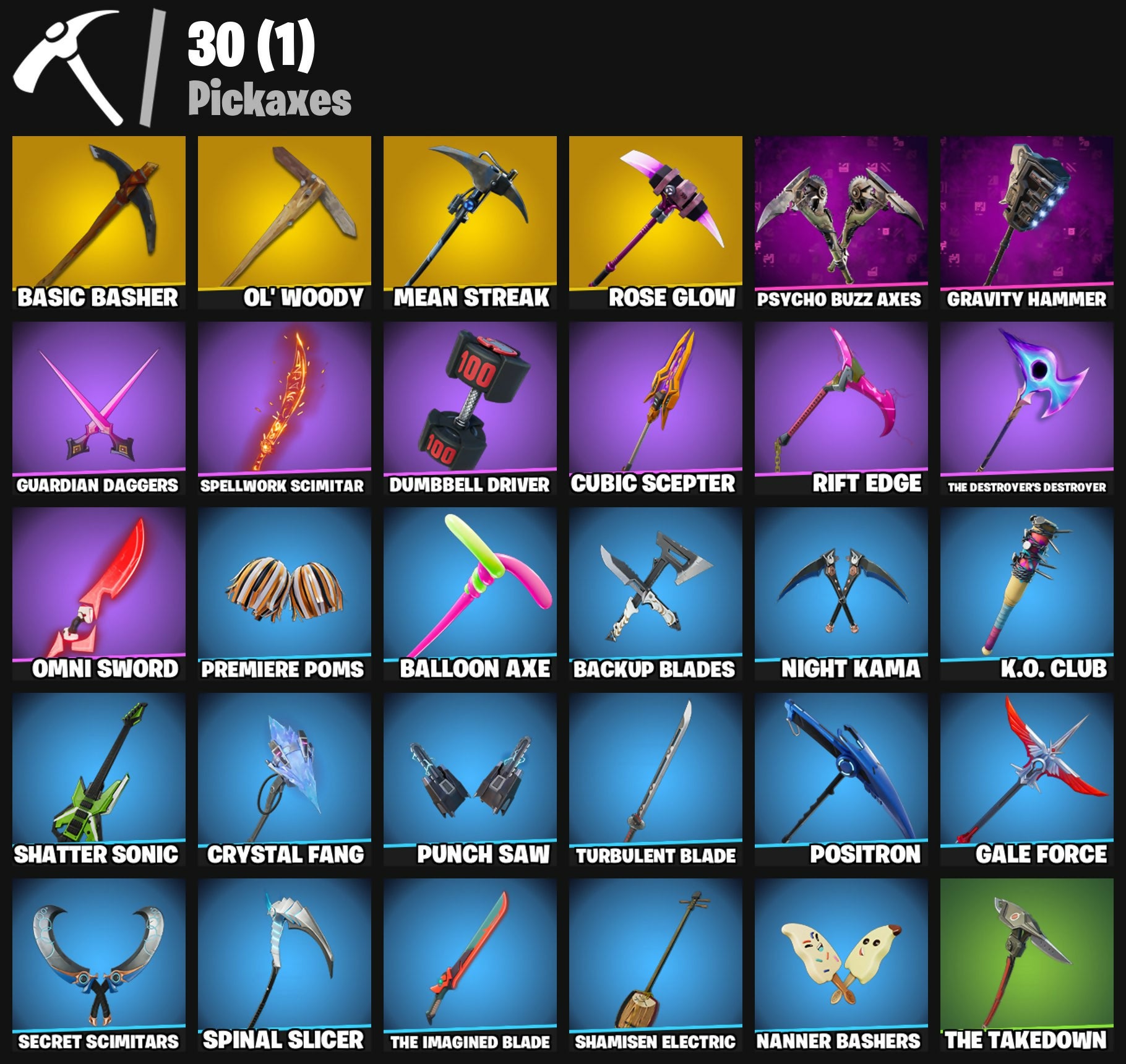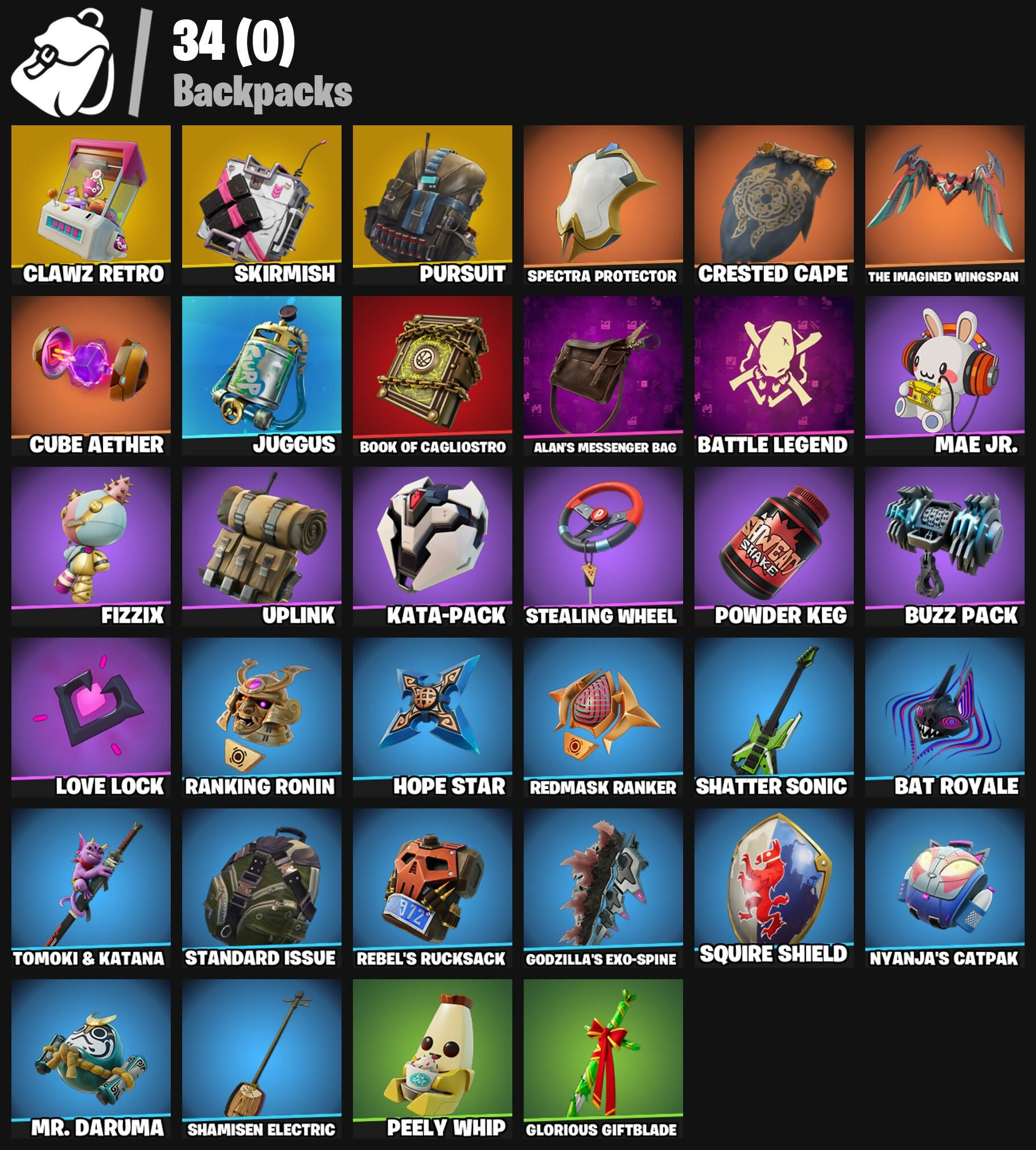 Alan Wake, Alan's Messenger Bag, Backup Blades, Balloon Axe, Basic Basher, Bat Royale, Battle Hound, Battle Legend, Battlehawk, Big Chuggus, Blue Squire, Book of Cagliostro, Buzz Pack, Carbide, Chapter 3 Island Theme, Chapter 4 Island Theme, Chapter 5 Island Theme, Clawz Retro, Conjure Weapon, Constructor, Crested Cape, Crowning Achievement, Crystal Fang, Cube Aether, Cubic Scepter, Cyclo Curl, Dagger Dance, Diamond Pony, Doctor Strange, Drift, Dumbbell Driver, Erisa, Fizzix, Founder's Glider, Founder's Umbrella, Fryangles, Gale Force, Gentleman's Dab, Glorious Giftblade, Godzilla's Exo-Spine, Gravity Hammer, Guardian Daggers, Gunnar, Holiday Boxy, Hope Star, Huntress, Jet Signals, Juggus, K.O. Club, Kata-Pack, Kiara K.O., Lego Fortnite Theme, Lil' Warthog, Lobby Classic, Love Lock, Mae Jr., Master Chief, Mean Streak, Mr. Daruma, Nanner Bashers, Night Kama, Nyanja's Catpak, Ol' Woody, Omni Sword, Orange Justice, Outlander, Paragon, Peely Whip, Popcorn, Positron, Powder Keg, Premiere Poms, Psycho Bandit, Psycho Buzz Axes, Punch Saw, Pursuit, Ranking Ronin, Rebel's Rucksack, Reboot'd, Redline, Redmask Ranker, Ride The Pony, Rift Edge, Rocket Racing Theme, Rose Glow, Rose Rider, Rose Team Leader, Secret Scimitars, Segway Tour, Shamisen Electric, Shatter Sonic, Skirmish, Skull, Soldier, Spectra Protector, Spellwork Scimitar, Spinal Slicer, Squire Shield, Standard Issue, Stealing Wheel, Steel Wool, Teknique, The Break, The Destroyer's Destroyer, The Imagined, The Imagined Blade, The Imagined Wingspan, The Origin, The Takedown, Tomoki & Katana, Tsuki 2.0, Turbulent Blade, Uplink, Warpaint, Wild Streak