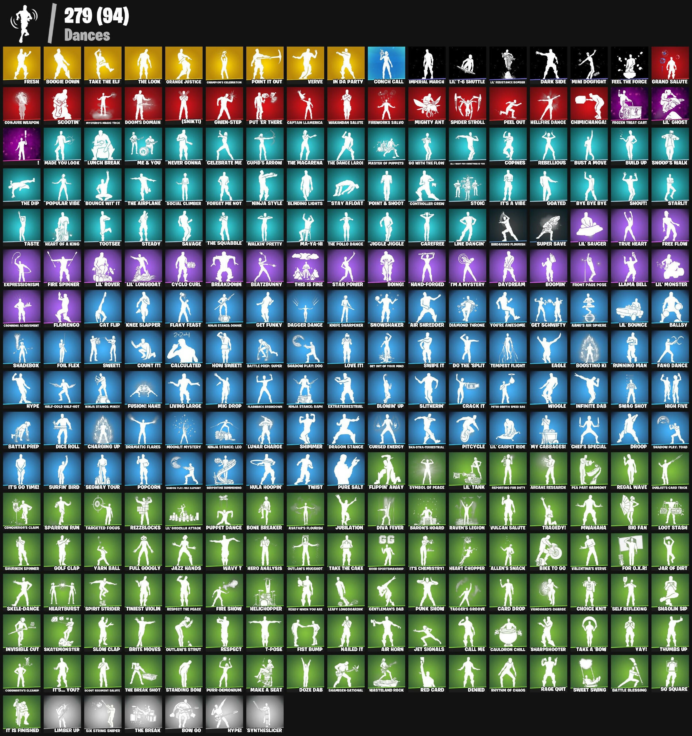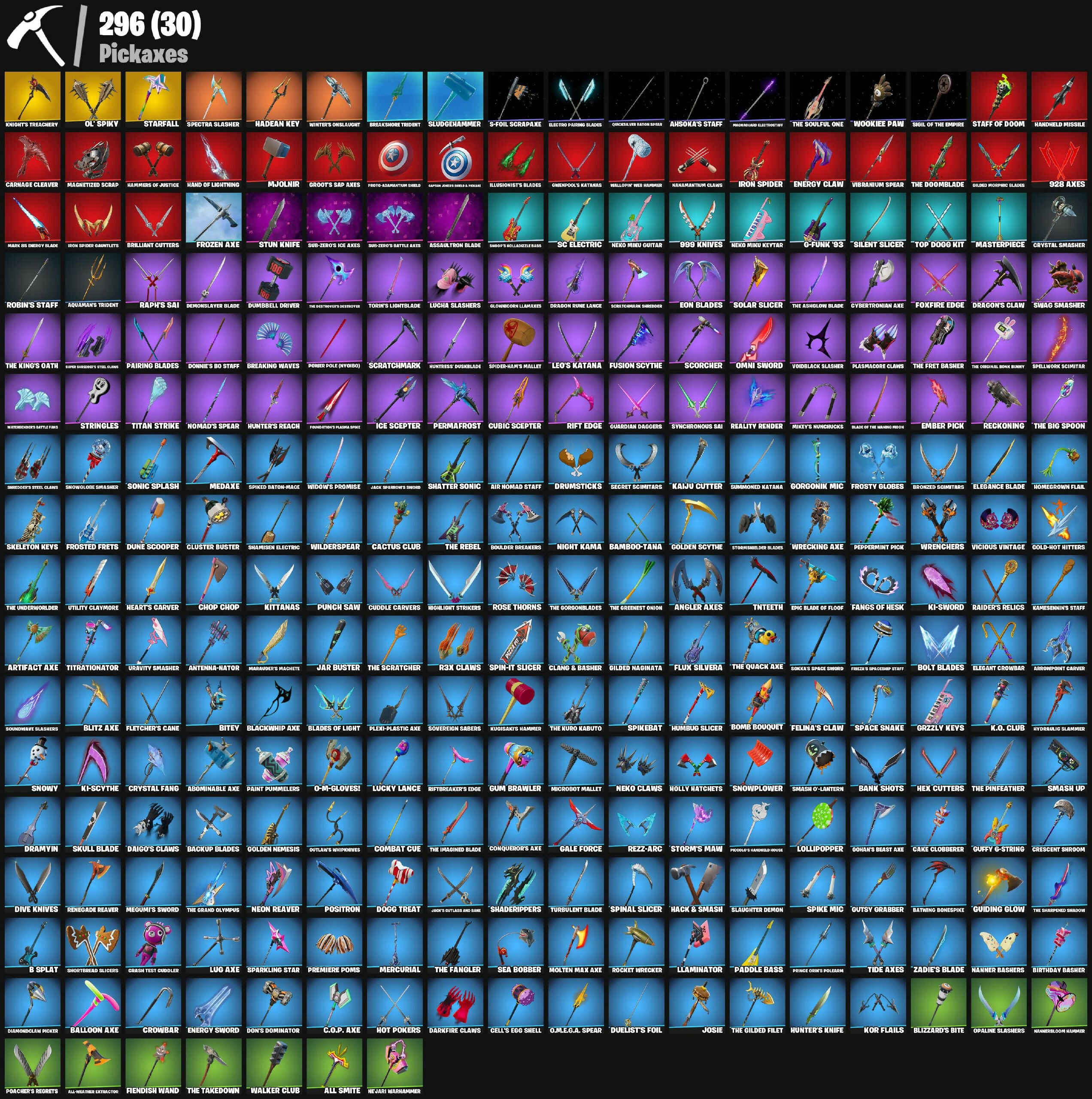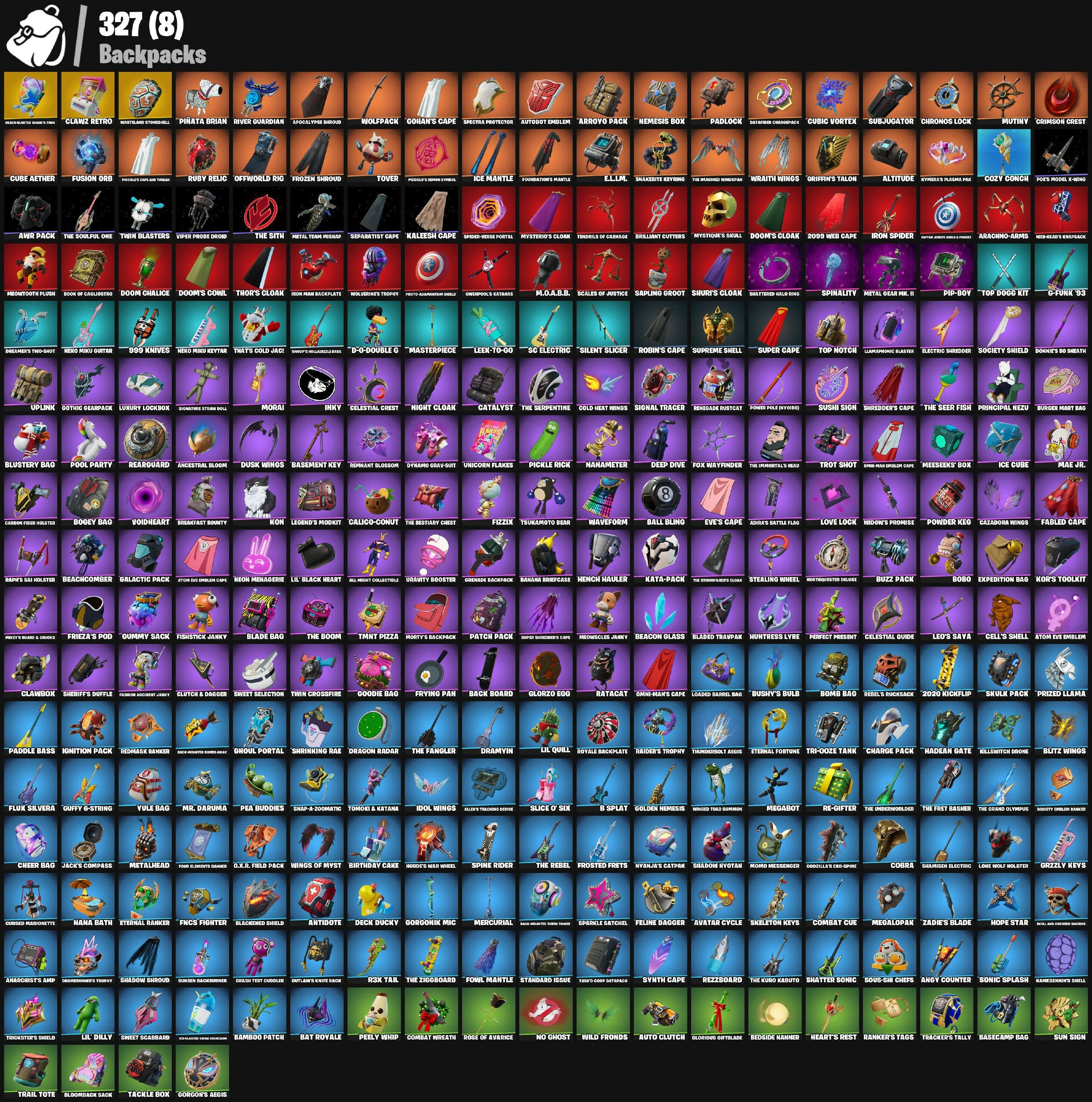 !, (Snikt!), 1-Ball, 2020 Kickflip, 2099 Web Cape, 8-Ball Vs Scratch, 928 Axes, 999 Knives, A.I.M., Aang, Aang's Air Sphere, Abominable Axe, Adira, Adira's Battle Flag, Aerial Assault Bomber, Afterparty, Agent Patch, Agent Peely, Ahsoka Tano, Ahsoka's Staff, Air Horn, Air Nomad Staff, Air Shredder, All I Want For Christmas Is You, All Might, All Might Collectible, All Smite, All-Weather Extractor, Allen The Alien, Allen's Snack, Altitude, Anarchist's Amp, Ancestral Bloom, Andy Fangerson, Angler Axes, Angry Counter, Antenna-Nator, Antidote, Antonia, Aphrodite, Apocalypse Shroud, Apprentice Evie, Aquaman, Aquaman's Trident, Arachno-Arms, Arcane Research, Arrowpoint Carver, Arroyo Pack, Artemis, Artifact Axe, Assaultron Blade, Astrea, Astroworld Cyclone, Atom Eve, Atom Eve Emblem, Atom Eve Emblem Cape, Auto Clutch, Autobot Emblem, Avatar Cycle, Avatar State Aang, Avatar's Flourish, Awir Pack, B Splat, Back Board, Backup Blades, Ball Bling, Balloon Axe, Ballsy, Bamboo Patch, Bamboo-Tana, Banana Briefcase, Bank Shots, Baron's Hoard, Basecamp Bag, Basement Key, Bat Royale, Battle Blessing, Battle Gamer Mae, Battle Prep, Battle Prep: Super, Battlehawk, Batwing Bonespike, Beach-Blasted Shark's Tank, Beachcomber, Beacon Glass, Beatzbunny, Bedside Manner, Beerus, Belly's Tracking Device, Big Dill, Big Fan, Bike To Go, Birdarang Flourish, Birthday Basher, Birthday Cake, Bitey, Blackened Shield, Blackheart, Blackwhip Axe, Blade Bag, Blade of the Waning Moon, Bladed Trapjaw, Blades of Light, Blinding Lights, Blitz Axe, Blitz Wings, Blizzard's Bite, Bloomback Sack, Blowin' Up, Blustery Bag, Bobo, Bogey Bag, Boing!, Bolt Blades, Bomb Bag, Bomb Bouquet, Bone Breaker, Bones, Boogie Down, Book of Cagliostro, Boomin', Boosting Ki, Boot It, Boulder Breakers, Bounce Wit It, Bow Go, Breakdown, Breakfast Bounty, Breaking Waves, Breakshore Trident, Brilliant Cutters, Brite Moves, Brite Raider, Bronzed Scimitars, Brutus, Build Up, Bulma, Burger Mart Bag, Burning Dragon, Bushy's Bulb, Bust A Move, Buzz Pack, Bye Bye Bye, C.O.P. Axe, Cactus Club, Cake Clobberer, Calamity, Calculated, Calico-Conut, Call Me, Cameo Vs Chic, Captain America, Captain America's Shield & Pickaxe, Captain America's Shield & Promise, Captain Jones, Captain Llamerica, Carbide, Carbon Fiber Holster, Card Drop, Carefree, Carmine Rosso, Carnage, Carnage Cleaver, Cassidy Quinn, Cat Flip, Catalyst, Cauldron Chill, Cazadora Wings, Cel's Shell, Celebrate Me, Celestial Crest, Celestial Guide, Cell, Cell's Egg Shell, Cerberus, Champion's Celebration, Chaos Director, Chapter 3 Island Theme, Chapter 4 Island Theme, Chapter 5 Island Theme, Charge Pack, Charging Up, Charlotte, Cheer Bag, Chef's Special, Chimichanga!, Choice Knit, Chop Chop, Chronos Lock, Clang & Basher, Clawbox, Clawz Retro, Cluster Buster, Clutch & Dagger, Cobra, Codsworth's Cleanup, Cold Heat Wings, Cold-Hot Hitters, Combat Cue, Combat Wreath, Conch Call, Conjure Weapon, Conqueror's Axe, Conqueror's Claim, Controller Crew, Copines, Count It!, Cozy Conch, Crack It, Crash Test Cuddler, Crescent Shroom, Crimson Crest, Crowbar, Crowning Achievement, Crystal Fang, Crystal Smasher, Cube Aether, Cubic Scepter, Cubic Vortex, Cuddle Carvers, Cuddle Hearts, Cuddle Team Specialist, Cupid's Arrow, Cursed Energy, Cursed Marionette, Cybertronian Axe, Cyclo Curl, D-O Double G, DJ Yonder, Dagger Dance, Daigo, Daigo's Claws, Dark Side, Darkfire Claws, Darth Vader, Datafiber Chainspark, Daydream, Deck Ducky, Deep Dive, Dela-State Skin Changer, Demon Slayer Blade, Denied, Diamond Throne, Diamondclaw Picker, Dice Roll, Dire, Diva Fever, Dive Knives, Do The 'Split, Doctor Doom, Doctor Strange, Dogg Treat, Don's Dominator, Donatello, Donnie's Bo Sheath, Donnie's Bo Staff, Doom, Doom Chalice, Doom's Cloak, Doom's Cowl, Doom's Domain, Doze Dab, Dragon Radar, Dragon Rune Lance, Dragon Stance, Dragon's Claw, Dramatic Flares, Dramvin, Dramyin, Dreamer's Two-Shot, Drift, DrogonDemon's Trophy, Droop, Drumsticks, Duelist's Card Trick, Duelist's Foil, Dumbbell Driver, Dune Scooper, Durrr Taisho, Dusk, Dusk Knight, Dusk Wings, Dynamo Grav-Suit, Dynamo Tntina, E.L.I.M., Eagle, Electric Shredder, Electro Pairing Blades, Elegance Blade, Elegant Crowbar, Ember Pick, Emma Frost, Energy Claw, Energy Sword, Enforcer, Eon Blades, Epic Blade of Floof, Era, Erisa, Eternal Fortune, Eternal Ranker, Eve's Cape, Evie, Expedition Bag, Expressionism, Extraterrestrial, FNCS Fighter, Fabio Sparklemane, Fable, Fabled Cape, Fade, Fang Dance, Fangs of Hesk, Fashion Accident Janky, Feel The Force, Felina, Felina's Claw, Feline Dagger, Fiendish Wand, Fire Show, Fire Spinner, Fireworks Salvo, Fish Thicc, Fishstick Janky, Fist Bump, Fizzix, Flaky Feast, Flamenco, Flashback Breakdown, Fletcher Kane, Fletcher's Cane, Flip Reset, Flippin' Away, Flux Silvera, Foil Flex, For O.X.R!, Forget Me Not, Forsaken Eye, Found-ation's Plasma Spear, Foundation's Mantle, Four Elements Banner, Fowl Mantle, Fox Wayfinder, Foxfire Edge, Free Flow, Fresh, Frieza, Frieza's Pod, Front Page Pose, Frosted Frets, Frosty Globes, Frozen Axe, Frozen Shroud, Frozen Treat Cart, Fryangles, Frying Pan, Full Googly, Fusion, Fusion Orb, Fusion Scythe, Fusion! Hah!, G-Funk '93, Galactic Pack, Gale Force, Gear Specialist Maya, General Grievous, Gentleman's Dab, Get Funky, Get Out Of Your Mind, Get Schwifty, Ghoul Portal, Giddy-Up, Gilded Morphic Blades, Gilded Naginata, Glorious Giftblade, Glorzo Egg, Glowndown Llamas, Go With The Flow, Goated, Godzilla Evolved, Godzilla's Exo-Spine, Gohan's Beast Axe, Gohan's Cape, Goku Black, Golden Nemesis, Golden Scythe, Golf Clap, Good Sportsmanship, Goodie Bag, Gorgonik Mic, Gorgonik's Aegis, Gothic Gearpack, Grand Salute, Grenade Backpack, Griffin's Talon, Grizzly Keys, Groot, Groot's Sap Axes, Guardian Daggers, Guffy G-String, Guggimon, Guiding Glow, Gum Brawler, Gumbo, Gummy Sack, Gunnar, Gutsy Grabber, Gwen-step, Gwenpool, Gwenpool's Katanas, Hack & Smash, Hadean Gate, Hadean Key, Hades, Half-Cold Half-Hot, Hammers of Justice, Hand o