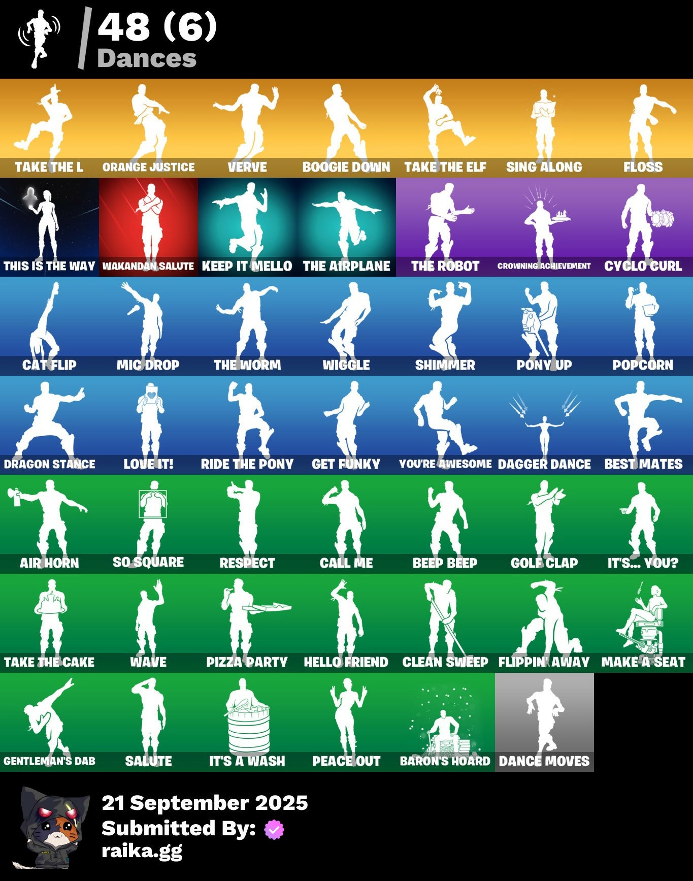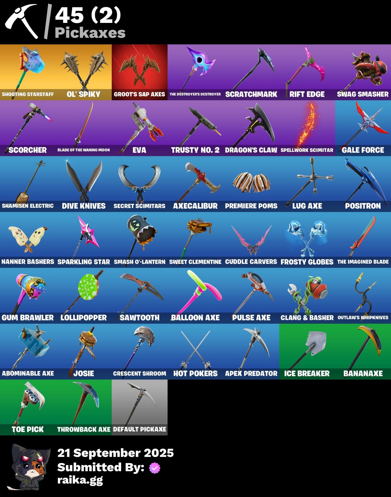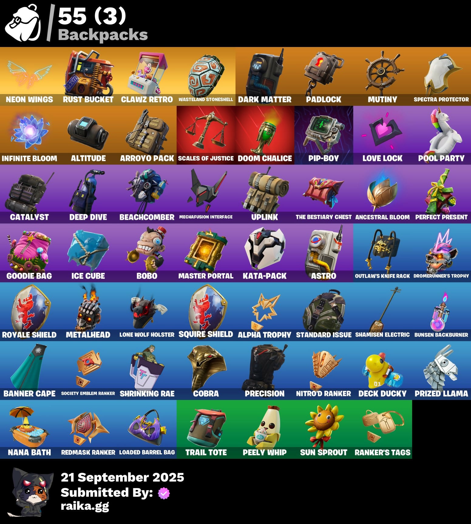 Abominable Axe, Air Horn, Alpha Trophy, Altitude, Ancestral Bloom, Apex Predator, Arroyo Pack, Astro, Axecalibur, Balloon Axe, Bananaxe, Banner Cape, Baron's Hoard, Battlehawk, Beach Umbrella, Beachcomber, Beep Beep, Best Mates, Blackheart, Blade Of The Waning Moon, Blue Squire, Bobo, Boogie Down, Bounty 'Brella, Bubbloon, Bullet Rider, Bunsen Backburner, Call Me, Carbide, Carbon, Cat Flip, Catalyst, Chemist's Cloudglider, Cinder, Clang & Basher, Classified, Clawz Retro, Clean Sweep, Cobra, Competitor's Time Brella, Conquest, Crescent Shroom, Crowning Achievement, Cruiser, Cuddle Carvers, Cyclo Curl, Dagger Dance, Dance Moves, Dark Charger, Dark Matter, Dark Voyager, Dealer's Deck, Deck Ducky, Deep Dive, Default, Default Pickaxe, Dive Knives, Doom Chalice, Downshift, Dragon Stance, Dragon's Claw, Drift, Drome Drifter, Dromerunner's Trophy, Elite Agent, Equalizer, Eva, Flapjack Flyer, Flippin' Away, Floss, Fortilla Flier, Frosty Globes, Gale Force, Gentleman's Dab, Get Down!, Get Funky, Glider, Glidurrr, Golf Clap, Goodie Bag, Groot's Sap Axes, Gum Brawler, Gunn-Brella, Hello Friend, High Octane, Holographic, Hot Pokers, Huntress, Hybrid, Ice Breaker, Ice Cube, Infinite Bloom, It's A Wash, It's... You?, Josie, K.O. Cruiser, Kata-Pack, Keep It Mello, Loaded Barrel Bag, Lollipopper, Lone Wolf Holster, Love It!, Love Lock, Lug Axe, Lynx, Make A Seat, Master Portal, Mechafusion Interface, Mega-Brella, Metalhead, Mic Drop, Mighty Marvel 'Brella, Mission Specialist, Moonwalker, Mutiny, Nana Bath, Nanner Bashers, Neon Man O' War, Neon Wings, Nexus War Glider, Nitro'd Ranker, Ol' Spiky, Orange Justice, Outlaw's Knife Rack, Outlaw's Whipknives, Padlock, Palm Leaf, Paper Parasol, Peace Out, Peely Whip, Perfect Present, Pip-Boy, Pizza Party, Pony Up, Pool Party, Popcorn, Positron, Powder, Precision, Premiere Poms, Prized Llama, Pulse Axe, Rainbow Rider, Ranker's Tags, Rebel Brella, Redline, Redmask Ranker, Respect, Ride The Pony, Rift Edge, Rogue Agent, Rox, Royale Air, Royale Knight, Royale Shield, Royale X, Rust Bucket, Rust Lord, Salute, Salvaged Chute, Sawtooth, Scales of Justice, Scorcher, Scratchmark, Secret Scimitars, Sentinel, Seven Signet, Sgt. Winter, Shamisen Electric, Shimmer, Shooting Starstaff, Shrinking Rae, Sidewinder, Sing Along, Sir Glider The Brave, Skellefish, Sky Serpents, Smash O'-Lantern, Snowfall, Snowflake, So Square, Society Emblem Ranker, Sparkle Specialist, Sparkling Star, Spectra Protector, Spellwork Scimitar, Squire Shield, Standard Issue, Star Strider, Sugar Crash, Summer Sail Shark, Sun Sprout, Swag Smasher, Sweet Clementine, Tactical Sleigh, Take The Cake, Take The Elf, Take The L, Teknique, The Airplane, The Bestiary Chest, The Destroyer's Destroyer, The Imagined Blade, The Mcg, The Prisoner, The Reaper, The Rezzbrella, The Robot, The Umbrella, The Worm, This Is The Way, Throwback Axe, Time Brella, Toe Pick, Trail Tote, Trog, Trusty No. 2, Uplink, Verve, Wakandan Salute, Wasteland Stoneshell, Wave, Wet Paint, Wiggle, Wings Of Valor, You're Awesome, Zenith, Zoey