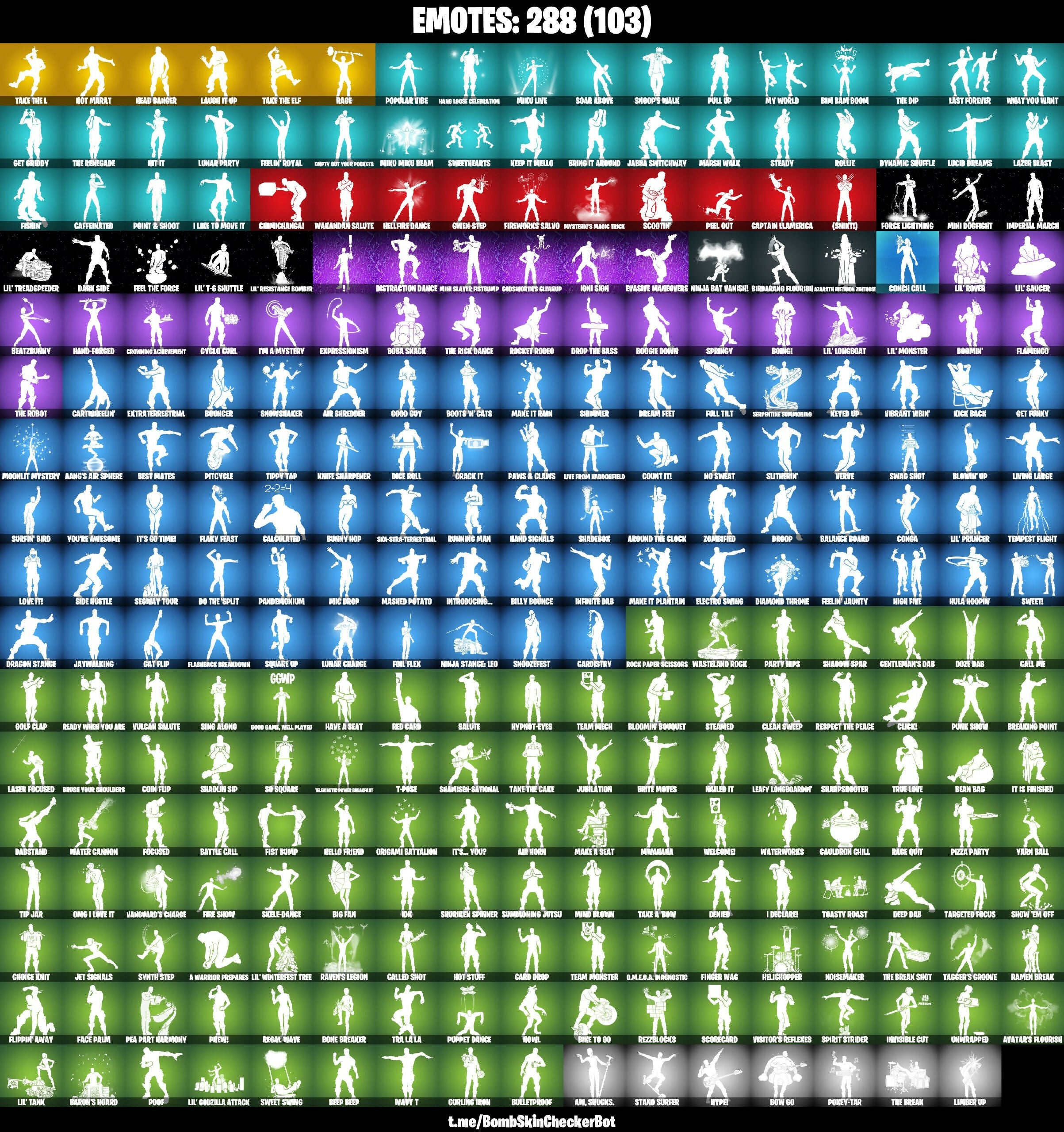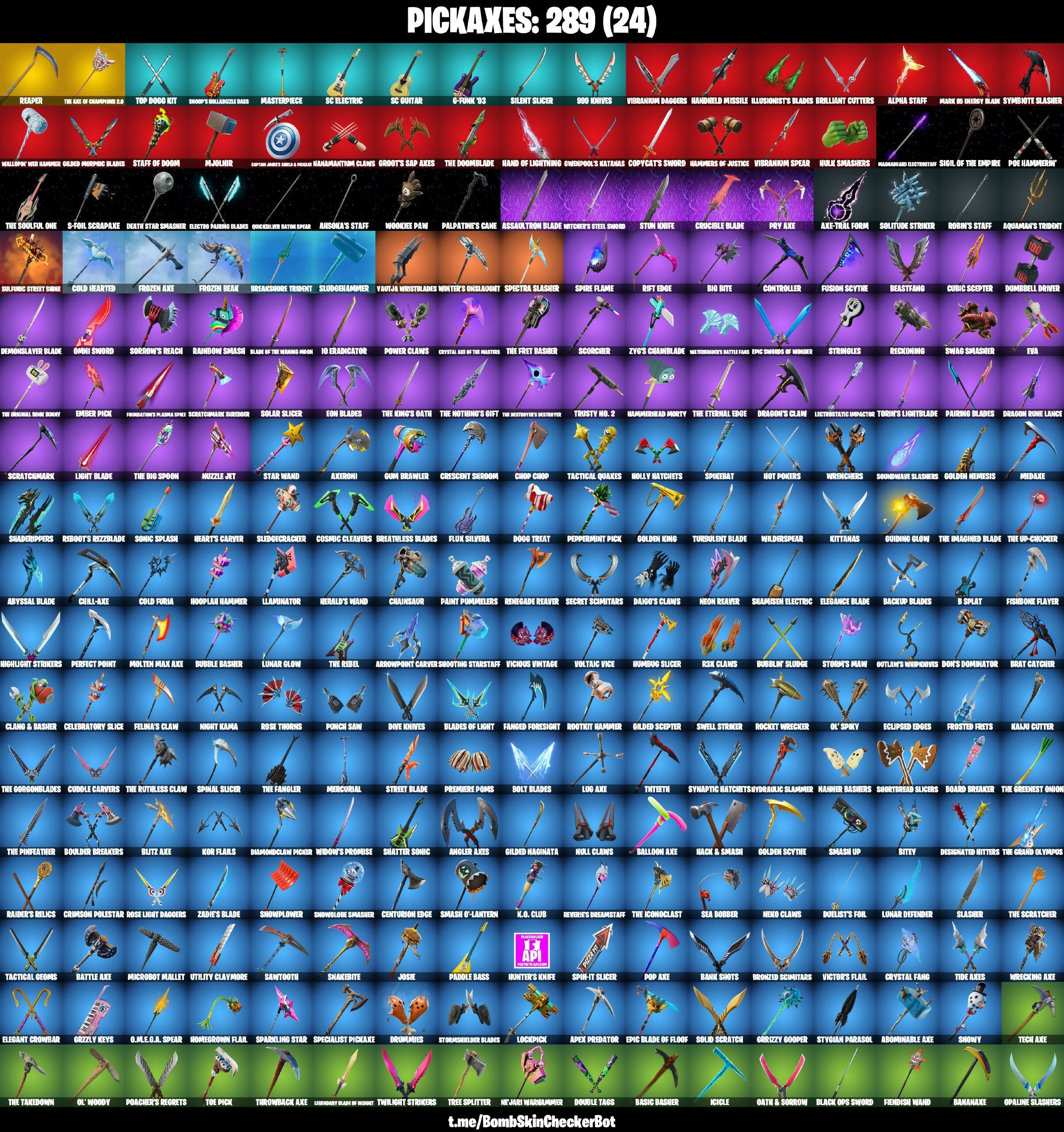 'Brella, (Snikti), 8-Ball vs Scratch, 999 Knives, A Warrior Prepares, Aang, Aang's Air Sphere, Abominable Axe, Absenz, Abyssal Blade, Adira, Aerial Acrobat, Aerial Assault Bomber, Agent Jones, Agent Peely, Ahsoka's Staff, Air Horn, Air Shredder, Alim, Alpha Staff, Andy Fangersson, Angler Axes, Antonia, Apex Predator, Aphrodite, Apprentice Evie, Aquaman, Aquaman's Trident, Arcane Energy Glider, Arctic Adeline, Arctic Assassin, Around The Clock, Arrowpoint Carver, Artemis, Articulated Blade Wing, Assaultron Blade, Astro Jack, Astroworld Cyclone, Aura, Avatar's Flourish, Aw, Shucks., Axe-Trail Form, Axeroni, Ayla Wynn, Azareth Meteoroid Zenthos, B Splat, Backup Blades, Balance Board, Balloon Axe, Banana Bomber, Bananaxe, Bank Shots, Baron's Hoard, Base Jumper, Basic Basher, Battle Axe, Battle Bloom, Battle Call, Baymax Wings, Bean Bag, Beastfang, Beatzbunny, Beep Beep, Best Mates, Bezruss, Big Bite, Big Fan, Big Haul, Bike To Go, Billy Bounce, Bim Bam Boom, Birdarang Flourish, Bitey, Black Manta, Black One X-Wing, Black Ops Sword, Black Panther, Blackheart, Blade of the Waning Moon, Blades of Light, Blitz 'Brella, Blitz Axe, Blitz Knight, Bloomin' Bouquet, Blowin Up, Blue Striker, Blue Viper, Board Breaker, Boba Snack, Boing!, Bolt Blades, Bombs Away!, Bone Breaker, Bone Patrol, Boogie Down, Boomin', Boots 'N Cats, Boulder Breakers, Bouncer, Bounty 'Brella, Bow Go, Brat Catcher, Breaking Point, Breakshore Trident, Breathless Blades, Brella, Brilliant Cutters, Bring It Around, Brite Blimp, Brite Bomber, Brite Gunner, Brite Moves, Brite Raider, Bronzed Scimitars, Brush Your Shoulders, Brutus (Fully Golden), Bubble Basher, Bubblin' Sludge, Bubloon, Bullet Rider, Bulletproof, Bundles, Bunny Hop, Bytes, Cacodemon, Caffeinated, Calamity, Calculated, Call Me, Called Shot, Cameo vs Chic, Captain Clamerica, Captain Jones, Captain Marvel, Captain Phasma, Captain's Glider, Carbon, Carbon Commando, Card Drop, Cardistry, Cartwheelin', Castor, Cat Flip, Catalyst, Cauldron Chill, Cazadora, Celebratory Slice, Centurion, Centurion Edge, Cerberus, Chain Surfer, Chainsaur, Charlotte, Cheer Bolt, Chemist's Cloudglider, Chill-Axe, Chimichanga!, Choice Knit, Chop Chop, Chop Dropper, Chromebrella, Chromestruck Fire, Cinder, Clang & Basher, Classified, Clean Sweep, Click!, Cliffside Soarer, Cloud Llama Board, Cloud Striker, Cluck, Coin Flip, Cold Front, Cold Furia, Cold Hearted, Cometbrella, Comfy Cats, Commander's Descent, Competitor's Time Brella, Conch Call, Conga, Conquest, Controller, Convergence, Copycat's Sword, Cosmic Cleavers, Cosmoworlds Cleanup, Count It!, Covered Crusader, Crack It, Crazy Eight, Crescent Shroom, Crimson Polestar, Crimson Wish, Crossfire, Crowning Achievement, Crucible Blade, Cruiser, Crystal Fang, Cubic Scepter, Cuddle Carvers, Cuddlepool, Cuddly Cloudcruiser, Curling Iron, Cyclo Curl, DJ Yonder, Dabstand, Daigo, Daigo's Claws, Dark Charger, Dark Doggo, Dark Side, Dark Voyager, Darth Vader, Deadpool, Dealer's Deck, Death Star, Death Star Smasher, Deep Dab, Deimos, Demonslayer Blade, Denied, Designated Hitters, Diamond Throne, Diamondclaw Picker, Dice Roll, Die With A Smile Bruno, Dire, Distraction Dance, Dive Knives, Do The Split, Doctor Doom, Doctor Slone, Dogg Treat, Dom's Dominator, Doom, Doom Brella, Doom Slayer, Double Tags, Downpour, Downshift, Doze Dab, Dragon Rider, Dragon Rune Lance, Dragon Stance, Dragon's Claw, Dragonheart 'Brella, Dream Feet, Drift (Stage 5), Drone Drifter, Droop, Drop The Bass, DrumMies, Duelist's Foil, Dumbbell Driver, Durrr Taisho, Dusk, Dusty, Dynamic Shuffle, Eagle's Form, Eclipse Brella, Eclipsed Edges, Eggar, Electro Pairing Blades, Electro Swing, Electrostatic Impactor, Elegance Blade, Elegant Crowbar, Elite Agent, Elite Servo, Ember Pick, Emma Frost, Emperor Palpatine, Empty Out Your Pockets, Enchanted Lifebloom, Eon Blades, Epic Blade of Floof, Epic Swords of Wonder, Equalizer, Eva, Evasive Maneuvers, Everything's End, Evie, Expressionism, Extraterrestrial, Fabio Sparklemane, Fable, Face Palm, Fade, Fanged Foresight, Feel The Force, Feelin' Jaunty, Feelin' Royal, Felina, Felina's Claw, Fiendish Wand, Finger Wag, Fire Show, Fireworks Salvo, First Order Stormtrooper, Fish Thicc, Fishbone Flayer, Fishin', Fishstick, Fishy Flier, Fist Bump, Fist of Doom, Fixer, Flaky Feast, Flamenco, Flapjack Flyer, Flappy, Flashback Breakdown, Flavor-Dusted Spacelungs, Flight Risk, Flip Flyer, Flippin' Away, Flux Silvera, Focused, Foil Flex, Force Lightning, Fortilla Flier, Foundation's Plasma Spike, Foundational 'Brella, Frequency Flyer, Frostbite, Frostburn, Frosted Frets, Frozen Axe, Frozen Beak, Frozen Feathers, Frozen Love Ranger, Frozen Raven, Frozen Red Knight, Full Tilt, Fusion, Fusion Coil, Fusion Scythe, G-Funk '93, Gathering Storm, Gear Specialist Maya, General Grievous, Gentleman's Dab, Geralt of Rivia, Get Funky, Get Griddy, Ghoul Trooper, Giddy-Up, Gilded Morpic Blades, Gilded Naginata, Gilded Scepter, Glider, Glidurr, Globe Shaker, Godzilla Evolved, Golden King, Golden Nemesis, Golden Scythe, Golf Clap, Good Game, Well Played, Good Guy, Gothic Shadesoarer, Grand Glacier Glider, Grizzly Gooper, Grizzly Keys, Groot, Groot's Sap Axes, Grriz, Guggimon, Guiding Glow, Gum Brawler, Gumbo, Gunn-Brella, Gunnar, Gwen-Step, Gwendpool's Katanas, Gwenpool, Hack & Smash, Hammerhead Morty, Hammers of Justice, Hand Signals, Hand of Lightning, Hand-Forged, Handheld Missile, Hang Loose Celebration, Harlowe, Hatsune Miku, Have A Seat, Haven, Haxsaur, Haylee Skye, Head Banger, Heart's Carver, Heartspan, Heartwinder, Heist Flier, Helichopper, Hellfire Dance, Hello Friend, Helsie, Herald's Wand, Hero Baymax, High Five, High Society Glider, Highlight Strikers, Hit It, Holiday Boxy, Holly Hatchets, Hombug Slicer, Homegrown Flail, Hooplah Hammer, Hope, Horizon Rider, Hot Marat, Hot Pokers, Hot Slurp Balloon, Hot Stuff, Howl, Hula Hoopin', Hulk Smashers, Hunter's Knife, Hunter's Skyblade, Huntress, Hybrid, Hydraulic Slammer, Hype!, Hyperboard, Hypnot-Eyes, I Declare!, I Like To