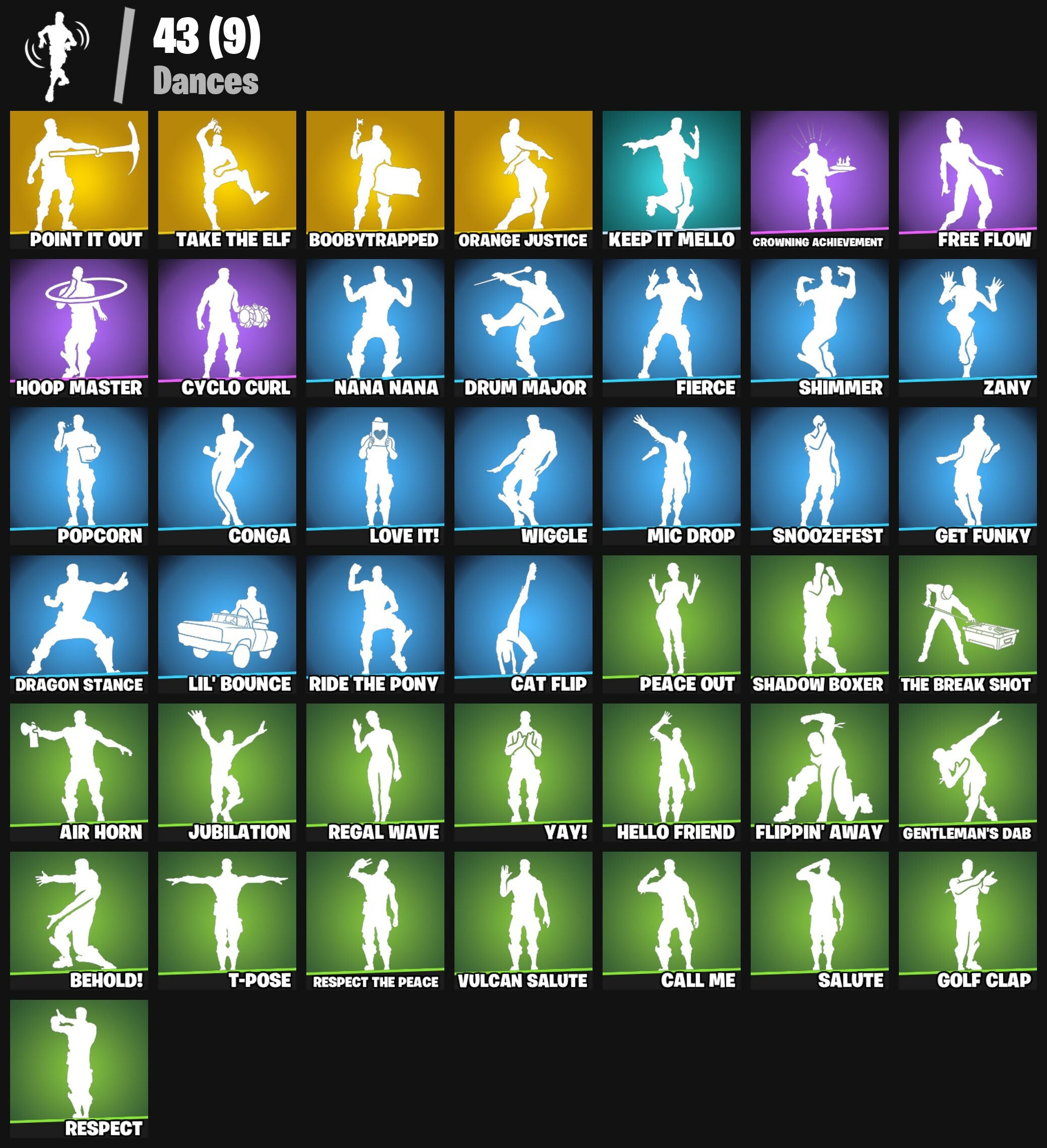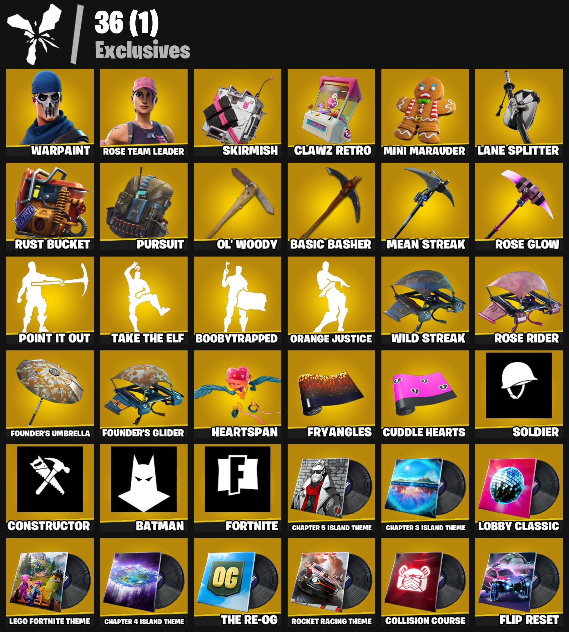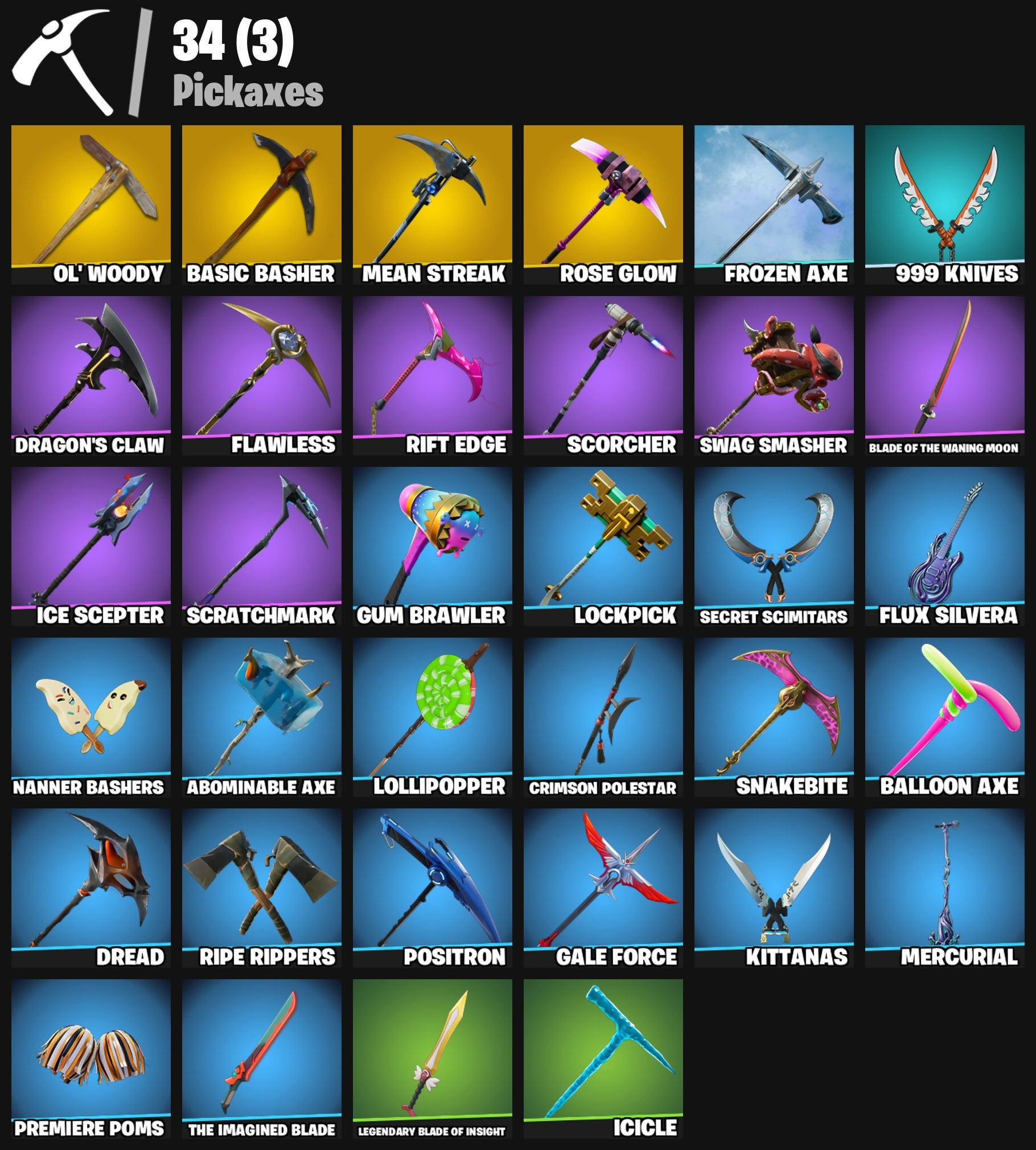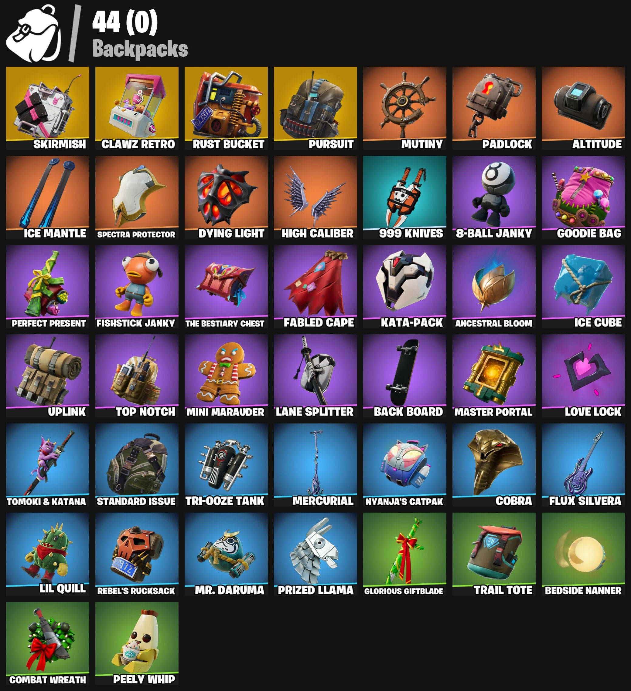 8-Ball Janky, 999 Knives, Abominable Axe, Air Horn, Altitude, Ancestral Bloom, Back Board, Balloon Axe, Basic Basher, Batman, Battlehawk, Bedside Nanner, Behold!, Blackheart, Blade Of The Waning Moon, Boobytrapped, Call Me, Carbide, Cat Flip, Chapter 3 Island Theme, Chapter 4 Island Theme, Chapter 5 Island Theme, Clawz Retro, Cobra, Collision Course, Combat Wreath, Conga, Constructor, Crimson Polestar, Crowning Achievement, Cuddle Hearts, Cyclo Curl, Dragon Stance, Dragon's Claw, Dread, Drift, Drum Major, Dusk Knight, Dying Light, Ember, Fabled Cape, Fierce, Fishstick Janky, Flawless, Flip Reset, Flippin' Away, Flux Silvera, Fortnite, Founder's Glider, Founder's Umbrella, Free Flow, Frozen Axe, Fryangles, Gale Force, Gentleman's Dab, Get Funky, Glorious Giftblade, Golf Clap, Goodie Bag, Gum Brawler, Heartspan, Hello Friend, High Caliber, Holiday Boxy, Hoop Master, Huntress, Hybrid, Ice Cube, Ice Mantle, Ice Scepter, Icicle, Jubilation, Kata-Pack, Keep It Mello, Kittanas, Lane Splitter, Legendary Blade Of Insight, Lego Fortnite Theme, Lil Quill, Lil' Bounce, Lobby Classic, Lockpick, Lollipopper, Love It!, Love Lock, Luxe, Lynx, Master Key, Master Portal, Mean Streak, Mercurial, Merry Marauder, Mic Drop, Mini Marauder, Mr. Daruma, Mutiny, Nana Nana, Nanner Bashers, Nyanja's Catpak, Ol' Woody, Onesie, Orange Justice, Overtaker, Padlock, Peace Out, Peely, Peely Whip, Perfect Present, Point It Out, Poised Playmaker, Popcorn, Positron, Powder, Premiere Poms, Prized Llama, Pursuit, Rebel's Rucksack, Redline, Regal Wave, Respect, Respect The Peace, Ride The Pony, Rift Edge, Ripe Rippers, Rocket Racing Theme, Rose Glow, Rose Rider, Rose Team Leader, Rox, Ruin, Rust Bucket, Salute, Scorcher, Scratchmark, Secret Scimitars, Sentinel, Sgt. Winter, Shadow Boxer, Shimmer, Sidewinder, Skirmish, Slayer Juice Wrld, Snakebite, Snoozefest, Soldier, Spectra Protector, Standard Issue, Summit Striker, Swag Smasher, T-Pose, Take The Elf, Teknique, The Bestiary Chest, The Break Shot, The Ice King, The Imagined Blade, The Prisoner, The Re-Og, Tomoki & Katana, Top Notch, Trail Tote, Tri-Ooze Tank, Trog, Uplink, Vulcan Salute, Warpaint, Wiggle, Wild Streak, Winterfest Bushranger, Yay!, Zany, Zenith, Zoey