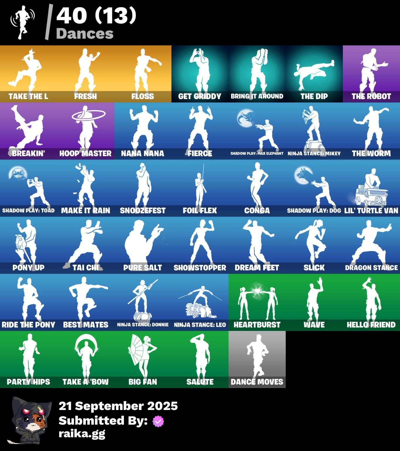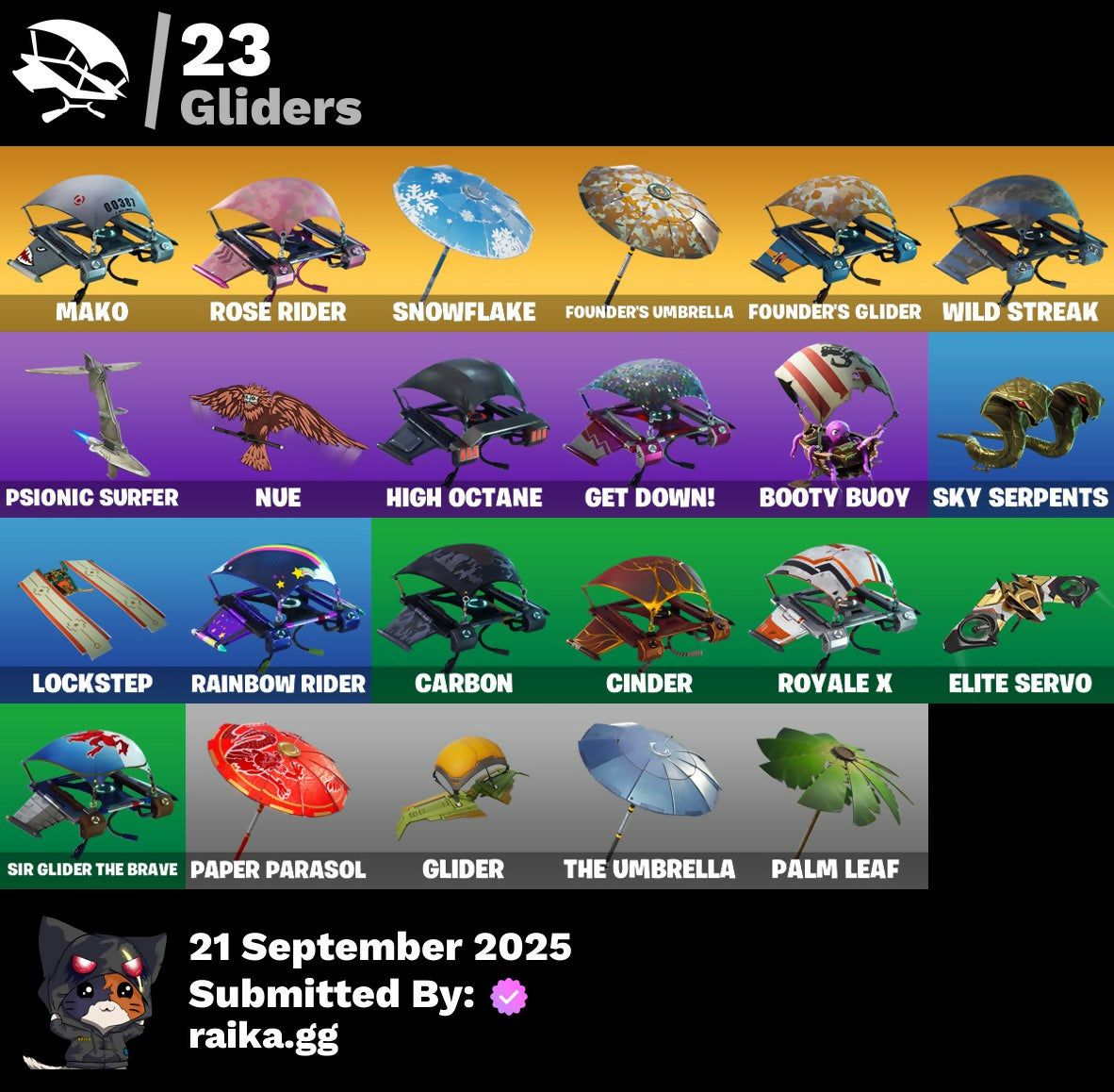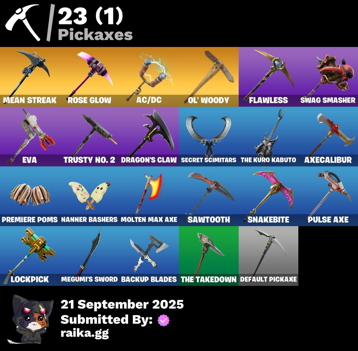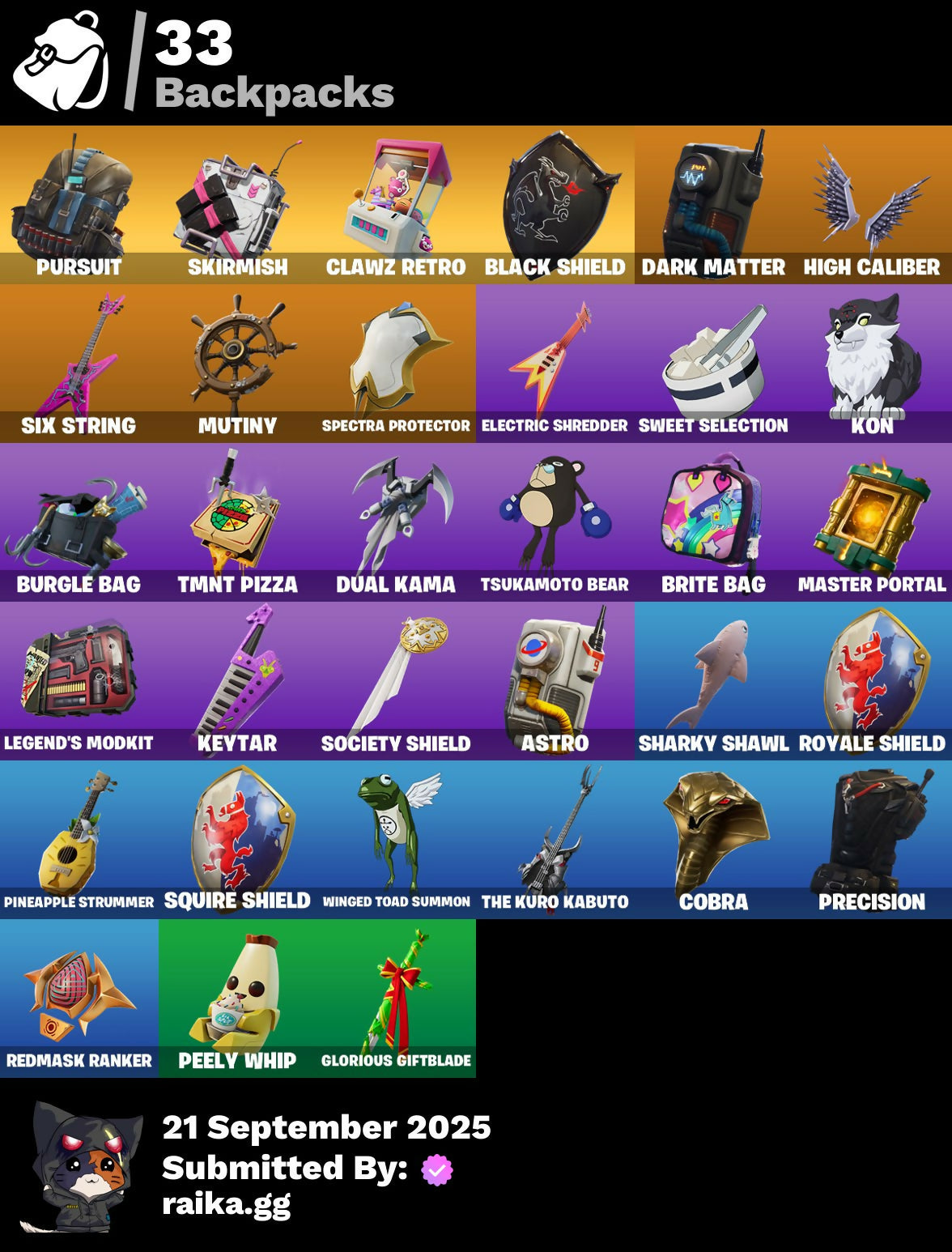 AC/DC, Astro, Axecalibur, Backup Blades, Best Mates, Big Fan, Black Knight, Black Shield, Blackheart, Blue Squire, Booty Buoy, Breakin', Bring It Around, Brite Bag, Brite Gunner, Burgle Bag, Carbon, Cinder, Clawz Retro, Cobra, Conga, Cozy Chomps, Dance Moves, Dark Matter, Dark Voyager, Dazzle, Default, Default Pickaxe, Dragon Stance, Dragon's Claw, Dream Feet, Dual Kama, EVA, Electric Shredder, Elite Agent, Elite Servo, Ember, FNCS Renegade, Fierce, Finesse Finisher, Flawless, Floss, Foil Flex, Founder's Glider, Founder's Umbrella, Fresh, Get Down!, Get Griddy, Glider, Glorious Giftblade, Heartburst, Hello Friend, High Caliber, High Octane, Holiday Boxy, Hoop Master, Hybrid, Keytar, Kon, Kuno, Laguna, Legend's Modkit, Lil' Turtle Van, Lockpick, Lockstep, Luxe, Make It Rain, Mako, Marius, Master Key, Master Portal, Mean Streak, Megumi Fushiguro, Megumi's Sword, Mission Specialist, Molten Max Axe, Moonwalker, Mutiny, Nana Nana, Nanner Bashers, Ninja Stance: Donnie, Ninja Stance: Leo, Ninja Stance: Mikey, Nue, Ol' Woody, Palm Leaf, Paper Parasol, Party Hips, Peely, Peely Whip, Pineapple Strummer, Pony Up, Power Chord, Precision, Premiere Poms, Psionic Surfer, Pulse Axe, Pure Salt, Pursuit, Rainbow Rider, Rapscallion, Redmask Ranker, Ride The Pony, Rose Glow, Rose Rider, Rose Team Leader, Royale Knight, Royale Shield, Royale X, Rust Lord, Salute, Satoru Gojo, Sawtooth, Scarlet Defender, Secret Scimitars, Shadow Play: Dog, Shadow Play: Max Elephant, Shadow Play: Toad, Sharky Shawl, Showstopper, Sidewinder, Sir Glider The Brave, Six String, Skirmish, Sky Serpents, Slick, Snakebite, Snoozefest, Snowflake, Society Shield, Sparkle Specialist, Spectra Protector, Squire Shield, Streetwear Yuji Itadori, Survival Specialist, Swag Smasher, Sweet Selection, Synth Star, TMNT Pizza, Tai Chi, Take A 'Bow, Take The L, The Dip, The Kuro Kabuto, The Reaper, The Robot, The Takedown, The Umbrella, The Worm, Triple Threat, Trusty No. 2, Tsukamoto Bear, Warpaint, Wave, Wild Streak, Winged Toad Summon, Yuji Itadori