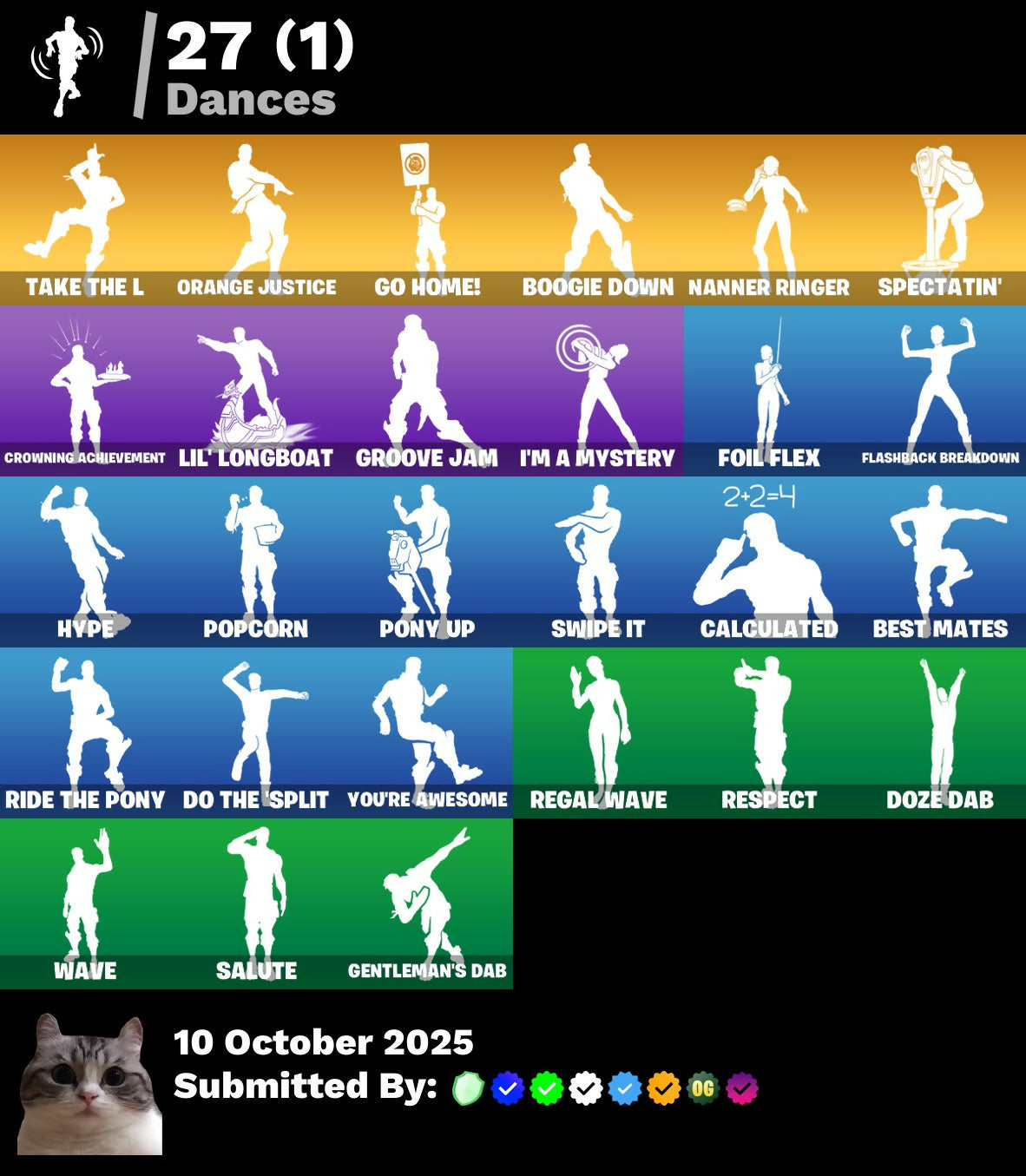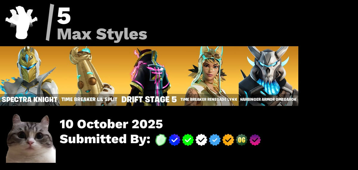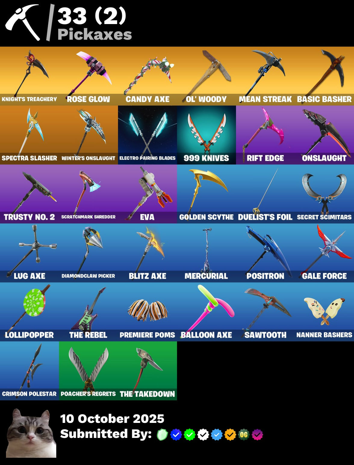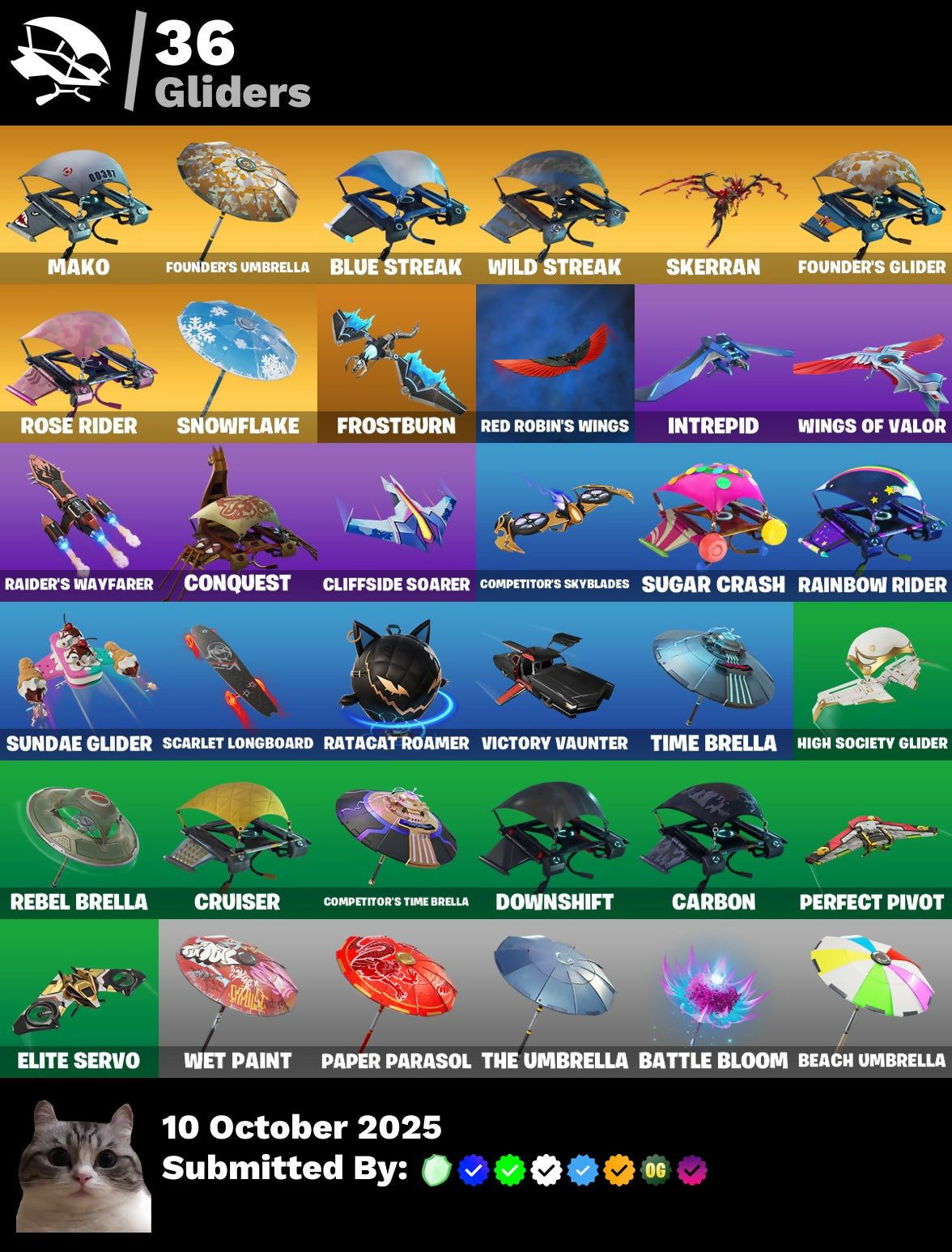 999 Knives, Balloon Axe, Basic Basher, Battle Bloom, Battlehawk, Beach Umbrella, Best Mates, Blitz Axe, Blue Streak, Blue Team Leader, Boogie Down, Calculated, Candy Axe, Carbide, Carbon, Cliffside Soarer, Competitor's Skyblades, Competitor's Time Brella, Conquest, Crimson Polestar, Crowning Achievement, Cruiser, Dark Bomber, Dark Voyager, Diamondclaw Picker, Do The Split, Downshift, Doze Dab, Drift, Drift Stage 5, Duelist's Foil, EVA, Electro Pairing Blades, Elite Servo, Flashback Breakdown, Foil Flex, Founder's Glider, Founder's Umbrella, Frostburn, Gale Force, Gentleman's Dab, Go Home!, Golden Scythe, Groove Jam, Harbinger Armor Omegarok, High Society Glider, Holiday Boxy, Hope, Huntress, Hype, I'm A Mystery, Intrepid, Journey Vs Hazard, Knight's Treachery, Lil Split, Lil' Longboat, Lollipopper, Lug Axe, Mako, Mean Streak, Mercurial, Mission Specialist, Montague, Moonwalker, Nanner Bashers, Nanner Ringer, Nisha, Ol' Woody, Omega, Omegarok, Onslaught, Orange Justice, Oscar, Paper Parasol, Perfect Pivot, Poacher's Regrets, Pony Up, Popcorn, Positron, Premiere Poms, Raider's Wayfarer, Rainbow Rider, Ratacat Roamer, Rebel Brella, Rebirth Harley Quinn, Red Robin's Wings, Redline, Regal Wave, Renegade Lynx, Respect, Ride The Pony, Rift Edge, Rogue Agent, Rose Glow, Rose Rider, Rose Team Leader, Runway Racer, Rust Lord, Salute, Sawtooth, Scarlet Longboard, Scratchmark Shredder, Secret Scimitars, Skerran, Slayer Juice Wrld, Snowflake, Spectatin', Spectra Knight, Spectra Slasher, Squad Leader, Sugar Crash, Sun Strider, Sundae Glider, Swipe It, Take The L, Teknique, The Rebel, The Takedown, The Umbrella, The Visitor, Time Breaker Lil Split, Time Breaker Renegade Lynx, Time Brella, Toy Trooper, Trusty No. 2, Turk Vs Riptide, Valor, Vengeance Jones, Victory Vaunter, Warpaint, Wave, Wet Paint, Wild Streak, Wings of Valor, Winter's Onslaught, You're Awesome, Zoey