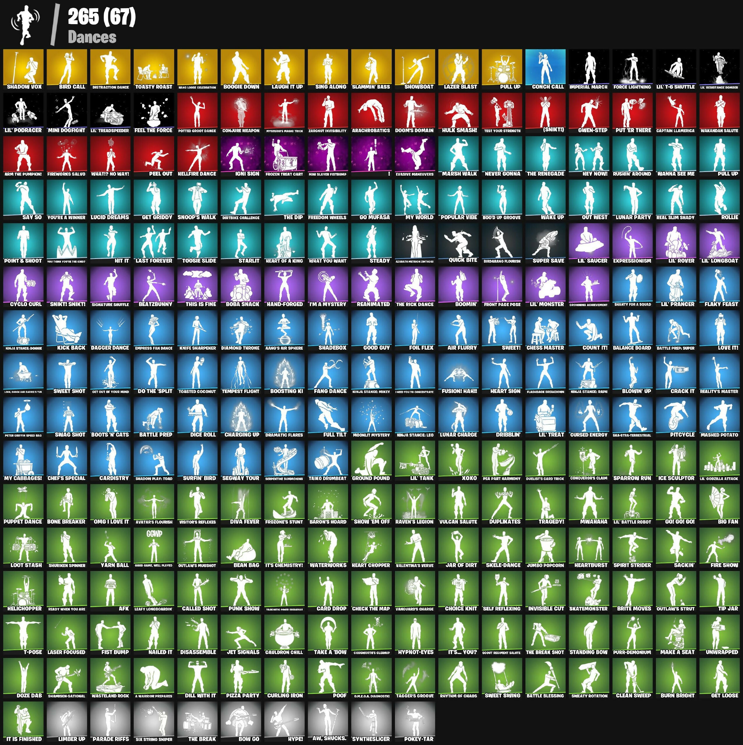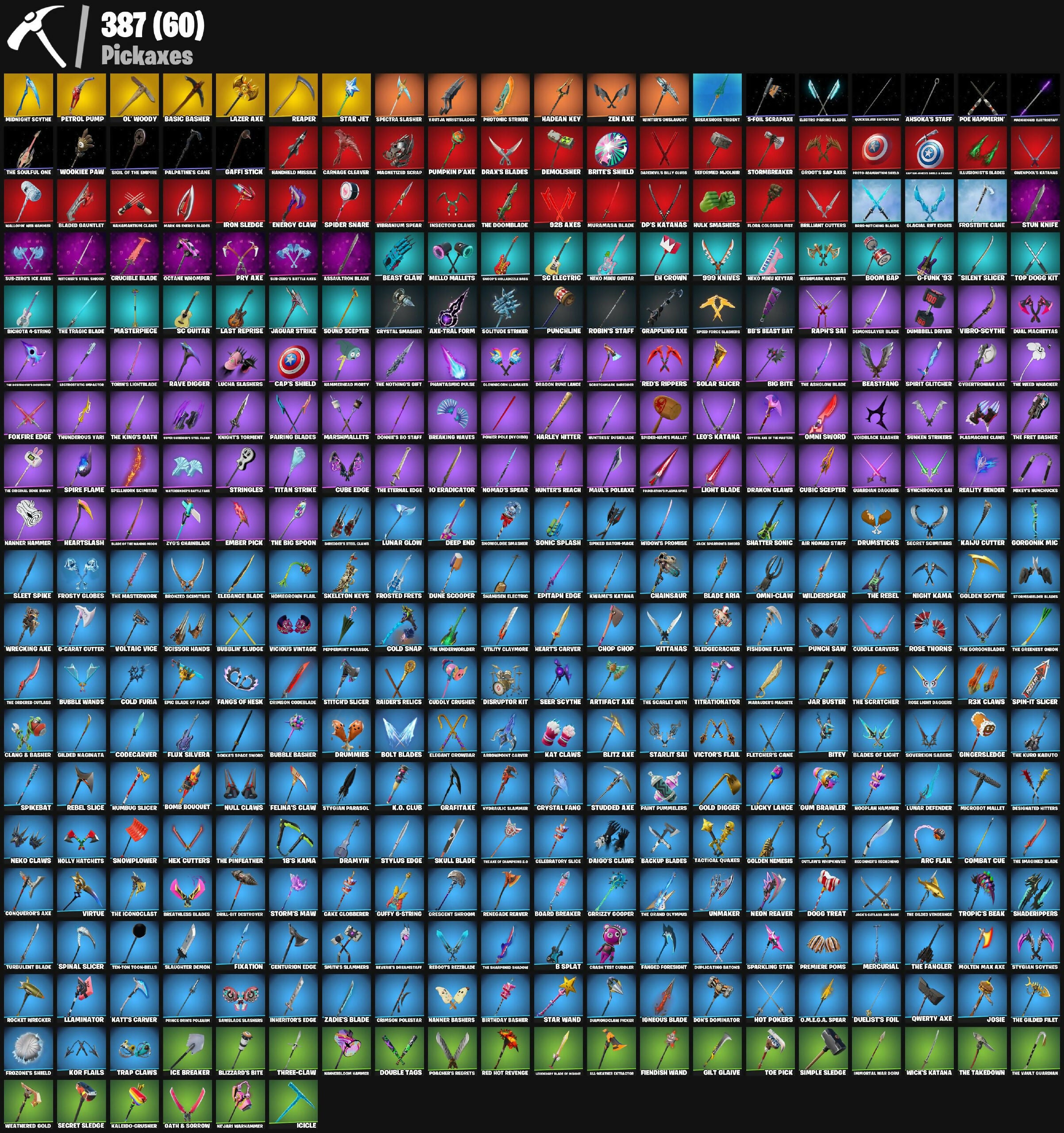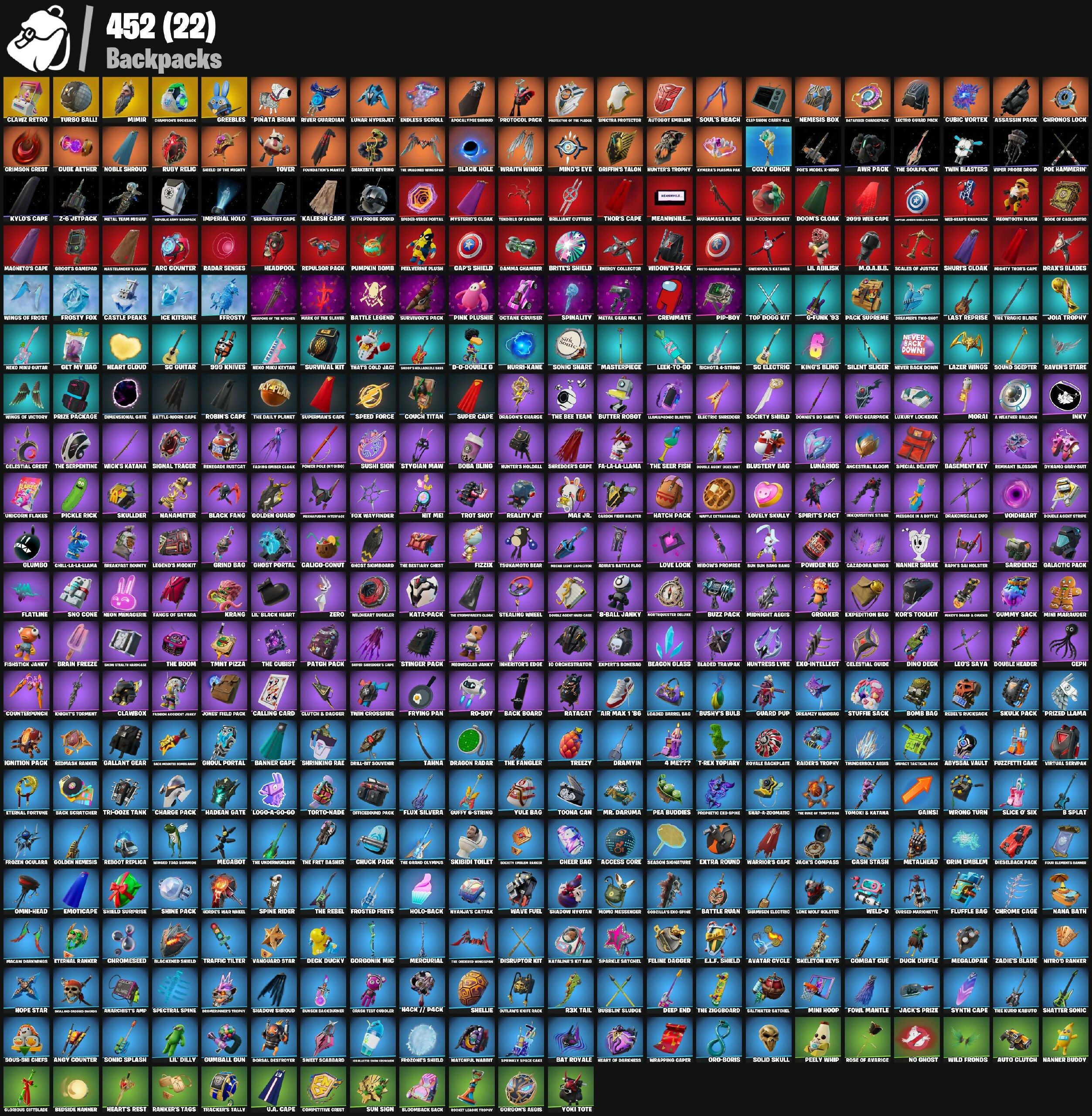 (Snikt!), 1-Ball, 183's Kama, 2099 Web Cape, 4 Mefff, 5-Foil Scrapaxe, 8-Ball Janky, 928 Axes, 999 Knives, A Warrior Prepares, A Weather Balloon, AFK, AWR Pack, Aang, Aang's Air Sphere, Abyssal Vault, Access Core, Access Door, Adira, Adoria's Battle Flag, Aftermath, Agent Jones, Ahoska's Staff, Ahsoka Tano, Air Flurry, Air Max 1 786, Air Nomad Staff, Akira Assault Zombie, Alias, All Weather Extractor, Anarchist’s Amp, Ancestral Bloom, Anderson .Paak, Andy Fangerson, Angry Counter, Ankara Print, Antonia, Aphrodite, Apocalyptic Guard, Apprentice Evie, Arachrobatics, Arc Counter, Arc Flail, Arctic Adeline, Ares, Arm The Pumpkin!, Arrowpoint Carver, Artemis, Artifact Axe, Ashoka & Clone Trooper, Assassin, Assassin Pack, Assaultadium Claws, Assaultron Blade, Astrea, Augury, Aura, Auto Clutch, Autobot Emblem, Avatar Cycle, Avatar State Aang, Avatar's Flourish, Aw, Shucks., Axe-Tral Form, Ayida, Ayla Winn, Azarath Metrion Zinthos!, B Splat, B Splatt, BB's Beast Bat, Back Board, Back Scratcher, Backup Blades, Balance Board, Banner Cape, Banner Icon, Barb of the Haling Hog, Baron's Hoard, Basement Key, Basic Basher, Bat Royale, Batman Zero, Battalion Command Pack, Battle Ball, Battle Blessing, Battle Legend, Battle Prep, Battle Prep: Super, Battle Ruin, Battle-Moon Cape, Battle-Worn Cape, Beacon Glass, Bean Bag, Beast Boy, Beast Claw, Beastfang, Beatzbunny, Beerus, Bernie, Best Knight Kieran, Bichota 6-String, Big Bite, Big Dill, Big Fan, Big Head's Earpack, Bighorn 4-String, Bird Call, Birdarang Flourish, Birthday Basher, Bitey, Black Fang, Black Hole, Black Widow Outfit, Blackened Shield, Blade Aria, Bladed Gauntlet, Bladed Trapvax, Blades of Light, Bladillant Cutters, Blitz Axe, Blizzard's Bite, Bloomback Sack, Blowin' Up, Blue Cyclo, Blustery Bag, Board Breaker, Bob-O-Bob Jetpack, Boba Bling, Boba Fett, Boba Snack, Bode of Caolghost, Bolt Blades, Bomb Bag, Bomb Bouquet, Bone Breaker, Bones, Bood Up Groove, Boogie Down, Boom Bap, Boomin', Boosting KI, Boot It, Boots 'N' Cats, Bow Go, Brain Freeze, Breakfast Bounty, Breaking Waves, Breathless Blades, Breezabelle, Brilliant Cutters, Briska Swords Trident, Brite Moves, Brite Raider, Brite's Shield, Britestar, Britt's Shield, Bronzed Scimitars, Brrr-Witching Blades, Bruno Mars, Brutte's Ray Backpack, Bubble Basher, Bubble Wands, Bubblin Sludge, Bubblin' Sludge, Bullist's Card Trick, Bullseye, Burn Bright, Burning Dragon, Bushy's Bulb, Butter Robot, Buzz Pack, Buzzer Beater, Bytes, C-Carat Cutter, Cake Clobberer, Calico-Conut, Called Shot, Calling Card, Candidate's Billy Club, Cap's Shield, Captain America, Captain America Shield, Captain Jones, Captain Llamerica, Captain Phasma, Card Drop, Cardistry, Carmine Rosso, Carnage, Carnage Cleaver, Cash Stash, Cassidy Quinn, Castle Peaks, Cauldron Chill, Cazadora Wings, Celebratory Slice, Celestial Crest, Celestial Guide, Centurion, Centurion Edge, Ceph, Cerberus, Chainsaur, Champion Stassid, Champion's Rucksack, Chaos Director, Chaos Double Agent, Chapter 3 Island Theme, Chapter 4 Island Theme, Chapter 5 Island Theme, Charge Pack, Charging Up, Charlotte, Check The Map, Cheer Bag, Chef's Special, Chess Master, Chewbacca, Chigusa, Chili-La-La-La, Choice Knit, Chop Chop, Chrome Cage, Chrome Punk, Chromeseed, Chronos Lock, Chuck Pack, Clang & Basher, Clark Kent, Clawbox, Clawz Retro, Clean Sweep, Clip Show Carry-All, Clone Troopers, Cluck, Clutch & Dagger, Cobb, Codecarver, Codename E.L.F., Codsworth's Cleanup, Cold Furia, Cold Snap, Collision Course, Combat Cue, Competitive Crest, Conch Call, Conjure Weapon, Conqueror's Axe, Conqueror's Claim, Contract Giller, Coruscant Guard, Couch Titan, Count It!, Counterpunch, Cozy Conch, Crack It, Crash Test Cubbler, Crescent Shroom, Crewmate, Crimson Codedlake, Crimson Crest, Crimson Pollestar, Crucible Blade, Cryptic, Cryptic Scissors Steel Claws, Crystal Fang, Crystal Smasher, Cube Alther, Cube Assassin, Cube Edge, Cubic Scepter, Cubic Vortex, Cuddle Carvers, Cuddly Crusher, Cupcake, Curled Machete, Curling Iron, Cursed Energy, Cursed Jack Skelington, Cybertronian Axe, Cyclo Curl, D-O-Double-O, DP's Katanas, Dagger Dance, Dahlia, Daigo, Daigo's Claws, Dali, Danica, Daredevil, Darkwing Jones, Darth Maul, Darth Vader, Deadpool (Pin & Mix), Deadpool's Katanas, Deck Ducky, Deep End, Default Fire, Default Vibe, Delamay Handbag, Demolisher, Demon Slayer Blade, Designated Hitters, Diamond Diva, Diamond Hanz, Diamond Throne, Dice Roll, Dill With It, Dimensional Gate, Dino Deck, Dirtbike Challenge, Disassemble, Disbleach Pack, Disguise, Disruptor Kit, Distraction Dance, Diva Fever, Dizzie, Do The 'Split, Doctor Slone, Doctor Strange, Dogg Treat, Domnent’s Horn, Don's Dominator, Donatello, Donnie's Bo Sheath, Donnie's Bo Staff, Doom, Doom Slayer, Doom's Cloak, Doom's Domain, Dorsal Destroyer, Double Agent Hard Case, Double Agent Hologram, Double Agent Hush, Double Agent Jacket (2020), Double Agent Jinx, Double Agent Ooze Unit, Double Agent Stripe, Double Agent Wildcard, Double Header, Double Tags, Doze Dab, Dragon Claws, Dragon Radar, Dragon Rune Lance, Dragon's Charge, Dragonclan Picker, Drakon Steel Skygard, Drakonscale Duo, Dramatic Flares, Dramyin, Drax, Drax's Blades, Dreamer's Trophy, Dribblin', Drill-Bit Destroyer, Drill-Bit Souvenir, Drooft's Sap Axes, Drummies, Drumsticks, Dual Machettas, Duck Duffle, Duelist's Foil, Dumbbell Driver, Dummy, Dune Scooper, Dungeon Backbaron, Duplicating Batons, Duplikates, Duplx-Kate, Durrr Traisho, Dusty, Dynamo Gray-Suit, Dynamo Tintina, Eh Crown, Electric Shredder, Electro Paning Blades, Electrostatic Emblazon, Elegance Blade, Elegant Crowbar, Eleven, Elf's Shield, Ember Pick, Emma Frost, Emoticape, Emperor Palpatine, Empress Fan Dance, Endless Scroll, Energy Claw, Energy Collector, Envision, Epic Blade of Floof, Epitaph Edge, Era, Eren Jaeger, Erisa, Eternal Fortune, Eternal Ranker, Evasive Maneuvers, Everybody Dance!, Evie, Exo-Intellect, Expedition Bag, Experts Bonebag, Explorer Emilie, Expressionism, Extra Road, Fa-La-La-Lla