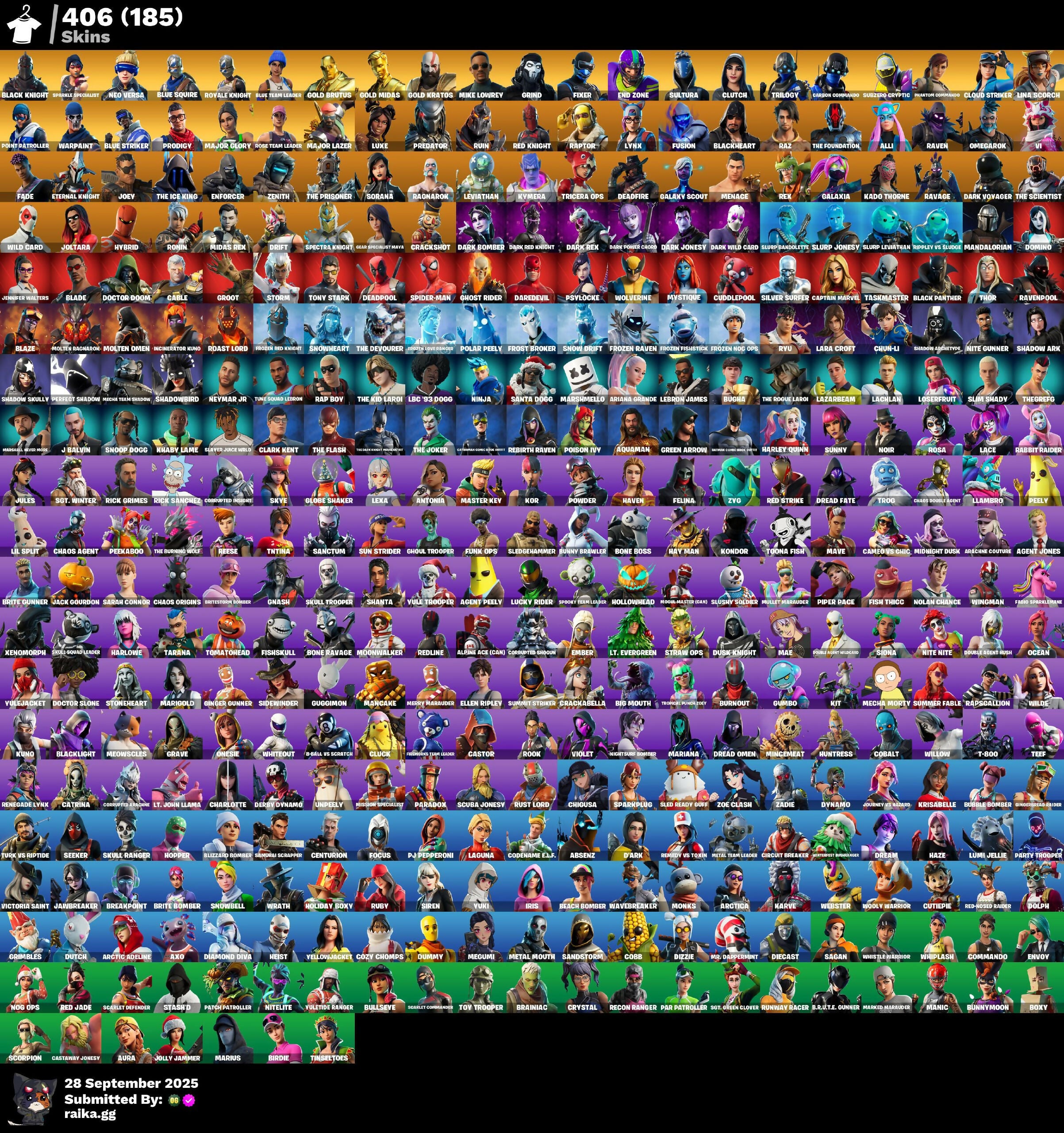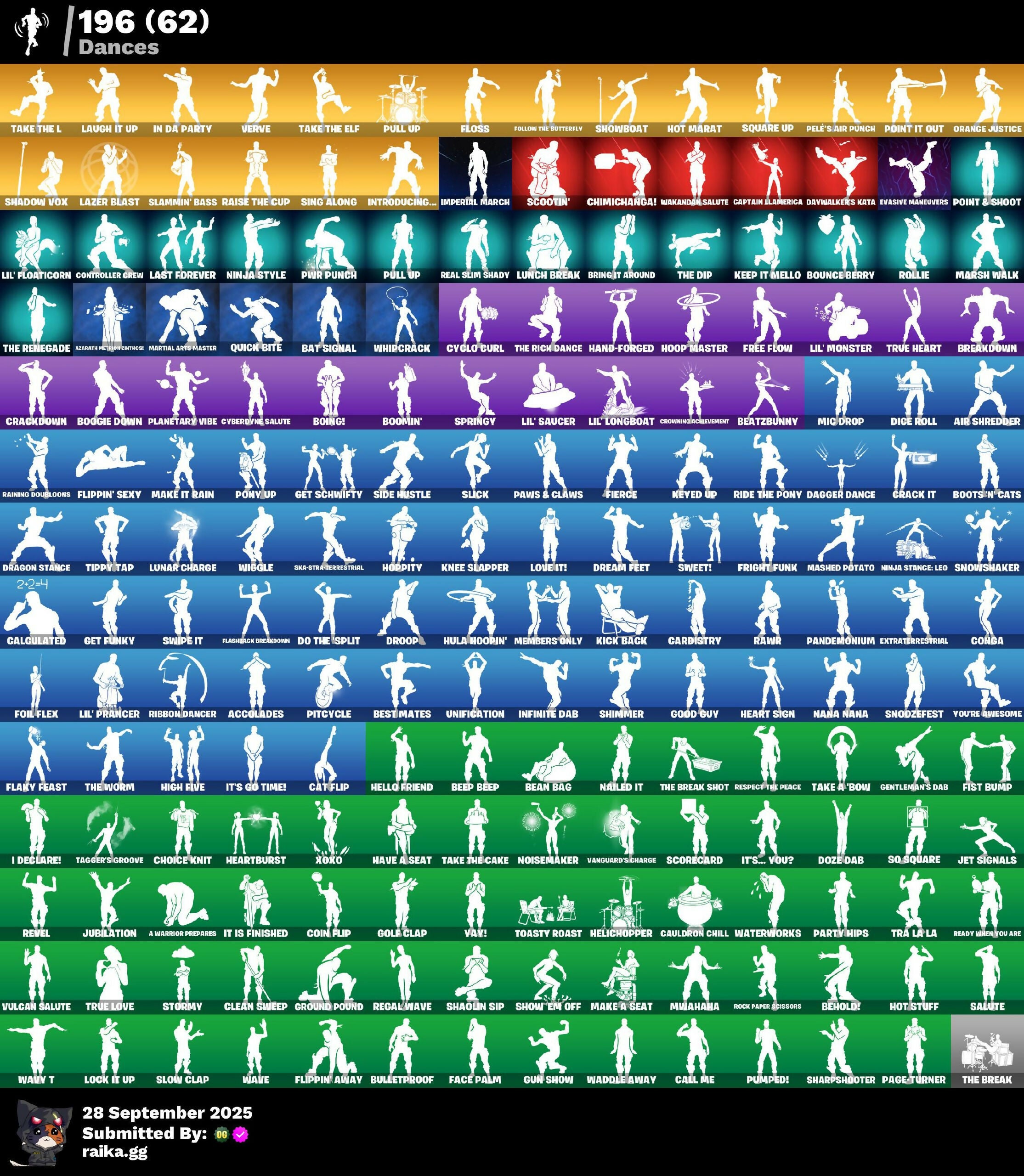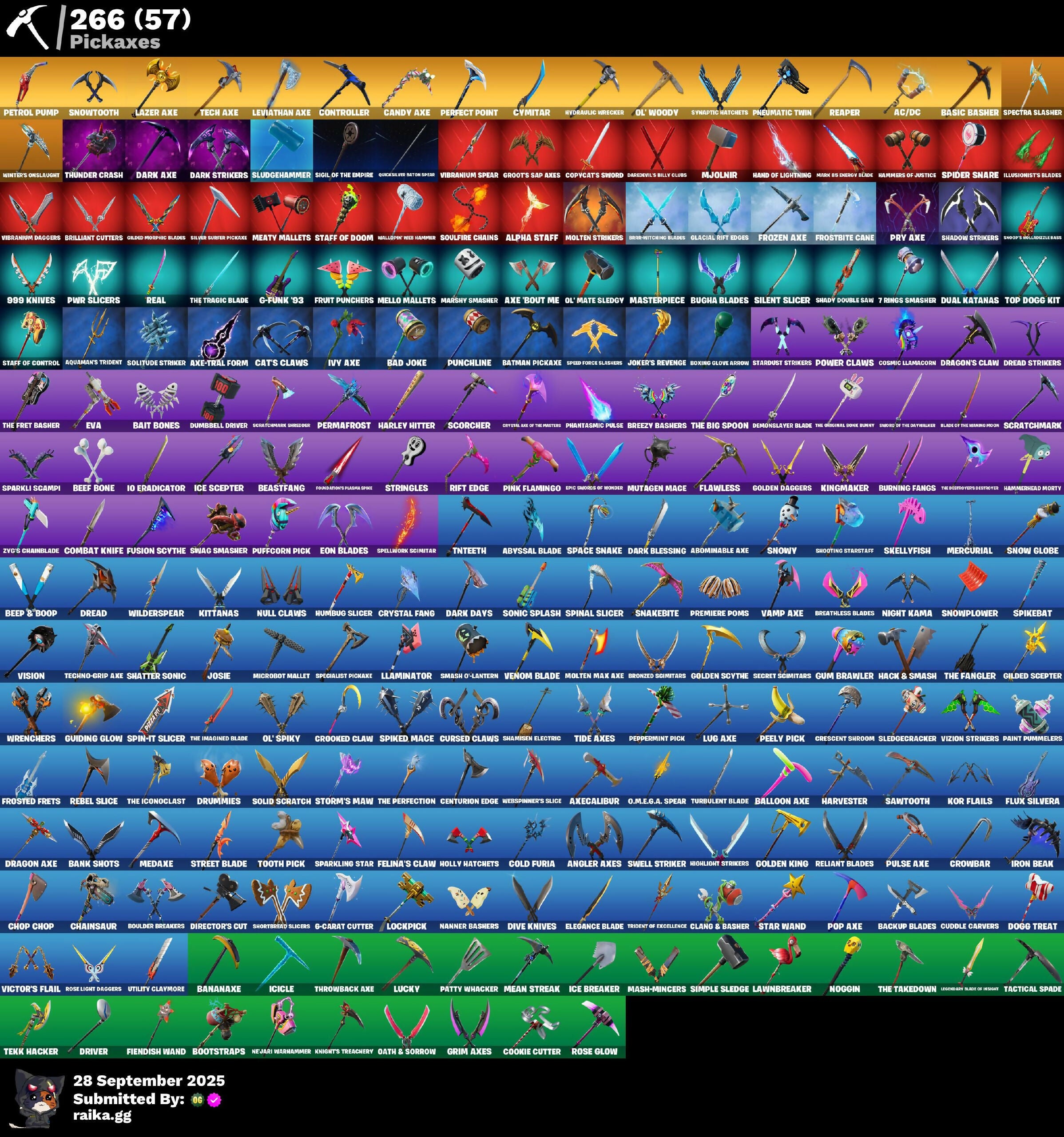 6-Carat Cutter, 7 Rings Smasher, 999 Knives, A Warrior Prepares, AC/DC, Abominable Axe, Absenz, Abyssal Blade, Accolades, Agent Jones, Agent Peely, Air Shredder, Alli, Alpha Staff, Alpine Ace (CAN), Angler Axes, Antonia, Aquaman, Aquaman's Trident, Arcane Couture, Arctic Adeline, Arctica, Ariana Grande, Aura, Axe 'Bout Me, Axe-Tral Form, AxeCalibur, Axo, Azabani Metrowenthos, B-Ball vs Scratch, B.R.U.T.E. Gunner, Backup Blades, Bad Joke, Bait Bones, Balloon Axe, Bananaxe, Banx Shots, Basic Basher, Bat Signal, Batman Pickaxe, Beach Bomber, Bean Bag, Beastfang, Beatzbunny, Beef Bone, Beep & Boop, Beep Beep, Behold!, Best Mates, Big Mouth, Birdie, Bite-Witching Blades, Black Knight, Black Panther, Blackheart, Blacklight, Blade, Blade of the Warning Moon, Blaze, Blizzard Bomber, Blue Squire, Blue Striker, Blue Team Leader, Boing!, Bone Boss, Bone Ravage, Boogie Down, Boomin', Boots N' Cats, Bootstraps, Boulder Breakers, Bounce Berry, Boxing Glove Arrow, Boxy, Brainiac, Breakdown, Breakpoint, Breathless Blades, Breezy Bashers, Brilliant Cutters, Bring It Around, Brite Bomber, Brite Gunner, BriteStorm Bomber, Bronzed Scimitars, Bugha, Bugha Blades, Bulletproof, Bullseye, Bunny Brawler, Bunnymoon, Burble Bomber, Burning Fangs, Burnout, Cable, Calculated, Call Me, Cameo vs Chic, Candy Axe, Captain Llamerica, Captain Marvel, Carbon Commando, Cardistry, Castaway Jonesy, Castor, Cat Flip, Cat's Claws, Catrina, Cauldron Chill, Centurion, Centurion Edge, Chainsaur, Chaos Agent, Chaos Double Agent, Chaos Origins, Charlotte, Chigusa, Chimichanga!, Choice Knit, Chop Chop, Chun-Li, Circuit Breaker, Clang & Basher, Clark Kent, Clean Sweep, Cloud Striker, Cluck, Clutch, Cobalt, Cobb, Codename E.L.F., Coin Flip, Cold Furia, Combat Knife, Commando, Conga, Controller, Controller Crew, Cookie Cutter, Copycat's Sword, Corrupted Insight, Corrupted Kaiju, Corrupted Shotgun, Cosmic Llamacorn, Cozy Chomps, Crack It, Crackabella, Crackdown, Crackshot, Crescent Shroom, Crooked Claw, Crowbar, Crowning Achievement, Cry of the Lair of the Masters, Crystal, Crystal Fang, Cuddle Carvers, Cuddlepool, Cursed Claws, Cutiepie, Cyberdyne Salute, Cyclo Curl, Cymitar, D'Ark, Dagger Dance, Daredevil, Daredevil's Billy Clubs, Dark Axe, Dark Blessing, Dark Bomber, Dark Days, Dark Jonesy, Dark Power Chord, Dark Red Knight, Dark Rex, Dark Strikers, Dark Voyager, Dark Wild Card, Daywalker's Kata, Deadfire, Deadpool, Demon Slayer Blade, Derby Dynamo, Diamond Diva, Dice Roll, Diecast, Director's Cut, Dive Knives, Dizzle, Do The Split, Doctor Doom, Doctor Slone, Dogg Treat, Dolph, Domino, Double Agent Rush, Doze Dab, Dragon Axe, Dragon Stance, Dragon's Claw, Dread, Dread Fate, Dread Omen, Dread Strikers, Dream, Dream Feet, Drift, Driver, Droop, Drummies, Dual Katanas, Dumbbell Driver, Dummy, Dusk Knight, Dutch, Dynamo, EVA, Elegance Blade, Ellen Ripley, Ember, End Zone, Enforcer, Envoy, Eon Blades, Epic Swords of Wonder, Erisabelle, Eternal Knight, Evasive Maneuvers, Extraterrestrial, Fable Sparkle Ranger, Face Palm, Fade, Felina, Felina's Claw, Fiendish Wand, Fierce, Fish Thicc, Fishskull, Fist Bump, Fixer, Flaky Feast, Flashback Breakdown, Flawless, Flippin' Away, Flippin' Sexy, Floss, Flux Silvera, Focus, Foil Flex, Follow The Butterfly, Foundation's Plasma Spike, Free Flow, Friedons Team Leader, Fright Funk, Frost Broker, Frostbite Cane, Frosted Frets, Frozen Axe, Frozen Fismstick, Frozen Nog Ops, Frozen Raven, Frozen Red Knight, Fruit Punchers, Funk Ops, Fusion, Fusion Scythe, Fuze, G-Funk '93, G.I.L.E.D Ready Glee, Galaxia, Galaxy Scout, Gear Specialist Maya, Gentleman's Dab, Get Funky, Get Schwifty, Ghost Rider, Ghoul Trooper, Gilded Morphic Blades, Gilded Scepter, Ginger Gunner, Glacial Rift Edges, Globe Shaker, Gnash, Gold Brutus, Gold Kratos, Gold Midas, Golden Daggers, Golden King, Golden Scythe, Golf Clap, Good Guy, Grave, Green Arrow, Grim Axes, Grimbles, Grind, Groot, Groot's Sap Axes, Ground Pound, Guggimon, Guiding Glow, Gum Brawler, Gumbo, Gun Show, Hack & Smash, Hammerhead Morty, Hammers of Justice, Hand of Lightning, Hand-Forged, Harley Hitter, Harley Quinn, Harlowe, Harvester, Have A Seat, Haven, Hay Man, Haze, Heart Sign, Heartburst, Heist, Helichopper, Hello Friend, High Five, Holiday Boxy, Hollowhead, Holly Hatchets, Hoop Master, Hopditty, Hopper, Hot Marat, Hot Stuff, Hoth Love Ranger, Hula Hoopin', Humbug Slicer, Huntress, Hybrid, Hydraulic Wrecker, I Declare!, IO Eradicator, Ice Breaker, Ice Scepter, Icicle, Illusionist's Blades, Imperial March, In Da Party, Incinerator Kuno, Indiefly, Infinite Dab, Introducing..., Iris, Iron Beak, It Is Finished, It's Go Time!, It's... You?, Ivy Axe, J Balvin, Jack Gourdon, Jawbreaker, Jennifer Walters, Jet Signals, Joey, Joker's Revenge, Jolly Jammer, Joltara, Josie, Jubilation, Jules, Kado Thorne, Karve, Keep It Mello, Keyed Up, Khabby Lame, Kick Back, Kingmaker, Kit, Kittanas, Knee Slapper, Knight's Treachery, Kondor, Kor, Kor Flails, Kuno, Kymera, LBC '93 Dogg, Lace, Lachlan, Laguna, Lara Croft, Last Forever, Laugh It Up, Lawnbreaker, Lazarbeam, Lazer Axe, Lazer Blast, LeBron James, Legendary Blade of Insight, Leviathan, Leviathan Axe, Lexa, Lil Split, Lil' Floaticorn, Lil' Longboat, Lil' Monster, Lil' Prancer, Lil' Saucer, Lina Scorch, Llambro, Llaminator, Lock It Up, Lockpick, Loserfruit, Love It!, Lt. Evergreen, Lt. John Llama, Lucky, Lucky Rider, Lug Axe, Lumi Jellie, Lunar Charge, Lunch Break, Luxe, Lynx, Mae, Major Glory, Major Lazer, Make A Seat, Make It Rain, Mancake, Mandalorian, Manic, Mariana, Marigold, Marius, Mark 85 Energy Blade, Marsh Walk, Marshmello, Marshy Smasher, Martial Arts Master, Mash-Mincers, Mashed Potato, Masked Marauder, Master Key, Masterpiece, Mave, Mean Streak, Meaty Mallets, Mecha Morty, Mecha Team Shadow, Medaxe, Megumi, Mello Mallets, Members Only, Menace, Meowscles, Mercurial, Merry Marauder, Metal Mouth, Metal Team Leader, Mic Drop, MicroLight Strikers, Microbot Mallet, Midas Rex, Midnight Dusk, Midnight vs Sunrise, Mike Lowrey, Mincemeat