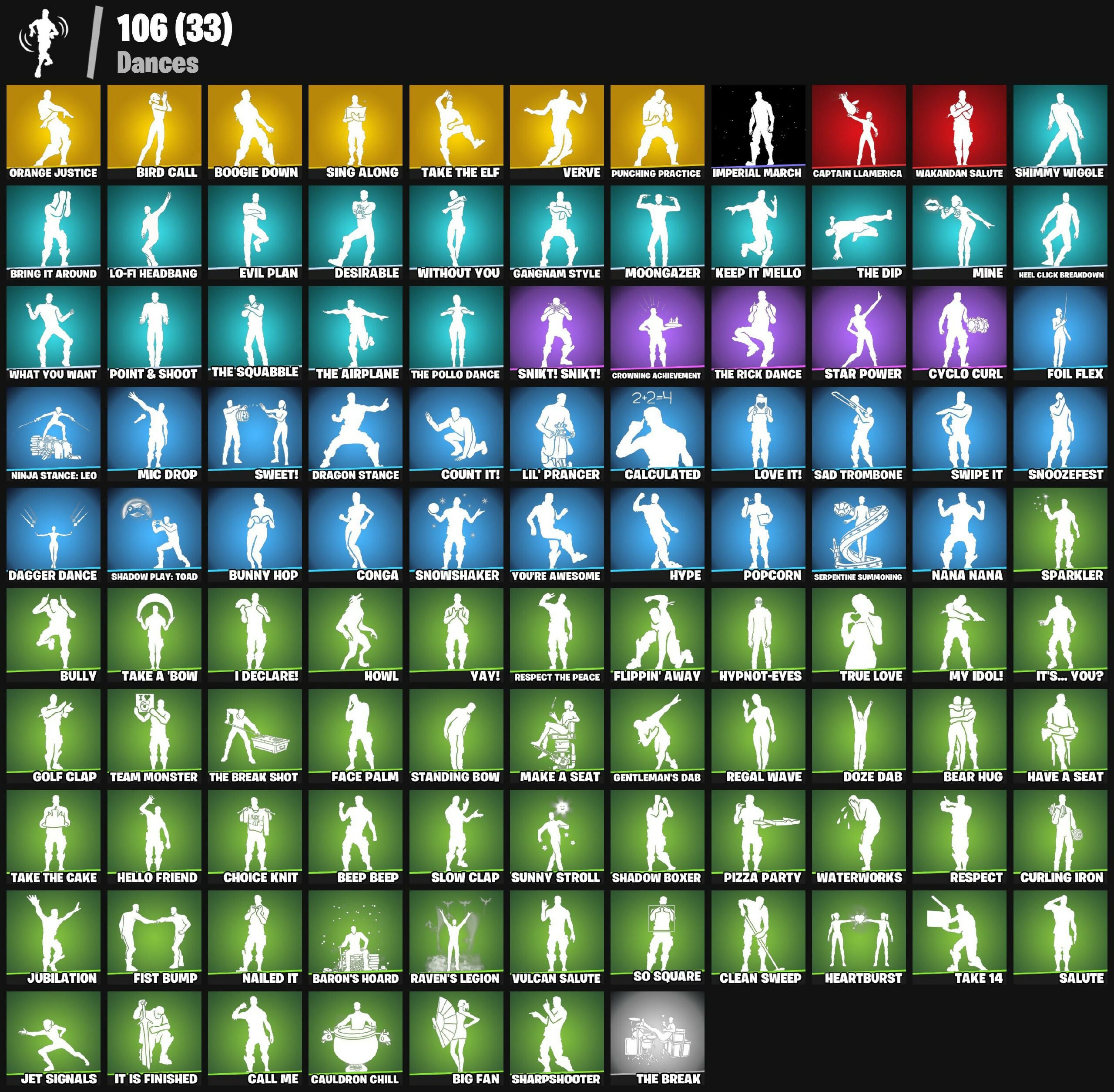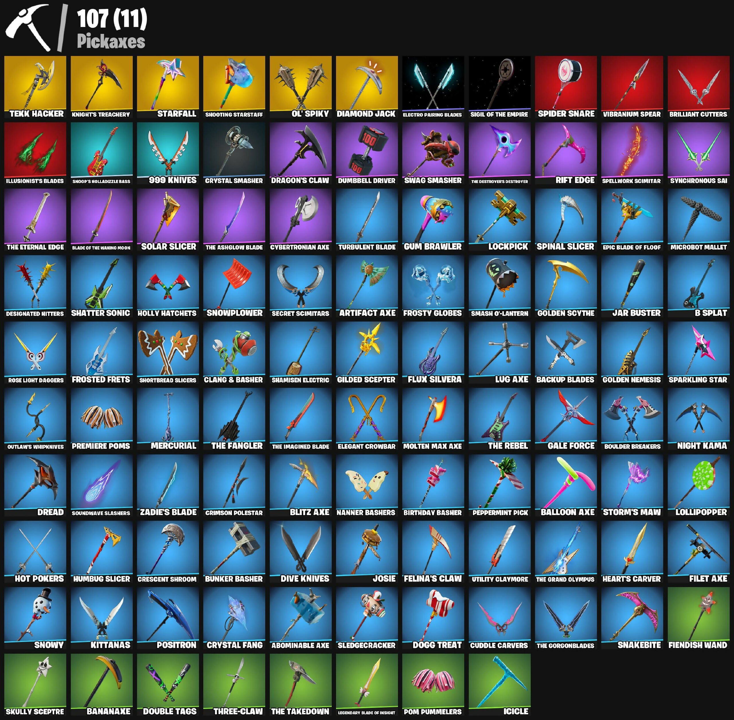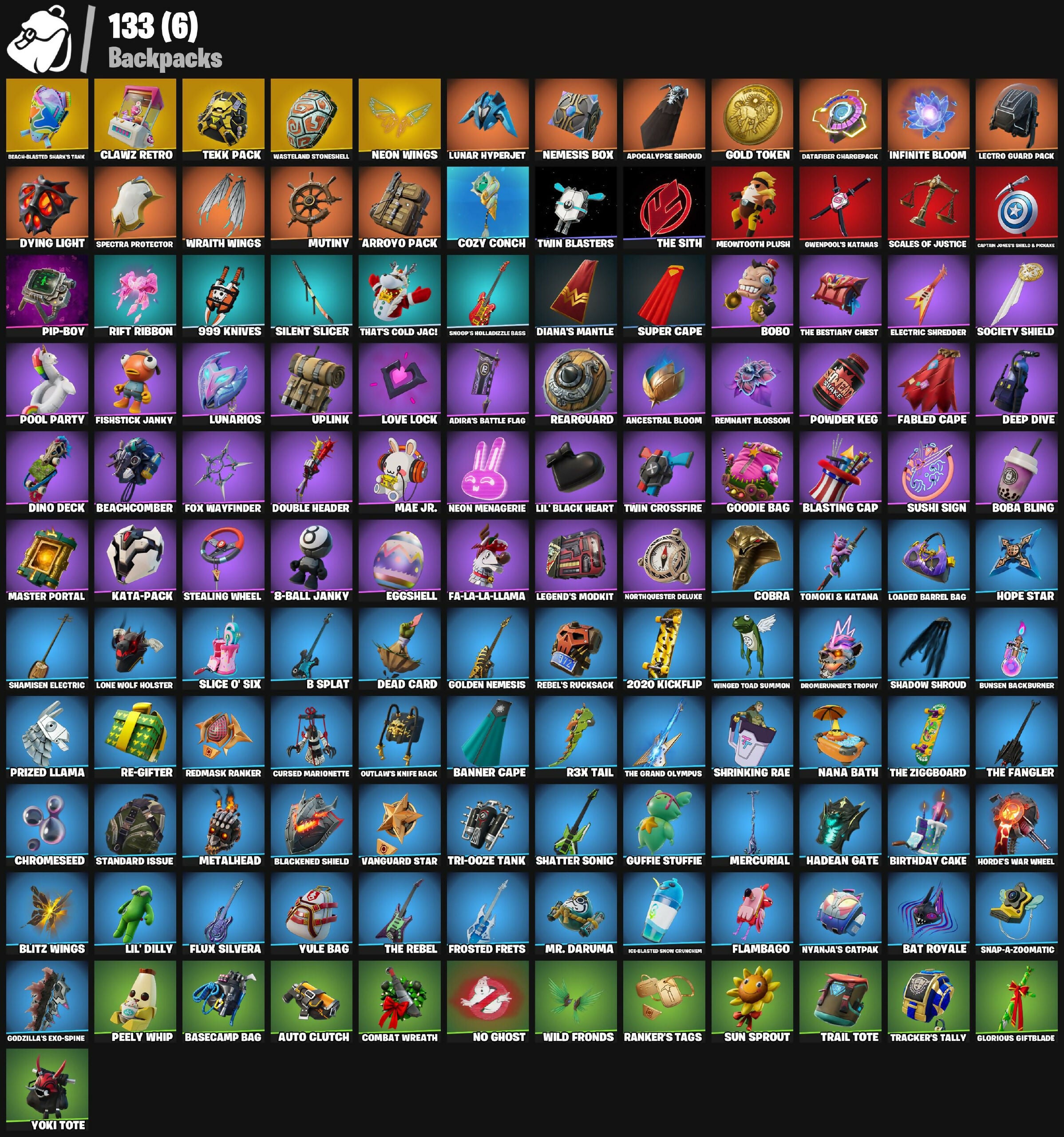 2020 Kickflip, 8-Ball Janky, 999 Knives, Abominable Axe, Adira's Battle Flag, Afterparty, Ancestral Bloom, Apocalypse Shroud, Arctic Adeline, Arroyo Pack, Artifact Axe, Astro Jack, Astroworld Cyclone, Auto Clutch, B Splat, Backup Blades, Balloon Axe, Bananaxe, Banner Cape, Baron's Hoard, Basecamp Bag, Bat Royale, Batman, Battlehawk, Beach-Blasted Shark's Tank, Beachcomber, Bear Hug, Beep Beep, Big Fan, Bird Call, Birthday Basher, Birthday Cake, Blackened Shield, Blackheart, Blade of The Waning Moon, Blasting Cap, Blitz Axe, Blitz Wings, Boba Bling, Bobo, Boogie Down, Boot It, Boulder Breakers, Brilliant Cutters, Bring It Around, Bubblegum, Bullseye, Bully, Bunker Basher, Bunny Brawler, Bunny Hop, Bunsen Backburner, Burning Dragon, Calculated, Call Me, Captain Jones's Shield & Pickaxe, Captain Llamerica, Carbide, Cauldron Chill, Chapter 3 Island Theme, Chapter 4 Island Theme, Chapter 5 Island Theme, Choice Knit, Chrome Punk, Chromeseed, Clang & Basher, Clawz Retro, Clean Sweep, Clubs, Cobra, Combat Wreath, Conga, Count It!, Cozy Conch, Crescent Shroom, Crimson Polestar, Crowning Achievement, Crystal Fang, Crystal Smasher, Cuddle Carvers, Curling Iron, Cursed Marionette, Cybertronian Axe, Cyclo Curl, Dagger Dance, Datafiber Chargepack, Dead Card, Decaying Dribbler, Deep Dive, Designated Hitters, Desirable, Diamond Jack, Diamonds, Diana's Mantle, Dino Deck, Dive Knives, Dogg Treat, Double Header, Double Tags, Doze Dab, Dragon Stance, Dragon's Claw, Dread, Drift, Dromerunner's Trophy, Dumbbell Driver, Dusk Knight, Dying Light, Eggshell, Electric Shredder, Electro Pairing Blades, Elegant Crowbar, Ember, Epic Blade of Floof, Evil Plan, Fa-La-La-Llama, Fabled Cape, Face Palm, Felina, Felina's Claw, Fiendish Wand, Filet Axe, Fireworks Team Leader, Fishstick Janky, Fist Bump, Flambago, Flip Reset, Flippin' Away, Flux Silvera, Foil Flex, Forsaken Eye, Fox Wayfinder, Frosted Frets, Frosty Globes, Fryangles, Gale Force, Gangnam Style, Gentleman's Dab, Gilded Scepter, Glorious Giftblade, Godzilla's Exo-Spine, Gold Token, Golden Nemesis, Golden Scythe, Golf Clap, Goodie Bag, Guffie Stuffie, Gum Brawler, Gwenpool's Katanas, Hadean Gate, Hailstorm Rider, Have A Seat, Heart's Carver, Heartburst, Hearts, Heel Click Breakdown, Hello Friend, Holiday Boxy, Holly Hatchets, Hope Star, Horde's War Wheel, Hot Pokers, Howl, Humbug Slicer, Huntress, Hybrid, Hype, Hypermelon, Hypnot-Eyes, I Declare!, Ice-Blasted Snow Grumgism, Icicle, Illusionist's Blades, Imperial March, Infinite Bloom, It Is Finished, It's... You?, Jar Buster, Jet Signals, Josie, Jubilation, Kata-Pack, Kaws Skeleton, Keep It Mello, Kittanas, Knight's Treachery, Krisabelle, Lectro Guard Pack, Legend's Modkit, Legendary Blade of Insight, Lego Fortnite Theme, Lil' Black Heart, Lil' Dilly, Lil' Prancer, Lo-Fi Headbang, Loaded Barrel Bag, Lobby Classic, Lockpick, Lollipopper, Lone Wolf Holster, Love It!, Love Lock, Lt. Evergreen, Lug Axe, Lunar Hyperjet, Lunarios, Mae Jr., Make A Seat, Master Key, Master Portal, Mecha Team Banner, Meowtooth Plush, Mercurial, Metalhead, Mic Drop, Microbot Mallet, Mine, Molten Max Axe, Monster Team Banner, Moongazer, Mr. Daruma, Mutiny, My Idol!, Nailed It, Nana Bath, Nana Nana, Nanner Bashers, Nemesis Box, Neon Man O' War, Neon Menagerie, Neon Tendrils, Neon Wings, Night Kama, Ninja Stance: Leo, No Ghost, Northquester Deluxe, Nyanja's Catpak, Ol' Spiky, Orange Justice, Outlaw's Knife Rack, Outlaw's Whipknives, Peely, Peely Whip, Peppermint Pick, Pip-Boy, Pizza Party, Point & Shoot, Poised Playmaker, Polar Peely, Polychrome Sunset, Pom Pummelers, Pool Party, Popcorn, Positron, Powder Keg, Premiere Poms, Prickly Patroller, Prized Llama, Punching Practice, R3x Tail, Racer's Instincts, Ranker's Tags, Raven's Legion, Re-Gifter, Rearguard, Rebel's Rucksack, Redline, Redmask Ranker, Regal Wave, Remnant Blossom, Respect, Respect The Peace, Rift Edge, Rift Ribbon, Rocket Racing Theme, Rose Light Daggers, Rosy Rift Goddess Ariana, Ruin, Runway Racer, Sad Trombone, Salute, Santa Dogg, Scales of Justice, Scarlet Defender, Secret Scimitars, Serpentine Summoning, Shadow Boxer, Shadow Play: Toad, Shadow Shroud, Shamisen Electric, Sharpshooter, Shatter Sonic, Shimmy Wiggle, Shooting Starstaff, Shortbread Slicers, Shrinking Rae, Sidewinder, Sigil of The Empire, Silent Slicer, Sing Along, Skerran, Skull Ranger, Skully Sceptre, Slayer Juice Wrld, Sled Ready Guff, Sledgecracker, Slice O' Six, Slow Clap, Smash O'-Lantern, Snakebite, Snap-A-Zoomatic, Snikt! Snikt!, Snoop's Holladizzle Bass, Snoozefest, Snowplower, Snowshaker, Snowy, So Square, Society Shield, Solar Slicer, Soundwave Slashers, Spades, Sparkler, Sparkling Star, Spectra Protector, Spellwork Scimitar, Spider Snare, Spinal Slicer, Standard Issue, Standing Bow, Star Power, Starfall, Stealing Wheel, Stella, Storm's Maw, Sun Sprout, Sun Strider, Sunny Stroll, Super Cape, Sushi Sign, Swag Smasher, Sweet!, Swipe It, Synchronous Sai, Take 14, Take A 'Bow, Take The Cake, Take The Elf, Team Monster, Tekk Hacker, Tekk Pack, Tekk Yellow, Teknique, Tex Flamingo, That's Cold Jac!, The Airplane, The Ashglow Blade, The Bestiary Chest, The Break, The Break Shot, The Destroyer's Destroyer, The Dip, The Eternal Edge, The Fangler, The Gorgonblades, The Grand Olympus, The Imagined Blade, The Pollo Dance, The Re-OG, The Rebel, The Rick Dance, The Sith, The Squabble, The Takedown, The Ziggboard, Three-Claw, Tie Whisper, Tomoki & Katana, Tracker's Tally, Trail Tote, Tri-Ooze Tank, True Love, Turbulent Blade, Twin Blasters, Twin Crossfire, Uplink, Utility Claymore, Valor, Vanguard Star, Verve, Vibranium Spear, Vulcan Salute, Wakandan Salute, Wasteland Stoneshell, Waterworks, What You Want, Wild Fronds, Winged Toad Summon, Winterfest Bushranger, Without You, Wonder Woman, Wooly Warrior, World Cup 2019 Banner, Wraith Wings, Yay!, Yoki Tote, You're Awesome, Yule Bag, Yulejacket, Zadie's Blade, Zoey