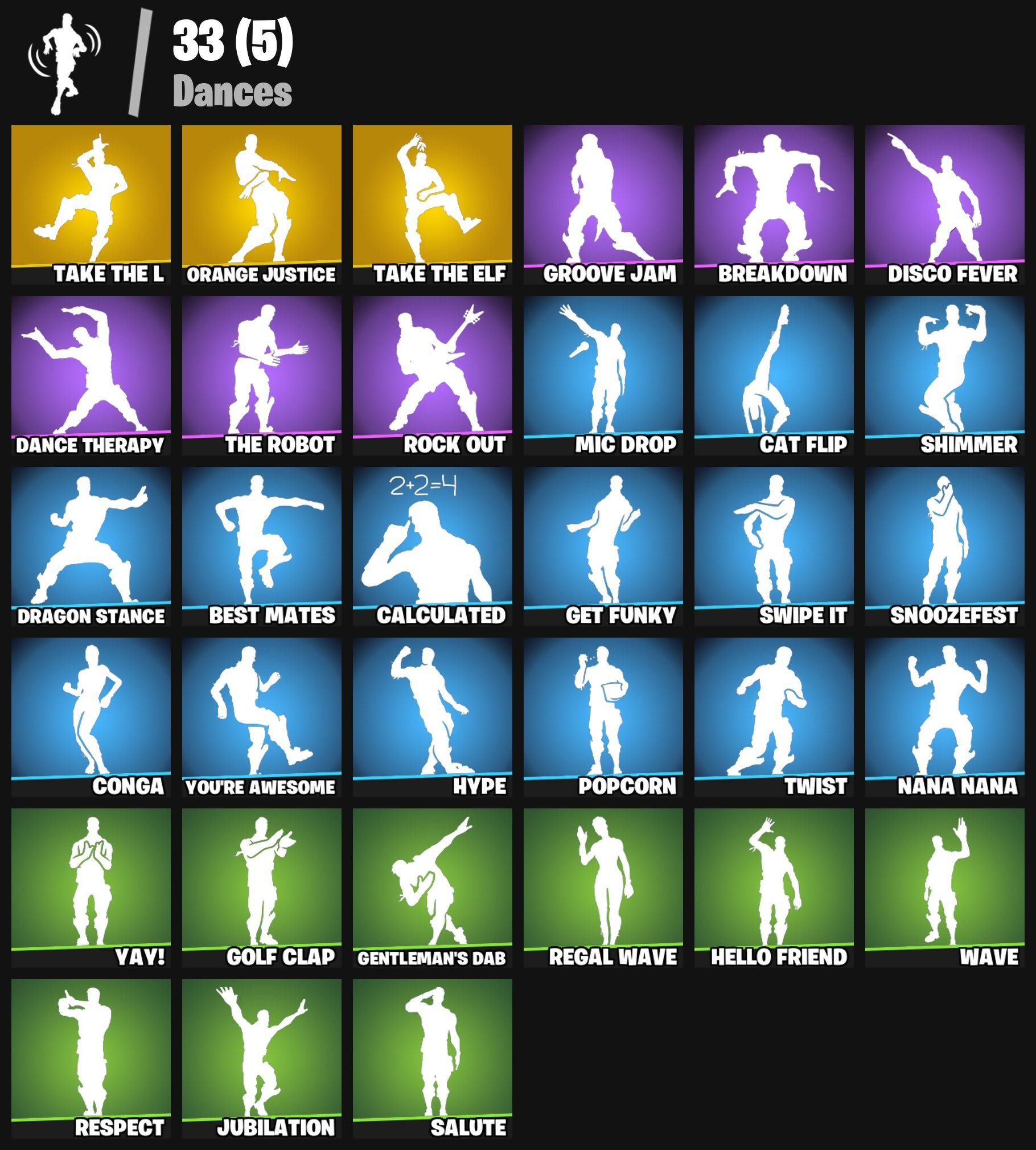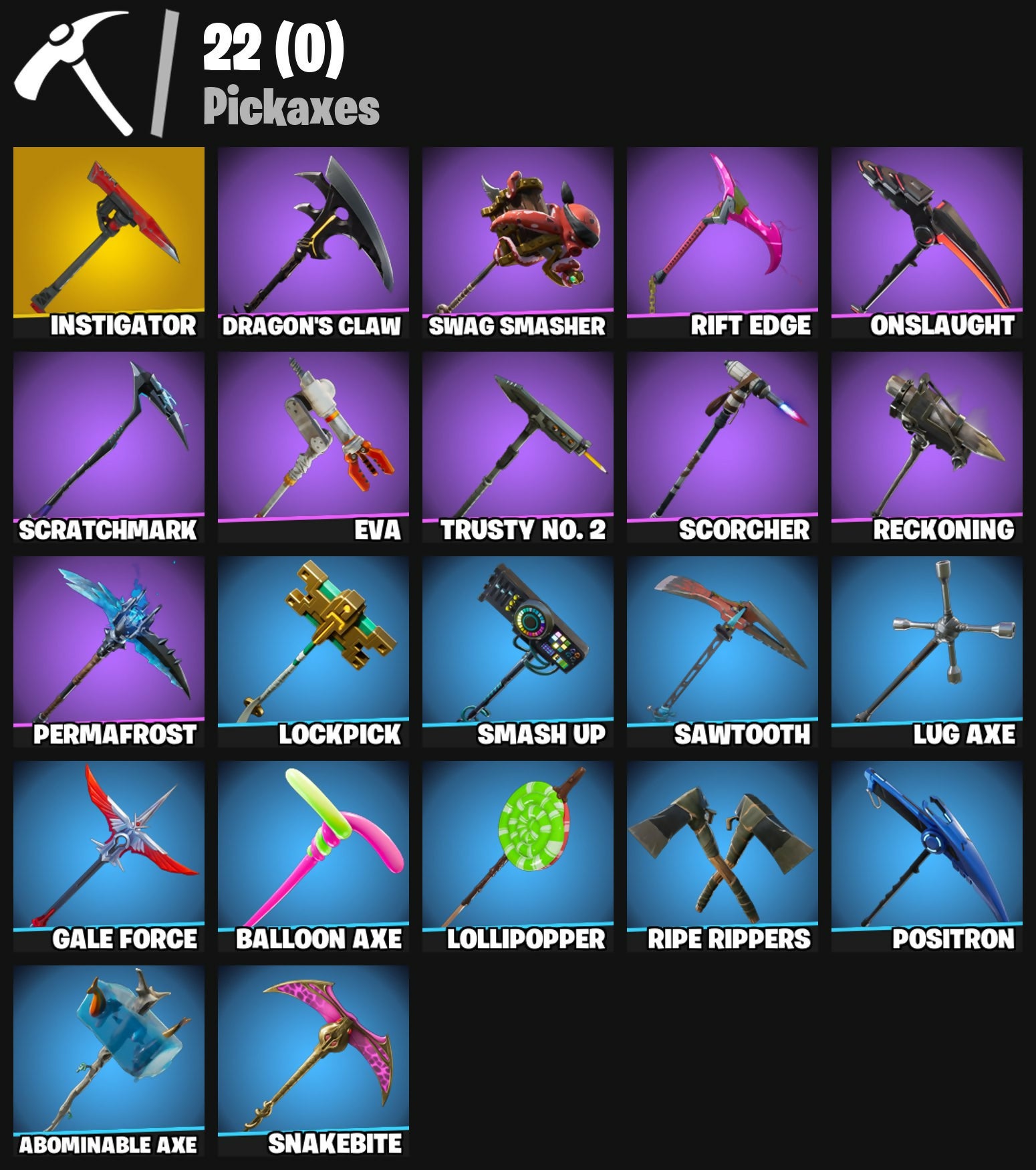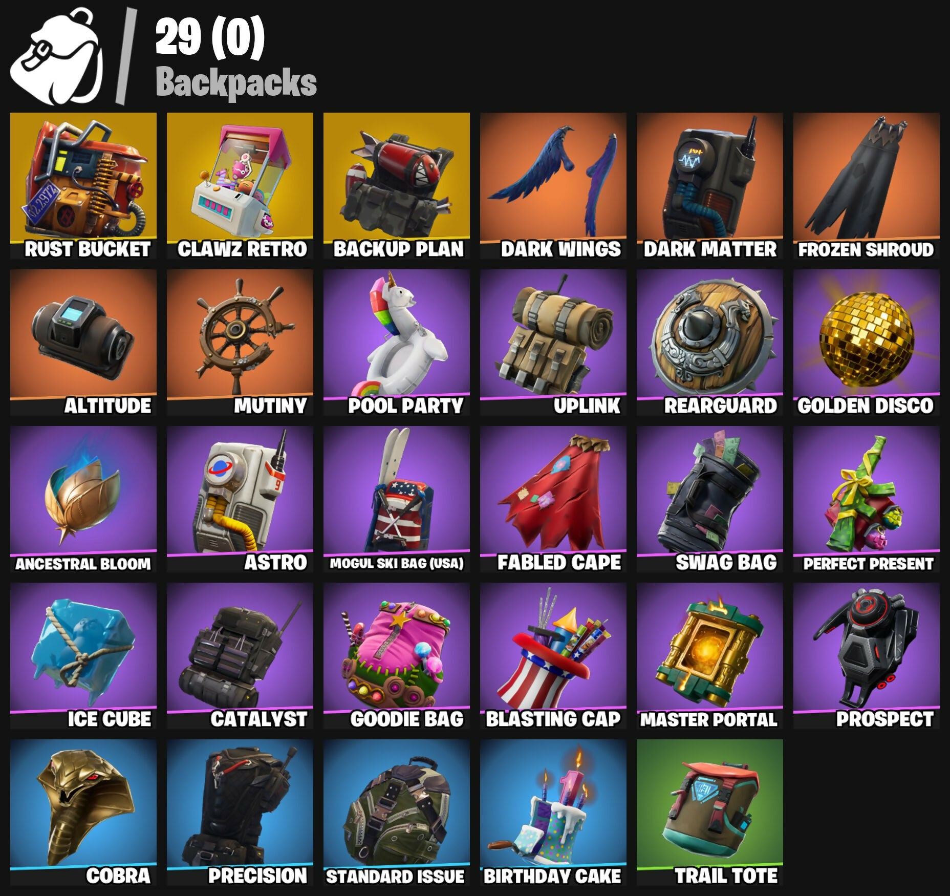 Abominable Axe, Altitude, Ancestral Bloom, Assassin, Astro, Backup Plan, Balloon Axe, Battlehawk, Best Mates, Birthday Cake, Blackheart, Blasting Cap, Breakdown, Calamity, Calculated, Carbide, Cat Flip, Catalyst, Chapter 3 Island Theme, Chapter 4 Island Theme, Chapter 5 Island Theme, Clawz Retro, Cobra, Conga, DJ Yonder, Dance Therapy, Dark Matter, Dark Voyager, Dark Wings, Disco Fever, Dragon Stance, Dragon's Claw, Drift, Elite Agent, Ember, Eva, Fabled Cape, Fireworks Team Leader, Frozen Shroud, Fryangles, Funk Ops, Gale Force, Gentleman's Dab, Get Funky, Giddy-Up, Golden Disco, Golf Clap, Goodie Bag, Groove Jam, Havoc, Hello Friend, Huntress, Hybrid, Hype, Ice Cube, Instigator, Jubilation, Lego Fortnite Theme, Lobby Classic, Lockpick, Lollipopper, Lug Axe, Lynx, Master Portal, Mic Drop, Mission Specialist, Mogul Master (USA), Mogul Ski Bag (USA), Moonwalker, Mutiny, Nana Nana, Omega, Onslaught, Orange Justice, Peely, Perfect Present, Permafrost, Pool Party, Popcorn, Positron, Powder, Precision, Prospect, Ragnarok, Ravage, Rearguard, Reckoning, Redline, Regal Wave, Respect, Rift Edge, Ripe Rippers, Rock Out, Rogue Agent, Rook, Rox, Rust Bucket, Rust Lord, Salute, Sawtooth, Scorcher, Scratchmark, Sentinel, Sgt. Winter, Shadow Ops, Shimmer, Sidewinder, Sledgehammer, Slipstream, Smash Up, Snakebite, Snoozefest, Snorkel Ops, Snowflake, Squad Leader, Standard Issue, Sub Commander, Sun Strider, Swag Bag, Swag Smasher, Swipe It, Take The Elf, Take The L, Teknique, The Ace, The Reaper, The Robot, Trail Tote, Trusty No. 2, Twist, Uplink, Valor, Wave, Yay!, You're Awesome, Zenith, Zoey