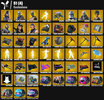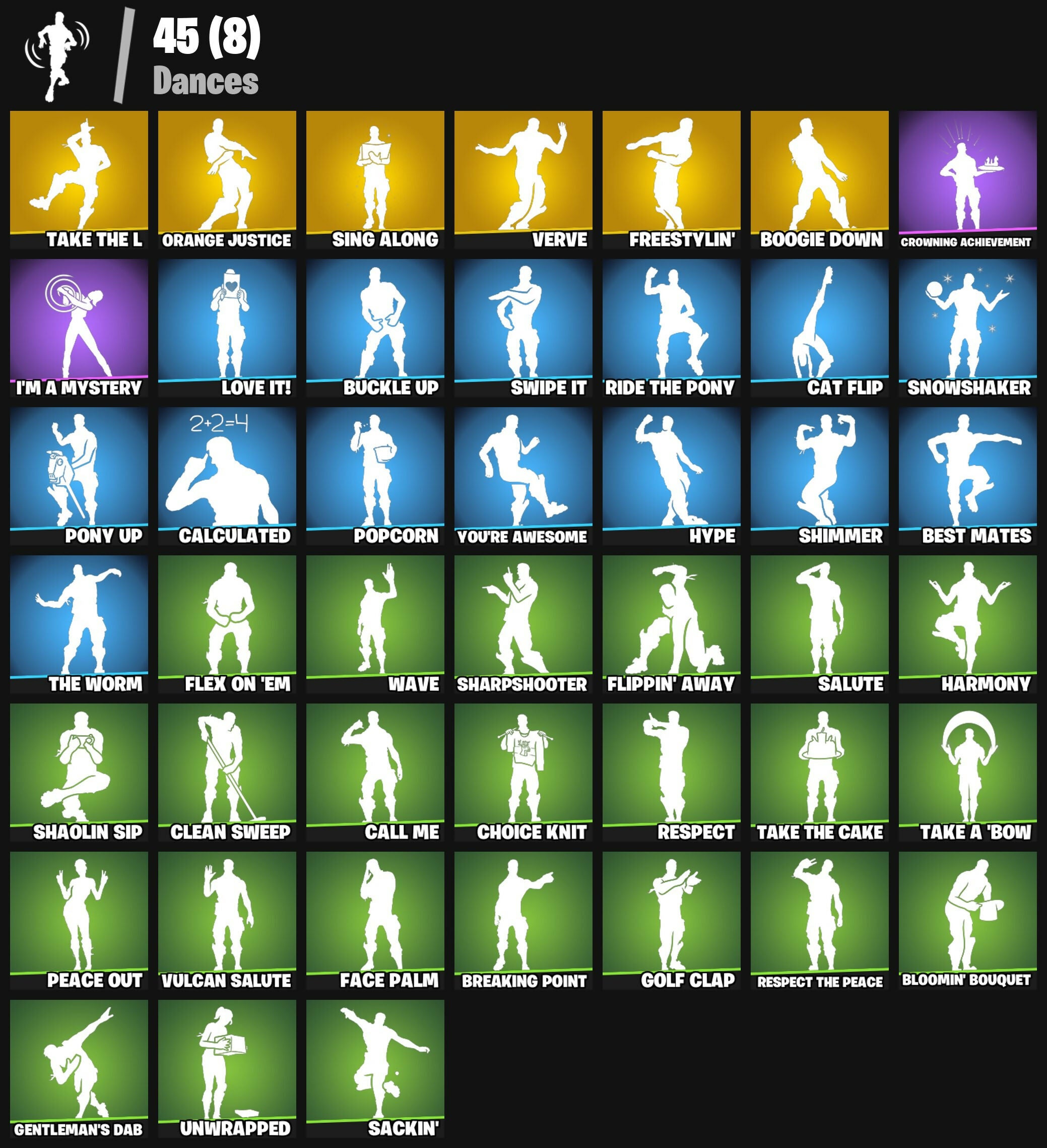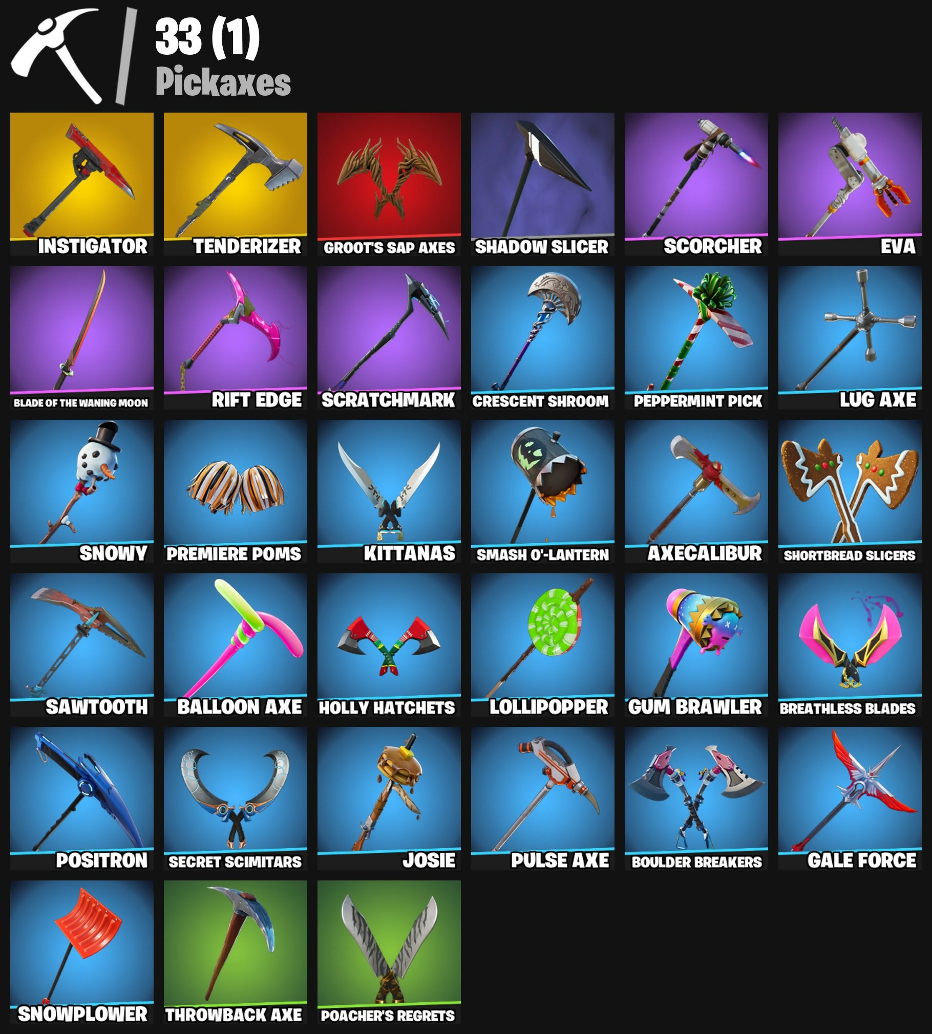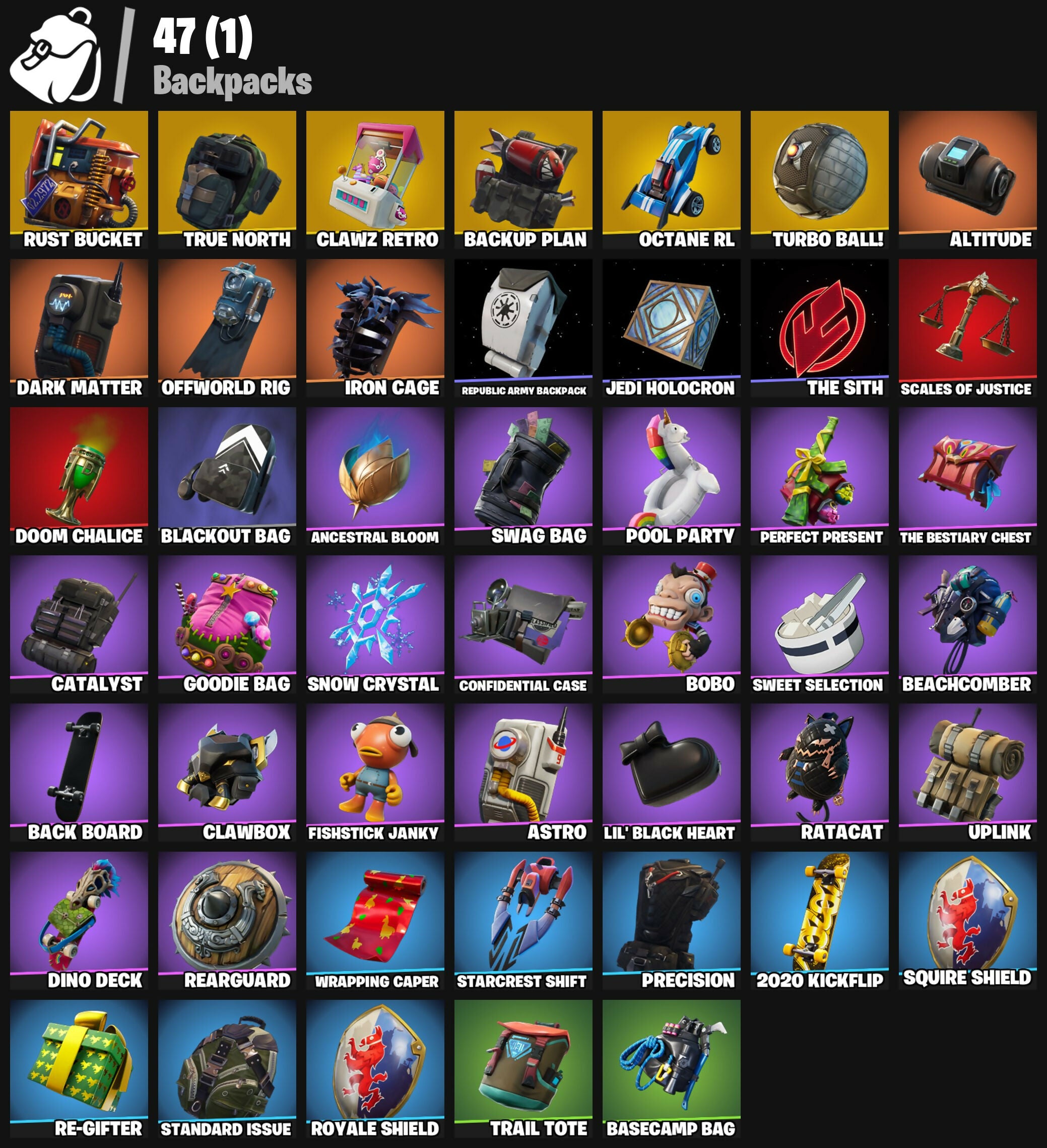 2020 Kickflip, 212th Battalion Trooper, 501st Trooper, Ahsoka's Clone Trooper, Altitude, Anakin Skywalker, Ancestral Bloom, Astro, Axecalibur, Back Board, Backup Plan, Balloon Axe, Basecamp Bag, Batman, Battle Ball, Battle Bus, Battlehawk, Beachcomber, Best Mates, Blackout Bag, Blade Of The Waning Moon, Blizzabelle, Bloomin' Bouquet, Blue Squire, Bobo, Boogie Down, Boulder Breakers, Breaking Point, Breathless Blades, Buckle Up, Calculated, Call Me, Carbide, Cat Flip, Catalyst, Chapter 3 Island Theme, Chapter 4 Island Theme, Chapter 5 Island Theme, Choice Knit, Clawbox, Clawz Retro, Clean Sweep, Clone Trooper, Confidential Case, Coruscant Guard, Crescent Shroom, Crowning Achievement, Dark Matter, Dark Voyager, Dino Deck, Doom Chalice, Drift, Eva, Everybody Dance!, Face Palm, Fishstick Janky, Flex On 'Em, Flip Reset, Flippin' Away, Freestylin', Fryangles, Gale Force, Gentleman's Dab, Glow, Golf Clap, Goodie Bag, Groot's Sap Axes, Gum Brawler, Gumshoe, Harmony, Havoc, Holly Hatchets, Hope, Huntress, Hype, I'm A Mystery, Instigator, Iron Cage, Jedi Holocron, Josie, Kittanas, Krisabelle, Lego Fortnite Theme, Lil' Black Heart, Lobby Classic, Lollipopper, Love It!, Lt. Evergreen, Lug Axe, Lynx, Mako, Mission Specialist, Moonwalker, Octane RL, Offworld Rig, Orange Justice, Oscar, Peace Out, Peppermint Pick, Per Aspera Ad Astra, Perfect Present, Poacher's Regrets, Polar Peely, Pony Up, Pool Party, Popcorn, Positron, Precision, Premiere Poms, Pulse Axe, Rainbow Fog, Ratacat, Raven, Re-Gifter, Rearguard, Redline, Republic Army Backpack, Respect, Respect The Peace, Ride The Pony, Rift Edge, Rocket League, Rocket Racing Theme, Rogue Agent, Rox, Royale Knight, Royale Shield, Ruby Shadows, Rust Bucket, Rust Lord, Sackin', Sagan, Salute, Satoru Gojo, Sawtooth, Scales of Justice, Scorcher, Scratchmark, Secret Scimitars, Sentinel, Sgt. Winter, Shadow Slicer, Shaolin Sip, Sharpshooter, Shimmer, Shortbread Slicers, Sing Along, Sky Shadow, Sledgehammer, Slipstream, Smash O'-Lantern, Snow Crystal, Snowflake, Snowplower, Snowshaker, Snowy, Squire Shield, Standard Issue, Starcrest Shift, Sub Commander, Sun Strider, Swag Bag, Sweet Selection, Swipe It, Take A 'Bow, Take The Cake, Take The L, Teknique, Tenderizer, The Ace, The Bestiary Chest, The Sith, The Visitor, The Worm, Throwback Axe, Tie Whisper, Trail Tote, Trailblazer, True North, Turbo Ball!, Unwrapped, Uplink, Valor, Verve, Vulcan Salute, Wave, Wolf Pack Trooper, Wooly Warrior, Wrapping Caper, Wrath's Wrath, You're Awesome, Zenith, Zoey, Zooming