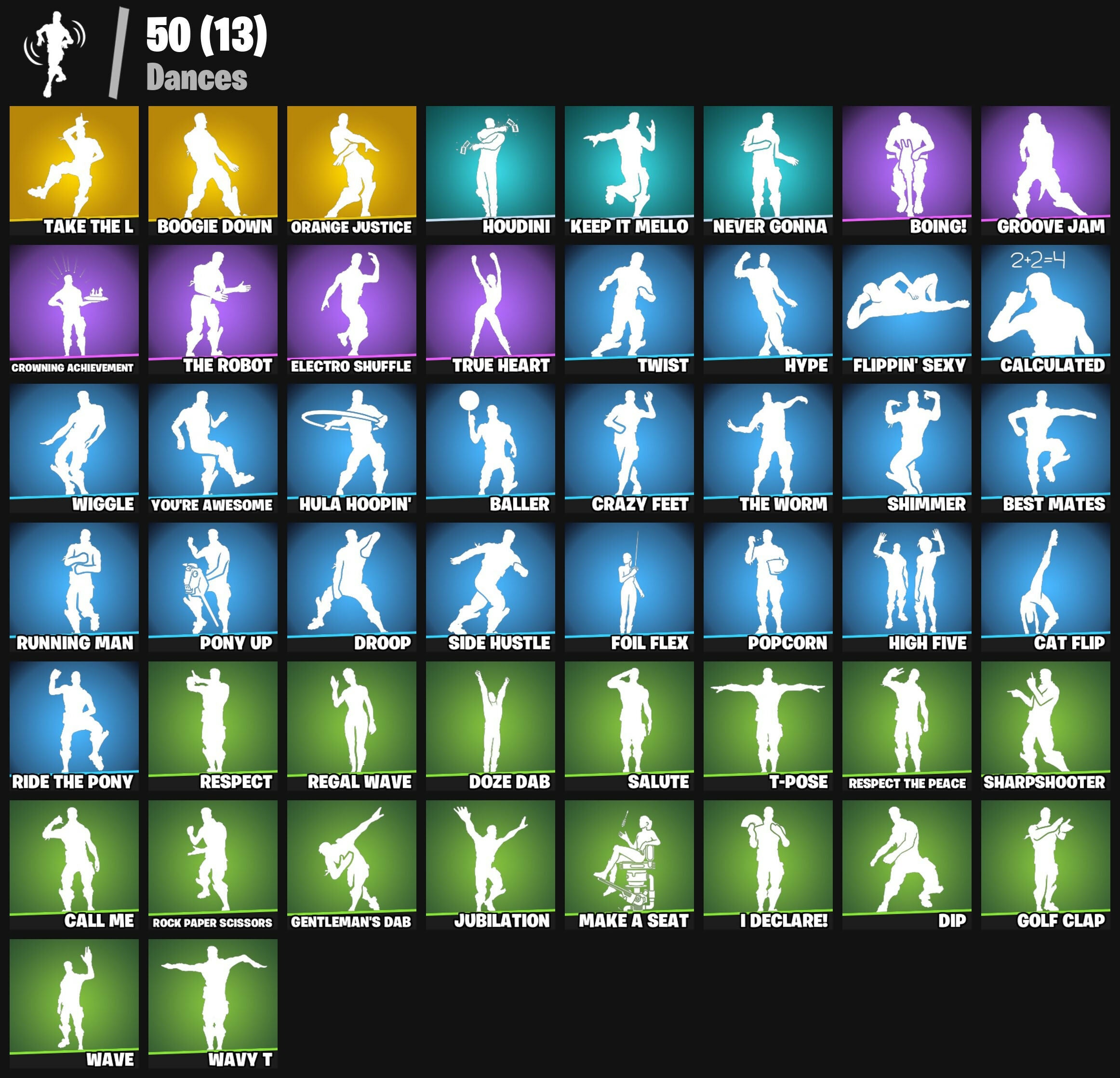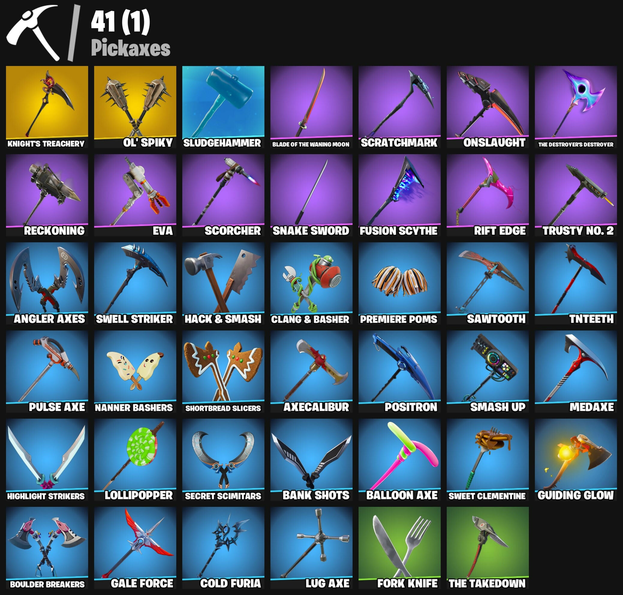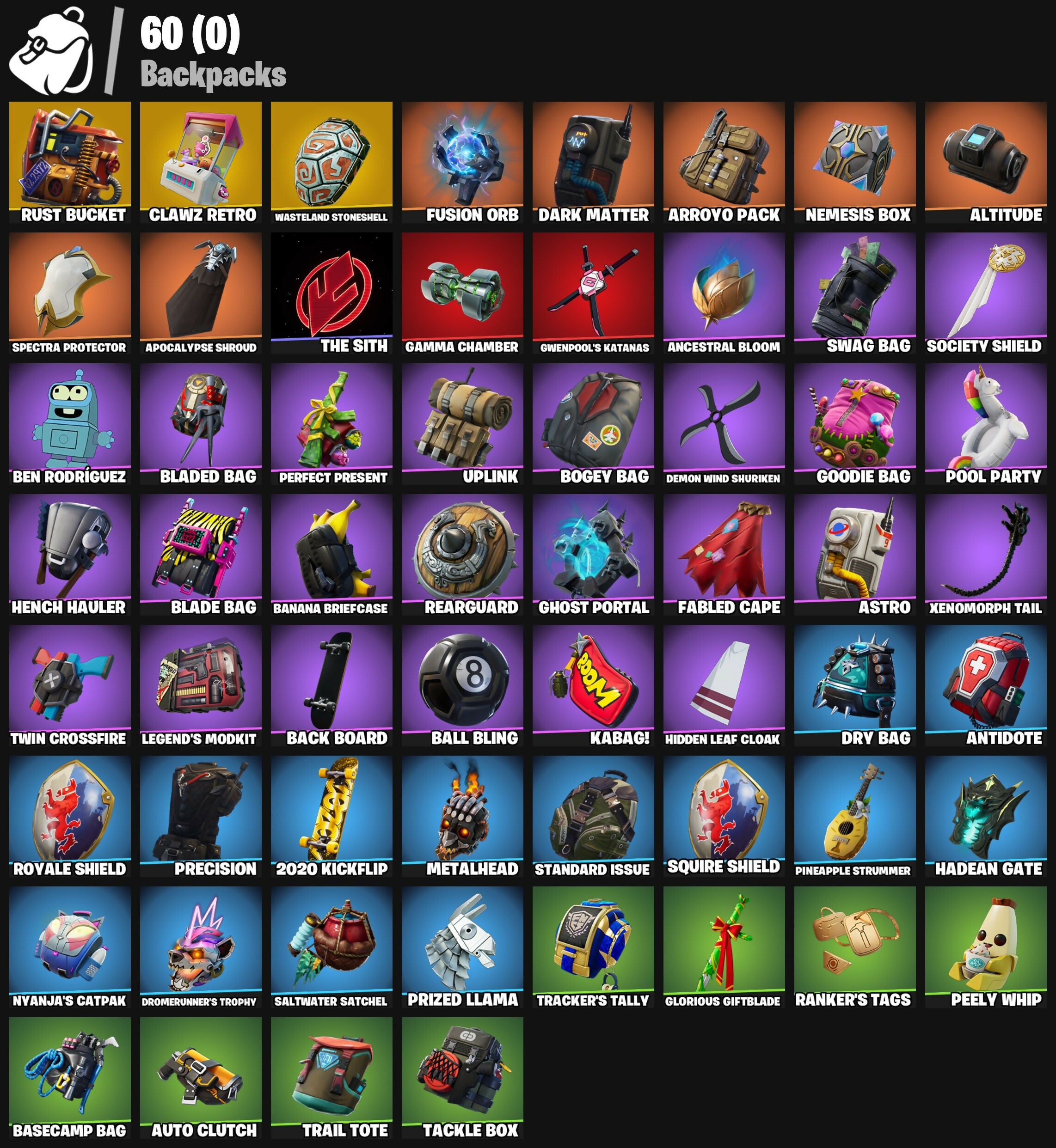 2020 Kickflip, 8-Ball Vs Scratch, Agent Peely, Altitude, Ancestral Bloom, Angler Axes, Antidote, Apocalypse Shroud, Arroyo Pack, Astro, Auto Clutch, Axecalibur, Back Board, Ball Bling, Baller, Balloon Axe, Banana Briefcase, Bank Shots, Basecamp Bag, Battle Bus, Battlehawk, Ben Rodríguez, Bender Bending Rodríguez, Best Mates, Blade Bag, Blade Of The Waning Moon, Bladed Bag, Blue Squire, Bogey Bag, Boing!, Boogie Down, Boulder Breakers, Brutus, Burning Dragon, Calamity, Calculated, Call Me, Cameo Vs Chic, Carbide, Cat Flip, Chapter 3 Island Theme, Chapter 4 Island Theme, Chapter 5 Island Theme, Clang & Basher, Clawz Retro, Cold Furia, Crazy Feet, Crowning Achievement, DJ Yonder, Dark Matter, Dark Voyager, Demon Wind Shuriken, Dip, Doze Dab, Drift, Dromerunner's Trophy, Droop, Dry Bag, EVA, Electro Shuffle, Elite Agent, Fabled Cape, Fishstick, Flippin' Sexy, Foil Flex, Fork Knife, Fryangles, Fusion, Fusion Orb, Fusion Scythe, Gale Force, Gamma Chamber, Gear Specialist Maya, Gentleman's Dab, Ghost Portal, Giddy-Up, Glorious Giftblade, Golf Clap, Goodie Bag, Groove Jam, Guiding Glow, Gwenpool's Katanas, Hack & Smash, Hadean Gate, Hench Hauler, Hidden Leaf Cloak, High Five, Highlight Strikers, Holiday Boxy, Houdini, Hula Hoopin', Hulk, Huntress, Hype, I Declare!, Journey Vs Hazard, Jubilation, Kabag!, Keep It Mello, Knight's Treachery, Knights Treachery, Laguna, Legend's Modkit, Lego Fortnite Theme, Lobby Classic, Lollipopper, Lug Axe, Lynx, Make A Seat, Medaxe, Metalhead, Mission Specialist, Moonwalker, Nanner Bashers, Nemesis Box, Neon Man O' War, Neon Tendrils, Never Gonna, Nyanja's Catpak, Ol' Spiky, Omega, Onslaught, Orange Justice, Peely Whip, Perfect Present, Pineapple Strummer, Pony Up, Pool Party, Popcorn, Positron, Precision, Premiere Poms, Prized Llama, Pulse Axe, Ranker's Tags, Rearguard, Reboot'd, Reckoning, Red Strike, Red Zone Renegade, Redline, Regal Wave, Remedy Vs Toxin, Respect, Respect The Peace, Ride The Pony, Rift Edge, Rippley Vs Sludge, Rock Paper Scissors, Rocket Racing Theme, Royale Knight, Royale Shield, Running Man, Rust Bucket, Rust Lord, Sakura Haruno, Saltwater Satchel, Salute, Sasuke Uchiha, Sawtooth, Scorcher, Scratchmark, Secret Scimitars, Sgt. Winter, Sharpshooter, Shimmer, Shortbread Slicers, Side Hustle, Skerran, Skull Trooper, Sludgehammer, Smash Up, Snake Sword, Snowflake, Society Shield, Spectra Protector, Squad Leader, Squire Shield, Standard Issue, Sun Strider, Swag Bag, Sweet Clementine, Swell Striker, T-Pose, Tackle Box, Take The L, Teknique, The Ace, The Destroyer's Destroyer, The Re-OG, The Reaper, The Robot, The Sith, The Takedown, The Worm, Tnteeth, Tntina, Tracker's Tally, Trail Tote, True Heart, Trusty No. 2, Turk Vs Riptide, Twin Crossfire, Twist, Uplink, Valor, Wasteland Stoneshell, Wave, Wavebreaker, Wavy T, Wiggle, Wingman, Winterfest Bushranger, Xenomorph, Xenomorph Tail, You're Awesome, Zenith, Zoey
