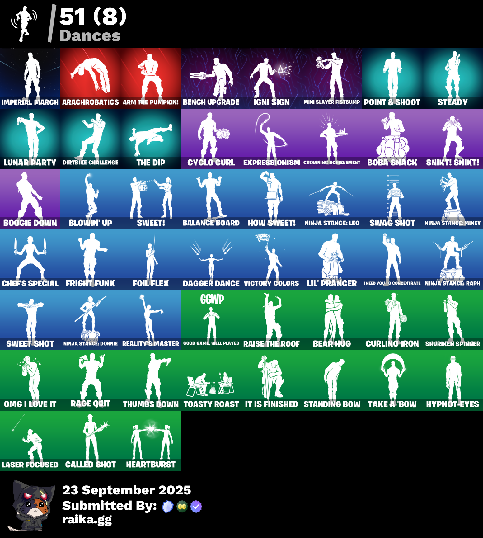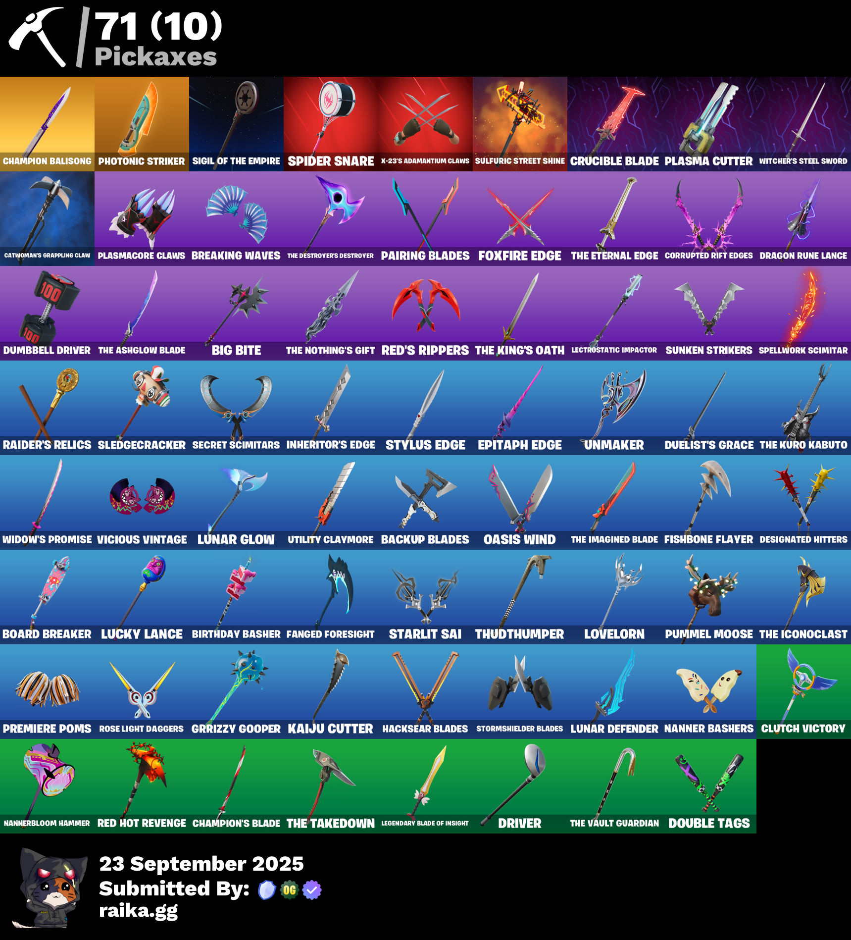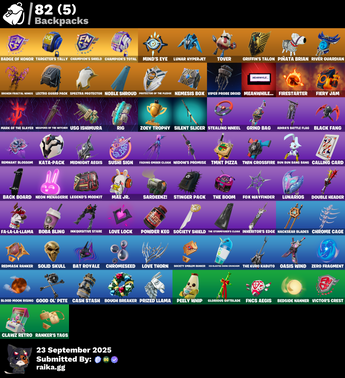 Adira (Battle Mask), Adira's Battle Flag, Arachrobatics, Arctic Adeline, Arm The Pumpkin!, Articulated Blade Wing, Ascension Nezumi, Astro Armor, Aura, Back Board, Backlash, Backup Blades, Badge Of Honor, Balance Board, Bat Royale, Battle Bloom, Bear Hug, Bedside Nanner, Bench Upgrade, Big Bite, Birthday Basher, Black Fang, Blaze, Blood Moon Rising, Blowin' Up, Board Breaker, Boba Bling, Boba Snack, Boogie Down, Bough Breaker, Breaking Waves, Broken Fractal Wings, Bugha, Bullpen Brawler Dusty, Bun Bun Bang Bang, Bytes (Lone Traveler), Cacodemon, Called Shot, Calling Card, Cash Stash, Catwoman's Grappling Claw, Champion Balisong, Champion Sail Shark, Champion Stash'd, Champion's Blade, Champion's Shield, Champion's Total, Chef's Special, Chrome Cage, Chrome Punk, Chromebrella, Chromeseed, Chromestruck Fire, Clawz Retro, Clinical Crosser, Club President Helsie, Clutch Victory, Combat Tech Jules, Combocopter, Comfy Cats, Commander's Descent, Competitor's Skyblades, Competitor's Time Brella, Corrupted Rift Edges, Corrupted Tendrils, Crowning Achievement, Crucible Blade, Curling Iron, Cyclo Curl, Dagger Dance, Darth Vader, Delivery Diver, Designated Hitters, Dirtbike Challenge, Dolph, Double Header, Double Tags, Dragon Rider, Dragon Rune Lance, Driftwalker, Driver, Duelist's Grace, Dumbbell Driver, Dummy Supreme, Eclipse Brella, Elite Servo, Envoy, Epitaph Edge, Everything's End, Evie (Summer Strider), Expressionism, FNCS Aegis, Fa-La-La-Llama, Fading Ember Cloak, Fanged Foresight, Fiery Descent, Fiery Jam, Firestarter, Fishbone Flayer, Flip Flyer, Fncs Champion Seeker, Foil Flex, Fox Wayfinder, Foxfire Edge, Fright Funk, Glorious Giftblade, Gold Blooded Ace (Gold Blooded Ace), Good Game, Well Played, Good Ol' Pete, Grand Glacier Glider, Griffin's Talon, Grind Bag, Grriz (Wild Beary Grriz), Grrizzy Gooper, Guff Gringle, Gunn-Brella, Gwen's Spiderchute, Hacksear Blades, Har-Har-Har!, Heartburst, Heist Flier, High Society Glider, Highwire, Holiday Boxy, Hot Slurp Balloon, How Sweet!, Hypnot Eyes, I Need You To Concentrate, Ice-Blasted Snow Cruncher, Igni Sign, Imani, Imperial March, Infield Fly, Inflate-A-Roach, Inheritor's Edge, Inxquisitive Stare, Isaac Clarke, It Is Finished, K.O. Cruiser, Kaiju Cutter, Kata-Pack, Lambda-Class Shuttle, Laser Focused, Lectro Guard Pack, Lectrostatic Impactor, Legend's Modkit, Legendary Blade of Insight, Lennox Rose (Aurelian), Lil' Prancer, Lost Meteor, Love Lock, Love Thorn, Loveless, Lovelorn, Lucky Lance, Lunar Defender, Lunar Glow, Lunar Hyperjet, Lunar Party, Lunar Skyspan, Lunarios, Mae Jr., Magnorepulsor Board, Malik (Solitary Defender), Mark Of The Slayer, Meanwhile..., Mega-Brella, Meow Skulls (Aurelian), Midnight Aegis, Mind's Eye, Mini Slayer Fistbump, Mizuki, Moonglide, Mystica, Nana-Brella, Nanner Bashers, Nannerbloom Hammer, Needle Dropper, Nemesis Box, Neon Menagerie, Ninja Stance: Donnie, Ninja Stance: Leo, Ninja Stance: Mikey, Ninja Stance: Raph, Noble Shroud, Oasis Wind, Omg I Love It, Oopsy Drones-Y, Pairing Blades, Paradigm (Aurelian), Peely Whip, Perfect Pivot, Photonic Striker, Pit Faller, Piñata Brian, Plasma Cutter, Plasmacore Claws, Point & Shoot, Polysynth Kite, Powder Keg, Premiere Poms, Prized Llama, Protector Of The Pledge, Psionic Surfer, Pummel Moose, Rage Quit, Raider's Relics, Raise The Roof, Ranker's Tags, Reality's Master, Rebel Brella, Recon Champion, Red Claw, Red Hot Revenge, Red's Rippers, Redmask Ranker, Remnant Blossom, Renzo The Destroyer, Rift Knight Kieran, Rig, River Guardian, Rose Light Daggers, Sabina (Ponytail), Sardeenz!, Secret Scimitars, Shuriken Spinner, Sigil of the Empire, Silent Slicer, Skull-A-Tron, Skycarver, Sled Ready Guff, Sledgecracker, Snap, Snikt! Snikt!, Society Emblem Ranker, Society Shield, Solid Skull, Sovereign Griffin, Spectra Protector, Spellwork Scimitar, Spider Snare, Spider-Gwen (Gwen Stacy), Standing Bow, Starlit Sai, Steady, Stealing Wheel, Stinger Pack, Storm Crash, Stormcloud, Stormfarer (Storm Brawler), Stormshielder Blades, Stray, Stylus Edge, Sulfuric Street Shine, Sunken Strikers, Sunlit Selene, Sushi Sign, Swag Shot, Sweet Shot, Sweet!, Swole Sailer, TMNT Pizza, Take A 'Bow, Targeter's Tally, Tectonic Komplex, Tegan, The Ageless Champion, The Ashglow Blade, The Boom, The Destroyer's Destroyer, The Dip, The Eternal Edge, The Herald (Burning Ember), The Iconoclast, The Imagined Blade, The Inquisitor, The King's Oath, The Kuro Kabuto, The Nothing's Gift, The Peerless Parasol, The Stormfarer's Cloak, The Takedown, The Umbrella, The Vault Guardian, Thrasher Massai, Thudthumper, Thumbs Down, Thunder, Toasty Roast, Tover, Triarch Nox, Turtle Blimp, Twin Crossfire, Twyn (Pastel Stryder), USG Ishimura, Unmaker, Unseen Airdrifter, Utility Claymore, Veronika, Vicious Vintage, Victor's Crest, Victory Colors, Viper Probe Droid, Viper School, Vision Board, Weapons Of The Witcher, Whispering Wind, Widow's Promise, Wind Crawler, Winterfest Bushranger, Wintry Whirligig, Witcher's Steel Sword, X-23's Adamantium Claws, Xander, Zero Fragment, Zoey Trophy