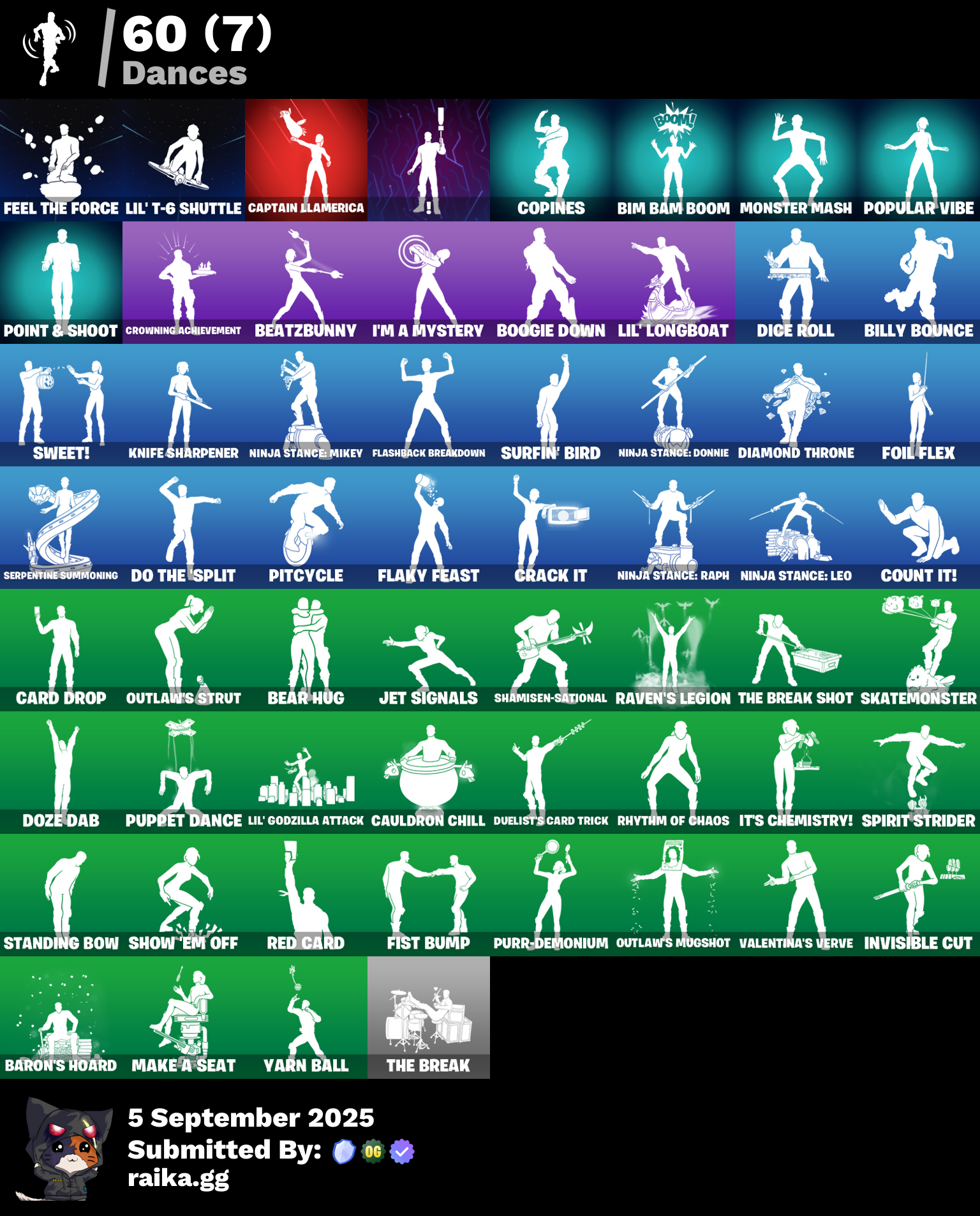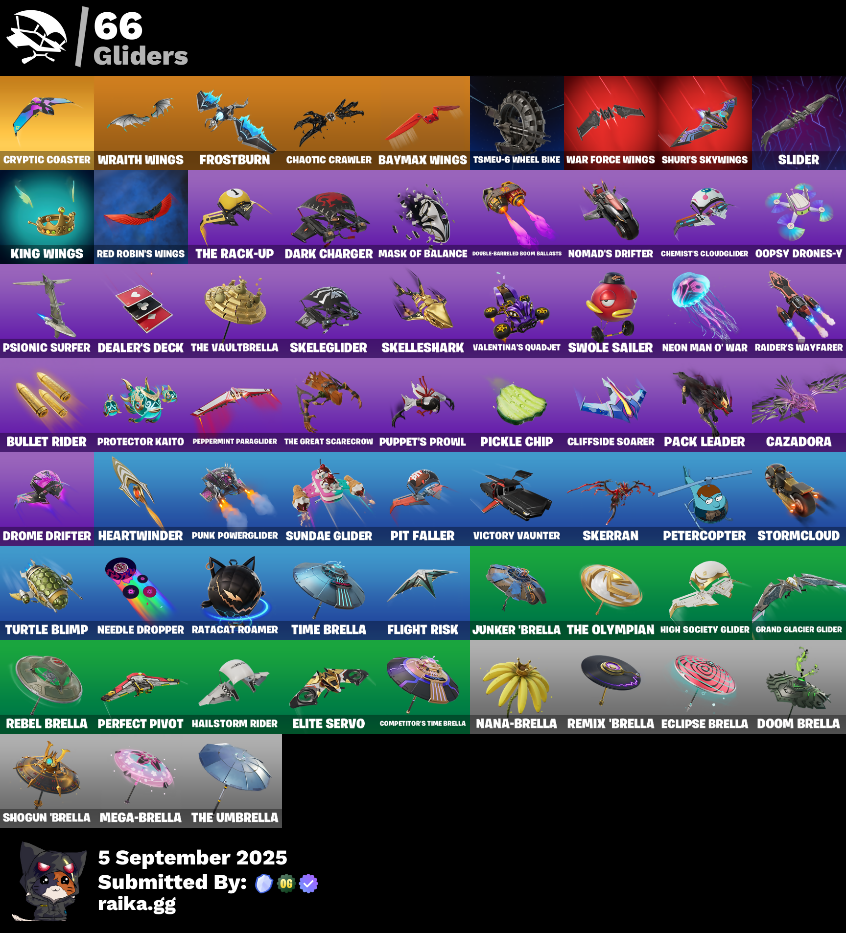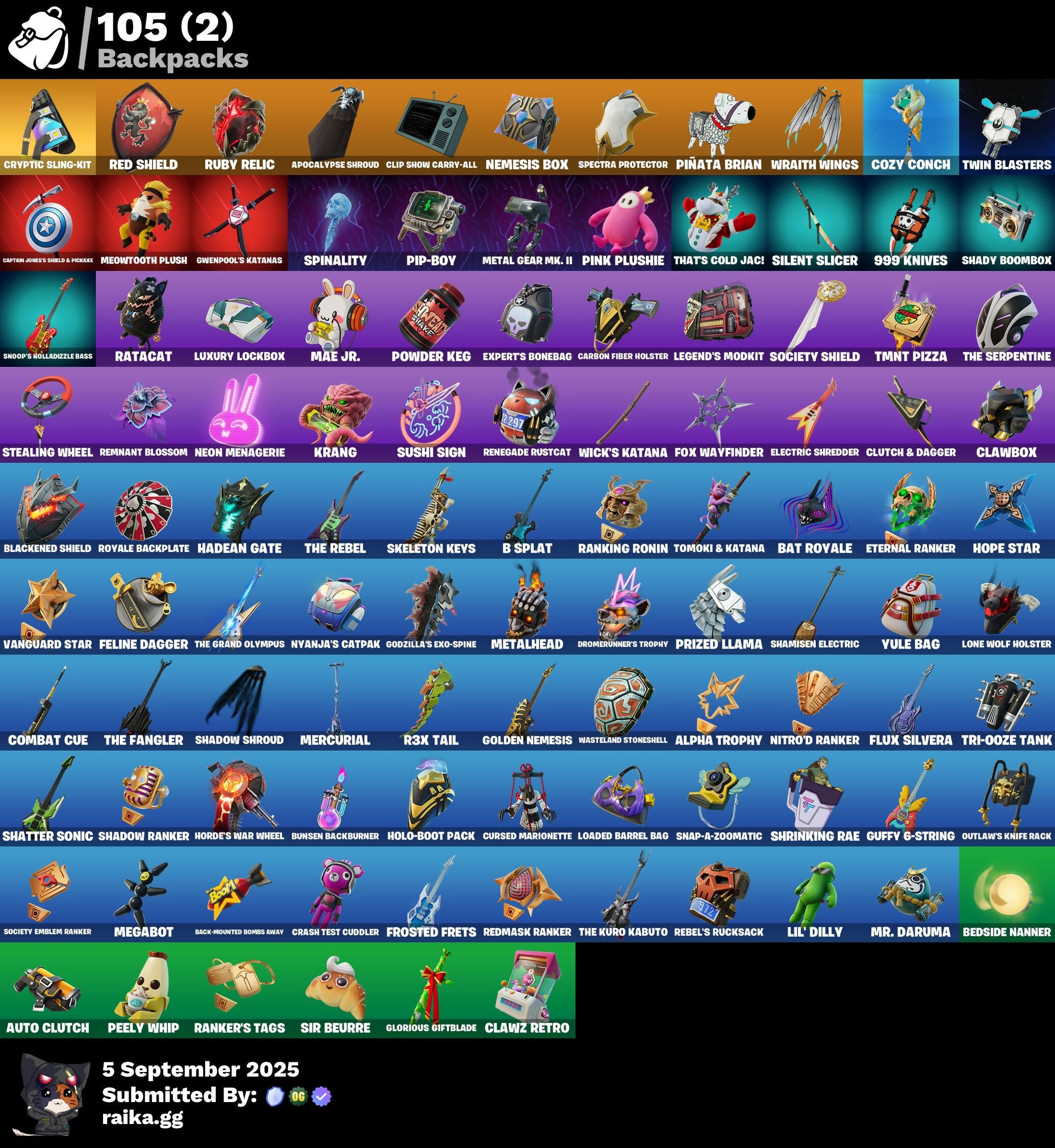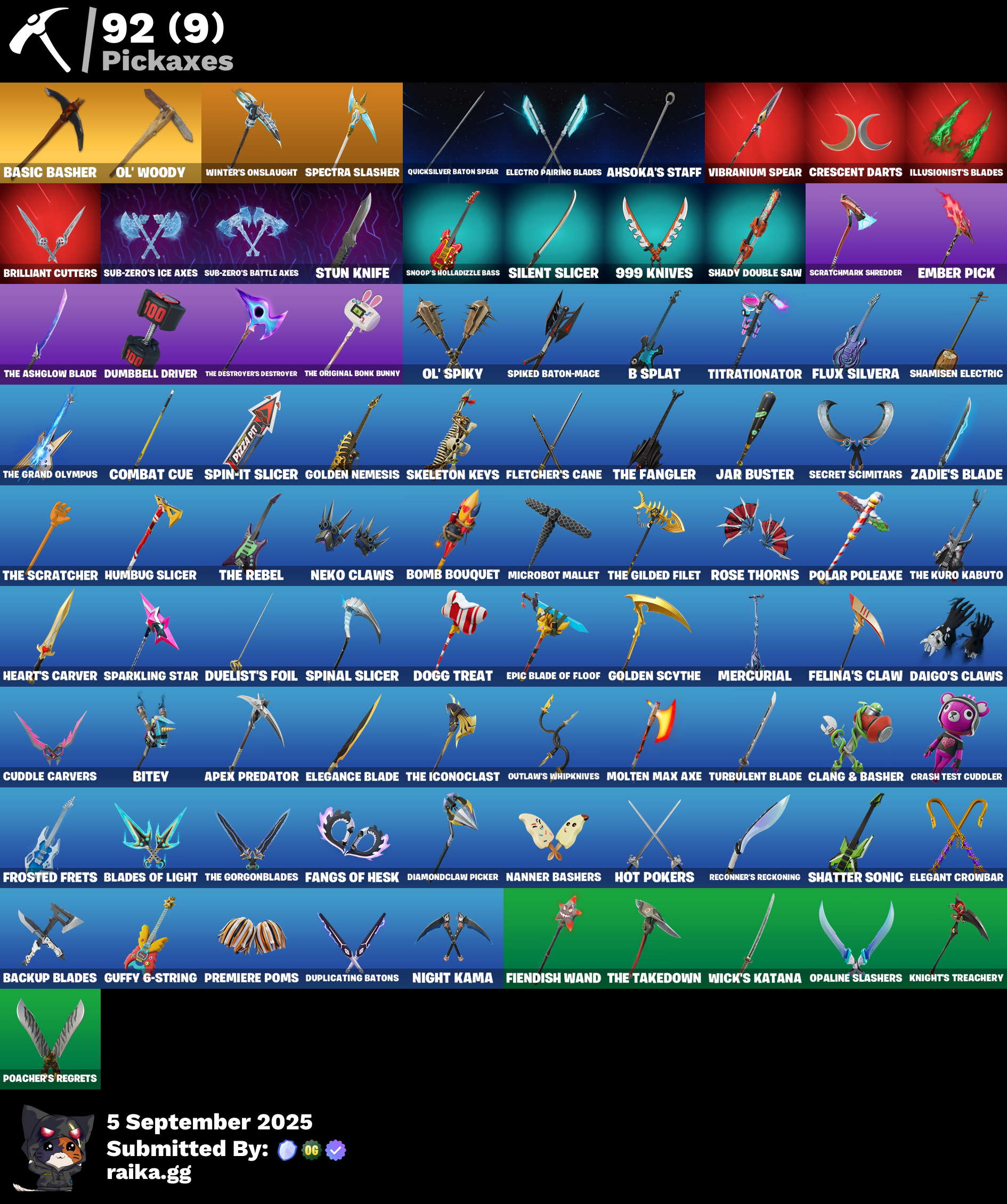 999 Knives, Ahsoka Tano, Ahsoka's Staff, Alpha Trophy, Antonia, Apex Predator, Apocalypse Shroud, Apprentice Evie, Aura, Auto Clutch, B Splat, Backup Blades, Baron's Hoard, Basic Basher, Bat Royale, Baymax Wings, Bear Hug, Beatzbunny, Bedside Nanner, Bi-Han, Billy Bounce, Bim Bam Boom, Bitey, Blackened Shield, Blades of Light, Bomb Bouquet, Boogie Down, Brilliant Cutters, Bullet Rider, Bunsen Backburner, Burning Ambition Valeria, Captain Jones's Shield & Pickaxe, Captain Llamerica, Carbon Fiber Holster, Card Drop, Cassidy Quinn, Cauldron Chill, Cazadora, Chalked Up 1-Ball, Chaotic Crawler, Chemist's Cloudglider, Clang & Basher, Clawbox, Clawz Retro, Cliffside Soarer, Clip Show Carry-All, Clutch & Dagger, Combat Cue, Competitor's Time Brella, Copines, Count It!, Cozy Conch, Crack It, Crash Test Cuddler, Crescent Darts, Crowning Achievement, Cryptic Coaster, Cryptic Sling-Kit, Crystal, Cuddle Carvers, Cursed Marionette, Daigo's Claws, Dark Charger, Dealer's Deck, Demon Hunter Hope, Diamond Throne, Diamondclaw Picker, Dice Roll, Dillinger The Gherk, Do The Split, Dogg Treat, Doom Brella, Double-Barreled Boom Ballasts, Doze Dab, Drome Drifter, Dromerunner's Trophy, Duelist's Card Trick, Duelist's Foil, Dumbbell Driver, Duplicating Batons, Dynamo Tntoon-A, Eclipse Brella, Electric Shredder, Electro Pairing Blades, Elegance Blade, Elegant Crowbar, Elite Servo, Ember Pick, Epic Blade of Floof, Eternal Ranker, Expert's Bonebag, Fancy Peter Griffin, Fangs of Hesk, Feel The Force, Felina, Felina's Claw, Feline Dagger, Fiendish Wand, Fish Thicc, Fist Bump, Flaky Feast, Flashback Breakdown, Fletcher Kane, Fletcher's Cane, Flight Risk, Flux Silvera, Foil Flex, Fox Wayfinder, Frostburn, Frosted Frets, Glorious Giftblade, Godzilla's Exo-Spine, Golden Nemesis, Golden Scythe, Grand Glacier Glider, Guardian Jade, Guffy 6-String, Gunslinger Outlaw Midas, Gwenpool's Katanas, Hadean Gate, Hailstorm Rider, Harbinger Armor Omegarok, Heart's Carver, Heartwinder, High Society Glider, Holiday Boxy, Holo-Boot Pack, Hope, Hope Star, Horde's War Wheel, Hot Pokers, Humbug Slicer, I'm A Mystery, Illusionist's Blades, Invisible Cut, It's Chemistry!, Jar Buster, Jet Signals, Joss, Junker 'Brella, Kado Thorne, Keisha Cross, Kendo, King Wings, Kintsugi Daigo, Knife Sharpener, Knights Treachery, Krang, Legend's Modkit, Lil' Dilly, Lil' Godzilla Attack, Lil' Longboat, Lil' T-6 Shuttle, Loaded Barrel Bag, Lone Wolf Holster, Lucky Nyanja, Luxury Lockbox, Mae, Mae Jr., Make A Seat, Mask of Balance, Mega-Brella, Megabot, Meowtooth Plush, Mercurial, Metal Gear Mk. II, Metalhead, Microbot Mallet, Midnight Skye, Molten Max Axe, Monster Mash, Mr. Daruma, Nana-Brella, Nanner Bashers, Needle Dropper, Neko Claws, Nemesis Box, Neon Man O' War, Neon Menagerie, Night Kama, Ninja Stance: Donnie, Ninja Stance: Leo, Ninja Stance: Mikey, Ninja Stance: Raph, Nisha, Nitro'd Ranker, Nolan Chance, Nomad's Drifter, Nyanja's Catpak, Ol' Spiky, Ol' Woody, Old Snake, Oopsy Drones-Y, Opaline Slashers, Outlaw's Knife Rack, Outlaw's Mugshot, Outlaw's Strut, Outlaw's Whipknives, Pack Leader, Peely Whip, Peppermint Paraglider, Perfect Pivot, Petercopter, Pickle Chip, Pinata Brian, Pink Plushie, Pip-Boy, Piper Pace, Pit Faller, Pitcycle, Poacher's Regrets, Point & Shoot, Polar Poleaxe, Popular Vibe, Powder Keg, Premiere Poms, Prized Llama, Protector Kaito, Psionic Surfer, Punk Powerglider, Puppet Dance, Puppet's Prowl, Purr-Demonium, Quicksilver Baton Spear, R3X Tail, Raider's Wayfarer, Ranker's Tags, Ranking Ronin, Rap Boy, Ratacat, Ratacat Roamer, Raven's Legion, Rebel Brella, Rebel's Rucksack, Recon Expert, Reconner's Reckoning, Red Card, Red Knight, Red Robin's Wings, Red Shield, Redmask Ranker, Remix 'Brella, Remnant Blossom, Renegade Rustcat, Rhythm Of Chaos, Rose Thorns, Rough Cut Montague, Royale Backplate, Ruby Relic, Runway Racer, Samurai Baymax, Santa Dogg, Scratchmark Shredder, Secret Scimitars, Serpentine Summoning, Shadow Meowdas, Shadow Ranker, Shadow Shroud, Shadowstruck Director, Shady Boombox, Shady Double Saw, Shamisen Electric, Shamisen-Sational, Shatter Sonic, Shock Brawler Oscar, Shogun 'Brella, Show 'Em Off, Shrinking Rae, Shuri's Skywings, Silas Hesk, Silent Slicer, Sir Beurre, Skatemonster, Skeleglider, Skeleton Keys, Skelleshark, Skerran, Skull Scout, Slayer Juice Wrld, Slider, Slim Shady, Slingshot, Snap-A-Zoomatic, Snoop's Holladizzle Bass, Society Emblem Ranker, Society Shield, Sparkling Star, Spectra Knight, Spectra Protector, Spectra Slasher, Spiked Baton-Mace, Spin-It Slicer, Spinal Slicer, Spinality, Spirit Strider, Standing Bow, Stealing Wheel, Stormcloud, Stun Knife, Sub-Zero's Battle Axes, Sub-Zero's Ice Axes, Subzero Cryptic, Sundae Glider, Surfin' Bird, Sushi Sign, Sweet!, Swole Sailer, TMNT Pizza, That's Cold Jac!, The Ashglow Blade, The Break, The Break Shot, The Destroyer's Destroyer, The Fangler, The Gilded Filet, The Gorgonblades, The Grand Olympus, The Great Scarecrow, The Iconoclast, The Kuro Kabuto, The Night Rose, The Olympian, The Original Bonk Bunny, The Rack-Up, The Rebel, The Scratcher, The Serpentine, The Takedown, The Umbrella, The Vaultbrella, Time Breaker Lil Split, Time Breaker Renegade Lynx, Time Brella, Titrationator, Tomoki & Katana, Traditional Khaby, Tri-ooze Tank, Tsmeu-6 Wheel Bike, Turbulent Blade, Turtle Blimp, Twin Blasters, Underground Jones, Valentina, Valentina's Quadjet, Valentina's Verve, Vanguard Star, Verge, Vibranium Spear, Victory Vaunter, War Force Wings, Wasteland Stoneshell, Whiplash, Wick's Katana, Winter's Onslaught, Winterfest Bushranger, Wraith Wings, Yarn Ball, Yule Bag, Yulejacket, Zadie's Blade