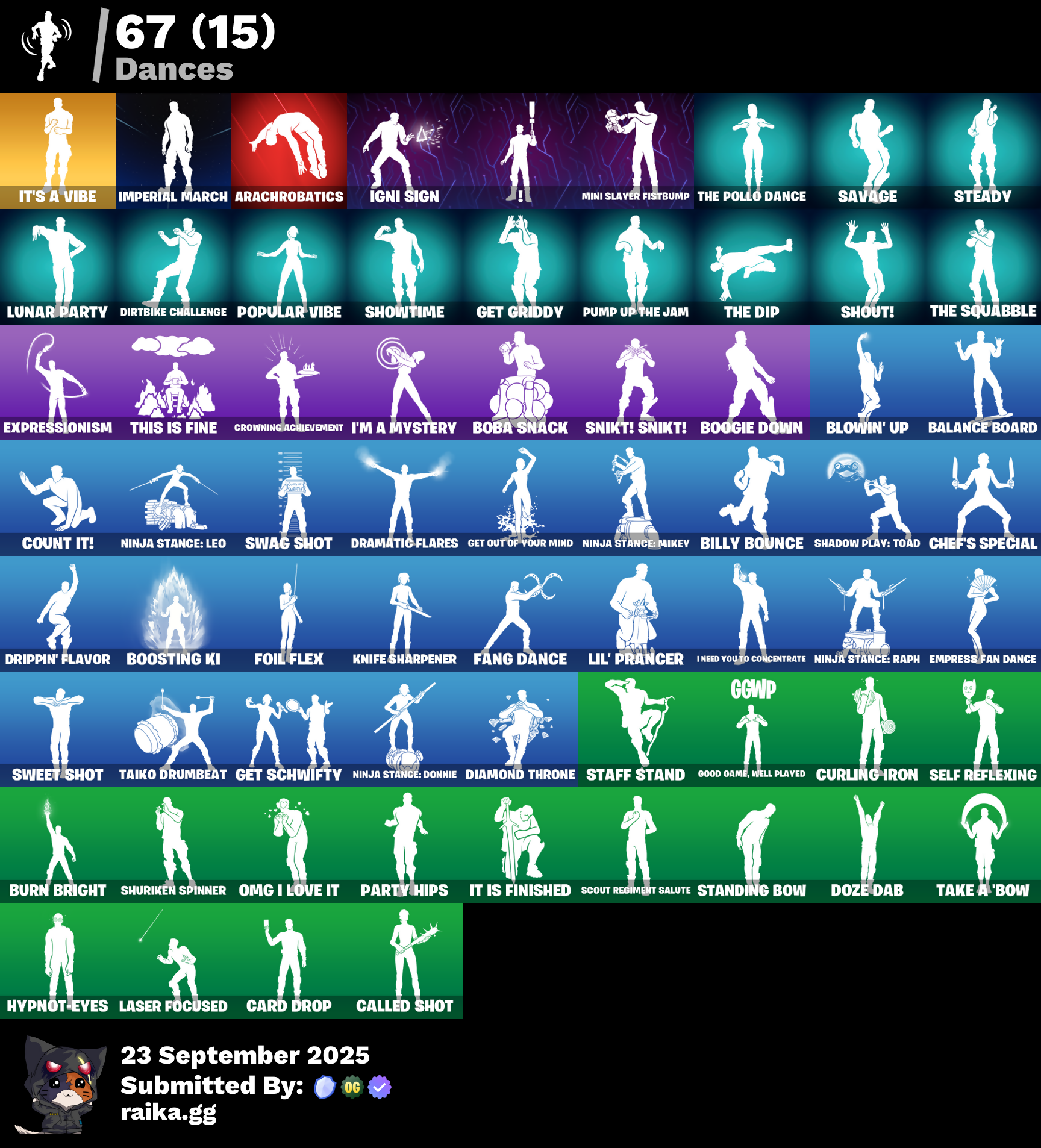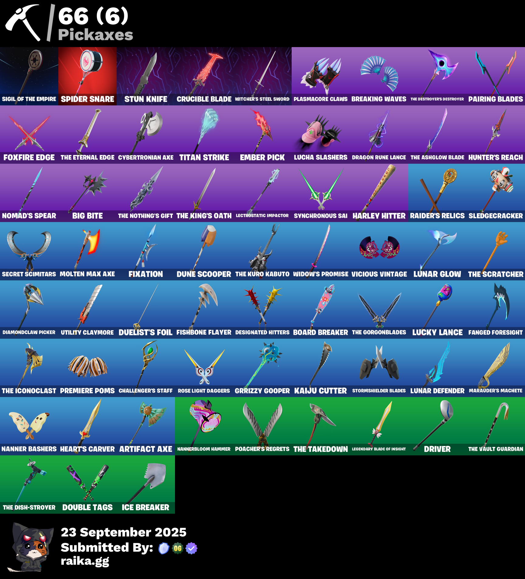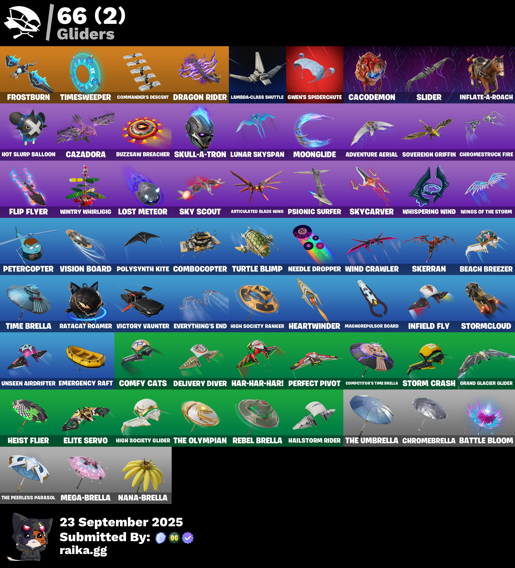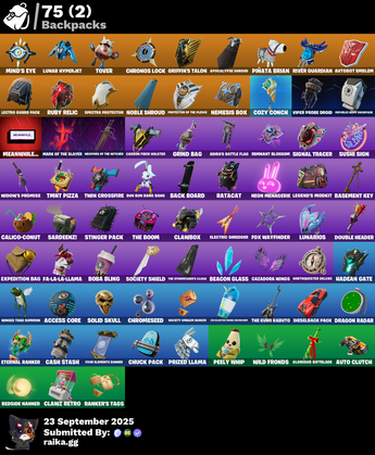 Access Core, Adira (Battle Mask), Adira's Battle Flag, Adventure Aerial, Apocalypse Shroud, Arachrobatics, Arctic Adeline, Articulated Blade Wing, Artifact Axe, Ascension Nezumi, Astro Armor, Aura, Auto Clutch, Autobot Emblem, Back Board, Backlash, Balance Board, Basement Key, Battle Bloom, Battle-Tested, Beach Breezer, Beacon Glass, Bedside Nanner, Big Bite, Billy Bounce, Blowin' Up, Board Breaker, Boba Bling, Boba Snack, Boogie Down, Boosting Ki, Breaking Waves, Bubblegum Highwire, Bullpen Brawler Dusty, Bun Bun Bang Bang, Burn Bright, Burning Ambition Valeria, Buzzsaw Breacher, Bytes (Lone Traveler), Cacodemon, Calico-Conut, Called Shot, Carbon Fiber Holster, Card Drop, Cash Stash, Cazadora, Cazadora Wings, Challenger's Staff, Chef's Special, Chrome Punk, Chromebrella, Chromeseed, Chromestruck Fire, Chronos Lock, Chuck Pack, Clawbox, Clawz Retro, Club President Helsie, Combocopter, Comfy Cats, Commander's Descent, Competitor's Time Brella, Count It!, Cozy Conch, Crowning Achievement, Crucible Blade, Curling Iron, Cybertronian Axe, Darth Vader, Dawn Duelist Nisha, Delivery Diver, Designated Hitters, Diamond Throne, Diamondclaw Picker, Dieselback Pack, Dirtbike Challenge, Double Header, Double Tags, Doze Dab, Dragon Radar, Dragon Rider, Dragon Rune Lance, Dramatic Flares, Drippin' Flavor, Driver, Duelist's Foil, Dune Scooper, Electric Shredder, Elite Servo, Ember Pick, Emergency Raft, Empress Fan Dance, Eren Jaeger, Eternal Ranker, Everything's End, Evie (Summer Strider), Expedition Bag, Expressionism, Fa-La-La-Llama, Fancy Peter Griffin, Fang Dance, Fanged Foresight, Fishbone Flayer, Fixation, Flip Flyer, Focus, Foil Flex, Four Elements Banner, Fox Wayfinder, Foxfire Edge, Frostburn, Get Griddy, Get Out Of Your Mind, Get Schwifty, Glorious Giftblade, Good Game, Well Played, Grand Glacier Glider, Griffin's Talon, Grind Bag, Grizz (Wild Beary Grriz), Grrizzy Gooper, Guff Gringle, Gwen's Spiderchute, Hadean Gate, Hailstorm Rider, Har-Har-Har!, Harley Hitter, Heart's Carver, Heartwinder, Heist Flier, High Society Glider, High Society Ranker, Holiday Boxy, Hope, Hot Slurp Balloon, Hunter's Reach, Hypnot-Eyes, I Need You To Concentrate, I'm A Mystery, Ice Breaker, Ice-Blasted Snow Crunchem, Iconic Era, Igni Sign, Imperial March, Indiana Jones (Temple Explorer), Infield Fly, Inflate-A-Roach, It Is Finished, It's A Vibe, Kaiju Cutter, King Flamingo, Knife Sharpener, Lambda-Class Shuttle, Laser Focused, Lectro Guard Pack, Lectrostatic Impactor, Legend's Modkit, Legendary Blade of Insight, Lennox Rose, Lil' Prancer, Lorenzo the Reckless, Lost Meteor, Lucha Slashers, Lucky Lance, Lunar Defender, Lunar Glow, Lunar Hyperjet, Lunar Party, Lunar Skyspan, Lunarios, Magmatic Mizuki, Magnorepulsor Board, Malik (Solitary Defender), Marauder's Machete, Mark Of The Slayer, Marked Marauder, Meanwhile..., Mega Wave Imani, Mega Wave Thunder, Mega-Brella, Meow Skulls, Mind's Eye, Mini Slayer Fistbump, Molten Max Axe, Moonglide, Nana-Brella, Nanner Bashers, Nannerbloom Hammer, Needle Dropper, Nemesis Box, Neon Menagerie, Ninja Stance: Donnie, Ninja Stance: Leo, Ninja Stance: Mikey, Ninja Stance: Raph, Noble Shroud, Nomad's Spear, Northquester Deluxe, Omg I Love It, Pairing Blades, Paradigm (Aurelian), Party Hips, Peely Whip, Perfect Pivot, Petercopter, Piñata Brian, Plasmacore Claws, Poacher's Regrets, Polysynth Kite, Popular Vibe, Premiere Poms, Prized Llama, Protector Of The Pledge, Psionic Surfer, Pump Up The Jam, Purradise Meowscles, Raider's Relics, Ranker's Tags, Ratacat, Ratacat Roamer, Rebel Brella, Regal Hunter Mariposa, Regal Hunter Relik, Regal Hunter Rian, Regal Hunter Trace, Remnant Blossom, Republic Army Backpack, River Guardian, Rococo Cloak-0, Rose Light Daggers, Rough Cut Montague, Ruby Relic, Runway Racer, Sabina (Ponytail), Sardeenz!, Savage, Scout Regiment Salute, Scuba Crystal, Secret Scimitars, Self Reflexing, Shadow Play: Toad, Shock Brawler Oscar, Shout!, Showtime, Shuriken Spinner, Sigil Of The Empire, Signal Tracer, Skerran, Skull-A-Tron, Sky Scout, Skycarver, Sled Ready Guff, Sledgecracker, Slider, Snap, Snikt! Snikt!, Society Emblem Ranker, Society Shield, Solid Skull, Solid Snake, Sovereign Griffin, Spectra Protector, Spider Snare, Spider-Gwen (Gwen Stacy), Staff Stand, Standing Bow, Steady, Stinger Pack, Storm Crash, Stormcloud, Stormfarer (Storm Brawler), Stormshielder Blades, Stray, Stun Knife, Sunlit Selene, Sushi Sign, Swag Shot, Sweet Shot, Synchronous Sai, Taiko Drumbeat, Take A 'Bow, The Ageless Champion, The Ashglow Blade, The Boom, The Destroyer's Destroyer, The Dip, The Dish-Stroyer, The Eternal Edge, The Gorgonblades, The Iconoclast, The King's Oath, The Kuro Kabuto, The Nothing's Gift, The Olympian, The Peerless Parasol, The Pollo Dance, The Scratcher, The Squabble, The Stormfarers Cloak, The Takedown, The Umbrella, The Vault Guardian, This Is Fine, Thrasher Massai, Time Brella, Timesweeper, Titan Strike, Tmnt Pizza, Tover, Turtle Blimp, Twin Crossfire, Twyn (Pastel Stryder), Unseen Airdrifter, Utility Claymore, Vengeance Jones, Vicious Vintage, Victory Vaunter, Viper Probe Droid, Viper School, Vision Board, Weapons Of The Witcher, Whispering Wind, Widow's Promise, Wild Fronds, Wind Crawler, Winged Toad Summon, Wings of the Storm, Winterfest Bushranger, Wintersong Mystica, Wintry Whirligig, Witcher's Steel Sword