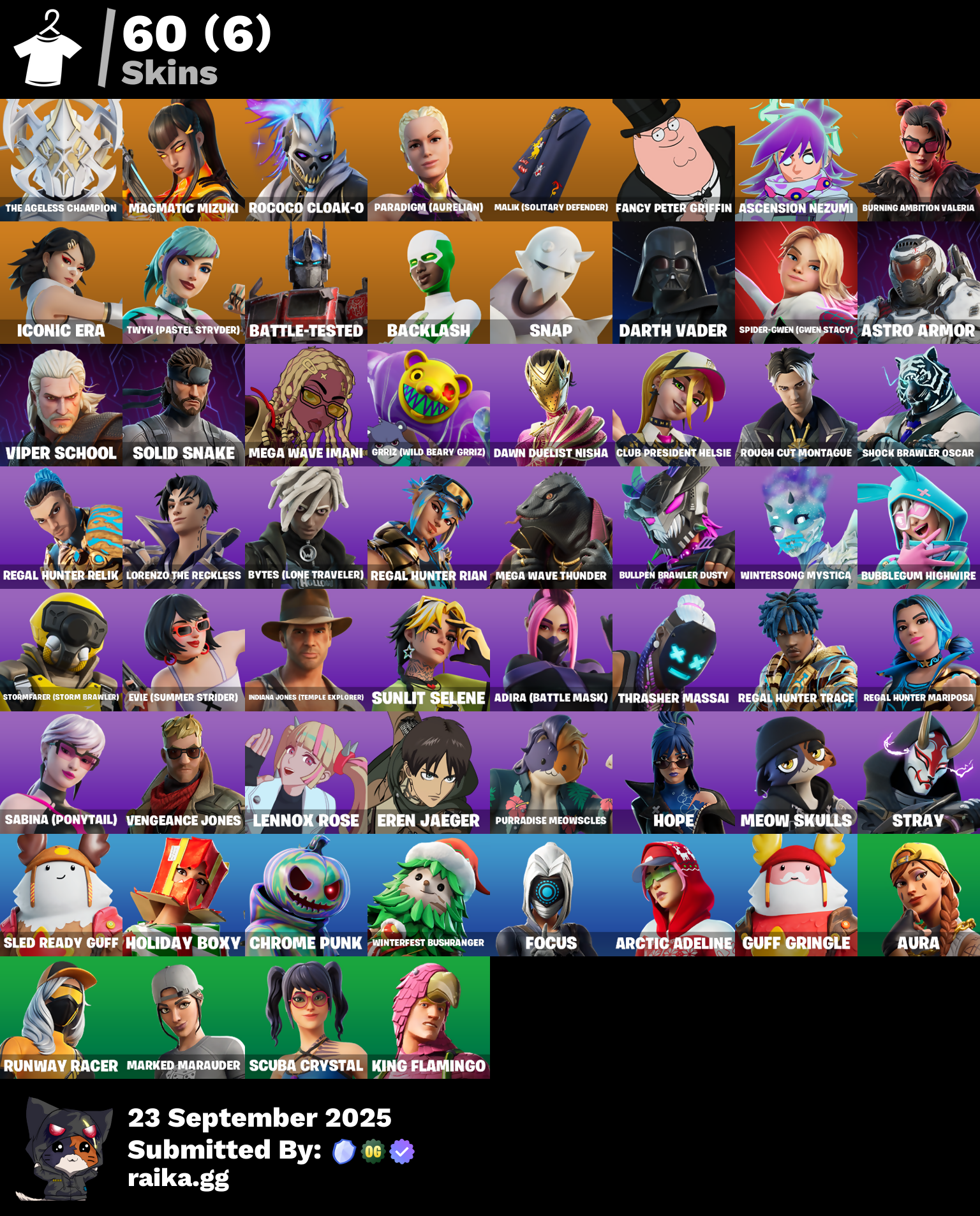 60 TOP SKINS [PC/PSN/XBOX]|THE AGELESS CHAMPION ✅ MAGMATIC MIZUKI ✅ ROCOCO CLOAK-O ✅ PARADIGM (AURELIAN) ✅ MALIK (SOLITARY DEFENDER) ✅ FANCY PETER GRIFFIN