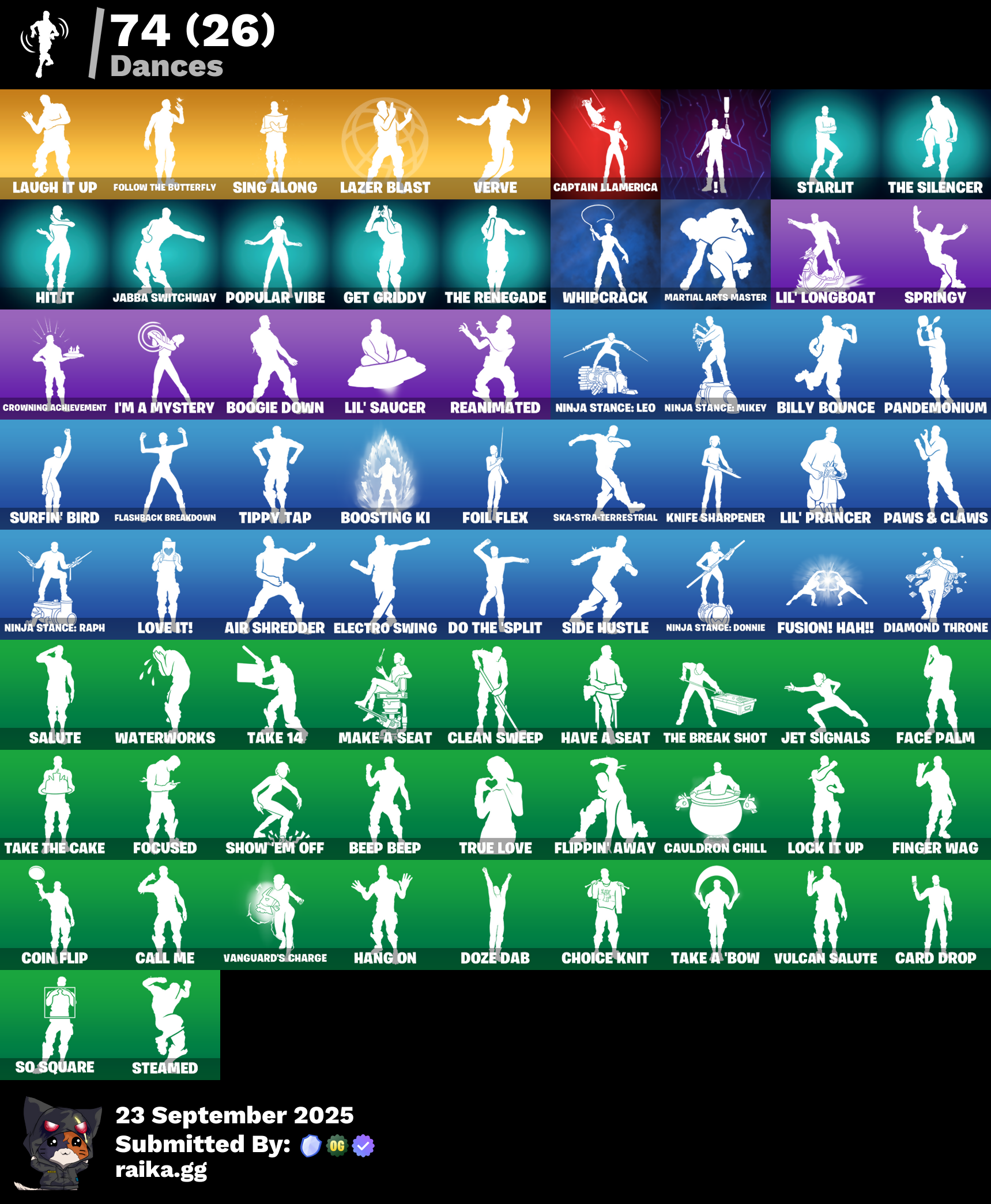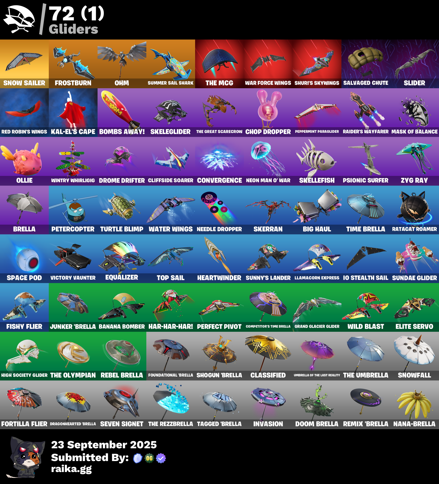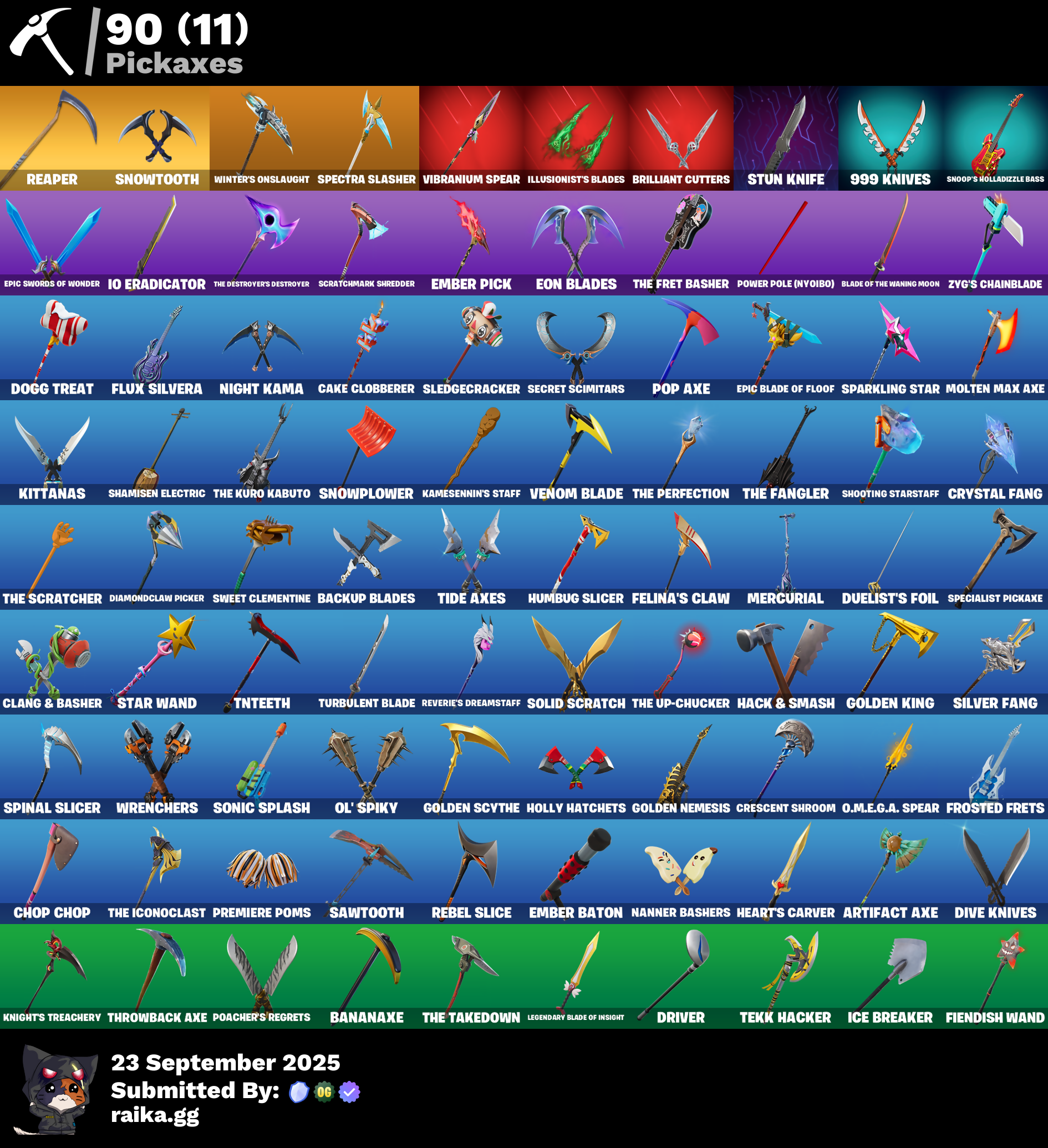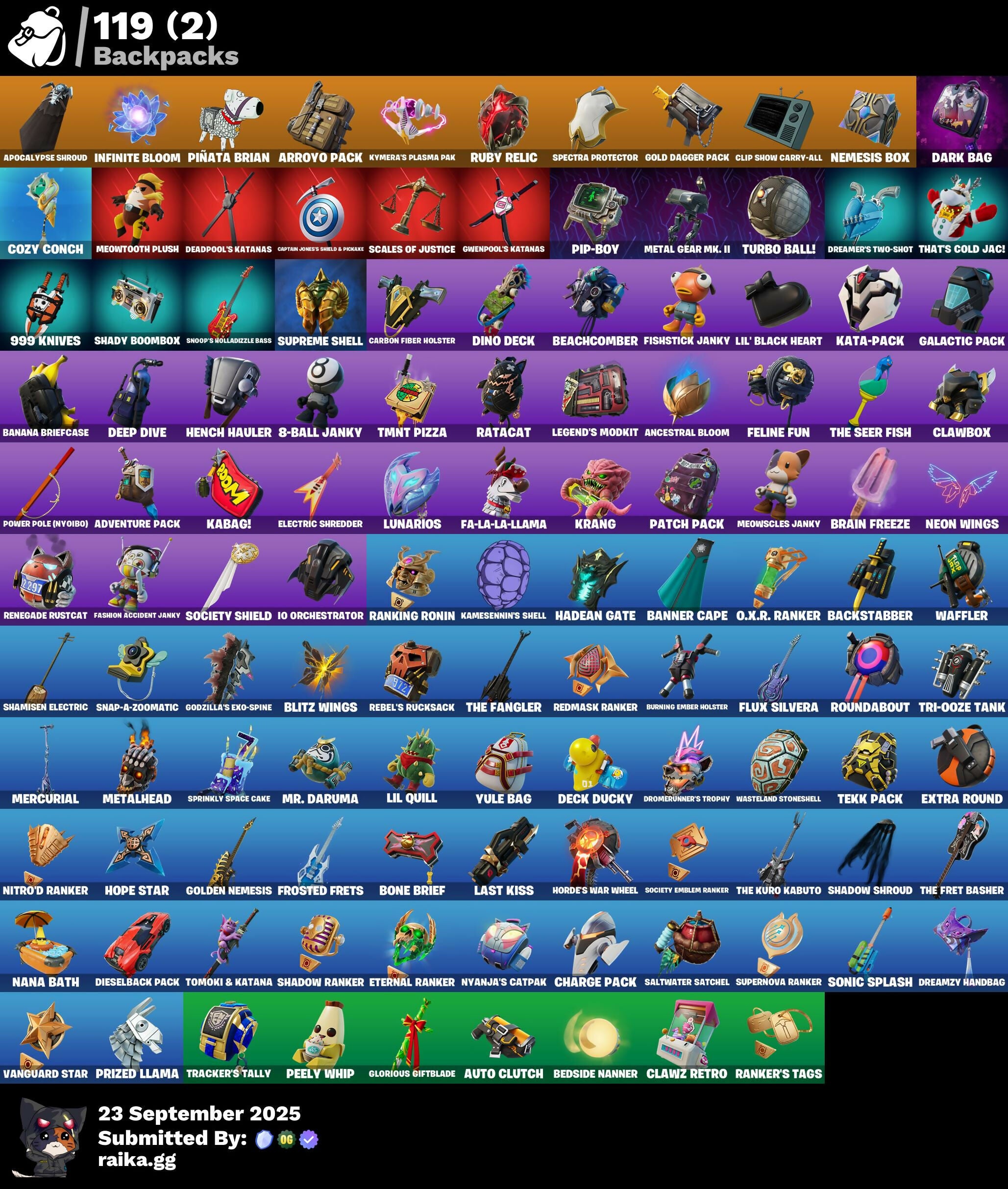 8-Ball Janky, 999 Knives, Adventure Pack, Agent Peely, Air Shredder, Ancestral Bloom, Apocalypse Shroud, Arctic Adeline, Arroyo Pack, Artifact Axe, Aura, Auto Clutch, Backstabber, Backup Blades, Banana Bomber, Banana Briefcase, Bananaxe, Banner Cape, Beachcomber, Bedside Nanner, Beep Beep, Beerus, Big Haul, Billy Bounce, Blade Of The Waning Moon, Blitz Wings, Bombs Away!, Bone Brief, Boogie Down, Boosting Ki, Brain Freeze, Brella, Brilliant Cutters, Brutus, Bullseye, Burning Ambition Valeria, Burning Ember Holster, Cake Clobberer, Call Me, Captain Jonse's Shield & Pickaxe, Captain Llamerica, Carbon Fiber Holster, Card Drop, Cauldron Chill, Charge Pack, Choice Knit, Chop Chop, Chop Dropper, Clang & Basher, Classified, Clawbox, Clawz Retro, Clean Sweep, Cliffside Soarer, Clip Show Carry-All, Coin Flip, Competitor's Time Brella, Convergence, Cozy Conch, Crescent Shroom, Crowning Achievement, Crystal, Crystal Fang, Dark Bag, Dark Bomber, Dark Doggo, Dawn Duelist Nisha, Deadpool Unmasked, Deadpool's Katanas, Deck Ducky, Deep Dive, Diamond Throne, Diamondclaw Picker, Dieselback Pack, Dino Deck, Dive Knives, Dizzie, Do The Split, Dogg Treat, Doom Brella, Doze Dab, Dragonhearted 'Brella, Dreamer's Two-Shot, Dreamzy Handbag, Driver, Drome Drifter, Dromerunner's Trophy, Duelist's Foil, Electric Shredder, Electro Swing, Elite Servo, Ember Baton, Ember Pick, Eon Blades, Epic Blade Of Floof, Epic Swords Of Wonder, Equalizer, Eternal Ranker, Extra Round, Fa-La-La-Llama, Face Palm, Fade, Fancy Peter Griffin, Fashion Accident Janky, Felina, Felina's Claw, Feline Fun, Fiendish Wand, Finger Wag, Fishstick, Fishstick Janky, Fishy Flier, Flashback Breakdown, Flippin' Away, Flux Silvera, Focused, Foil Flex, Follow The Butterfly, Fortilla Flier, Foundational 'Brella, Frostburn, Frosted Frets, Fusion! Hah!!, Galactic Pack, Gear Specialist Maya, Get Griddy, Glorious Giftblade, Godzilla's Exo-Spine, Gold Dagger Pack, Gold Midas, Golden King, Golden Nemesis, Golden Scythe, Grand Glacier Glider, Guff Gringle, Guggimon, Gwenpool's Katanas, Hack & Smash, Hadean Gate, Hairpin, Hang On, Har-Har-Har!, Harbinger Armor Omegarok, Have A Seat, Heart's Carver, Heartwinder, Hench Hauler, High Society Glider, Hit It, Holiday Boxy, Holly Hatchets, Hope, Hope Star, Horde's War Wheel, Humbug Slicer, I'm A Mystery, IO Orchestrator, Ice Breaker, Illusionist's Blades, Infinite Bloom, Invasion, Io Eradicator, Io Stealth Sail, Iris, Jabba Switchway, Jet Signals, Joey, Jules, Jun-Hwan, Junker 'Brella, Kabag!, Kal-El's Cape, Kamesennin's Shell, Kamesennin's Staff, Kata-Pack, Kit, Kittanas, Knife Sharpener, Knight's Treachery, Krang, Kymera, Kymera's Plasma Pak, Last Kiss, Laugh It Up, Lazer Blast, Legend's Modkit, Legendary Blade Of Insight, Lil Quill, Lil' Black Heart, Lil' Longboat, Lil' Prancer, Lil' Saucer, Llamacorn Express, Lock It Up, Love It!, Lunarios, Major Mancake, Make A Seat, Marked Marauder, Martial Arts Master, Mask of Balance, Masked, Meowscles, Meowscles Janky, Meowtooth Plush, Mercurial, Metal Gear Mk. II, Metalhead, Mission Specialist, Molten Max Axe, Mr. Daruma, Nana Bath, Nana-Brella, Nanner Bashers, Needle Dropper, Nemesis Box, Neon Man O' War, Neon Wings, Night Kama, Ninja Stance: Donnie, Ninja Stance: Leo, Ninja Stance: Mikey, Ninja Stance: Raph, Nitro'd Ranker, Nyanja's Catpak, O.M.E.G.A. Spear, O.X.R. Ranker, Ohm, Ol' Spiky, Old Snake, Ollie, Pandemonium, Patch Pack, Paws & Claws, Peely Whip, Peppermint Paraglider, Perfect Pivot, Petercopter, Pip-Boy, Piñata Brian, Poacher's Regrets, Pop Axe, Popular Vibe, Power Pole (Nyoibo), Premiere Poms, Prized Llama, Psionic Surfer, Raider's Wayfarer, Ranker's Tags, Ranking Ronin, Ratacat, Ratacat Roamer, Reanimated, Reaper, Rebel Brella, Rebel Slice, Rebel's Rucksack, Red Jade, Red Robin's Wings, Redmask Ranker, Remix 'Brella, Renegade Rustcat, Reverie, Reverie's Dreamstaff, Riptide, Rough Cut Montague, Roundabout, Ruby Relic, Runway Racer, Saltwater Satchel, Salute, Salvaged Chute, Santa Dogg, Sawtooth, Scales of Justice, Scratchmark Shredder, Secret Scimitars, Seven Signet, Shadow Ranker, Shadow Shroud, Shady Boombox, Shamisen Electric, Shock Brawler Oscar, Shogun 'Brella, Shooting Starstaff, Show 'Em Off, Shuri's Skywings, Side Hustle, Silver Fang, Sing Along, Siren, Ska-stra-terrestrial, Skeleglider, Skellefish, Skerran, Skye, Slayer Juice Wrld, Sled Ready Guff, Sledgecracker, Slider, Slim Shady, Snap-A-Zoomatic, Snoop's Holladizzle Bass, Snow Sailer, Snowfall, Snowplower, Snowtooth, So Square, Society Emblem Ranker, Society Shield, Solid Scratch, Son Goku, Sonic Splash, Space Pod, Sparkling Star, Specialist Pickaxe, Spectra Knight, Spectra Protector, Spectra Slasher, Spinal Slicer, Springy, Sprinkly Space Cake, Star Wand, Starlit, Steamed, Stun Knife, Summer Sail Shark, Sunburst Dawn, Sundae Glider, Sunny, Sunny's Lander, Supernova Ranker, Supreme Shell, Surfin' Bird, Sweet Clementine, TMNT Pizza, Tagged 'Brella, Take 14, Take A 'Bow, Take The Cake, Tekk Hacker, Tekk Pack, That's Cold Jac!, The Break Shot, The Destroyer's Destroyer, The Fangler, The Fret Basher, The Great Scarecrow, The Iconoclast, The Kuro Kabuto, The Mcg, The Olympian, The Perfection, The Renegade, The Rezzbrella, The Scratcher, The Seer Fish, The Silencer, The Takedown, The Umbrella, The Up-Chucker, Throwback Axe, Tide Axes, Time Breaker Lil Split, Time Breaker Renegade Lynx, Time Brella, Tippy Tap, Tnteeth, Tntina, Tomoki & Katana, Top Sail, Tracker's Tally, Tri-Ooze Tank, True Love, Turbo Ball!, Turbulent Blade, Turtle Blimp, Umbrella of the Last Reality, Underground Jones, Vanguard Star, Vanguard's Charge, Venom Blade, Verve, Vibranium Spear, Victory Vaunter, Vulcan Salute, Waffler, War Force Wings, Wasteland Stoneshell, Water Wings, Waterworks, Whipcrack, Wild Blast, Winter's Onslaught, Winterfest Bushranger, Wintry Whirligig, Wrenchers, Yellowjacket, Yule Bag, Yulejacket, Zyg, Zyg Ray, Zyg's Chainblade