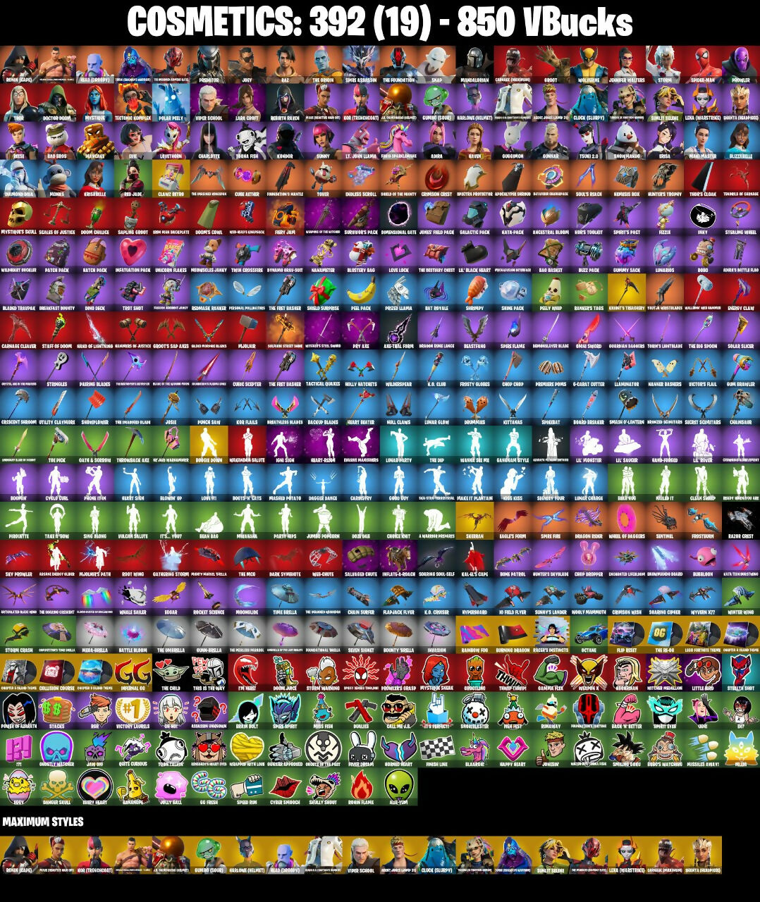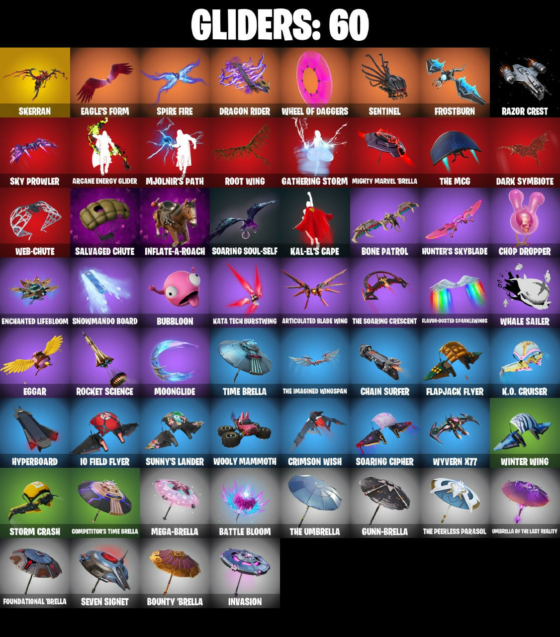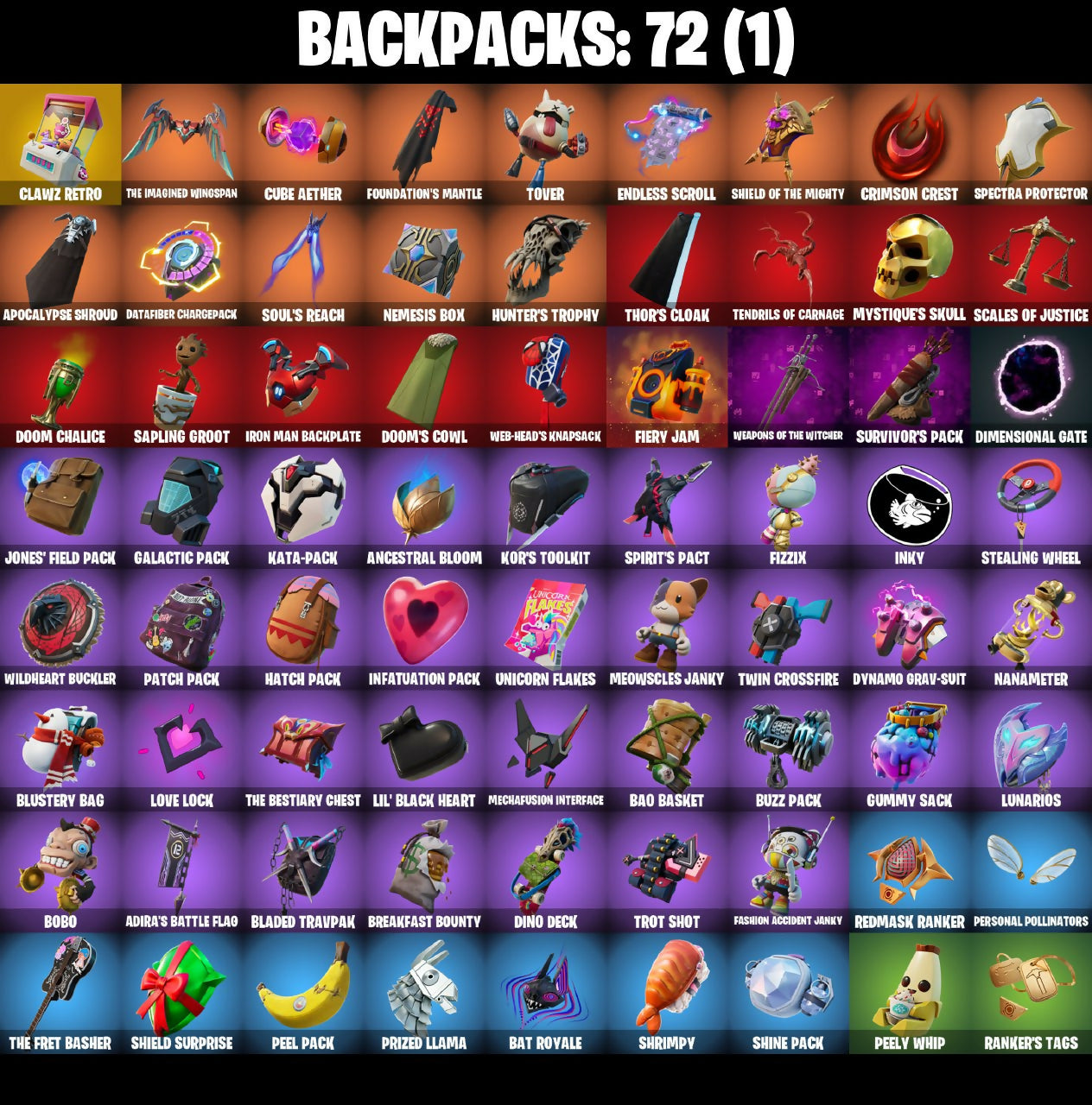 2.0's Revenge, 3D Field Flyer, 6-Carat Cutter, A Murphed Pearsian, A Warrior Prepares, A.I.M. (ghost variant), Acolyte's Curse, Adira, Adira's Armor, Adira's Battle Flag, Agent Jones (Jump 31), Agent Jones (jump 2), Alec-Yum, Alien, Ancestral Bloom, Apocalypse Shinobu, Apocalypse Shroud, Arcane Ebony Glider, Arcane Energy Glider, Arcane Knighthawk, Arcane Steel, Articulated Blade Wing, Assassin Unknown, Axe + Trail Form, Axe-tral Form, Azarath Metrion Zinthos!, BP!, Back N' Better, Backup Blades, Bad Basket, Bad Buns, Bao Basket, Bao Bros, Bass Drop, Bat Royale, Battle Bloom, Battletoad Flash Wing, Bavarian Charnok, Beamers, Bean Bag, Bear Hug, Beastfang, Blade of the Waning Moon, Bladed Trapbag, Bladed Travpak, Blaradg, Blizzabelle, Blowin' Up, Blown Up, Blustery Bag, Board Breaker, Bobo, Bolen of the Vanished Tribe, Bone Patrol, Boogie Down, Boomin', Boomkin, Boots 'N' Cats, Boots-N-Cats, Bounty 'brella, Bounty Brella, Brain Bolt, Breakfast Bounty, Breathless Blades, Brisa, Bronze Fist, Bronzed Scimitars, Bubblobon, Bubbloon, Buds Watching, Burning Dragon, Buzz Pack, C-Backs Cutter, Call Me B, Captain & Island Theme, Cardistry, Carnage (Maximum), Carnage Cleaver, Carnistry, Chain Surfer, Chainsaur, Chainsawur, Chapter 3 Island Theme, Chapter 4 Island Theme, Chapter 5 Island Theme, Charlotte, Chi-No, Chicka Kitty, Choice Knit, Chop Chop, Chop Dropper, Clanz Setro, Clawz Retro, Clean Sweep, Clock (slurpy), Cloudburst, Cluck (Slurpy), Clucking Mad, Collision Course, Competitor's Time Brella, Crescent Shroom, Crimson Crest, Crimson Wish, Crowning Achievement, Crownscratcher, Crystal Axe of the Masters, Cube Aether, Cubed, Cubic Scepter, Cyber Shadow, Cyclo Curl, Dagger Dance, Damarope, Danger Skull, Dark Symbiote, Datafiber Chargepack, Dawn Sword, Dawnslayer Blade, Deep Future, Demonslayer Blade, Diamond Diva, Dimensional Camo, Dimensional Gate, Dino Deck, Doctor Doom, Dog Dad, Dogo, Doom Chalice, Doom Juice, Doom's Cowl, Doubles, Doze Dab, Dragon Bone Lance, Dragon Rider, Dragon Rune Lance, Drummais, Drummies, Dynamo Drop Suit, Dynamo Grav-Suit, Eagle's Form, Edgar, Eggar, Eggy, Enchanted Lifebloom, Enchanted Lifelong, Endless Scroll, Energy Claw, Envy, Erisa, Erisa's Crest, Evasive Maneuvers, Evie, Fabio Sparklemane, Fashion Accident Janky, Fever Dream, Fiery Flow, Fiery Jam, Finish Line, Fizzix, Flapjack Flyer, Flavor-Dusted Sparklewings, Flip Reset, Fornite Sparkman, Foundation's Mantle, Foundation's Plasma Spike, Foundational 'brella, Foundational Swell, Frostburn, Frosty Globes, Frosty's Globes, GG Fresh, Galactic Pack, Gamma Rex, Gangnam Style, Ganondham Style, Gathering Storm, Ghostly Watcher, Gilded Morphic Blades, Glidds Rampage Blades, Good Guy, Grav-Fusion, Groodlung, Groot, Groot's Sap Axes, Guardian Daggers, Guggimon, Gum Brawler, Gumbo (Sour), Gummy Sack, Gun Brawler, Gunn-Brella, Gunnar, Gunnar Approved, Gunnar's Special, Hagaa (corpsey), Hammer Bashers, Hammers of Justice, Hand of Lightning, Hand-Forged, Happy Heart, Harlowe (Helmet), Hatch Pack, Haven, Head (Droopy), Headmaster, Heart Beater, Heart Sign, Heart's Desire, Heart-Rizon, Heartbeat Boulder, Holly Hatchets, Holly Watches, Holo Master, Honeaster's with Love, Hop And A Wink, Horned Heart, Hugs Kiss, Hunter's Skyblade, Hunter's Spyblade, Hunter's Trophy, Hyperboard, I Am Fearless, I'm Here!, Icon Sign, Igni Sign, Infatuation Pack, Infernal Go, Inflate-A-Roach, Inflated-Roach, Inky, Invasion, Inventor's Choice, Io Field Flyer, Iron Man Backpack, Iron Man Backplate, It's... Yes?, It's... You?, J.B. Chimpanski (Helmet), Jaw Off, Jennifer Walters, Joey, John, Jolly Ball, Jones' Field Pack, Jonesin, Josie, Jr. Operation Specialist, Jumbo Popcorn, Jurassically Charged, K.O. Club, K.O. Cruiser, Kai-Li's Cape, Kai-Tech Burststone, Kal-El's Cape, Kaleidoscope Break, Kata Tech Burstwing, Kata-Pack, Kiara K.O. (Captain’s Bomber), King Maker, Kiss Kiss, Kittanas, Knight's Treachery, Kondor, Konor, Kor (Trenchcoat), Kor Flails, Kor's Toolkit, Krisabelle, Laminator, Lara Croft, Laser Blaze, Legendary Blade of Insight, Legendary Blur In Motion, Lego Fortnite Theme, Lena (warstrike), Lexa (Warstrike), Lil' Black Heart, Lil' Monster, Lil' Rover, Lil' Saucer, Lil' Saucier, Lion's Roar, Little Bird, Livetuna, Llaminator, Lloose Cannon, Lobby Classic, Lotus Touch, Love Fit, Love It!, Love Lock, Lovethorn, Lt. John Lama, Lt. John Llama, Lunabus, Lunar Change, Lunar Charge, Lunar Glow, Lunar Party, Lunarian Luxury, Lunarios, Make It Plantain, Maki Master, Mancake, Mandalorian, Mashed Potato, Massai Fire, Master Plan, Mave (Reactive Hair Off), Mechafusion Interface, Mega-Brella, Megadear Salute, Menace (Challenger Menace - Flame), Meowscles Janky, Midas Detective Style, Midas' Shadow, Mighty Mantle Stella, Mighty Marvel 'brella, Miss Fish, Missiles Away!, Mjolnir, Mjolnir's Path, Monks, Moonglide, Mooonglide, Morgana Wornum, Morphic Blue, Mwahaha, Mystique, Mystique Sneak, Mystique's Skull, NF-Jade Hardslammer, Nailed It, Nanameter, Nanner Bashers, Nata-Pack, Ne'jari Warhammer, Nebrius Box, Nemesis Box, Neo-Heart's Knapsack, Neon Dragon, Nervouscles Janky, Neverending Rise, Noble's Battle Ram, Nomad's Treasure, Null Claws, Oath & Sorrow, Obeyztle Pet Pee, Octane, Octave, King of the Rotors, Omni Sword, Oozey, Original Issue, Pairing Blades, Pancake Posse, Party Hips, Passing Blades, Patch Pack, Peaseme Pops, Peel Pack, Peely Whip, Per Aspera Ad Astra, Personal Phylactories, Personal Pollinators, Phone It In, Pirouette, Polar Peely, Power of Azarath, Pray Axe, Predator, Premiere Poms, Primate Space Program, Prized Llama, Prowler, Prowler's Grasp, Pry Axe, Punch Saw, Punisher Token, Quigman, Quite Curious, RGR, Racer's Instincts, Raider's Return, Rainbow Fog, Ranker's Tags, Raven, Raz, Razor Crest, Ready When You Are, Rebirth Raven, Red Jade, Redmask Ranger, Redmask Ranker, Reese, Rocket Science, Ronin (Cape), Ronin Flame, Root Wing, Runaway, Rush Fest, SKS Style-Purestiral, Salvaged Chute, Salvaged Cube, Sap, Sapling Groot, Scales of Ju