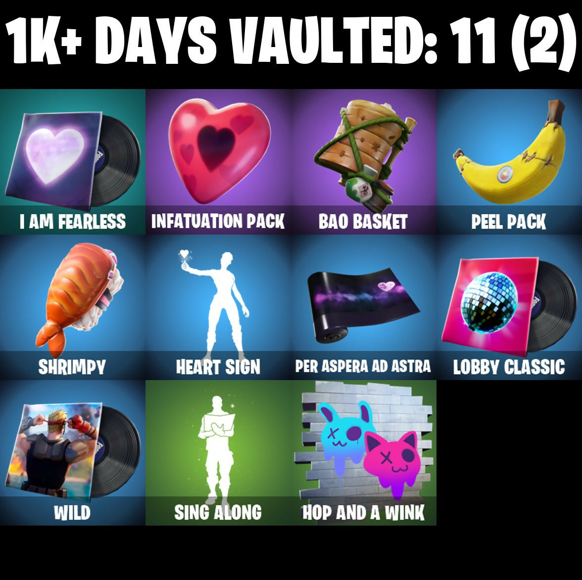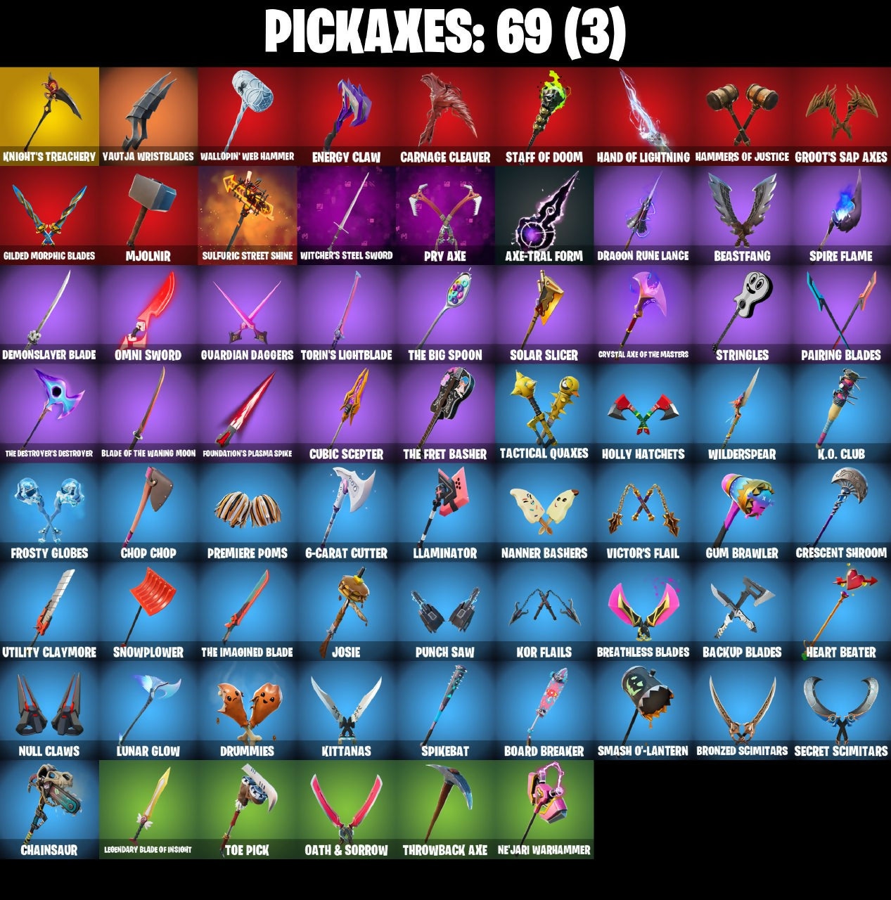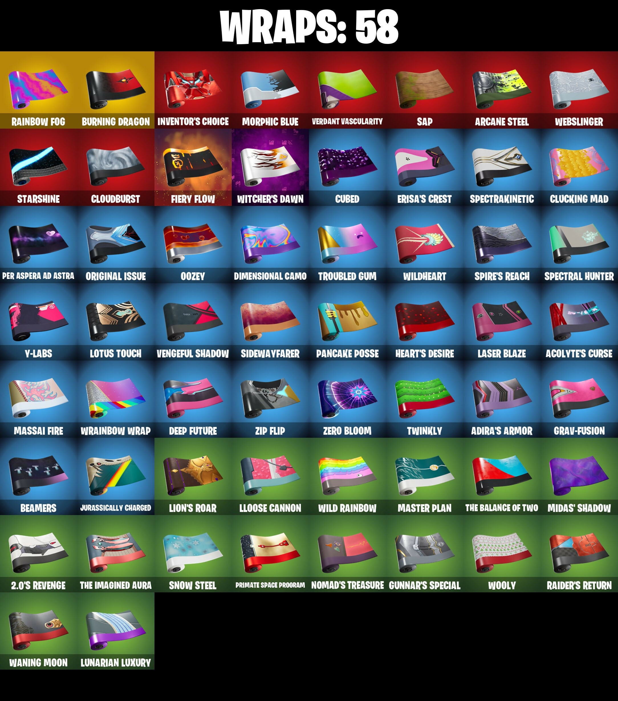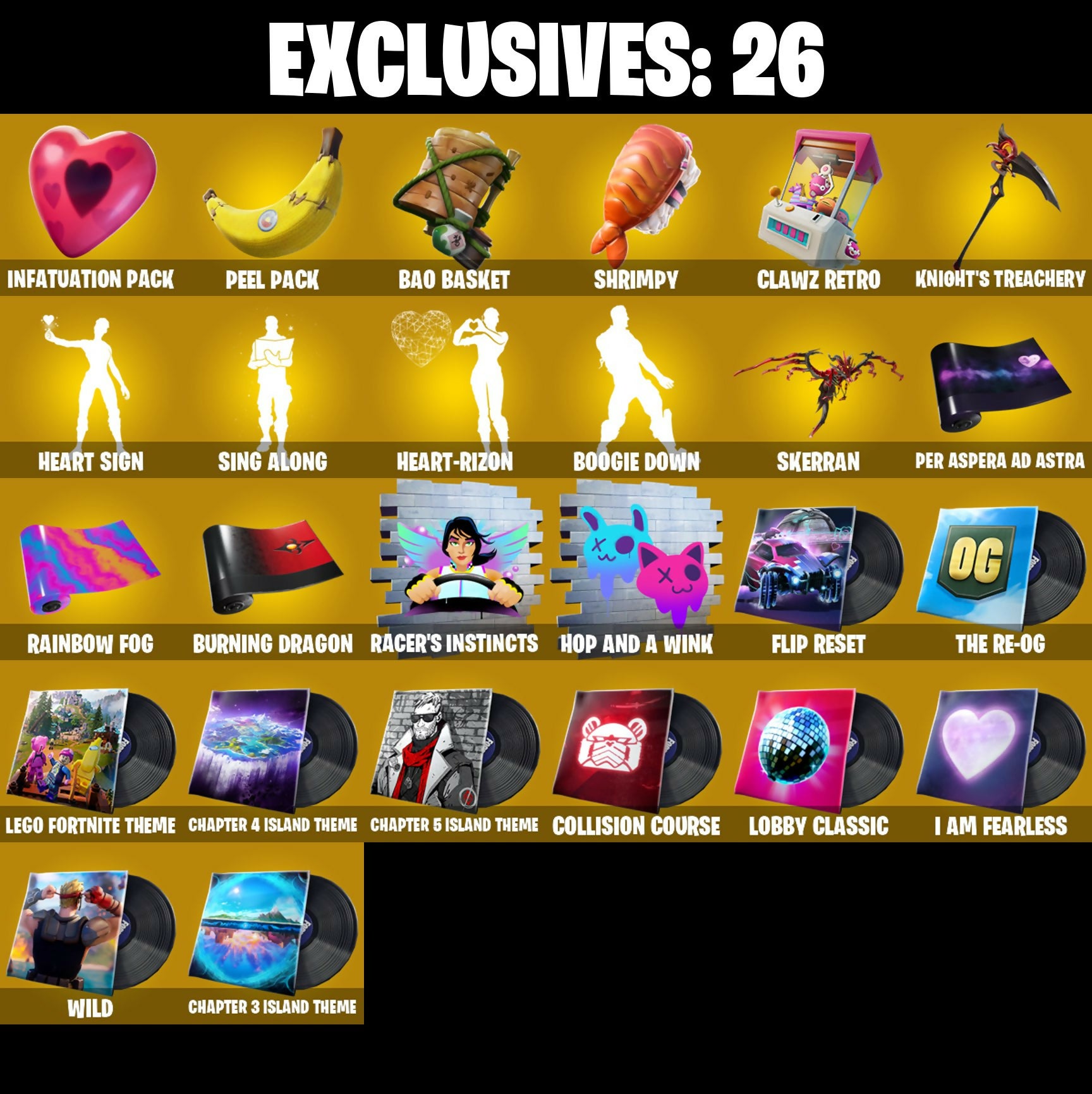 2.0's Revenge, 3D Field Flyer, 6-Carat Cutter, A Murphed Pearsian, A Warrior Prepares, A.I.M. (ghost variant), Acolyte's Curse, Adira, Adira's Armor, Adira's Battle Flag, Agent Jones (Jump 31), Agent Jones (jump 2), Alec-Yum, Alien, Ancestral Bloom, Apocalypse Shinobu, Apocalypse Shroud, Arcane Ebony Glider, Arcane Energy Glider, Arcane Knighthawk, Arcane Steel, Articulated Blade Wing, Assassin Unknown, Axe + Trail Form, Axe-tral Form, Azarath Metrion Zinthos!, BP!, Back N' Better, Backup Blades, Bad Basket, Bad Buns, Bao Basket, Bao Bros, Bass Drop, Bat Royale, Battle Bloom, Battletoad Flash Wing, Bavarian Charnok, Beamers, Bean Bag, Bear Hug, Beastfang, Blade of the Waning Moon, Bladed Trapbag, Bladed Travpak, Blaradg, Blizzabelle, Blowin' Up, Blown Up, Blustery Bag, Board Breaker, Bobo, Bolen of the Vanished Tribe, Bone Patrol, Boogie Down, Boomin', Boomkin, Boots 'N' Cats, Boots-N-Cats, Bounty 'brella, Bounty Brella, Brain Bolt, Breakfast Bounty, Breathless Blades, Brisa, Bronze Fist, Bronzed Scimitars, Bubblobon, Bubbloon, Buds Watching, Burning Dragon, Buzz Pack, C-Backs Cutter, Call Me B, Captain & Island Theme, Cardistry, Carnage (Maximum), Carnage Cleaver, Carnistry, Chain Surfer, Chainsaur, Chainsawur, Chapter 3 Island Theme, Chapter 4 Island Theme, Chapter 5 Island Theme, Charlotte, Chi-No, Chicka Kitty, Choice Knit, Chop Chop, Chop Dropper, Clanz Setro, Clawz Retro, Clean Sweep, Clock (slurpy), Cloudburst, Cluck (Slurpy), Clucking Mad, Collision Course, Competitor's Time Brella, Crescent Shroom, Crimson Crest, Crimson Wish, Crowning Achievement, Crownscratcher, Crystal Axe of the Masters, Cube Aether, Cubed, Cubic Scepter, Cyber Shadow, Cyclo Curl, Dagger Dance, Damarope, Danger Skull, Dark Symbiote, Datafiber Chargepack, Dawn Sword, Dawnslayer Blade, Deep Future, Demonslayer Blade, Diamond Diva, Dimensional Camo, Dimensional Gate, Dino Deck, Doctor Doom, Dog Dad, Dogo, Doom Chalice, Doom Juice, Doom's Cowl, Doubles, Doze Dab, Dragon Bone Lance, Dragon Rider, Dragon Rune Lance, Drummais, Drummies, Dynamo Drop Suit, Dynamo Grav-Suit, Eagle's Form, Edgar, Eggar, Eggy, Enchanted Lifebloom, Enchanted Lifelong, Endless Scroll, Energy Claw, Envy, Erisa, Erisa's Crest, Evasive Maneuvers, Evie, Fabio Sparklemane, Fashion Accident Janky, Fever Dream, Fiery Flow, Fiery Jam, Finish Line, Fizzix, Flapjack Flyer, Flavor-Dusted Sparklewings, Flip Reset, Fornite Sparkman, Foundation's Mantle, Foundation's Plasma Spike, Foundational 'brella, Foundational Swell, Frostburn, Frosty Globes, Frosty's Globes, GG Fresh, Galactic Pack, Gamma Rex, Gangnam Style, Ganondham Style, Gathering Storm, Ghostly Watcher, Gilded Morphic Blades, Glidds Rampage Blades, Good Guy, Grav-Fusion, Groodlung, Groot, Groot's Sap Axes, Guardian Daggers, Guggimon, Gum Brawler, Gumbo (Sour), Gummy Sack, Gun Brawler, Gunn-Brella, Gunnar, Gunnar Approved, Gunnar's Special, Hagaa (corpsey), Hammer Bashers, Hammers of Justice, Hand of Lightning, Hand-Forged, Happy Heart, Harlowe (Helmet), Hatch Pack, Haven, Head (Droopy), Headmaster, Heart Beater, Heart Sign, Heart's Desire, Heart-Rizon, Heartbeat Boulder, Holly Hatchets, Holly Watches, Holo Master, Honeaster's with Love, Hop And A Wink, Horned Heart, Hugs Kiss, Hunter's Skyblade, Hunter's Spyblade, Hunter's Trophy, Hyperboard, I Am Fearless, I'm Here!, Icon Sign, Igni Sign, Infatuation Pack, Infernal Go, Inflate-A-Roach, Inflated-Roach, Inky, Invasion, Inventor's Choice, Io Field Flyer, Iron Man Backpack, Iron Man Backplate, It's... Yes?, It's... You?, J.B. Chimpanski (Helmet), Jaw Off, Jennifer Walters, Joey, John, Jolly Ball, Jones' Field Pack, Jonesin, Josie, Jr. Operation Specialist, Jumbo Popcorn, Jurassically Charged, K.O. Club, K.O. Cruiser, Kai-Li's Cape, Kai-Tech Burststone, Kal-El's Cape, Kaleidoscope Break, Kata Tech Burstwing, Kata-Pack, Kiara K.O. (Captain’s Bomber), King Maker, Kiss Kiss, Kittanas, Knight's Treachery, Kondor, Konor, Kor (Trenchcoat), Kor Flails, Kor's Toolkit, Krisabelle, Laminator, Lara Croft, Laser Blaze, Legendary Blade of Insight, Legendary Blur In Motion, Lego Fortnite Theme, Lena (warstrike), Lexa (Warstrike), Lil' Black Heart, Lil' Monster, Lil' Rover, Lil' Saucer, Lil' Saucier, Lion's Roar, Little Bird, Livetuna, Llaminator, Lloose Cannon, Lobby Classic, Lotus Touch, Love Fit, Love It!, Love Lock, Lovethorn, Lt. John Lama, Lt. John Llama, Lunabus, Lunar Change, Lunar Charge, Lunar Glow, Lunar Party, Lunarian Luxury, Lunarios, Make It Plantain, Maki Master, Mancake, Mandalorian, Mashed Potato, Massai Fire, Master Plan, Mave (Reactive Hair Off), Mechafusion Interface, Mega-Brella, Megadear Salute, Menace (Challenger Menace - Flame), Meowscles Janky, Midas Detective Style, Midas' Shadow, Mighty Mantle Stella, Mighty Marvel 'brella, Miss Fish, Missiles Away!, Mjolnir, Mjolnir's Path, Monks, Moonglide, Mooonglide, Morgana Wornum, Morphic Blue, Mwahaha, Mystique, Mystique Sneak, Mystique's Skull, NF-Jade Hardslammer, Nailed It, Nanameter, Nanner Bashers, Nata-Pack, Ne'jari Warhammer, Nebrius Box, Nemesis Box, Neo-Heart's Knapsack, Neon Dragon, Nervouscles Janky, Neverending Rise, Noble's Battle Ram, Nomad's Treasure, Null Claws, Oath & Sorrow, Obeyztle Pet Pee, Octane, Octave, King of the Rotors, Omni Sword, Oozey, Original Issue, Pairing Blades, Pancake Posse, Party Hips, Passing Blades, Patch Pack, Peaseme Pops, Peel Pack, Peely Whip, Per Aspera Ad Astra, Personal Phylactories, Personal Pollinators, Phone It In, Pirouette, Polar Peely, Power of Azarath, Pray Axe, Predator, Premiere Poms, Primate Space Program, Prized Llama, Prowler, Prowler's Grasp, Pry Axe, Punch Saw, Punisher Token, Quigman, Quite Curious, RGR, Racer's Instincts, Raider's Return, Rainbow Fog, Ranker's Tags, Raven, Raz, Razor Crest, Ready When You Are, Rebirth Raven, Red Jade, Redmask Ranger, Redmask Ranker, Reese, Rocket Science, Ronin (Cape), Ronin Flame, Root Wing, Runaway, Rush Fest, SKS Style-Purestiral, Salvaged Chute, Salvaged Cube, Sap, Sapling Groot, Scales of Ju