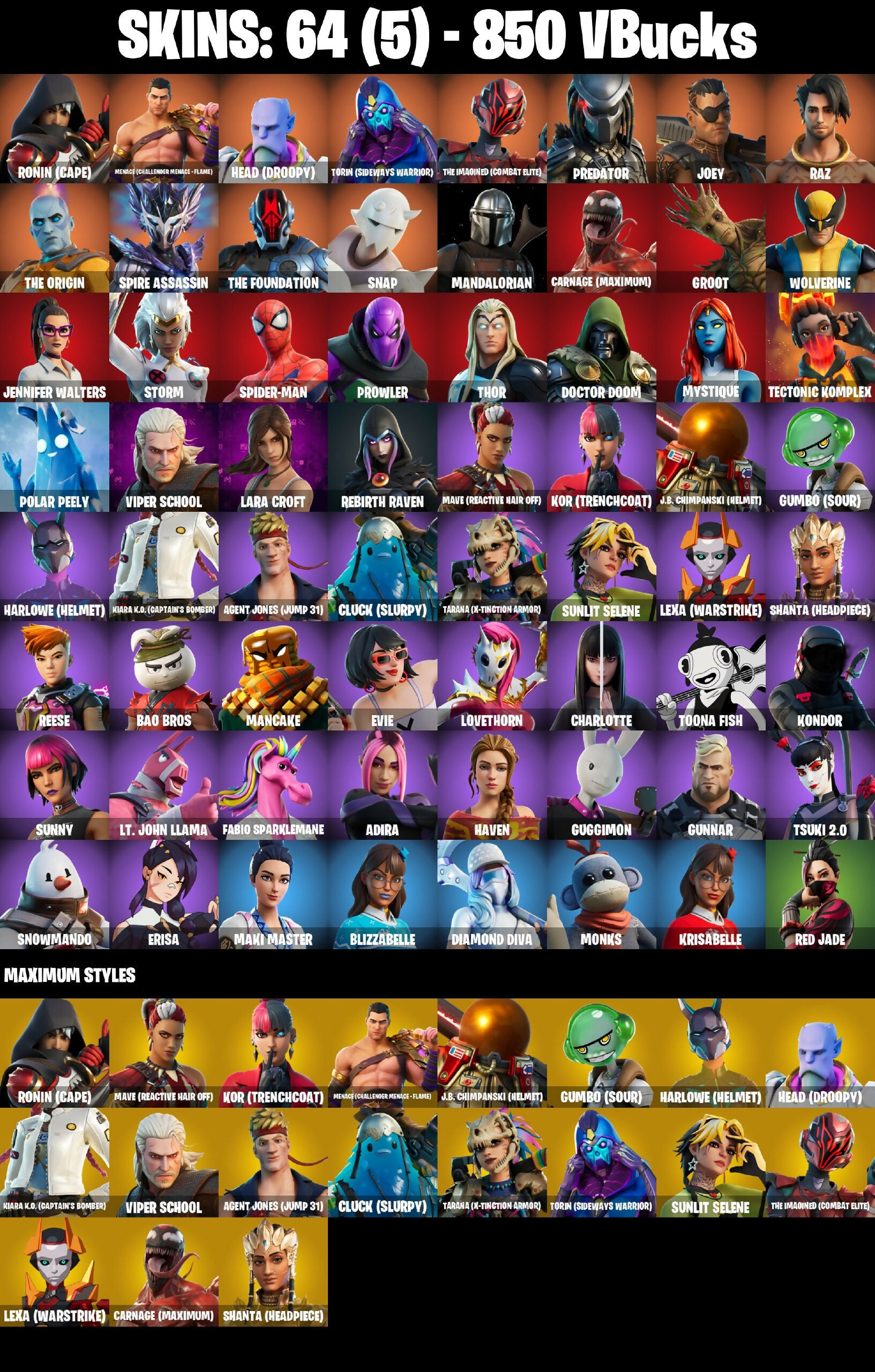 64 SKINS | RONIN (CAPE) | MENACE (CHALLENGER MENACE ⸱ FLAME) | HEAD (DROOPY) | TORIN (SIDEWAYS WARRIOR) | THE IMAGINED (COMBAT ELITE) | PREDATOR | JOEY | RAZ | THE ORIGIN | SPIRE ASSASSIN | THE FOUNDATION | SNAP | MANDALORIAN| PC/PSN/XBOX/NINTENDO |