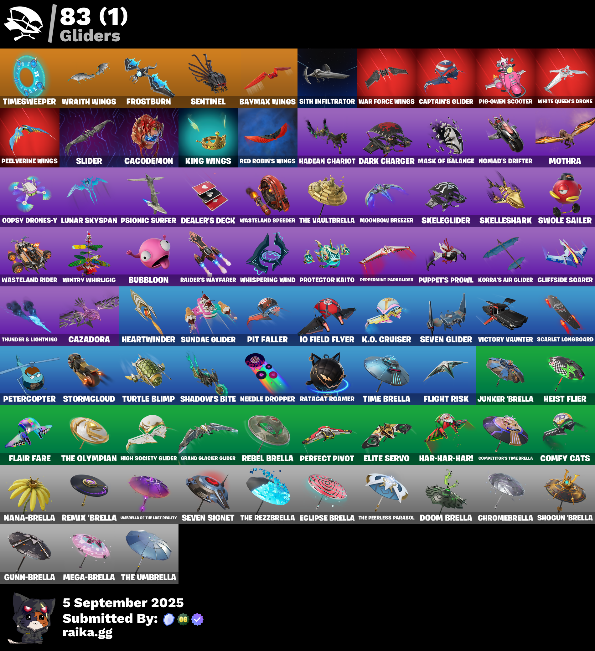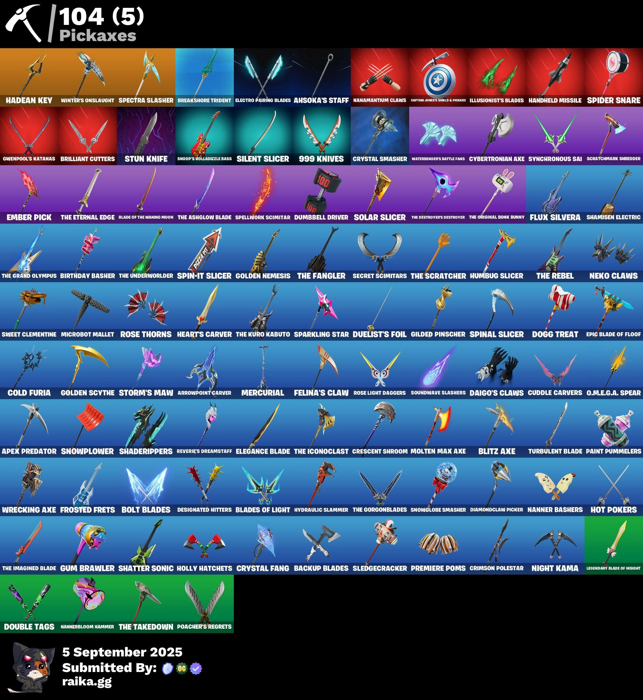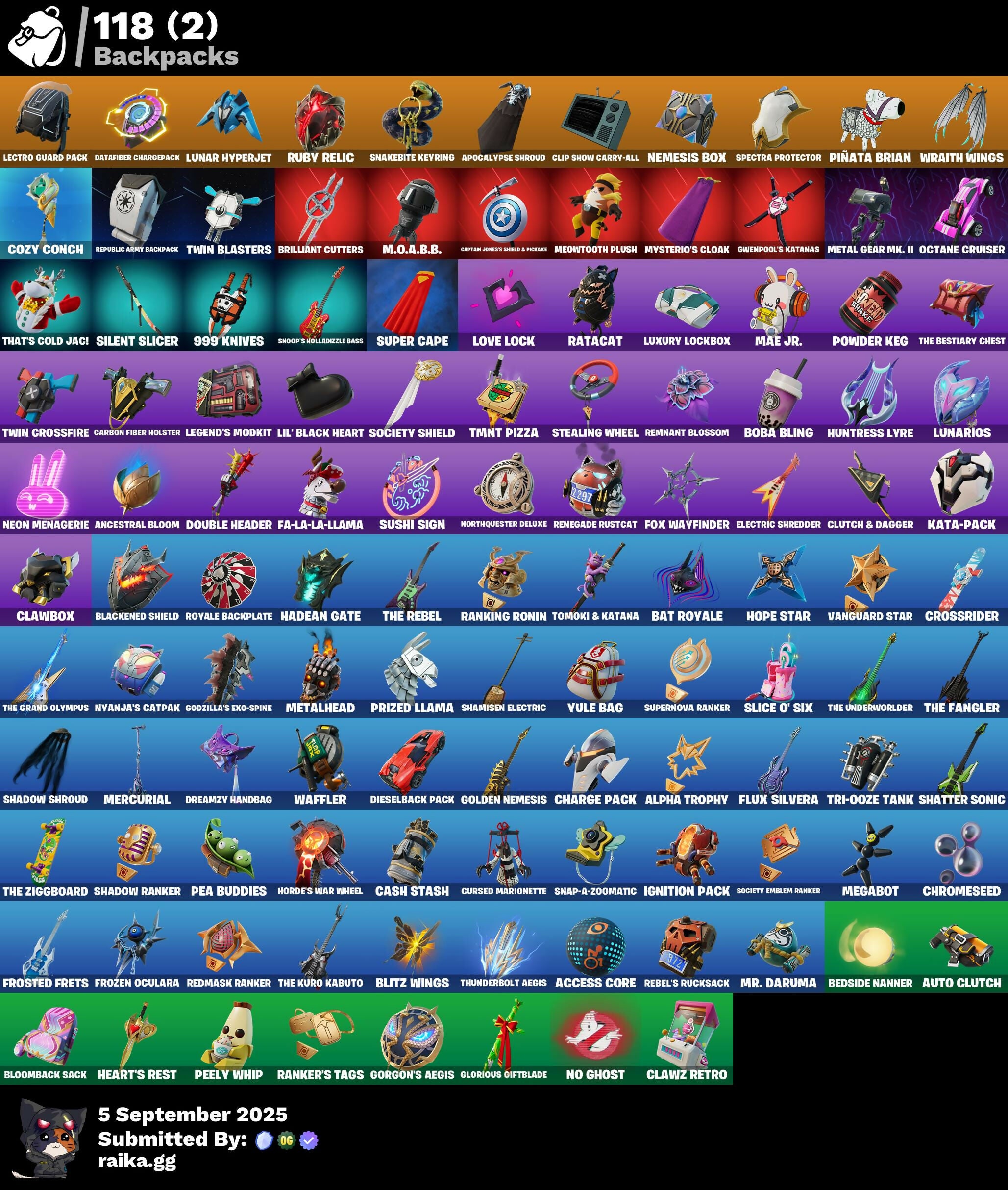 !, (Snikt!), 999 Knives, Access Core, Ahsoka Tano, Ahsoka's Staff, Alpha Trophy, Ancestral Bloom, Antonia, Apex Predator, Aphrodite, Apocalypse Shroud, Arctic Adeline, Arrowpoint Carver, Artemis, Aura, Auto Clutch, Avatar's Flourish, Backup Blades, Bat Royale, Battle Blessing, Baymax Wings, Beatzbunny, Bedside Nanner, Birthday Basher, Blackened Shield, Blade Of The Waning Moon, Blades Of Light, Blazing Fire Cerberus, Blitz Axe, Blitz Wings, Bloomback Sack, Boba Bling, Bolt Blades, Boogie Down, Breakshore Trident, Brilliant Cutters, Bubbloon, Burning Ambition Valeria, Cacodemon, Captain Jones, Captain Jones's Shield & Pickaxe, Captain Llamerica, Captain's Glider, Carbon Fiber Holster, Card Drop, Cash Stash, Cassidy Quinn, Cazadora, Charge Pack, Choice Knit, Chrome Punk, Chromebrella, Chromeseed, Clawbox, Clawz Retro, Cliffside Soarer, Clip Show Carry-All, Clone Trooper, Clutch & Dagger, Cold Furia, Collector Kado Thorne, Comfy Cats, Competitor's Time Brella, Conch Call, Count It!, Cozy Conch, Crack It, Crescent Shroom, Crimson Polestar, Crossrider, Crowning Achievement, Crystal Fang, Crystal Smasher, Cuddle Carvers, Curling Iron, Cursed Marionette, Cybertronian Axe, Cyclo Curl, Dagger Dance, Daigo's Claws, Dark Charger, Datafiber Chargepack, Dawn Duelist Nisha, Dealer's Deck, Demon Hunter Hope, Designated Hitters, Diamond Throne, Diamondclaw Picker, Dice Roll, Dieselback Pack, Do The 'Split, Dogg Treat, Doom Brella, Double Header, Double Tags, Doze Dab, Dreamzy Handbag, Duelist's Card Trick, Duelist's Foil, Dumbbell Driver, Eclipse Brella, Electric Shredder, Electro Pairing Blades, Elegance Blade, Elite Servo, Ember Pick, Emma Frost, Energized Godzilla, Epic Blade Of Floof, Evie, Fa-La-La-Llama, Fancy Peter Griffin, Felina, Felina's Claw, Fist Bump, Flair Fare, Flaky Feast, Flashback Breakdown, Flight Risk, Flux Silvera, Foil Flex, Fox Wayfinder, Frostburn, Frosted Frets, Frozen Oculata, Get Griddy, Gilded Pinscher, Glorious Giftblade, Godzilla's Exo-Spine, Golden Nemesis, Golden Scythe, Good Game, Well Played, Gorgon's Aegis, Grand Glacier Glider, Guardian Jade, Gum Brawler, Gunn-Brella, Gwen-step, Gwenpool, Gwenpool's Katanas, Hadean Chariot, Hadean Gate, Hadean Key, Handheld Missile, Har-Har-Har!, Harbinger Armor Omegarok, Heart Sign, Heart's Carver, Heart's Rest, Heartburst, Heartwinder, Heist Flier, Hellfire Dance, High Society Glider, Holiday Boxy, Holly Hatchets, Hope, Hope Star, Horde's War Wheel, Hot Pokers, Humbug Slicer, Huntress Lyre, Hydraulic Slammer, Hypnot-eyes, I'm A Mystery, IO Field Flyer, Ignition Pack, Illusionist's Blades, Immortal Form, Immortal Zeus, Invisible Cut, It's... You?, Jet Signals, Junker 'Brella, K.O. Cruiser, Kata-Pack, King Wings, Kintsugi Daigo, Knife Sharpener, Korra, Korra's Air Glider, Krisabelle, Last Forever, Lectro Guard Pack, Legend's Modkit, Legendary Blade Of Insight, Lil' Black Heart, Lil' Godzilla Attack, Lil' Longboat, Lil' Podracer, Lil' Prancer, Lil' T-6 Shuttle, Love It!, Love Lock, Lucky Nyanja, Lunar Hyperjet, Lunar Skyspan, Lunarios, Luxury Lockbox, M.O.A.B.B., Mae, Mae Jr., Magmatic Poseidon, Major Mancake, Make A Seat, Mask of Balance, Medusa, Mega-Brella, Megabot, Meowtooth Plush, Mercurial, Metal Gear Mk. II, Metalhead, Microbot Mallet, Molten Max Axe, Moonbow Breezer, Moonlit Mystery, Mothra, Mr. Daruma, Mysterio, Mysterio's Cloak, Mysterio's Magic Trick, Nailed It, Nana-Brella, Nanner Bashers, Nanner Ringer, Nannerbloom Hammer, Nanomantium Claws, Needle Dropper, Neko Claws, Nemesis Box, Neon Menagerie, Night Kama, Ninja Stance: Donnie, Ninja Stance: Leo, Ninja Stance: Mikey, Ninja Stance: Raph, No Ghost, Nolan Chance, Nomad's Drifter, Northquester Deluxe, Nyanja's Catpak, O.M.E.G.A. Spear, Octane Cruiser, Old Snake, Oopsy Drones-Y, Paint Pummelers, Pea Buddies, Peel Out, Peelverine, Peelverine Wings, Peely Whip, Peppermint Paraglider, Perfect Pivot, Petercopter, Pig-Gwen Scooter, Piper Pace, Pit Faller, Pitcycle, Piñata Brian, Poacher's Regrets, Point & Shoot, Polar Peely, Popular Vibe, Powder Keg, Premiere Poms, Prized Llama, Protector Kaito, Psionic Surfer, Puppet Dance, Puppet's Prowl, Racer Kendo, Raider's Wayfarer, Ranker's Tags, Ranking Ronin, Ratacat, Ratacat Roamer, Rebel Brella, Rebel's Rucksack, Red Robin's Wings, Redmask Ranker, Reef Cake Fish Thicc, Remix 'Brella, Remnant Blossom, Renegade Rustcat, Republic Army Backpack, Reverie, Reverie's Dreamstaff, Rose Light Daggers, Rose Thorns, Rough Cut Montague, Royale Backplate, Ruby Relic, Runway Racer, Rust, Samurai Baymax, Santa Dogg, Scarlet Longboard, Scratchmark Shredder, Secret Scimitars, Sentinel, Serpentine Summoning, Seven Glider, Seven Signet, Shadebox, Shaderippers, Shadow Ranker, Shadow Shroud, Shadow's Bite, Shamisen Electric, Shamisen-sational, Shatter Sonic, Shock Brawler Oscar, Shogun 'Brella, Show 'Em Off, Silent Slicer, Sith Infiltrator, Skeleglider, Skelleshark, Slayer Juice Wrld, Sled Ready Guff, Sledgecracker, Slice O' Six, Slider, Snakebite Keyring, Snap-A-Zoomatic, Snoop's Holladazzle Bass, Snoop's Holladizzle Bass, Snoop's Walk, Snowglobe Smasher, Snowplower, Society Emblem Ranker, Society Shield, Solar Slicer, Soundwave Slashers, Sparkling Star, Spectra Knight, Spectra Protector, Spectra Slasher, Spellwork Scimitar, Spider Snare, Spin-It Slicer, Spinal Slicer, Spirit Strider, Standing Bow, Stealing Wheel, Storm's Maw, Stormcloud, Stun Knife, Summitseeker Evie, Sundae Glider, Super Cape, Supernova Ranger, Surfin' Bird, Sushi Sign, Sweet Clementine, Sweet Swing, Sweet!, Swole Sailer, Synchronous Sai, TMNT Pizza, Tagger's Groove, Tempest Flight, That's Cold Jac!, The Ashglow Blade, The Bestiary Chest, The Break, The Break Shot, The Destroyer's Destroyer, The Eternal Edge, The Fangler, The Gorgonblades, The Grand Olympus, The Iconoclast, The Imagined Blade, The Kuro Kabuto, The Machinist, The Night Rose, The Olympian, The Original Bonk Bunny, The Peerless Parasol, The Rebel, The Rezzbrella, The Scratcher, The Takedown, The Umbrella, The Underworlder,