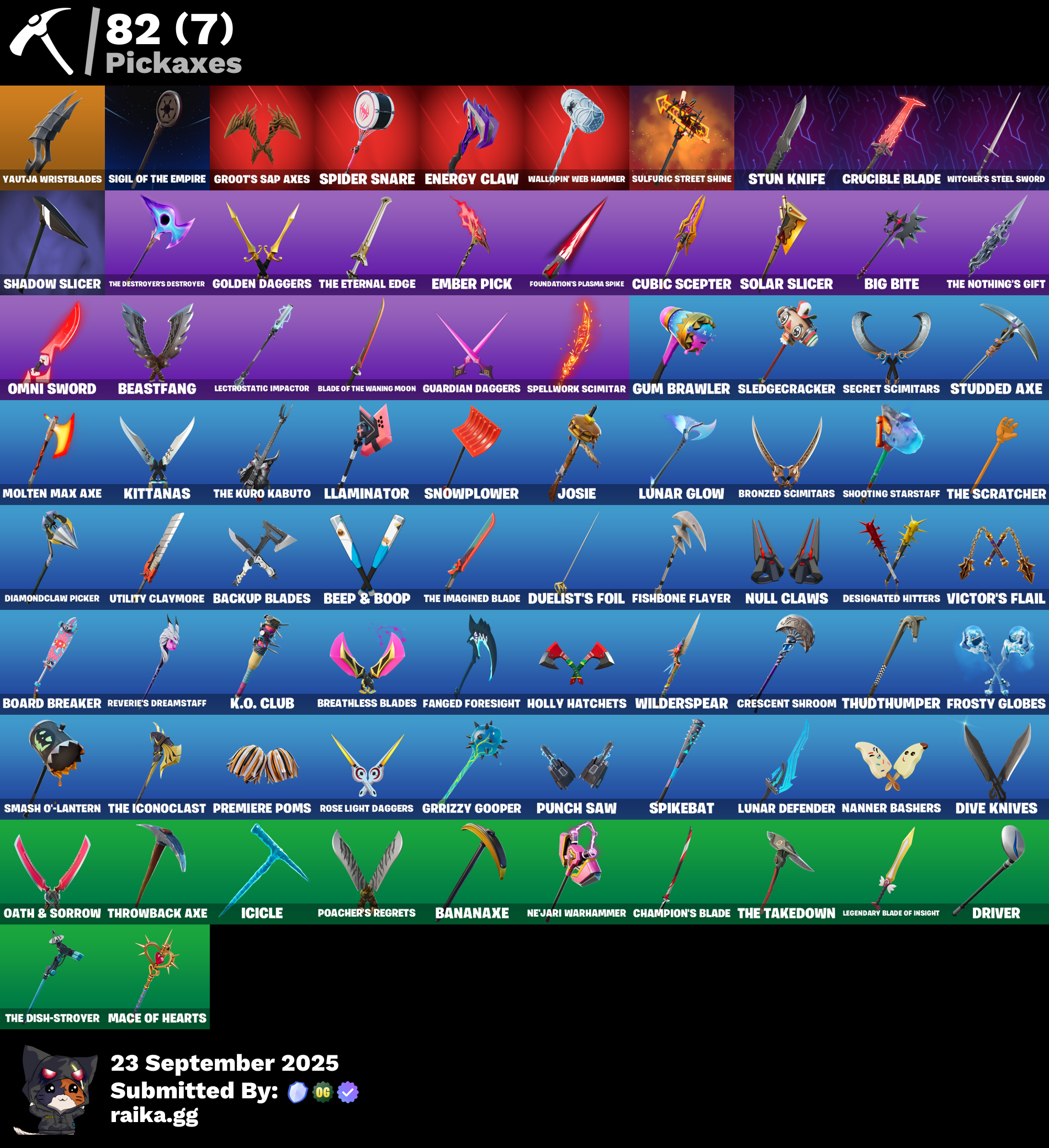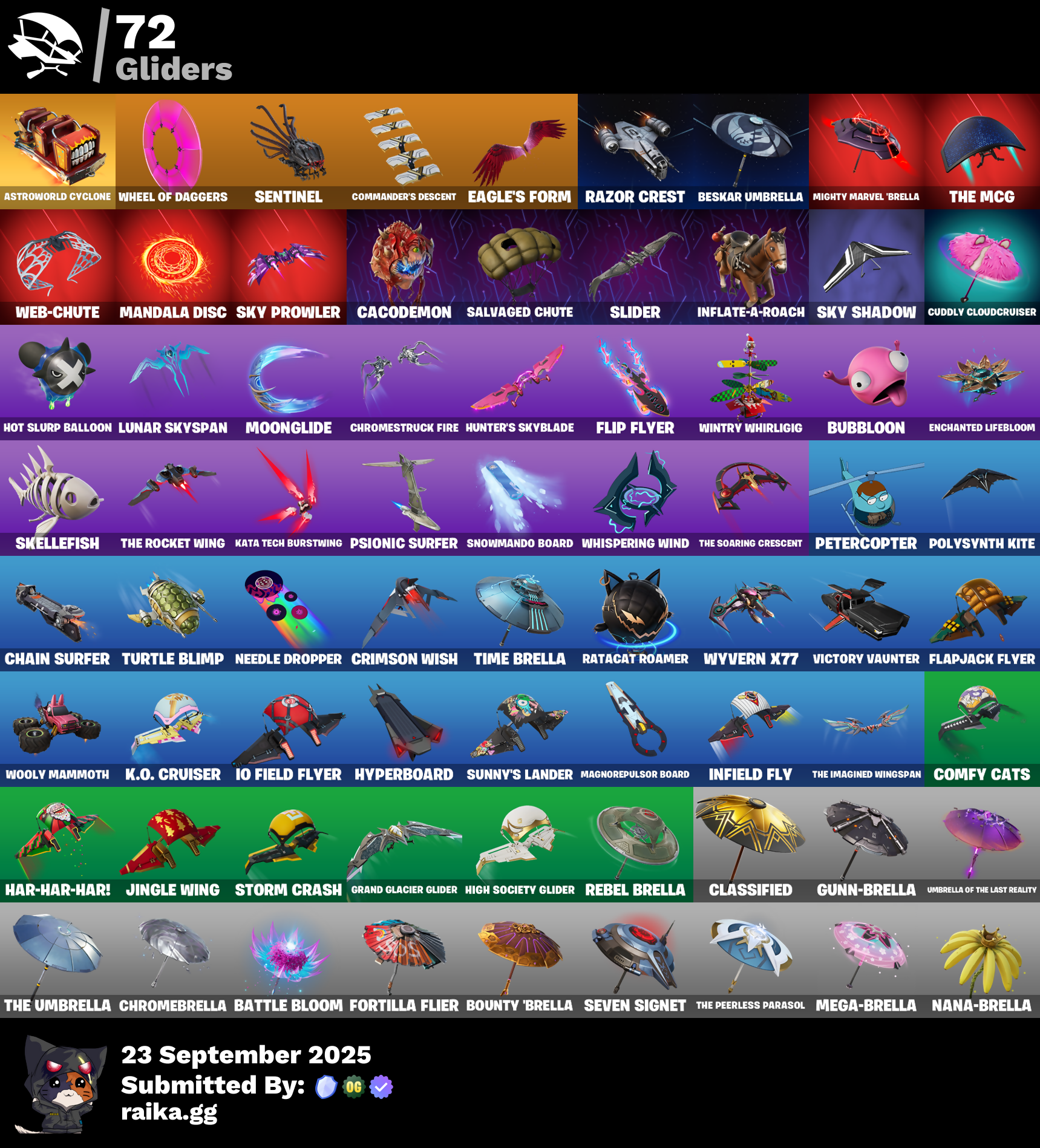 10 Field Flyer, 8-Ball Janky, Adira's Battle Flag, Amazing Cube, Ancestral Bloom, Arctic Adeline, Arroyo Pack, Ascension Nezumi, Astro Armor, Astroworld Cyclone, Aura, Backup Blades, Balance Board, Bananaxe, Battle Bloom, Beachcomber, Bear Hug, Beastfang, Beep & Boop, Beep Beep, Beskar Umbrella, Big Bite, Blackout Bag, Blade of the Waning Moon, Bladed Travpak, Blizzabelle, Board Breaker, Boba Bling, Boba Snack, Bobo, Boogie Down, Book of Cagliostro, Boomin', Bounty 'Brella, Breakfast Bounty, Breathless Blades, Bring It Around, Bronzed Scimitars, Brush Your Shoulders, Bubbloon, Bun Bun Bang Bang, Burning Ambition Valeria, Burpee, Buzz Pack, Bytes (Lone Traveler), Cacodemon, Call Me, Carbon Fiber Holster, Chain Surfer, Champion's Blade, Chicken Wing It, Chigusa, Choice Knit, Chrome Punk, Chromebrella, Chromeseed, Chromestruck Fire, Classified, Clawbox, Clawz Retro, Clean Sweep, Comfy Cats, Commander's Descent, Conjure Weapon, Crescent Shroom, Crimson Crest, Crimson Wish, Crowning Achievement, Crucible Blade, Cube Aether, Cubic Scepter, Cuddly Cloudcruiser, Curling Iron, Cyclo Curl, Dagger Dance, Datafiber Chargepack, Deep Dive, Designated Hitters, Diamond Throne, Diamondclaw Picker, Dino Deck, Dive Knives, Doctor Strange, Doom Chalice, Double Header, Dreamzy Handbag, Driver, Duelist's Foil, Dusty, Dynamo Grav-Suit, Eagle's Form, Electric Shredder, Ember Pick, Enchanted Lifebloom, Energy Claw, Erisa, Fa-La-La-Llama, Fanged Foresight, Ffrosty, Fiery Jam, Fishbone Flayer, Fishstick Janky, Fizzik, Flapjack Flyer, Flip Flyer, Flippin' Away, Foil Flex, Fortilla Flier, Foundation's Mantle, Foundation's Plasma Spike, Frosty Globes, Get Griddy, Golden Daggers, Golden Gambit, Good Ol' Pete, Grand Glacier Glider, Grind Bag, Groot's Sap Axes, Grriz, Grrizzy Gooper, Guard Pup, Guardian Daggers, Guff Gringle, Gum Brawler, Gumbo (Sour), Gummy Sack, Gunn-Brella, Gunnar, H4ck // P4ck, Har-Har-Har!, Harlowe (Helmet), Have A Seat, Haven, Helsie, High Society Glider, Hit It, Holly Hatchets, Hope, Hot Slurp Balloon, Hunter's Skyblade, Hunter's Trophy, Hyperboard, Hypnot-Eyes, I'm A Mystery, Ice-Blasted Snow Crunchem, Icicle, Igni Sign, Imperial March, Infield Fly, Inflate-A-Roach, It Is Finished, It's... You?, Jingle Wing, Josie, K.O. Club, K.O. Cruiser, Kata Tech Burstwing, Kata-Pack, Kiara K.O. (Captain's Bomber), Kittanas, Kondor, Krisabelle, Laser Focused, Lectro Guard Pack, Lectrostatic Impactor, Legend's Modkit, Legendary Blade of Insight, Lennox Rose, Lexa, Lil' Black Heart, Lil' Monster, Lil' Prancer, Llaminator, Love It!, Love Lock, Lt. John Llama (Gilded Reality), Lunar Charge, Lunar Defender, Lunar Glow, Lunar Hyperjet, Lunar Party, Lunar Skyspan, Lunarios, Mace of Hearts, Magnorepulsor Board, Mancake, Mandala Disc, Mandalorian, Marigold, Mark of the Slayer, Mashed Potato, Mave (Reactive Hair Off), Mechafusion Interface, Mega-Brella, Megumi, Menace, Meow Skulls, Mighty Marvel 'Brella, Mind's Eye, Mini Slaver Fistbump, Molten Max Axe, Montague, Moonglide, Mwahaha, Nailed It, Nana-Brella, Nanner Bashers, Ne'Jari Warhammer, Needle Dropper, Nemesis Box, Neon Wings, Ninja Stance: Donnie, Ninja Stance: Leo, Ninja Stance: Mikey, Ninja Stance: Raph, Nisha, Noble Shroud, Null Claws, Oath & Sorrow, Octane Cruiser, Omg I Love It, Omni Sword, Paradigm (Aurelian), Party Hips, Peely Whip, Peter Griffin, Petercopter, Piñata Brian, Poacher's Regrets, Polar Peely, Polysynth Kite, Predator, Premiere Poms, Prized Llama, Protector of the Pledge, Prowler, Psionic Surfer, Punch Saw, Raise The Roof, Ratacat, Ratacat Roamer, Razor Crest, Rebel Brella, Redmask Ranker, Reese, Reverie, Reverie's Dreamstaff, Ronin (Cape), Rose Light Daggers, Ruby Relic, Ruby Shadows, Sackin', Salvaged Chute, Sardeenz!, Scales of Justice, Scorecard, Secret Scimitars, Segway Tour, Sentinel, Seven Signet, Sgt. Shiba, Shadow Slicer, Shadow Spar, Shanta (Headpiece), Shield of the Mighty, Shock Brawler Oscar, Shooting Starstaff, Sigil of the Empire, Sing Along, Skeletara, Skellefish, Sky Prowler, Sky Shadow, Sled Ready Guff, Sledgecracker, Slider, Smash O'-Lantern, Snowmando Board, Snowplower, So Square, Society Emblem Ranker, Society Shield, Sockets, Solar Slicer, Solid Snake, Spectra Protector, Spellwork Scimitar, Spider Snare, Spider-Man (Gilded Reality), Spikebat, Spirit's Pact, Stinger Pack, Storm Crash, Studded Axe, Stun Knife, Sulfuric Street Shine, Sunlit Selene, Sunny's Lander, Sweaty, Take A 'Bow, Take The Cake, Team Burger, Tectonic Komplex, The Ageless Champion, The Bestiary Chest, The Destroyer's Destroyer, The Dish-Strover, The Eternal Edge, The Foundation (Helmet Off), The Iconoclast, The Imagined (Combat Elite), The Imagined Blade, The Imagined Wingspan, The Kuro Kabuto, The Mcg, The Nothing's Gift, The Origin (On Point), The Peerless Parasol, The Rocket Wing, The Scratcher, The Soaring Crescent, The Takedown, The Umbrella, Thrasher Massai, Throwback Axe, Thudthumper, Time Brella, Tmnt Pizza, Toasty Roast, Trot Shot, Tsuki 2.0, Turtle Blimp, Twin Crossfire, Twyn, Umbrella Of The Last Reality, Underground Jones, Utility Claymore, Veronika, Verve, Victor's Flail, Victory Crest, Victory Vaunter, Viper School, Vulcan Salute, Wakandan Salute, Wallopint Web Hammer, Watchful Wabbit, Waterworks, Weapons of the Witcher, Web-Chute, Web-Head's Knapsack, Wheel Of Daggers, Whispering Wind, Wilderspear, Wildheart Buckler, Wintry Whirligig, Witcher's Steel Sword, Wooly Mammoth, Wrapping Caper, Wyvern X77, Yautja Wristblades, Yuki, Zoe Clash
