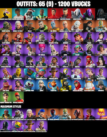 65 SKINS | SPIDER-GWEN | SLAYER JUICE WRLD | SANTA DOGG | KHABY LAME | SPIDER-MAN (NO WAY HOME) | DOCTOR STRANGE | MOON KNIGHT | PROWLER | DARTH VADER | DOOM SLAYER | GERALT OF RIVIA | MALIK | TWYN | THE ORIGIN | PARADIGM (REALITY-659) | SNAP | ERA | SPECTRA KNIGHT | KADO THORNE | THE IMAGINED | RIAN | MEOWDAS | DYNAMO TNTINA | GUNNAR | DUSTY | PC/PSN/XBOX/NINTENDO | 1200 VBUCKS | FULL EMAIL ACCESS |