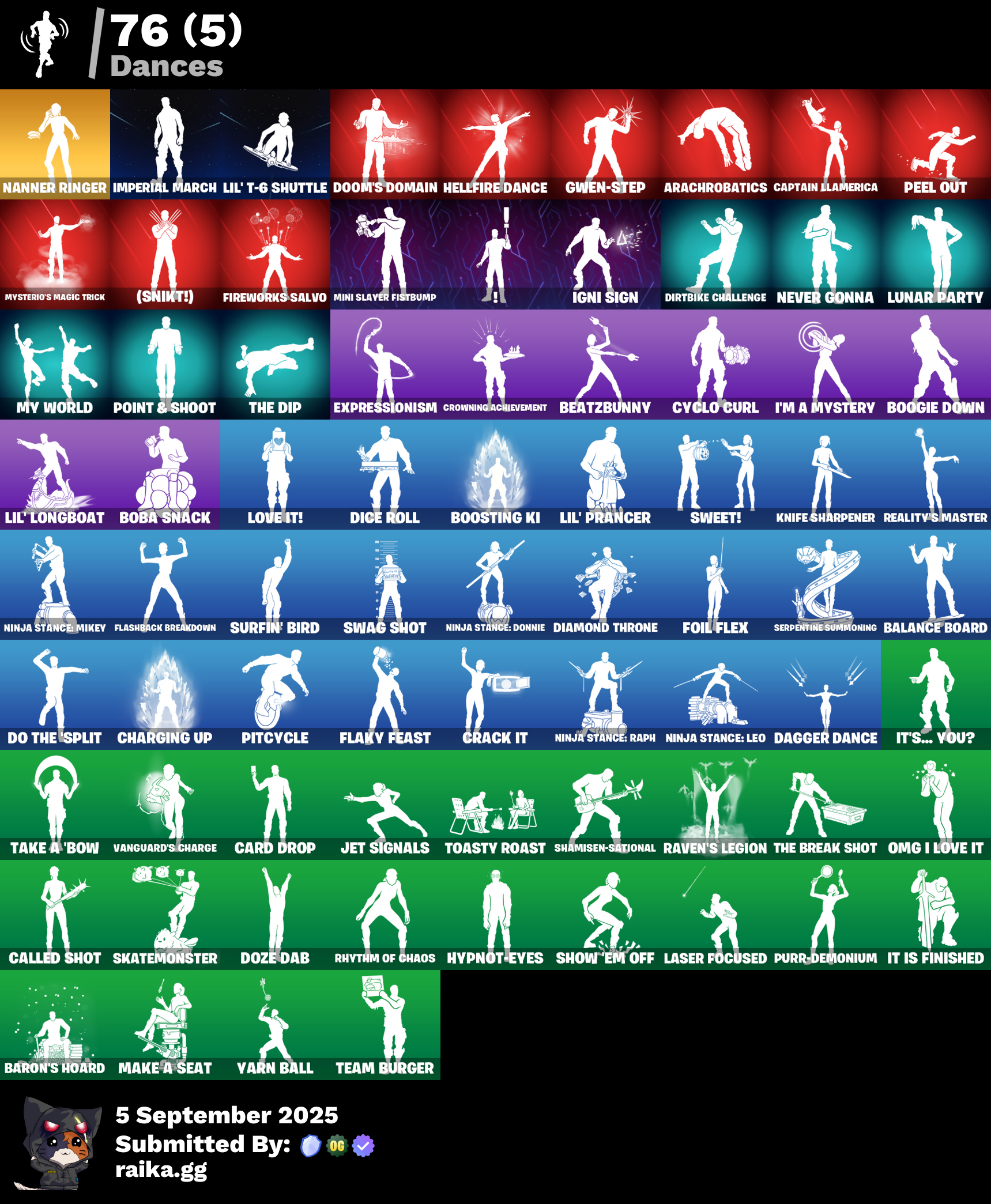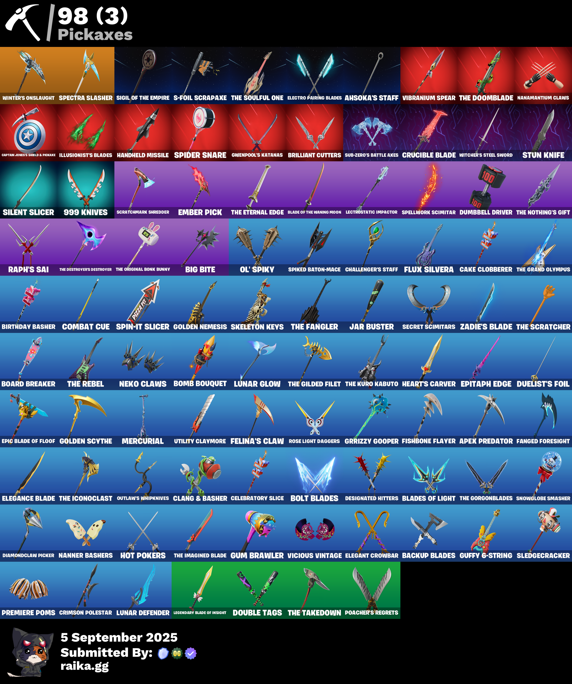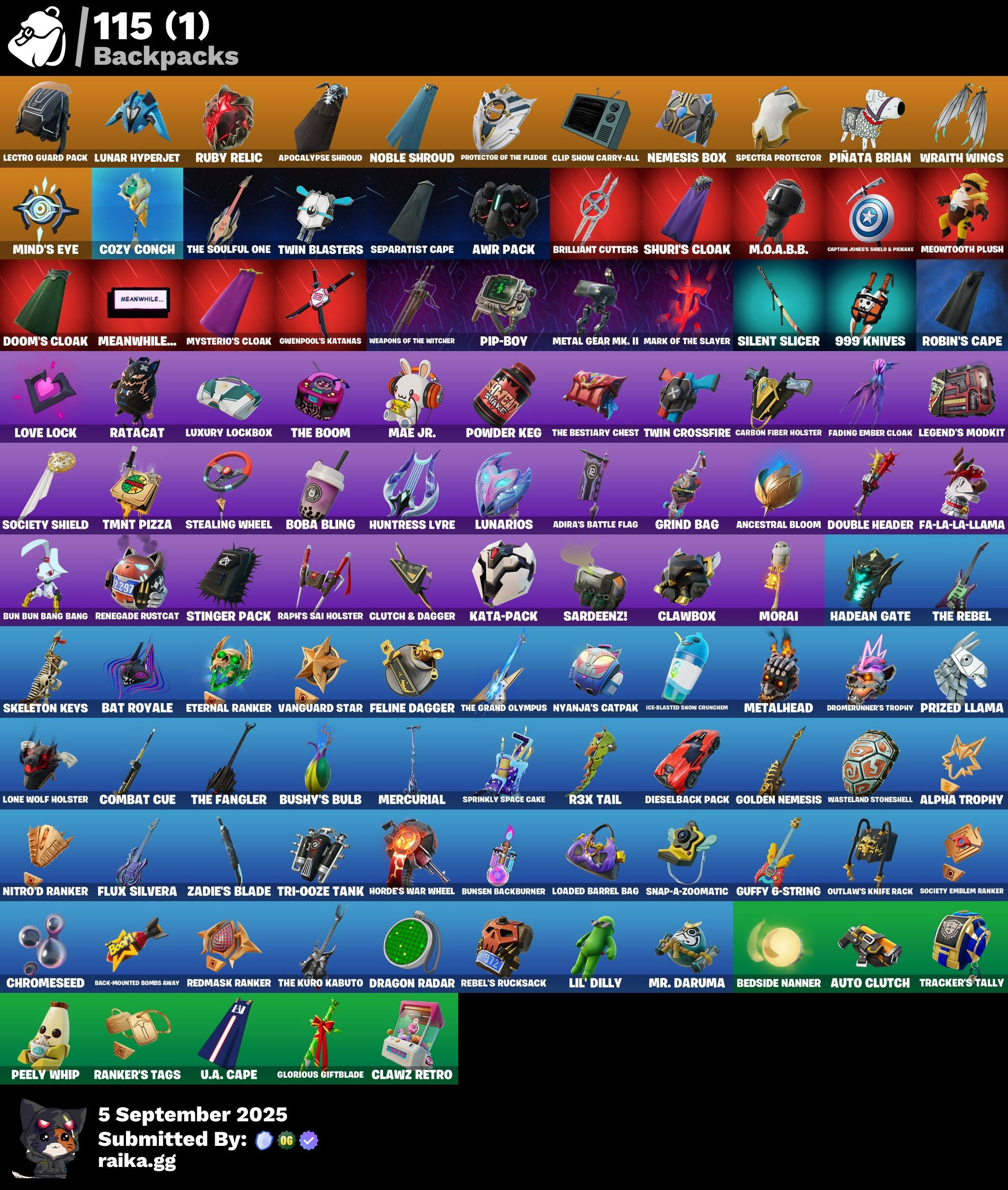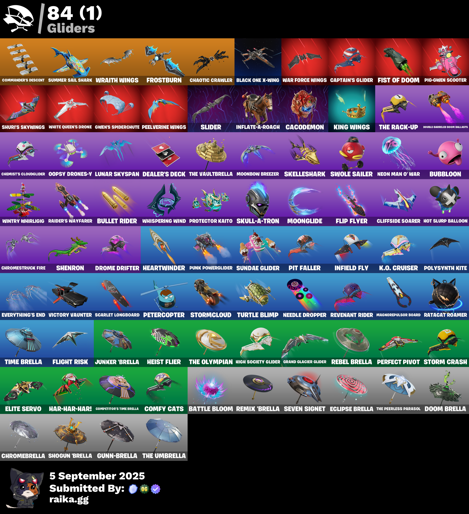 (Snikt!), 999 Knives, Adira's Battle Flag, Ahsoka Tano, Ahsoka's Staff, Alpha Trophy, Ancestral Bloom, Antonia, Apex Predator, Apocalypse Shroud, Arachrobatics, Arctic Adeline, Ascension Nezumi, Astro Armor, Auto Clutch, Awr Pack, Back-Mounted Bombs Away, Backup Blades, Balance Board, Baron's Hoard, Bat Royale, Battle Bloom, Beatzbunny, Bedside Nanner, Big Bite, Birthday Basher, Black One X-Wing, Black Panther (Shuri), Black Queen, Blade Of The Waning Moon, Blades Of Light, Board Breaker, Boba Bling, Boba Snack, Bolt Blades, Bomb Bouquet, Boogie Down, Boosting Ki, Brilliant Cutters, Bub-bloon, Bullet Rider, Bun Bun Bang Bang, Bunsen Backburner, Burning Ambition Valeria, Bushy's Bulb, Bytes (Lone Traveler), Cacodemon, Cake Clobberer, Called Shot, Camo War Machine, Captain Jones (Pen & Ink), Captain Jones's Shield & Pickaxe, Captain Llamerica, Captain's Glider, Carbon Fiber Holster, Card Drop, Celebratory Slice, Chalked Up 1-Ball, Challenger's Staff, Chaotic Crawler, Charging Up, Chemist's Cloudglider, Chrome Punk, Chromebrella, Chromeseed, Chromestruck Fire, Clang & Basher, Classic Peelverine, Clawbox, Clawz Retro, Cliffside Soarer, Clip Show Carry-All, Club President Helsie, Clutch & Dagger, Collector Kado Thorne, Combat Cue, Comfy Cats, Commander's Descent, Competitor's Time Brella, Cozy Conch, Crack It, Crimson Polestar, Crowning Achievement, Crucible Blade, Cyclo Curl, Dagger Dance, Dark Gwenpool, Dawn Duelist Nisha, Dealer's Deck, Designated Hitters, Diamond Throne, Diamondclaw Picker, Dice Roll, Dieselback Pack, Dirtbike Challenge, Do The Split, Doom Brella, Doom's Cloak, Doom's Domain, Double Header, Double Tags, Double-Barreled Boom Ballasts, Doze Dab, Dragon Radar, Drome Drifter, Dromerunner's Trophy, Duelist's Foil, Dumbbell Driver, Dusty, Dynamo Tntoon-A, Eclipse Brella, Electro Pairing Blades, Electrostatic Impactor, Elegance Blade, Elegant Crowbar, Elite Servo, Ember Pick, Epic Blade Of Floof, Epitaph Edge, Eternal Ranker, Everything's End, Expressionism, Fa-La-La-Llama, Fading Ember Cloak, Fanged Foresight, Fangy Peter Griffin, Felina, Felina's Claw, Feline Dagger, Fireworks Salvo, Fishbone Flayer, Fist Of Doom, Flaky Feast, Flashback Breakdown, Flight Risk, Flip Flyer, Flux Silvera, Foil Flex, Frostburn, Glorious Giftblade, Golden Nemesis, Golden Scythe, Grand Glacier Glider, Grind Bag, Grriz (Wild Beary Grriz), Grrizzy Gooper, Guardian Jade, Guffy 6-String, Guffy G-String, Gum Brawler, Gunn-Brella, Gwen's Spiderchute, Gwen-Step, Gwenpool's Katanas, Hadean Gate, Handheld Missile, Har-Har-Har!, Harbinger Armor Omegarok, Heart's Carver, Heartwinder, Heist Flier, Hellfire Dance, High Society Glider, Holiday Boxy, Hope, Hordes War Wheel, Hot Pokers, Hot Slurp Balloon, Huntress Lyre, Hypnot-Eyes, I'm A Mystery, Ice-Blasted Snow Crunchem, Igni Sign, Illusionist's Blades, Imani, Imperial March, Infield Fly, Inflate-A-Roach, It Is Finished, It's... You?, Jackie, Jar Buster, Jet Signals, Junker 'Brella, K.O. Cruiser, Kata-Pack, King Wings, Knife Sharpener, Laser Focused, Lectro Guard Pack, Legend's Modkit, Legendary Blade Of Insight, Lennox Rose, Lil' Dilly, Lil' Longboat, Lil' Prancer, Lil' T-6 Shuttle, Loaded Barrel Bag, Lone Wolf Holster, Love It!, Love Lock, Lunar Defender, Lunar Glow, Lunar Hyperjet, Lunar Party, Lunar Skyspan, Lunarios, Luxury Lockbox, M.O.A.B.B., Mae, Mae Jr., Magnorepulsor Board, Make A Seat, Mark Of The Slayer, Meanwhile..., Meow Skulls, Meowtooth Plush, Mercurial, Metal Gear Mk. II, Metalhead, Midnight Skye, Mind's Eye, Mini Slayer Fistbump, Moonbow Breezer, Moonglide, Morai, Mr. Daruma, My World, Mysterio, Mysterio's Cloak, Mysterio's Magic Trick, Nanamatium Claws, Nanner Bashers, Nanner Ringer, Needle Dropper, Neko Claws, Nemesis Box, Neon Man O' War, Never Gonna, Ninja Stance: Donnie, Ninja Stance: Leo, Ninja Stance: Mikey, Ninja Stance: Raph, Nitro'd Ranker, Noble Shroud, Nolan Chance, Nyanja, Nyanja's Catpak, Ol' Spiky, Old Snake, Omg I Love It, Oopsy Drones-Y, Outlaw's Knife Rack, Outlaw's Whipknives, Pandora's Armor Doom, Paradigm (Aurelian), Peel Out, Peelverine Wings, Peely Whip, Perfect Pivot, Petercopter, Pig-Gwen Scooter, Pip-Boy, Piper Pace, Pit Faller, Pitcycle, Piñata Brian, Poacher's Regrets, Point & Shoot, Polysynth Kite, Powder Keg, Premiere Poms, Prized Llama, Protector Kaito, Protector Of The Pledge, Punk Powerglider, Purr-Demonium, R3X Tail, Raider's Wayfarer, Ranker's Tags, Raph's Sai, Raph's Sai Holster, Raphael, Ratacat, Ratacat Roamer, Raven's Legion, Reality's Master, Rebel Brella, Rebel's Rucksack, Redmask Ranker, Reef Cake Fish Thicc, Remix 'Brella, Renegade Rustcat, Renzo The Destroyer, Revenant Rider, Rhythm Of Chaos, Robin, Robin's Cape, Rose Light Daggers, Rough Cut Montague, Ruby Relic, Runway Racer, S-Foil Scrapaxe, Sardeenz!, Scarlet Longboard, Scratchmark Shredder, Secret Scimitars, Separatist Cape, Serpentine Summoning, Seven Signet, Shadow Meowdas, Shadowstruck Director, Shamisen-Sational, Shenron, Shock Brawler Oscar, Shogun 'Brella, Show 'Em Off, Shuri's Cloak, Shuri's Skywings, Sigil Of The Empire, Silent Slicer, Skatemonster, Skeleton Keys, Skelleshark, Skull-A-Tron, Slayer Juice Wrld, Sled Ready Guff, Sledgecracker, Slider, Snap-A-Zoomatic, Snowglobe Smasher, Society Emblem Ranker, Society Shield, Spectra Knight, Spectra Protector, Spectra Slasher, Spellwork Scimitar, Spider Snare, Spider-Gwen (Gwen Stacy), Spiked Baton-Mace, Spin-It Slicer, Sprinkly Space Cake, Stealing Wheel, Stinger Pack, Storm Crash, Stormcloud, Stun Knife, Sub-Zero's Battle Axes, Summer Sail Shark, Sundae Glider, Sunlit Selene, Surfin' Bird, Swag Shot, Sweet!, Swole Sailer, TMNT Pizza, Take A 'Bow, Team Burger, The Ageless Champion, The Bestiary Chest, The Boom, The Break Shot, The Destroyer's Destroyer, The Dip, The Doomblade, The Eternal Edge, The Fangler, The Gilded Filet, The Gorgonblades, The Grand Olympus, The Herald (Burning Ember), The Iconoclast, The Imagined Blade, The Kuro Kabuto, The Nothing's Gift, The Olympian, The Original Bon