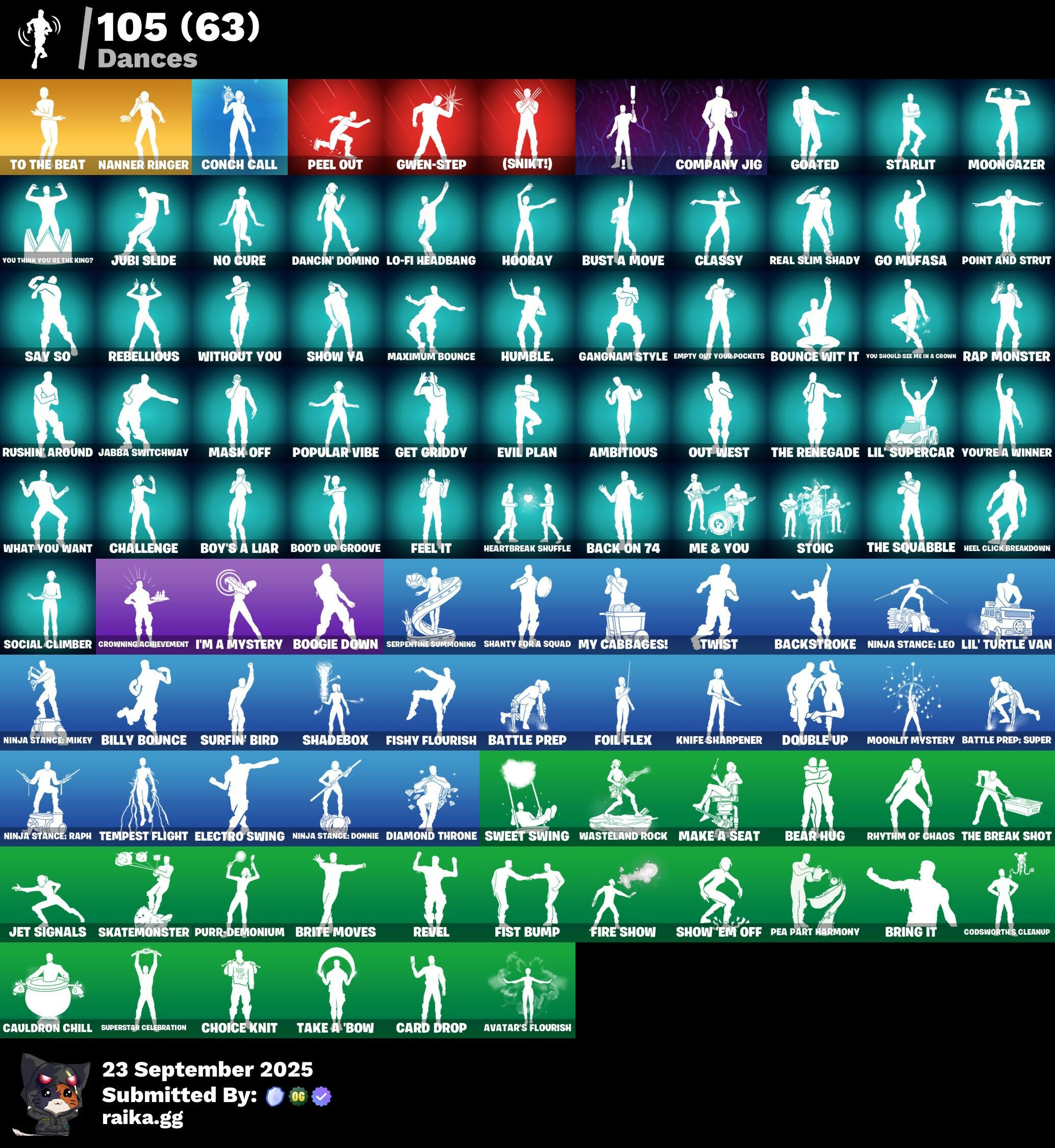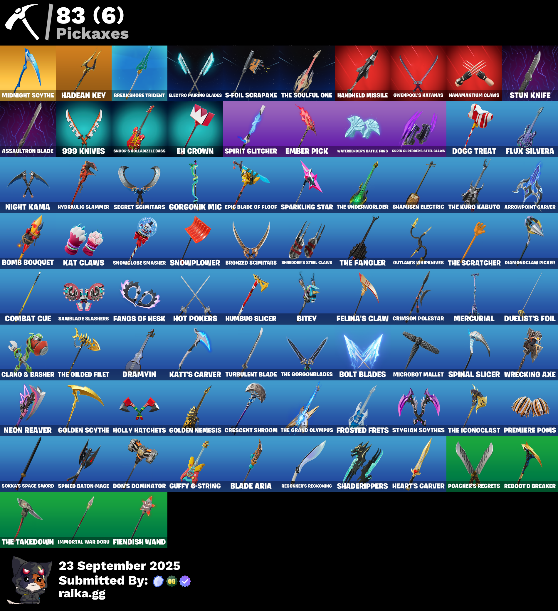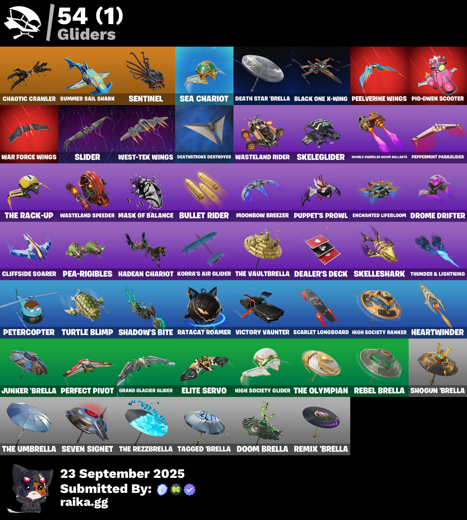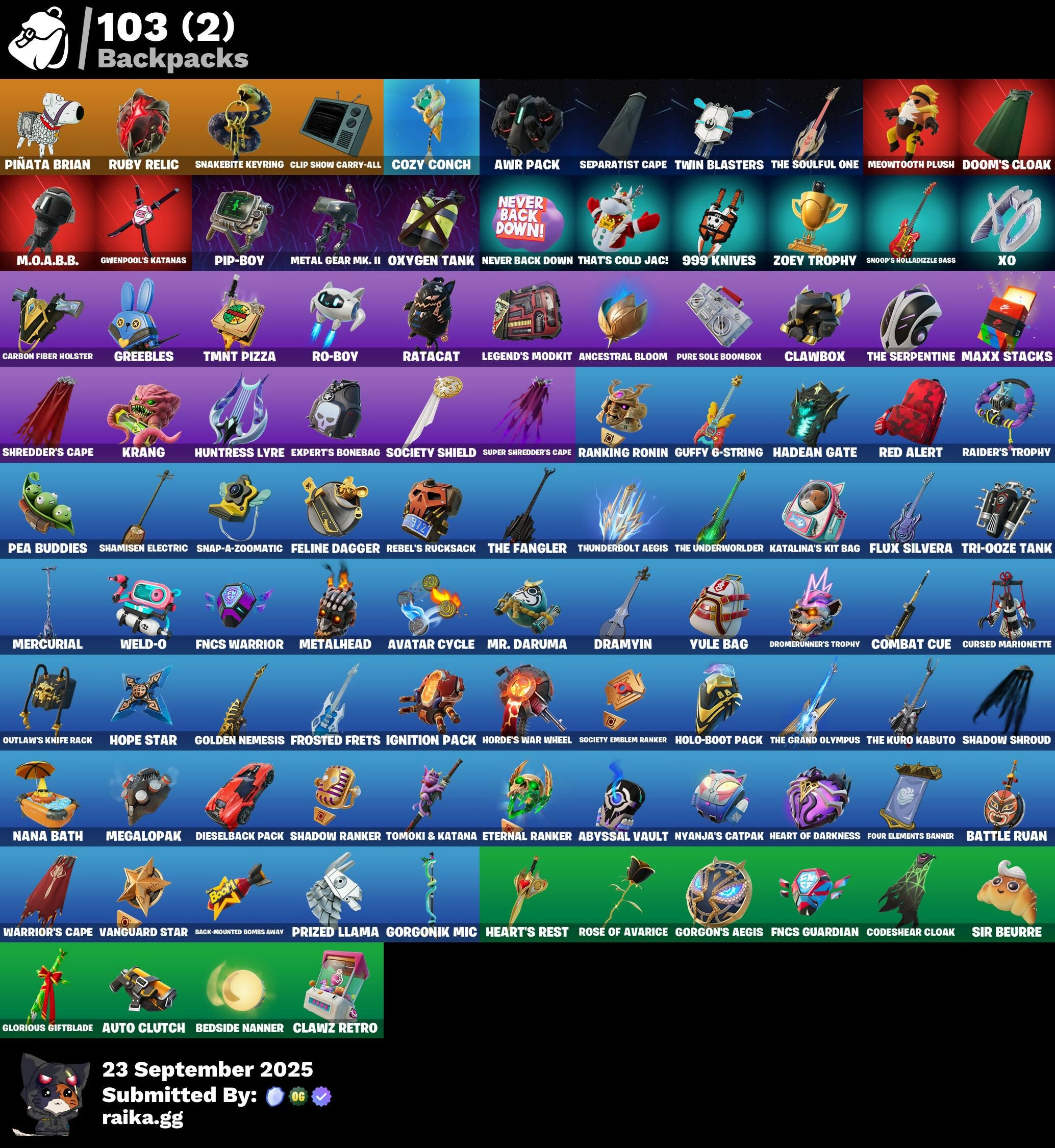 (Snikt!), 999 Knives, AWR Pack, Abyssal Vault, Airie, Ambitious, Ancestral Bloom, Ares, Arrowpoint Carver, Assaultron Blade, Auto Clutch, Avatar Cycle, Avatar's Flourish, Back On 74, Backstroke, Balanced, Battle Prep, Battle Prep: Super, Battle Ruan, Bear Hug, Bedside Nanner, Billy Bounce, Bitey, Black One X-Wing, Blade Aria, Blazing Fire Cerberus, Blitz Brigade, Bolt Blades, Bomb Bouquet, Boo'd Up Groove, Boogie Down, Bounce Wit It, Boy's A Liar, Breakshore Trident, Bring It, Brite Moves, Brite Raider, Bronzed Scimitars, Bugha, Bullet Rider, Burning Ambition Valeria, Bust A Move, Carbin Fiber Holster, Card Drop, Cauldron Chill, Chalked Up 1-Ball, Challenge, Chaotic Crawler, Choice Knit, Clang & Basher, Classy, Clawbox, Clawz Retro, Cliffside Soarer, Clip Show Carry-All, Codeshear Cloak, Combat Cue, Company Jig, Conch Call, Cosworth's Cleanup, Cozy Conch, Crescent Shroom, Crimson Polestar, Crowning Achievement, Cursed Marionette, Dancin' Domino, Dawn Duelist Nisha, Dealer's Deck, Death Star 'brella, Deathstroke Destroyer, Diamond Throne, Diamondclaw Picker, Dieselback Pack, Dogg Treat, Don's Dominator, Doom Brella, Doom's Cloak, Double Up, Double-Barreled Boom Ballasts, Dramyin, Drome Drifter, Dromerunner's Trophy, Duelist's Foil, Dynamo Tntoon-A, Eh Crown, Electro Pairing Blades, Electro Swing, Elite Servo, Elysian Artemis, Ember Pick, Empty Out Your Pockets, Enchanted Lifebloom, Epic Blade of Floof, Eternal Ranker, Evil Plan, Expert's Bonebag, Explorer Emilie, FNCS Guardian, FNCS Warrior, Fancy Peter Griffin, Fangs of Hesk, Feel It, Felina, Felina's Claw, Feline Dagger, Fiendish Wand, Fire Show, Fishy Flourish, Fist Bump, Flux Silvera, Foil Flex, Four Elements Banner, Frosted Frets, Gangnam Style, Get Griddy, Glorious Giftblade, Go Mufasa, Goated, Golden Nemesis, Golden Scythe, Gorgon's Aegis, Gorgonik Mic, Grand Glacier Glider, Greebles, Green Roots Billie, Guffy 6-String, Gwen-Step, Gwenpool, Gwenpool's Katanas, Hadean Chariot, Hadean Gate, Hadean Key, Handheld Missile, Heart of Darkness, Heart's Carver, Heart's Rest, Heartbreak Shuffle, Heartbreaker Aphrodite, Heartwinder, Heel Click Breakdown, High Society Glider, High Society Ranker, Holiday Boxy, Holly Hatchets, Holo-Boot Pack, Hooray, Hope, Hope Star, Horde's War Wheel, Hot Pokers, Humble., Humbug Slicer, Huntress Lyre, Hydraulic Slammer, I'm A Mystery, Ignition Pack, Immortal Form, Immortal War Doru, Immortal Zeus, Jabba Switchway, Jet Signals, Jing, Joltara, Jubi Slide, Junker 'brella, Kat Claws, Katalina, Katalina's Kit Bag, Katt (Cosmic Legacy), Katt's Carver, Knife Sharpener, Korra's Air Glider, Krang, Krisabelle, Legend's Modkit, Lil' Supercar, Lil' Turtle Van, Lo-Fi Headbang, M.O.A.B.B., Magmatic Poseidon, Make A Seat, Manic, Mask Of Balance, Mask Off, Maximum Bounce, Maxx Stacks, Maxxed Out Max, Me & You, Megalo Don, Megalopak, Meowtooth Plush, Mercurial, Metal Gear Mk. II, Metalhead, Microbot Mallet, Midnight Scythe, Midnight Skye, Moonbow Breezer, Moongazer, Moonlit Mystery, Mr. Dappermint, Mr. Daruma, My Cabbages!, Nana Bath, Nanamantium Claws, Nanner Ringer, Neon Reaver, Never Back Down, Nick Eh 30, Night Kama, Ninja Stance: Donnie, Ninja Stance: Leo, Ninja Stance: Mikey, Ninja Stance: Raph, No Cure, Nyanja's Catpak, Old Snake, Out West, Outlaw's Knife Rack, Outlaw's Whipknives, Oxygen Tank, Pea Buddies, Pea Part Harmony, Pea-Rigibles, Peabody, Peel Out, Peelverine, Peelverine Wings, Peppermint Paraglider, Perfect Pivot, Persephone, Petercopter, Pig-Gwen Scooter, Pinata Brian, Pip-Boy, Poacher's Regrets, Point And Strut, Polar Peely, Popular Vibe, Premiere Poms, Prized Llama, Puppet's Prowl, Pure Sole Boombox, Purr-Demonium, Raider's Trophy, Ranking Ronin, Rap Monster, Ratacat, Ratcat Roamer, Real Slim Shady, Rebel Brella, Rebel's Rucksack, Rebellious, Rebootd Breaker, Reconner's Reckoning, Red Alert, Remix 'brella, Revel, Rhythm Of Chaos, Ringmaster Scarr, Ro-Boy, Rose of Avarice, Rough Cut Montague, Ruby, Ruby Relic, Runway Racer, Rushin' Around, Rust, S-Foil Scrapaxe, Santa Dogg, Sawblade Slashers, Say So, Scarlet Longboard, Sea Chariot, Secret Scimitars, Sentinel, Separatist Cape, Serpentine Summoning, Seven Signet, Shadebox, Shaderippers, Shadow Meowdas, Shadow Ranker, Shadow Shroud, Shadow's Bite, Shadowstruck Director, Shamisen Electric, Shanta, Shanty For A Squad, Shock Brawler Oscar, Shogun 'brella, Show 'Em Off, Show Ya, Shredder, Shredder's Cape, Shredder's Steel Claws, Silas Hesk (Cosmic Legacy), Sir Beurre, Skatemonster, Skeleglider, Skellshark, Skull Scout (Cosmic Legacy), Slayer Juice Wrld, Slider, Snakebite Keyring, Snap-A-Zoomatic, Snoop's Holladizzle Bass, Snowglobe Smasher, Snowplower, Snowy Ops, Social Climber, Society Emblem Ranker, Society Shield, Sokka's Space Sword, Sparkling Star, Spiked Baton-Mace, Spinal Slicer, Spirit Glitcher, Spirit Hunter Saeko, Starlit, Stoic, Stone Sorceress Medusa, Stun Knife, Stygian Scythes, Summer Sail Shark, Super Shredder, Super Shredder's Cape, Super Shredder's Steel Claws, Superstar Celebration, Surfin' Bird, Sweet Swing, T-60 Power Armor, TMNT Pizza, Tagged 'brella, Take A 'Bow, Tempest Flight, That's Cold Jac!, The Break Shot, The Employee, The Fangler, The Gilded Filet, The Gorgonblades, The Grand Olympus, The Iconoclast, The Kuro Kabuto, The Machinist, The Olympian, The Operator, The Rack-Up, The Renegade, The Rezzbrella, The Scratcher, The Serpentine, The Soulful One, The Squabble, The Takedown, The Umbrella, The Underworlder, The Vaultbrella, The Weeknd Combat, Thunder & Lightning, Thunderbolt Aegis, To The Beat, Tomoki & Katana, Tri-Ooze Tank, Turbulent Blade, Turtle Blimp, Twin Blasters, Twist, Underground Jones, Vanguard Star, Victory Vaunter, War Force Wings, War Machine, Warrior's Cape, Wasteland Rider, Wasteland Rock, Wasteland Speeder, Waterbender's Battle Fans, Weld-O, West-Tek Wings, What You Want, Winterfest Bushranger, Without You, Wrecking Axe, XO, You Should See Me In A Crown, You Think You're The King?, You're A Winner, Yule Bag, Yulejacket